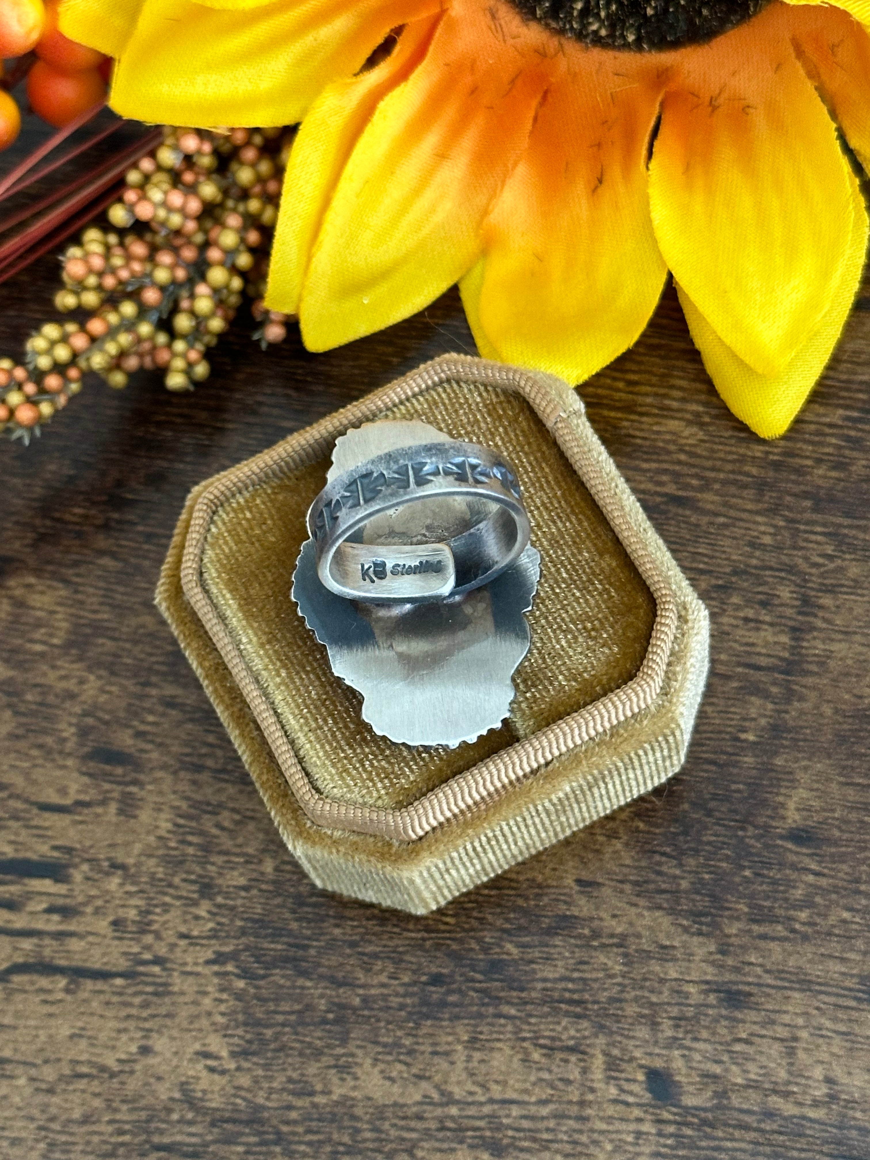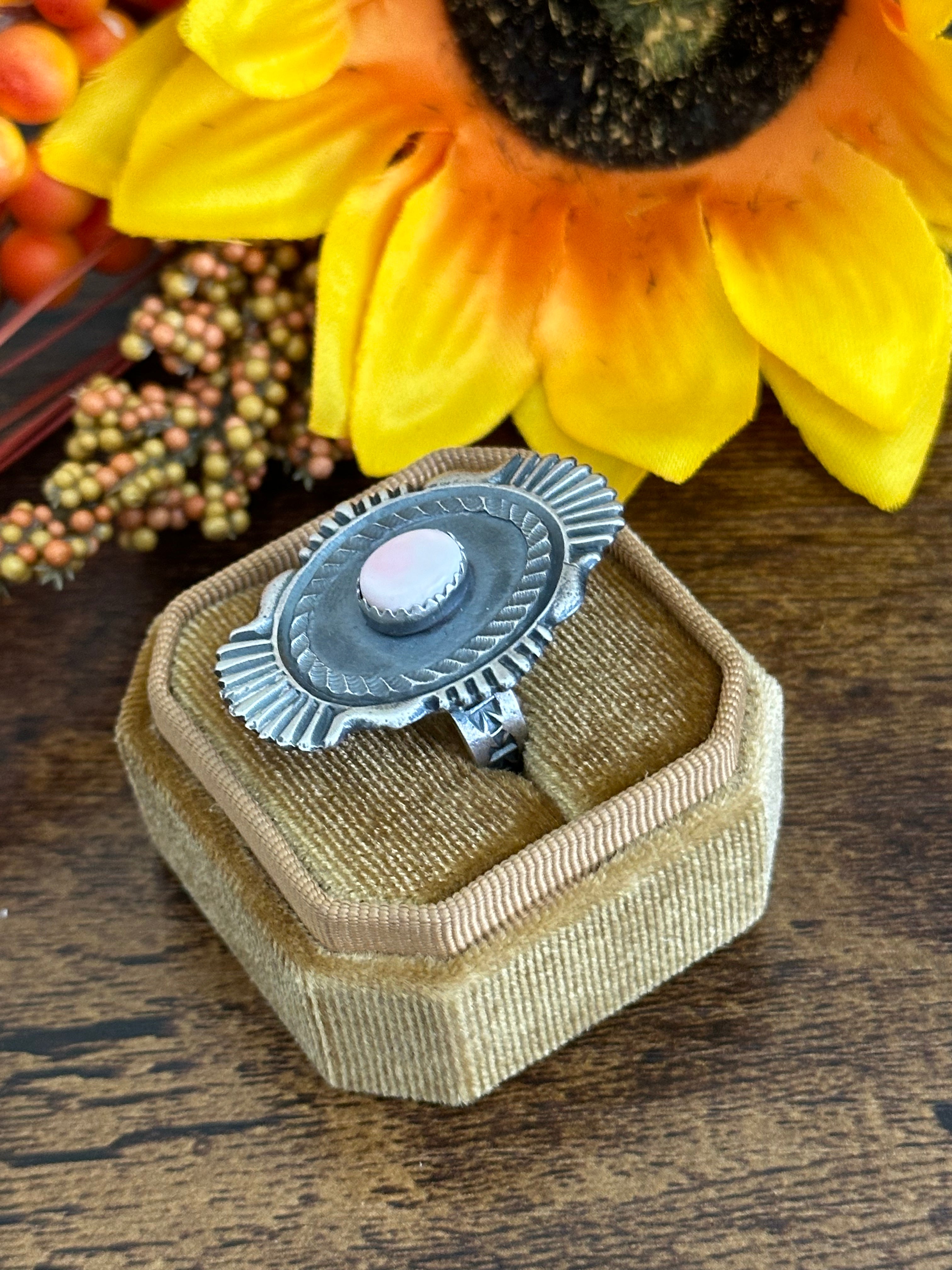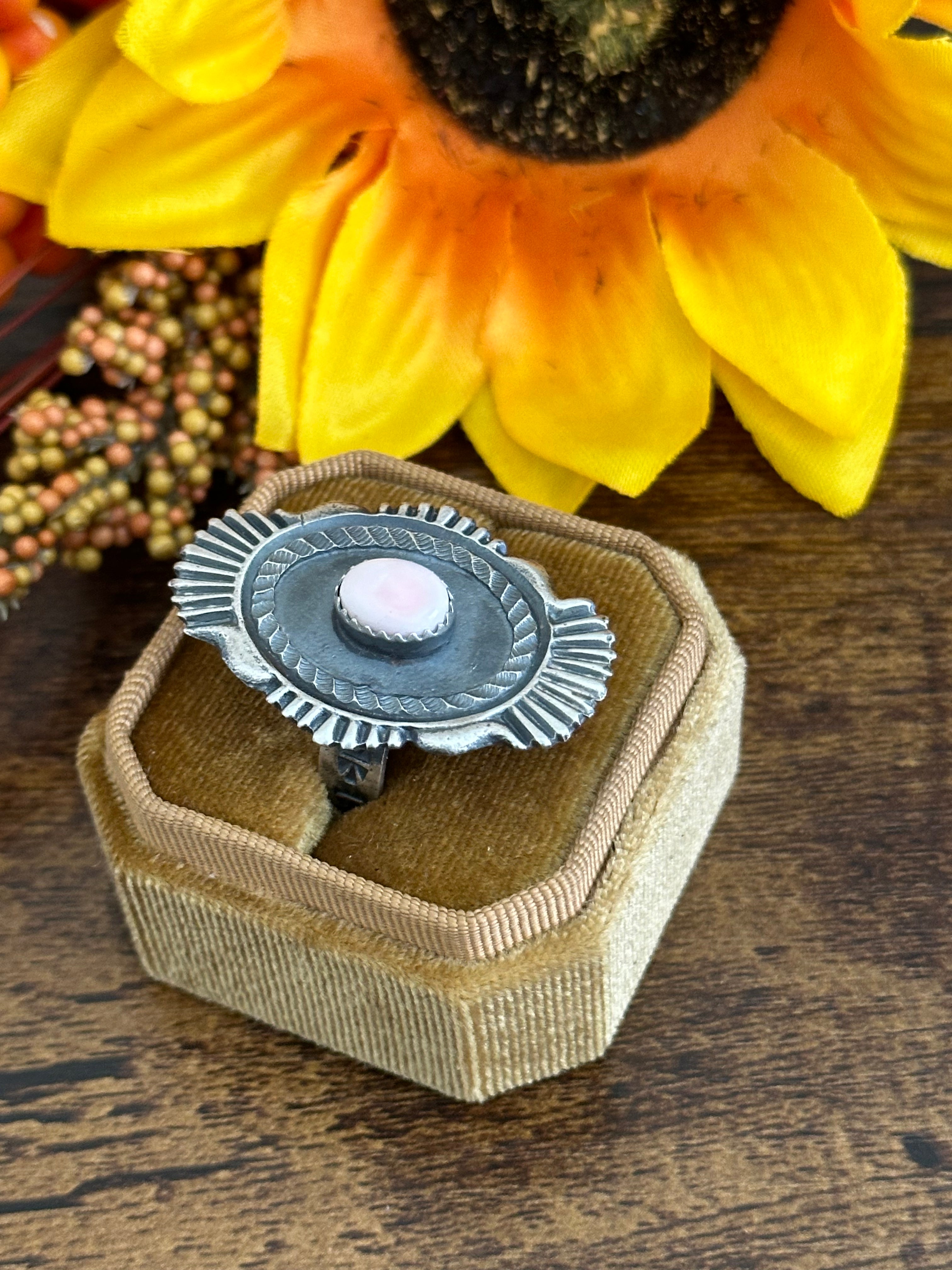 Beautiful Adjustable ring. Kindale Billah Pink Conch & Sterling Silver Adjustable Ring. It measures 1 5/8 inches long and just under 1 inch wide. Signed by the artist and stamped sterling silver.