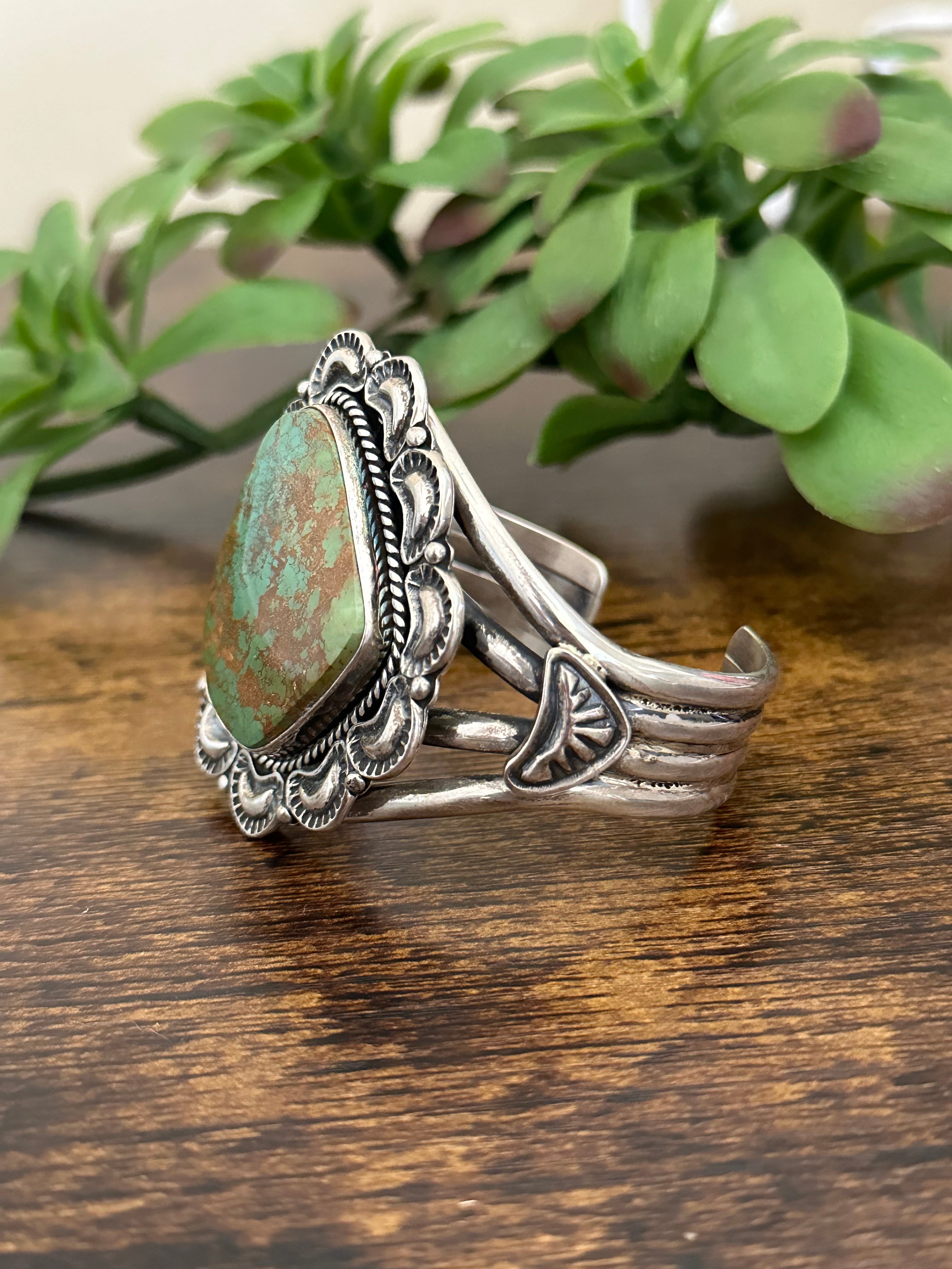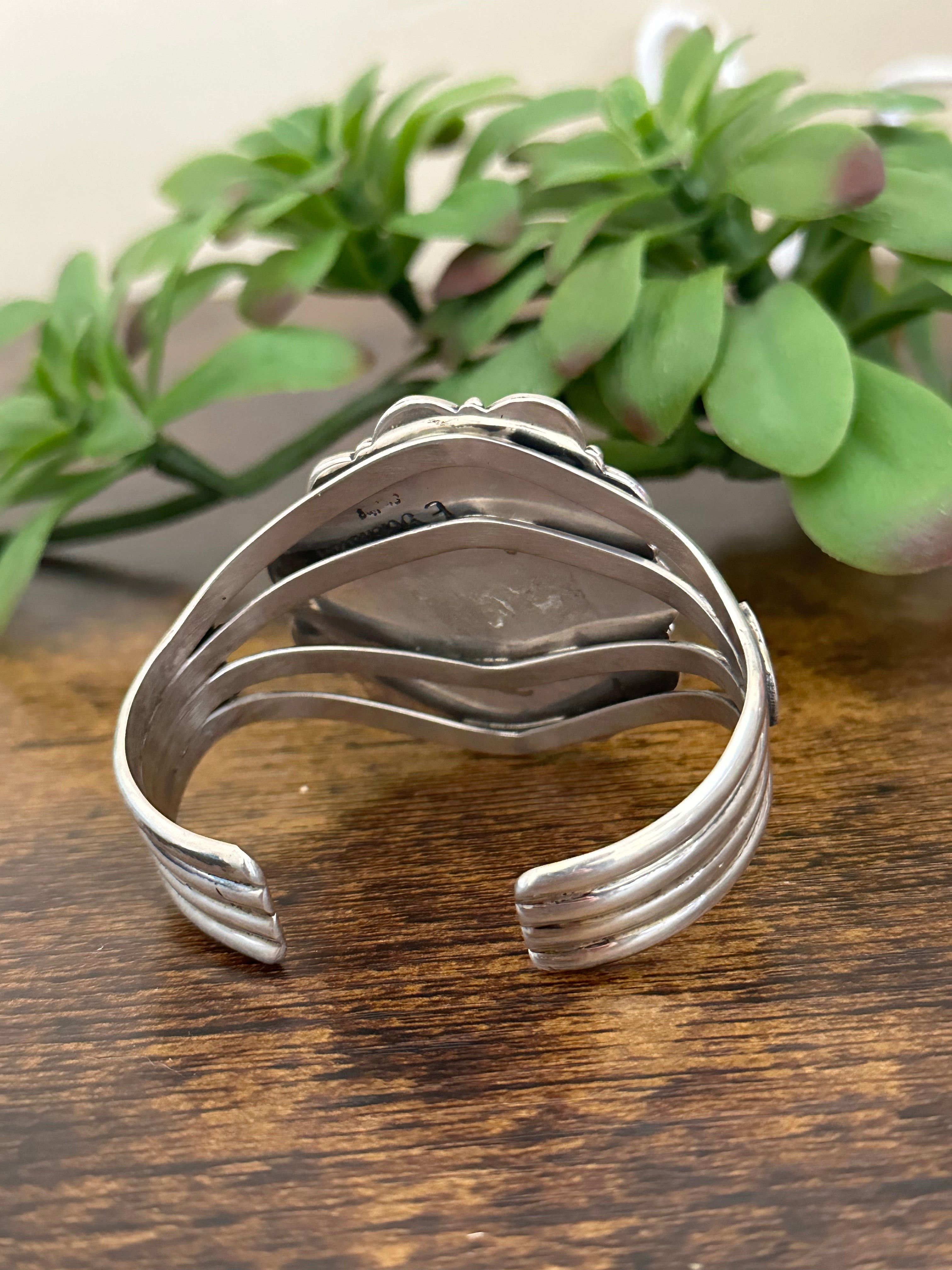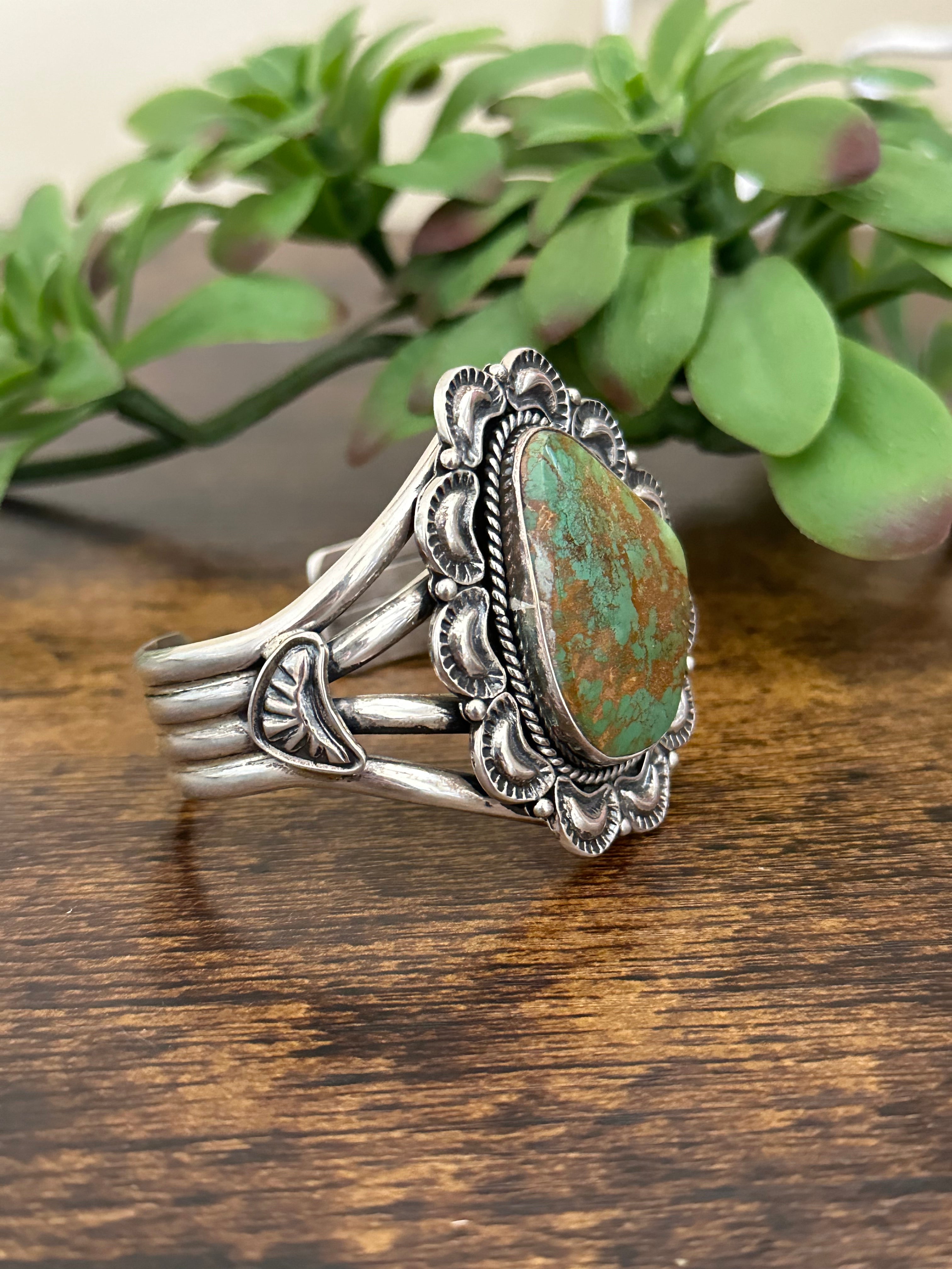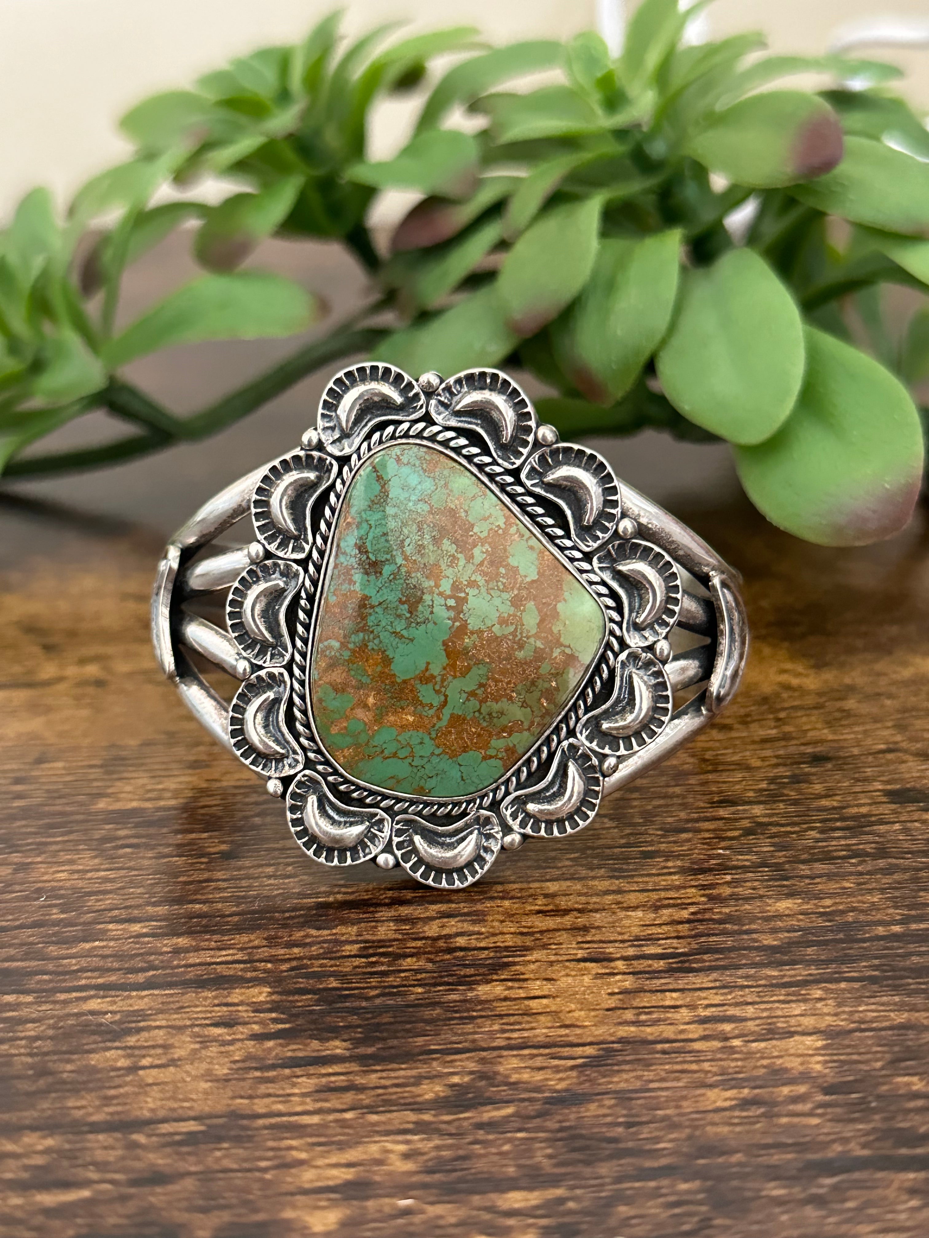 Eleanor Richards Navajo Made Royston Turquoise & Sterling Silver Cuff Bracelet. It measures 2 inches wide with an inside circumference of 5 5/8 inches and a gap of 7/8 of an inch. Signed by artist and stamped sterling silver.