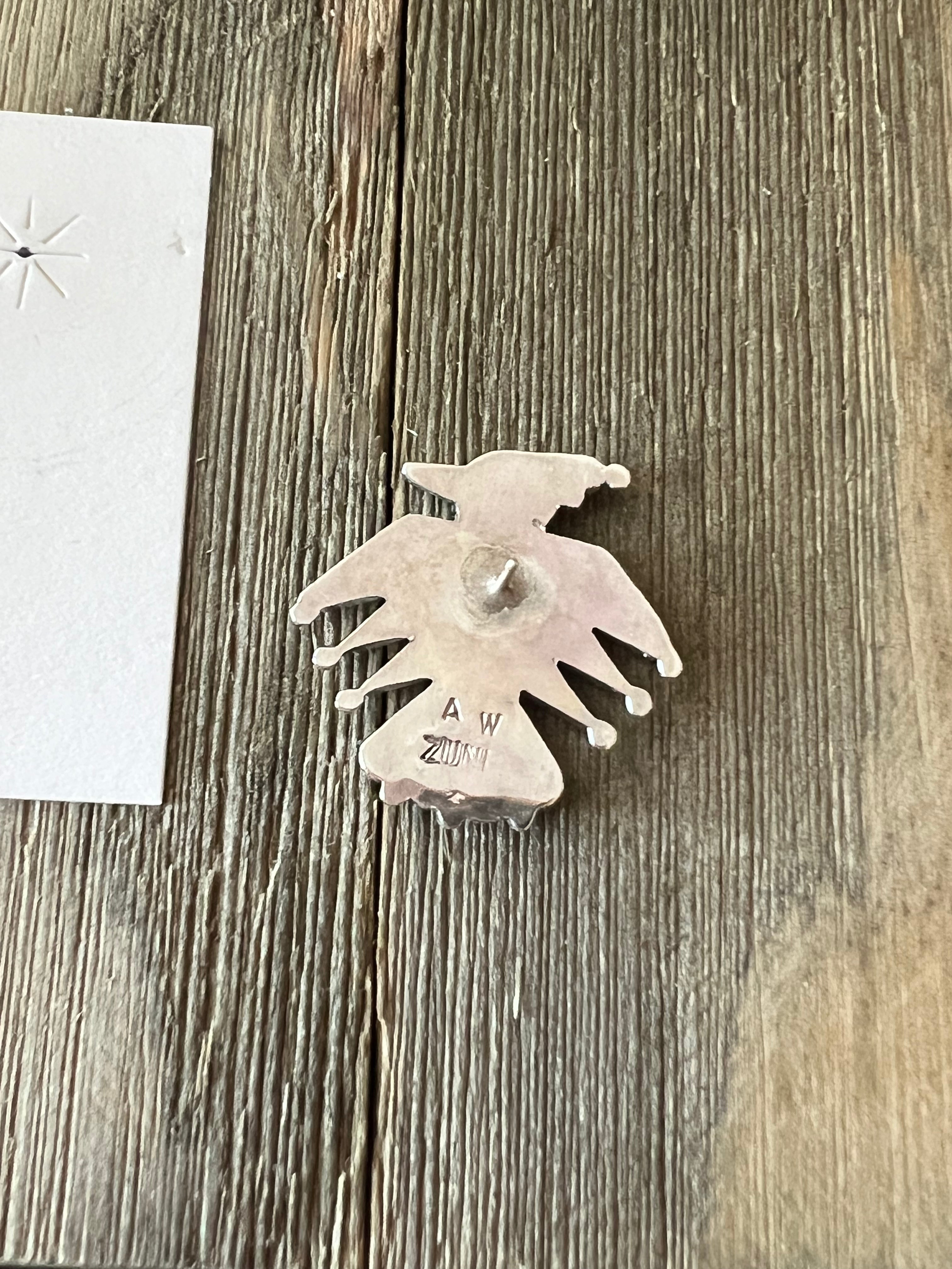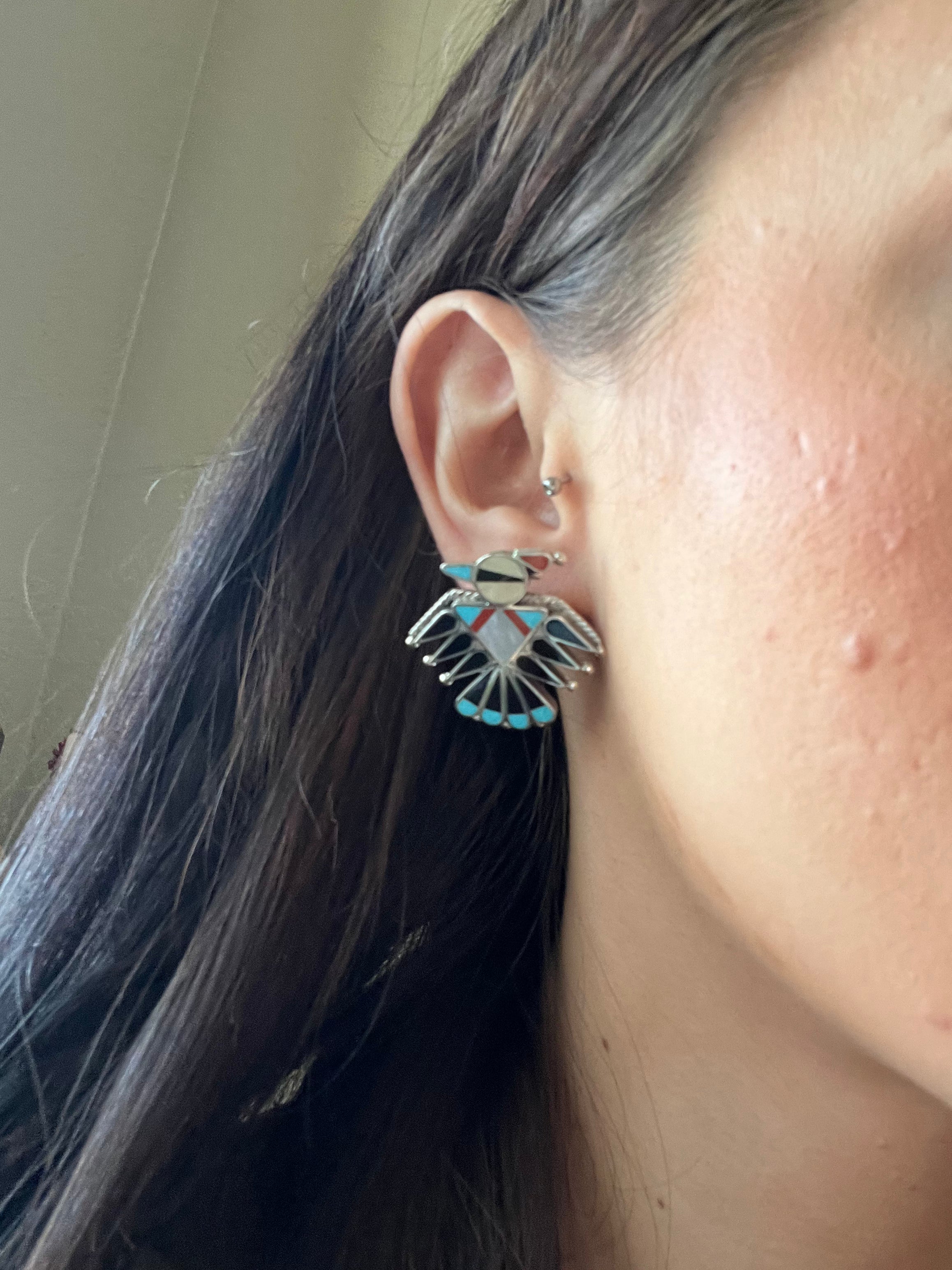 Zuni Made Multi Stone & Sterling Silver Inlay Thunderbird Post Earrings. It measures just under 1 1/4 inches long and 1 1/4 inches wide. Signed by artist and stamped sterling silver.