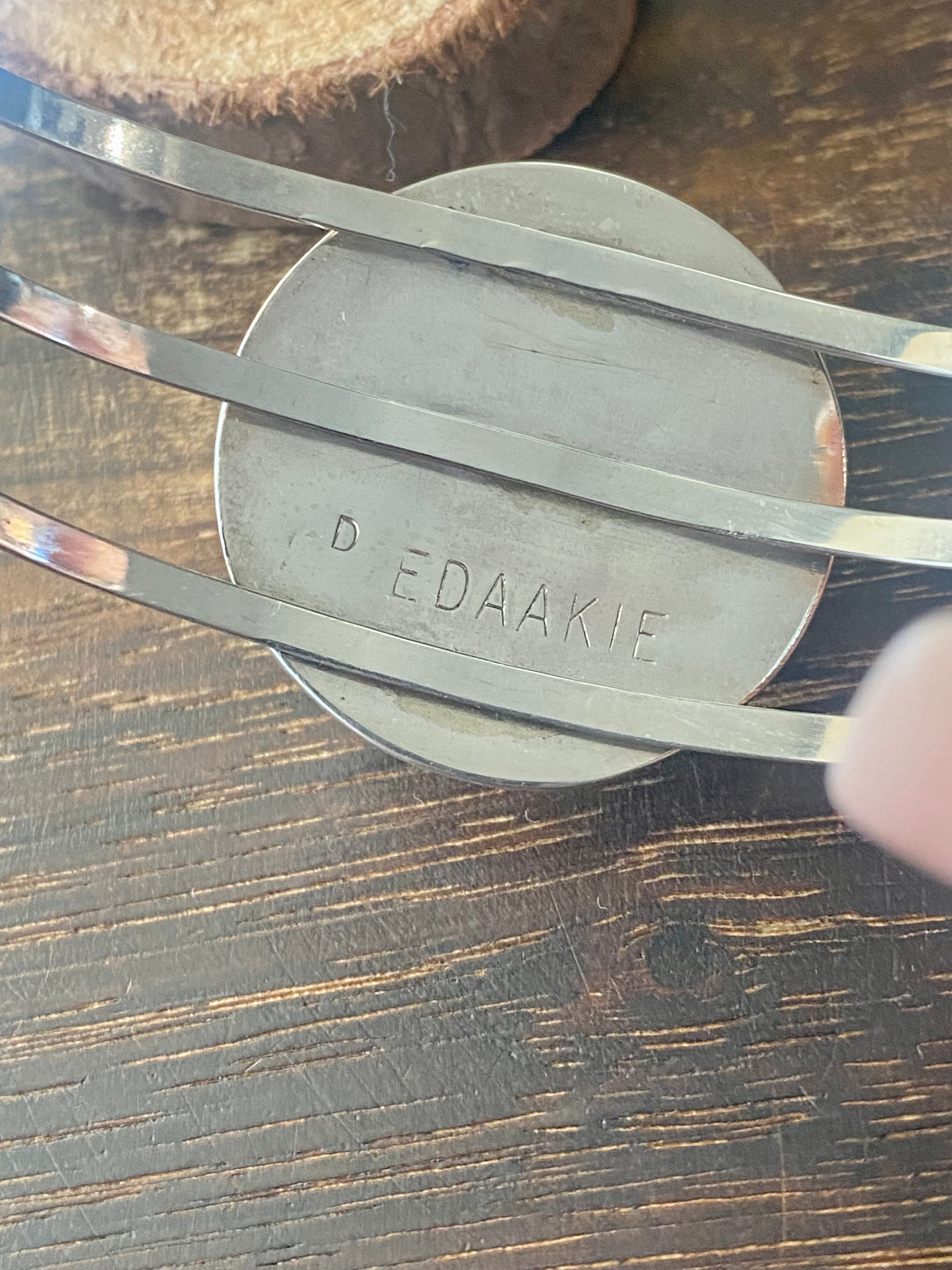 Zuni Made Multi Stone & Sterling Silver Micro-Inlay Cuff Bracelet. It measures 1 1/4 inches wide with an inside circumference of 5 1/4 inches and a gap of 1 3/8 inches. Signed by the artist.