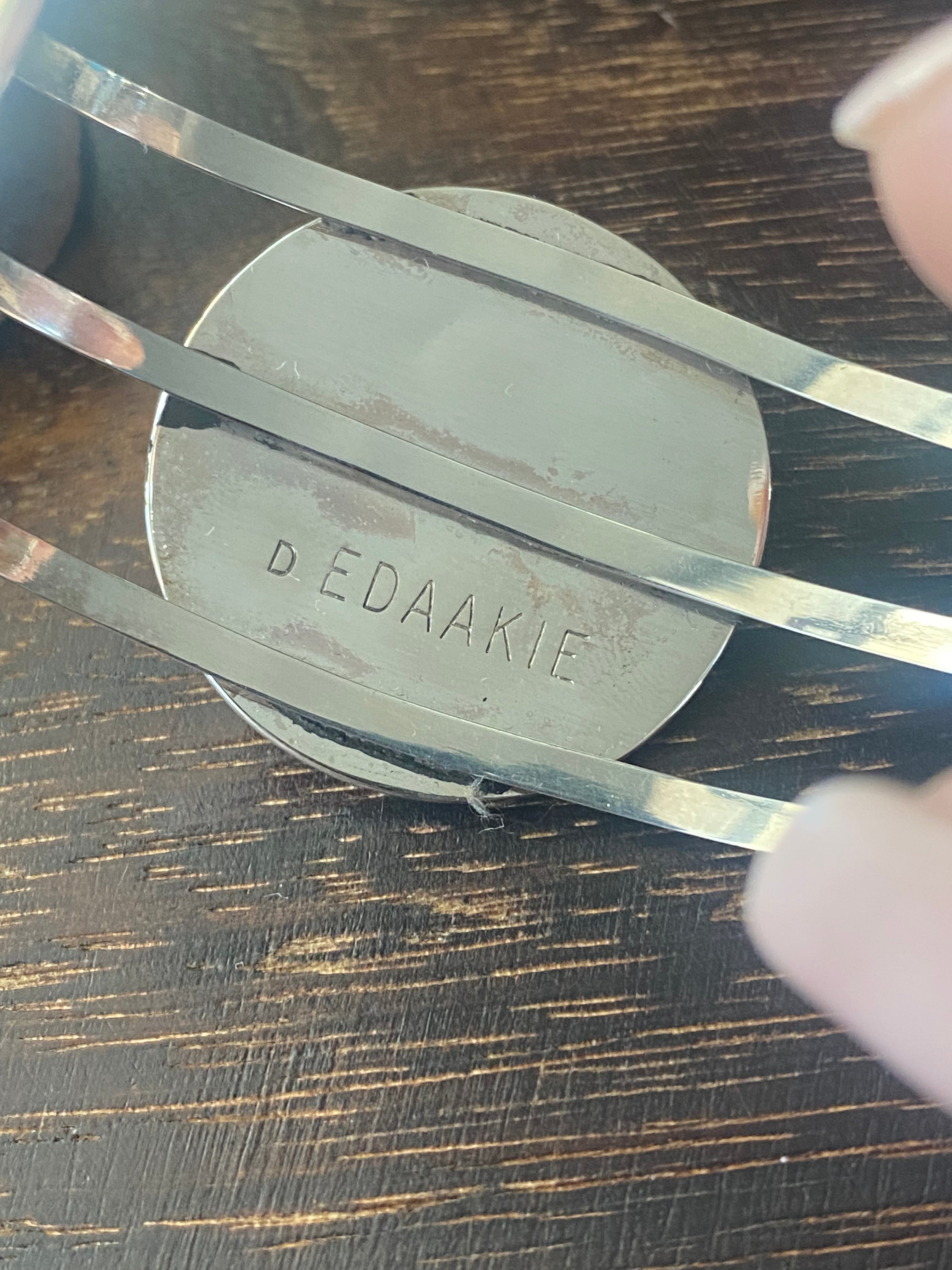 Zuni Made Multi Stone & Sterling Silver Micro-Inlay Cuff Bracelet. It measures 1 1/4 inches wide with an inside circumference of 5 1/4 inches and a gap of 1 1/4 inches. Signed by the artist.