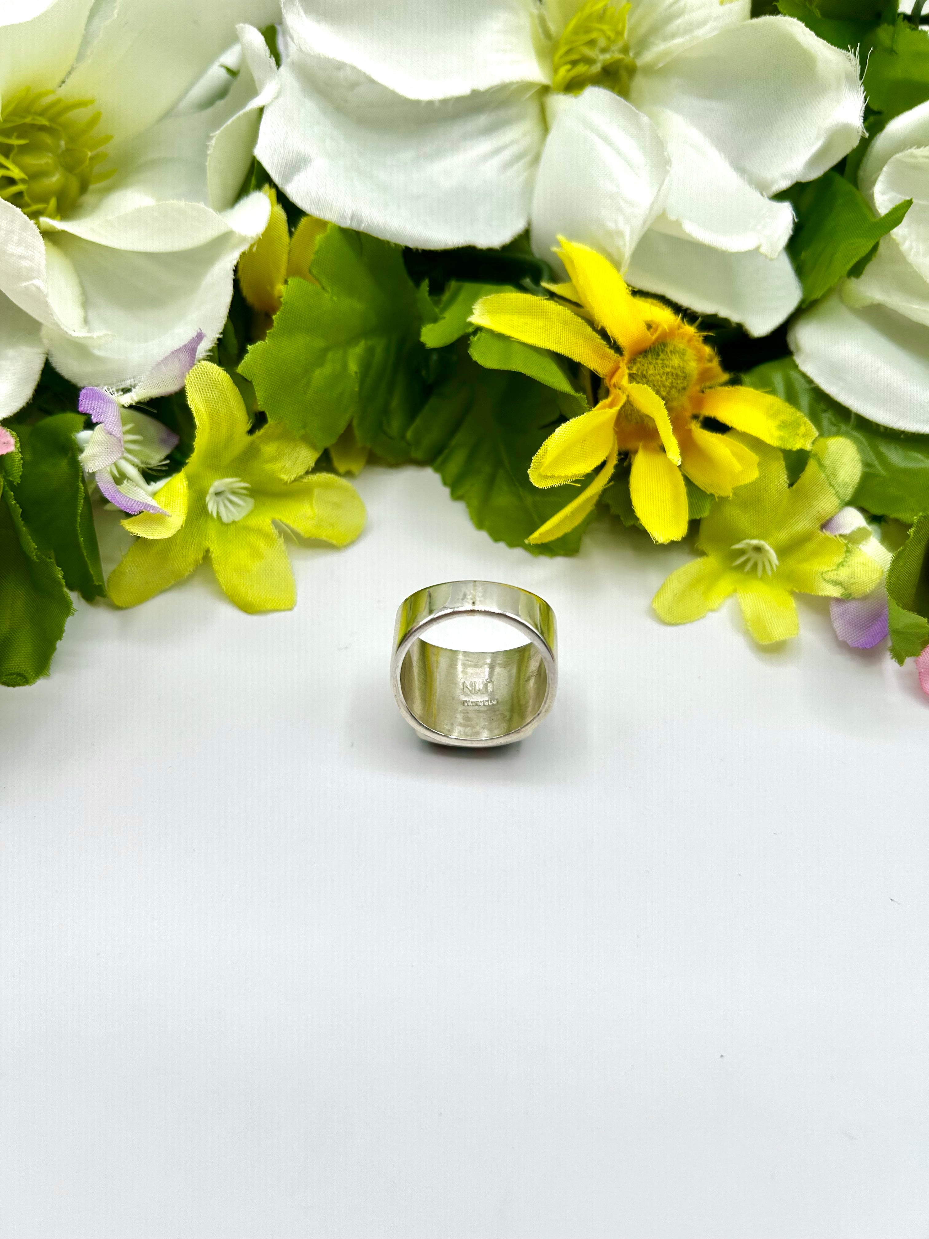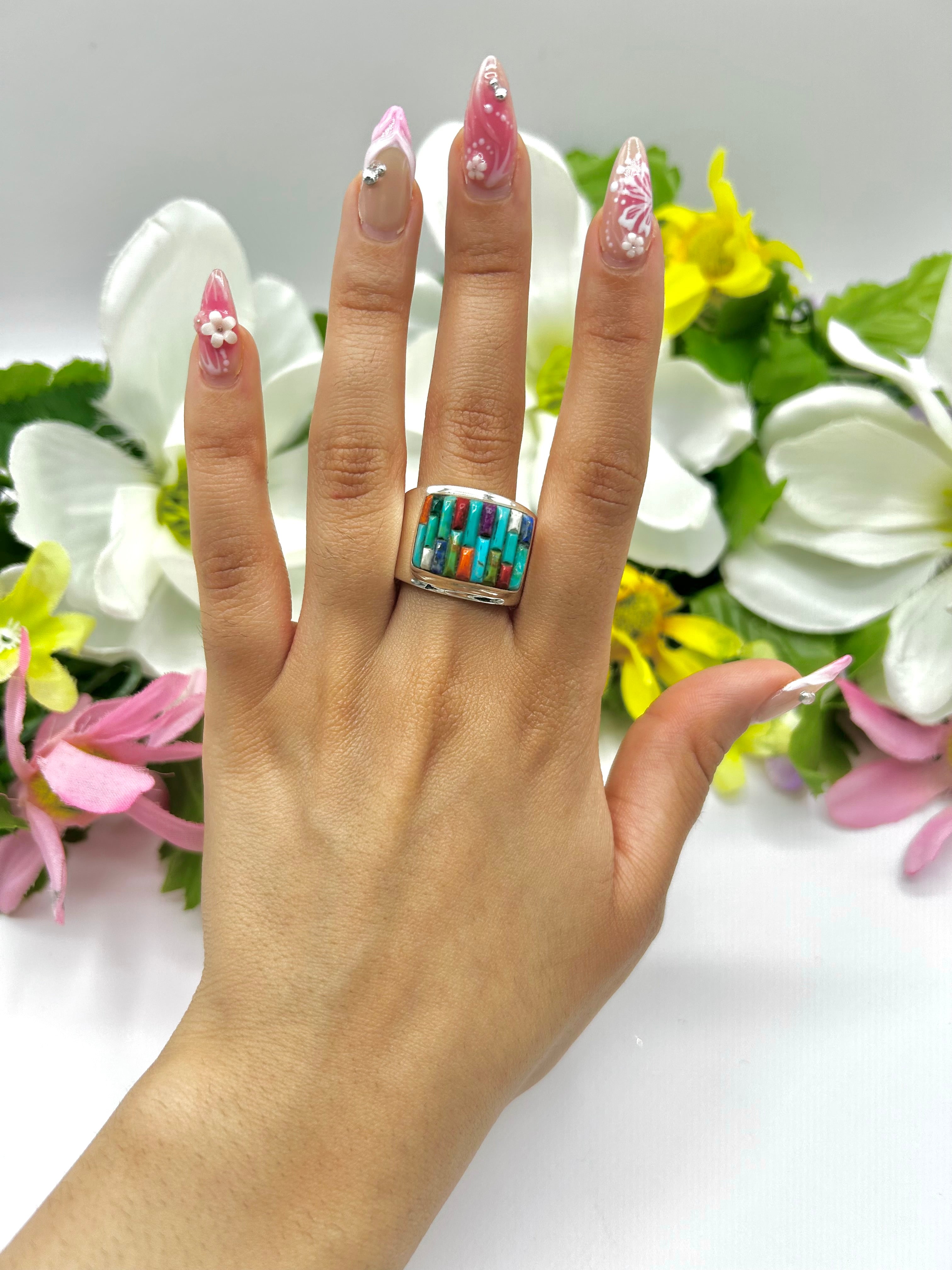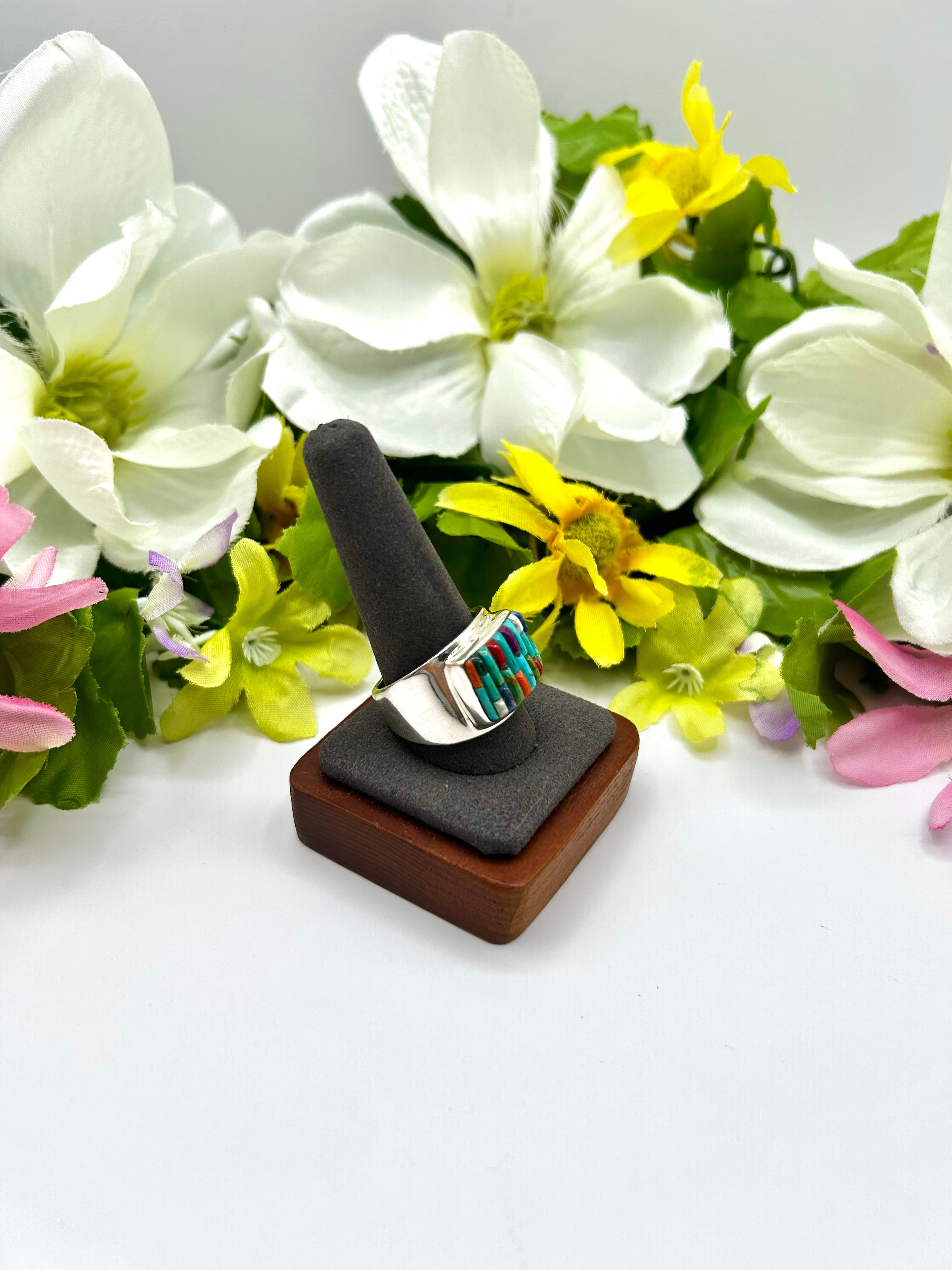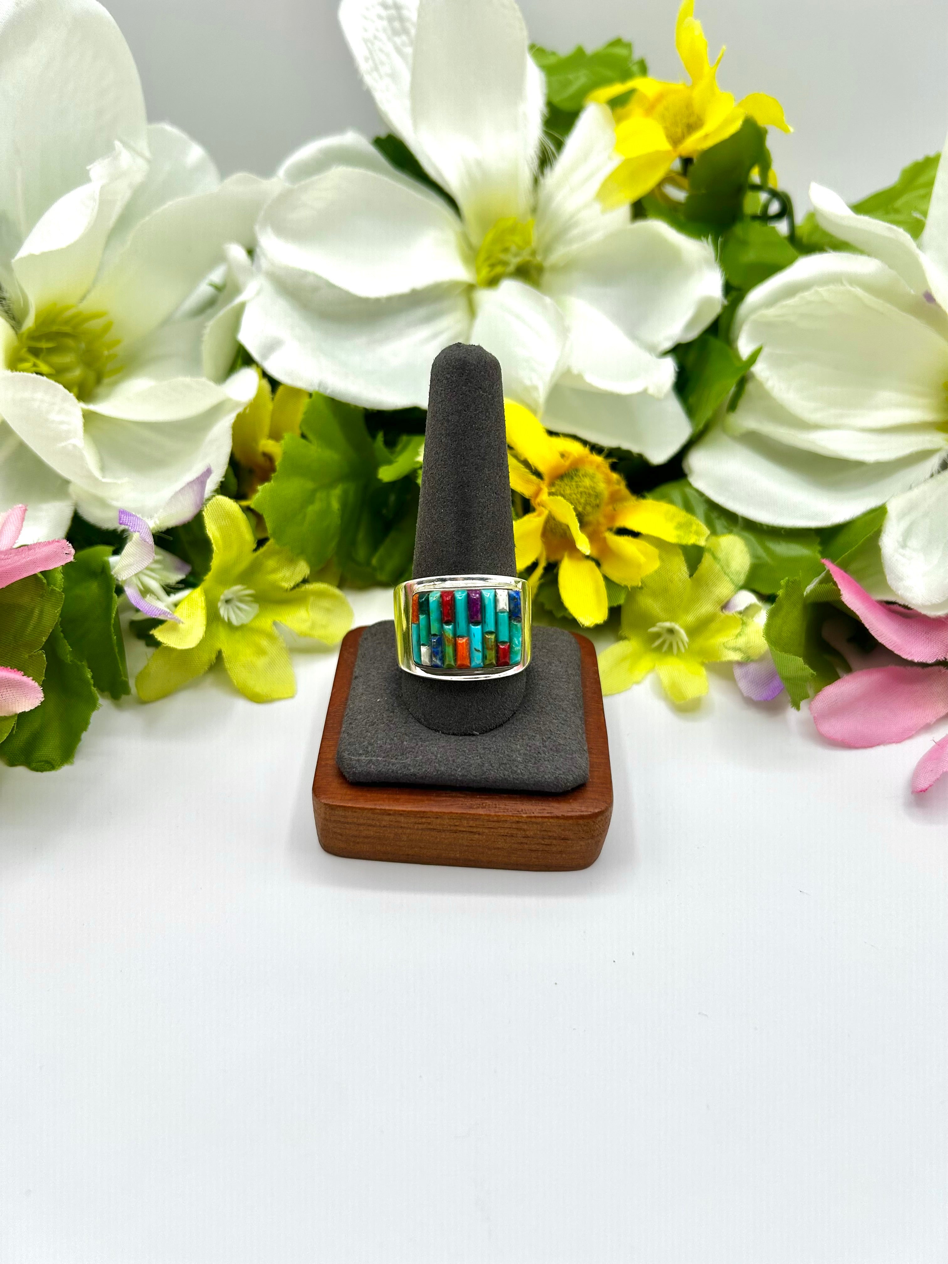 Navajo Made Multi Stone & Sterling Silver Ring Size 12. It measures 3/4 of an inch long and 3/4 of an inch wide. Signed by the artist and stamped sterling silver.