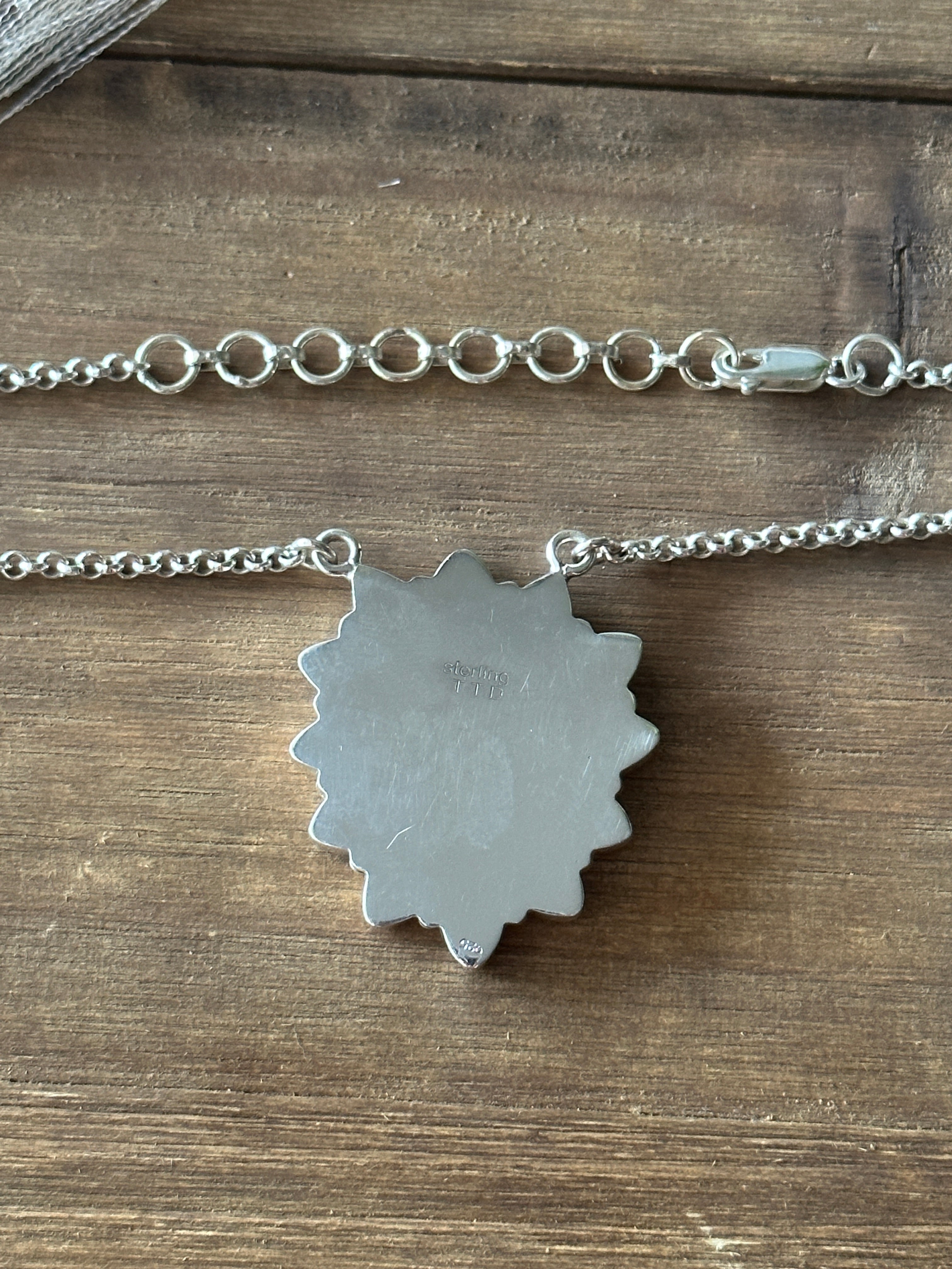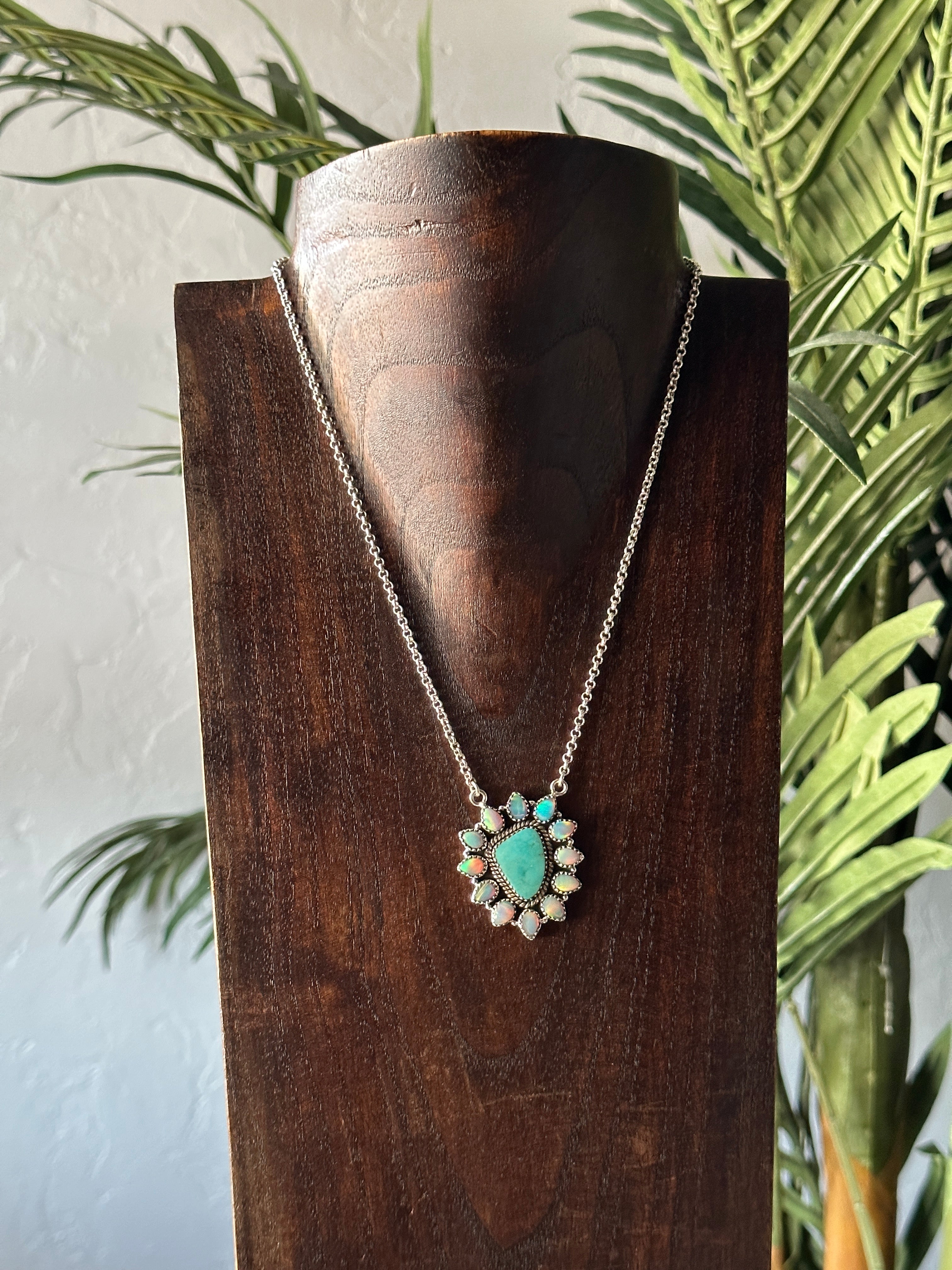 Beautiful cluster necklaces. Southwest Handmade Multi Stone & Sterling Silver Cluster Necklace. It measures 20 inches long and chain measurements 18 inches long but can adjust down to 16 inches long. Signed by the artist and stamped sterling silver.