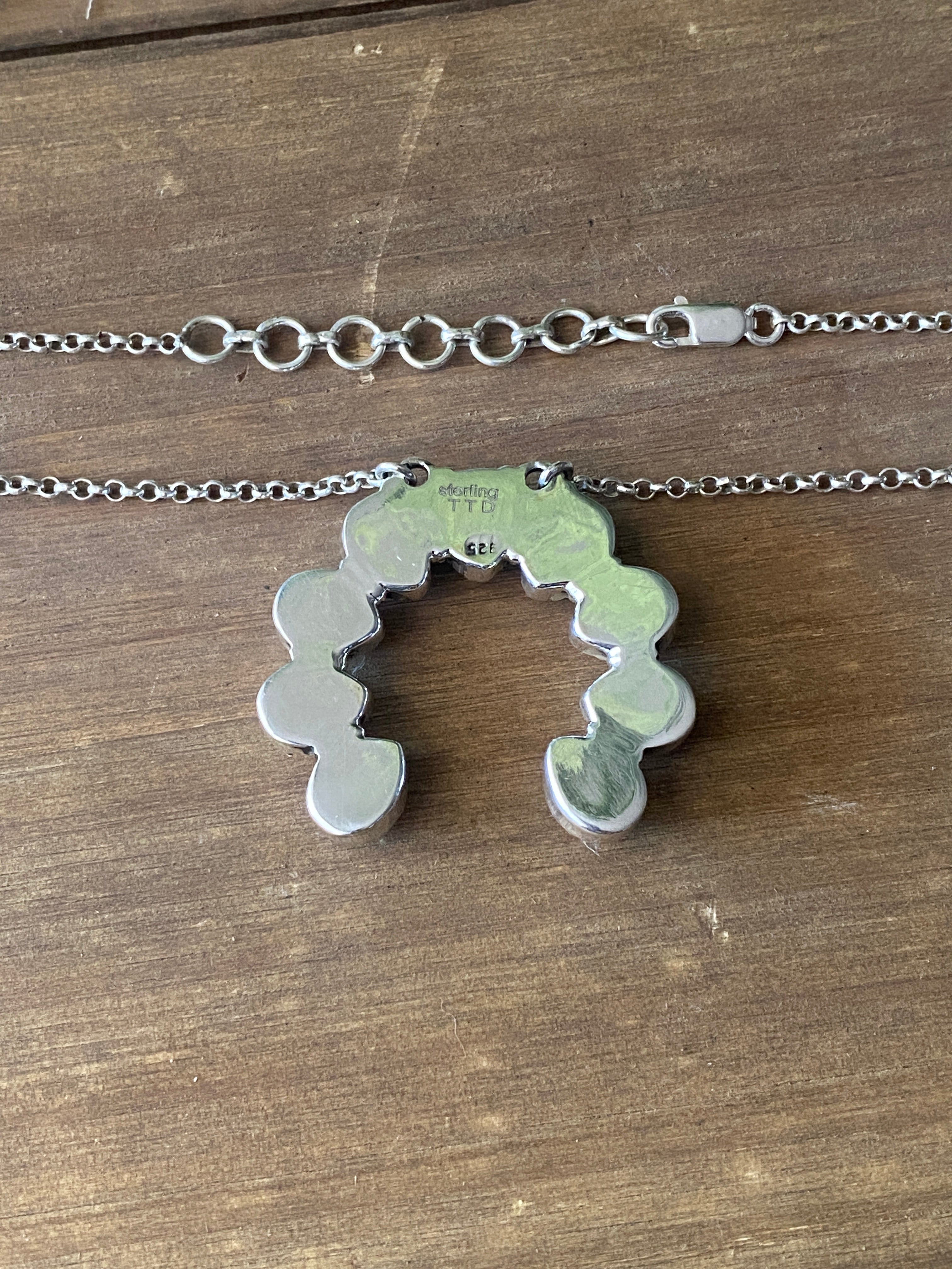 A beautiful necklace Southwest Handmade Pink Opal & Sterling Silver Naja Necklace. It measures 20 inches long with hang while the chain by itself measures 17 inches long. Signed by the artist and stamped sterling silver.