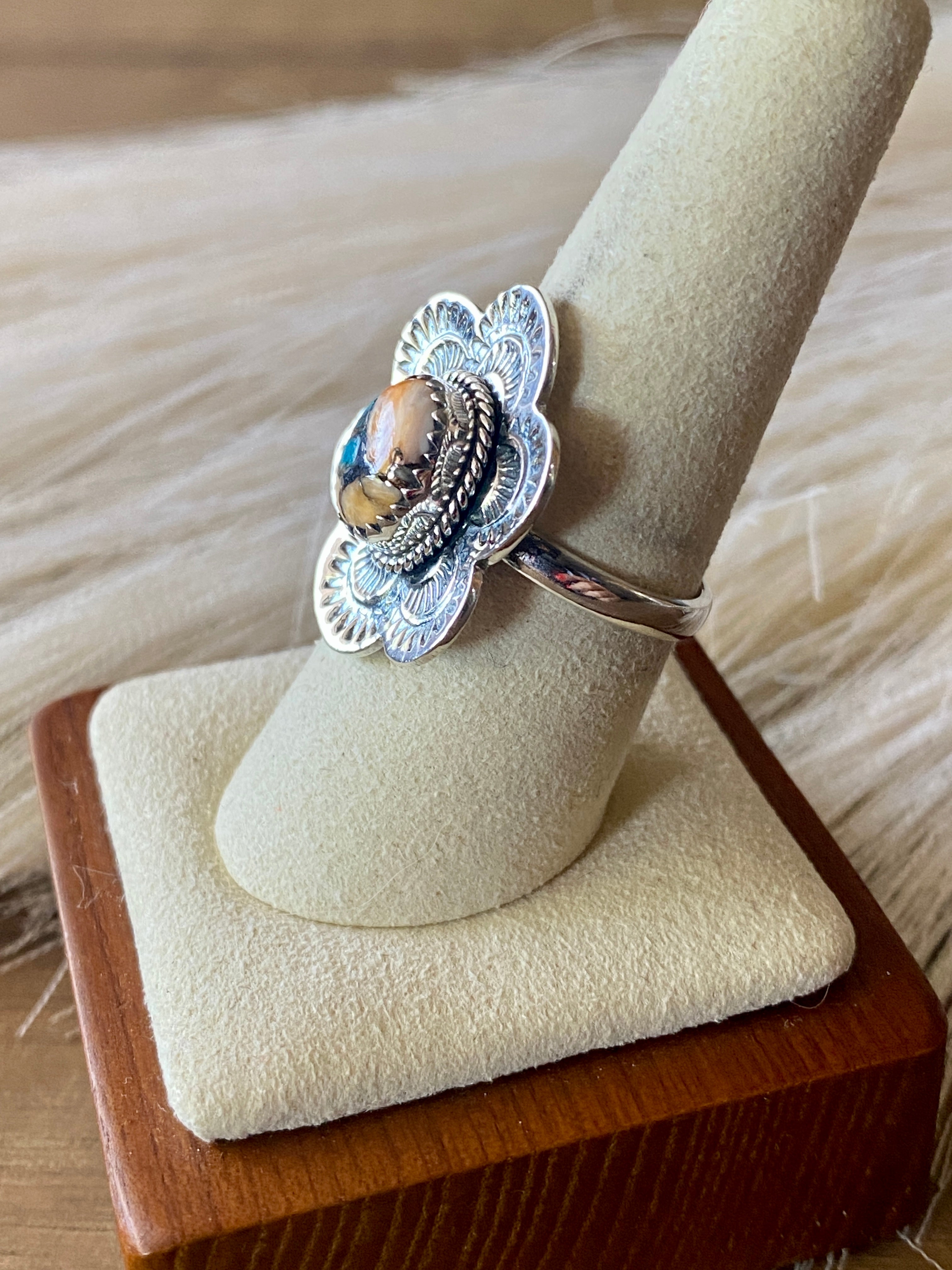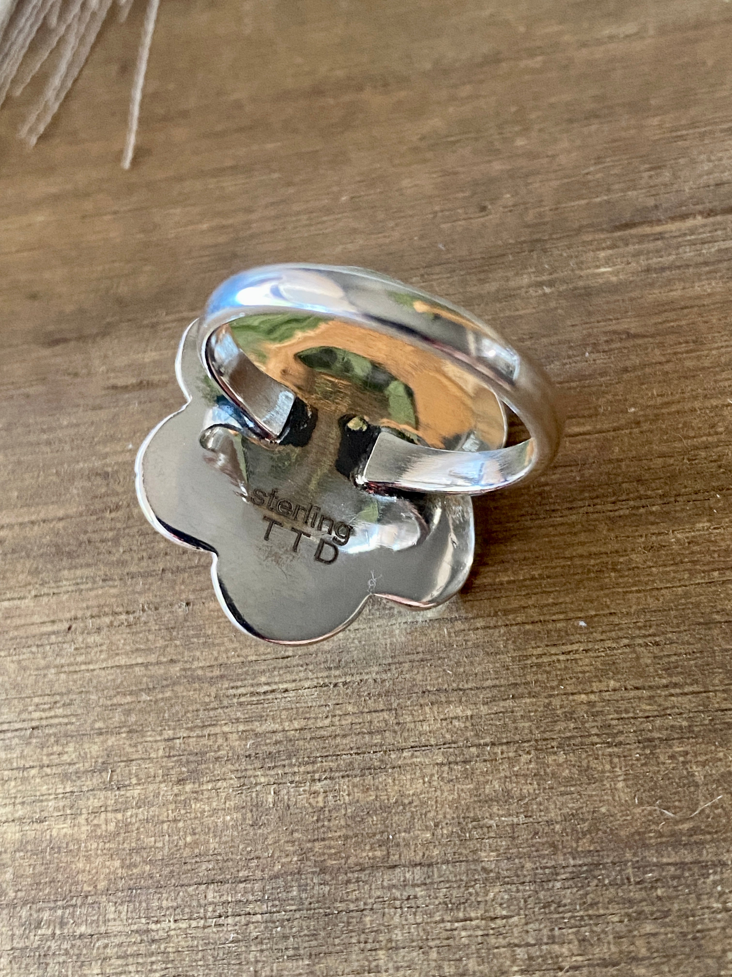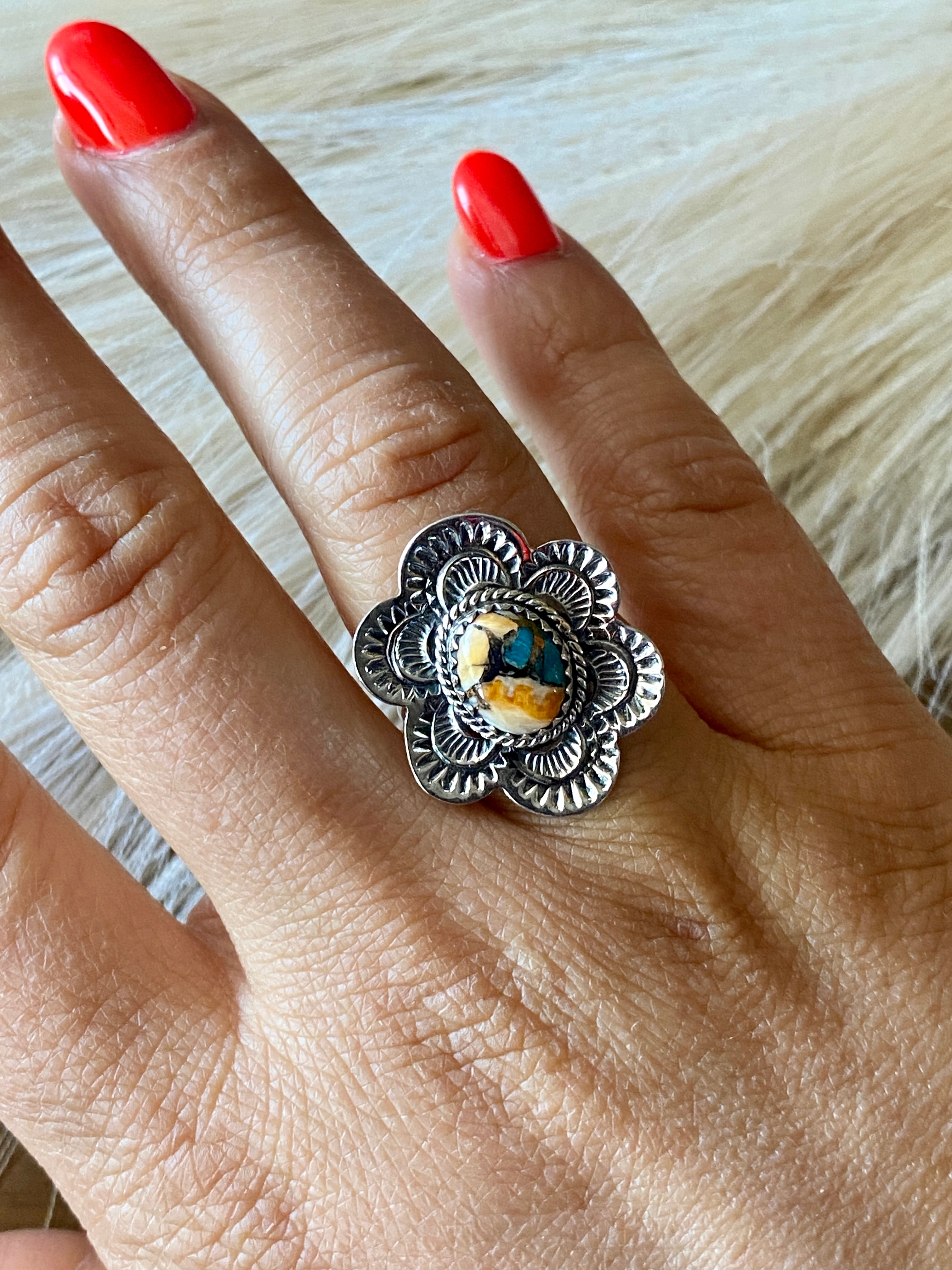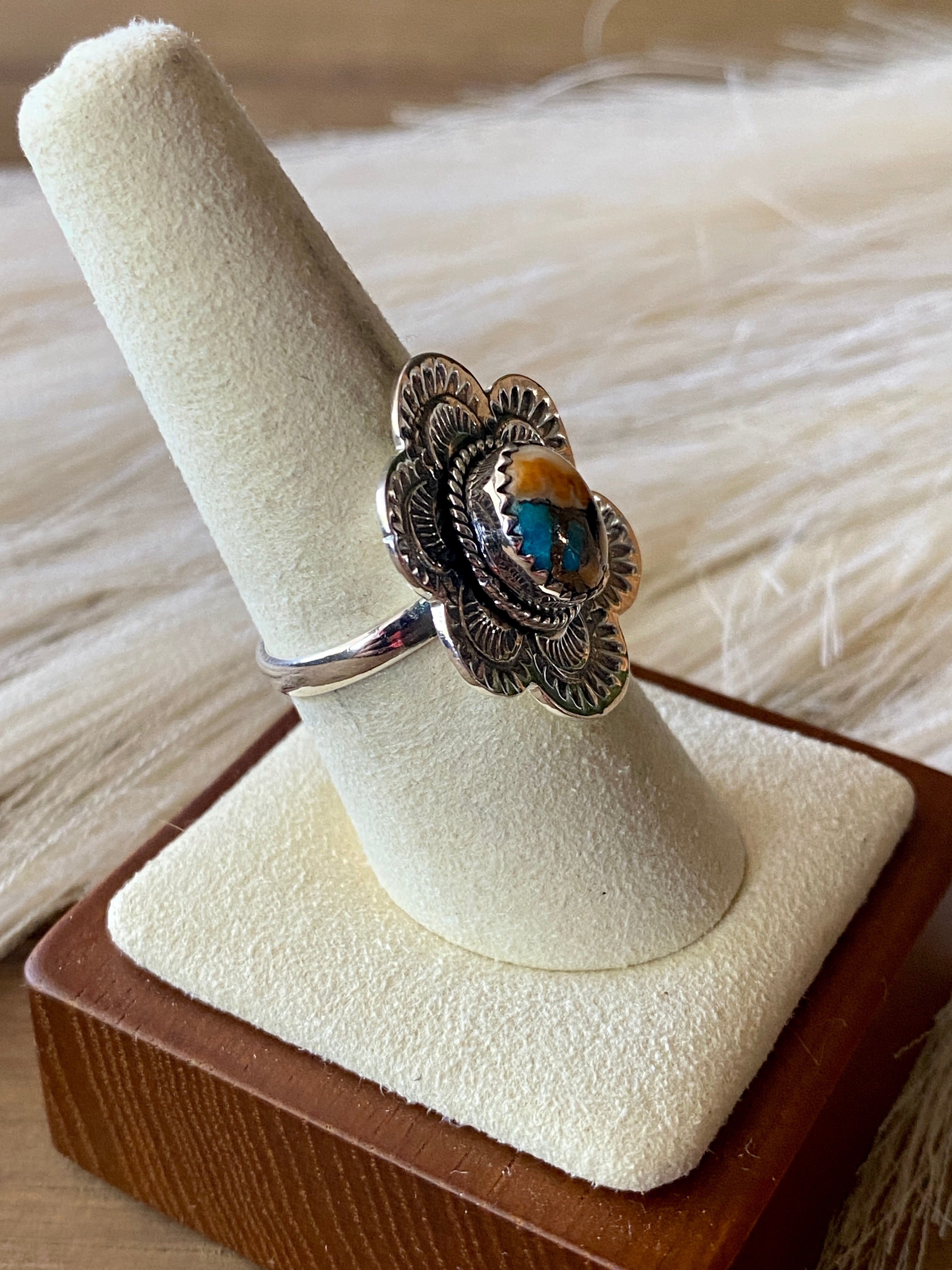Beautiful stamp work on this beauty. Southwest Handmade Mohave Turquoise & Sterling Silver Ring Size 9.5. It measures 1 inch long and 1 inch wide. Signed by the artist and stamped sterling silver.