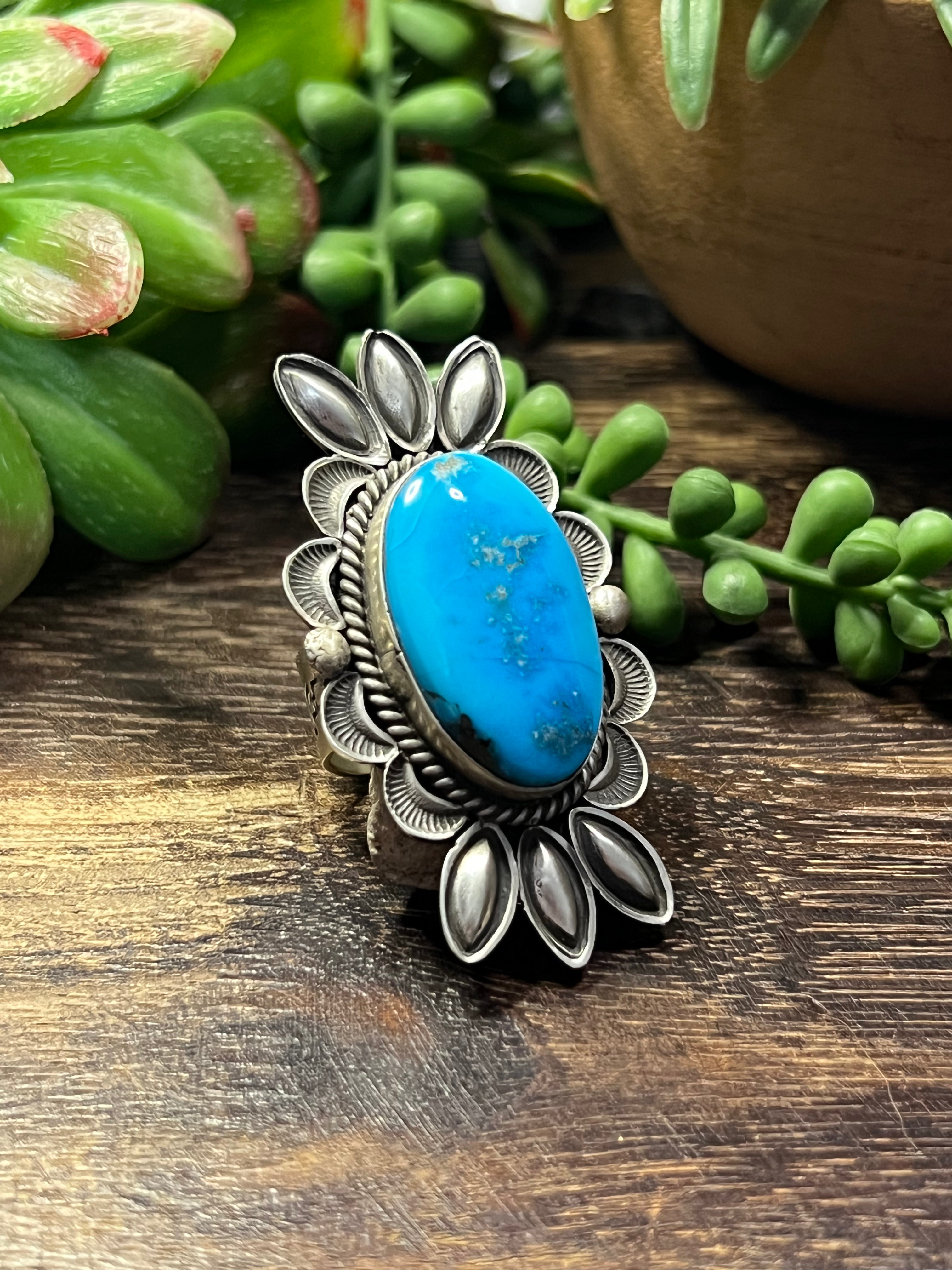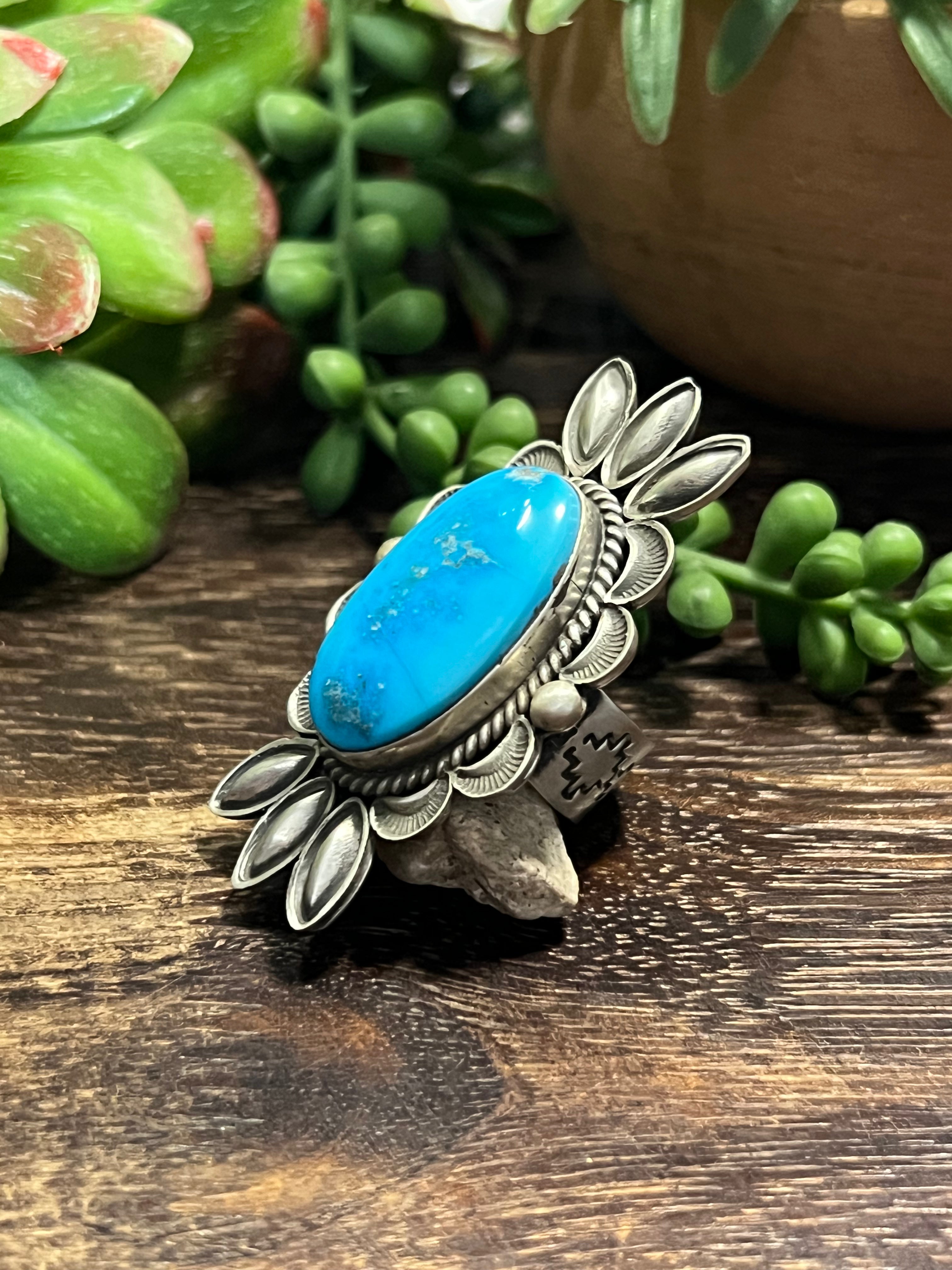 Alex Sanchez Blue Bird Turquoise & Sterling Silver Adjustable Ring. It measures just under 2 3/8 inches long and 1 1/4 inches wide. Signed by artist and stamped sterling silver.