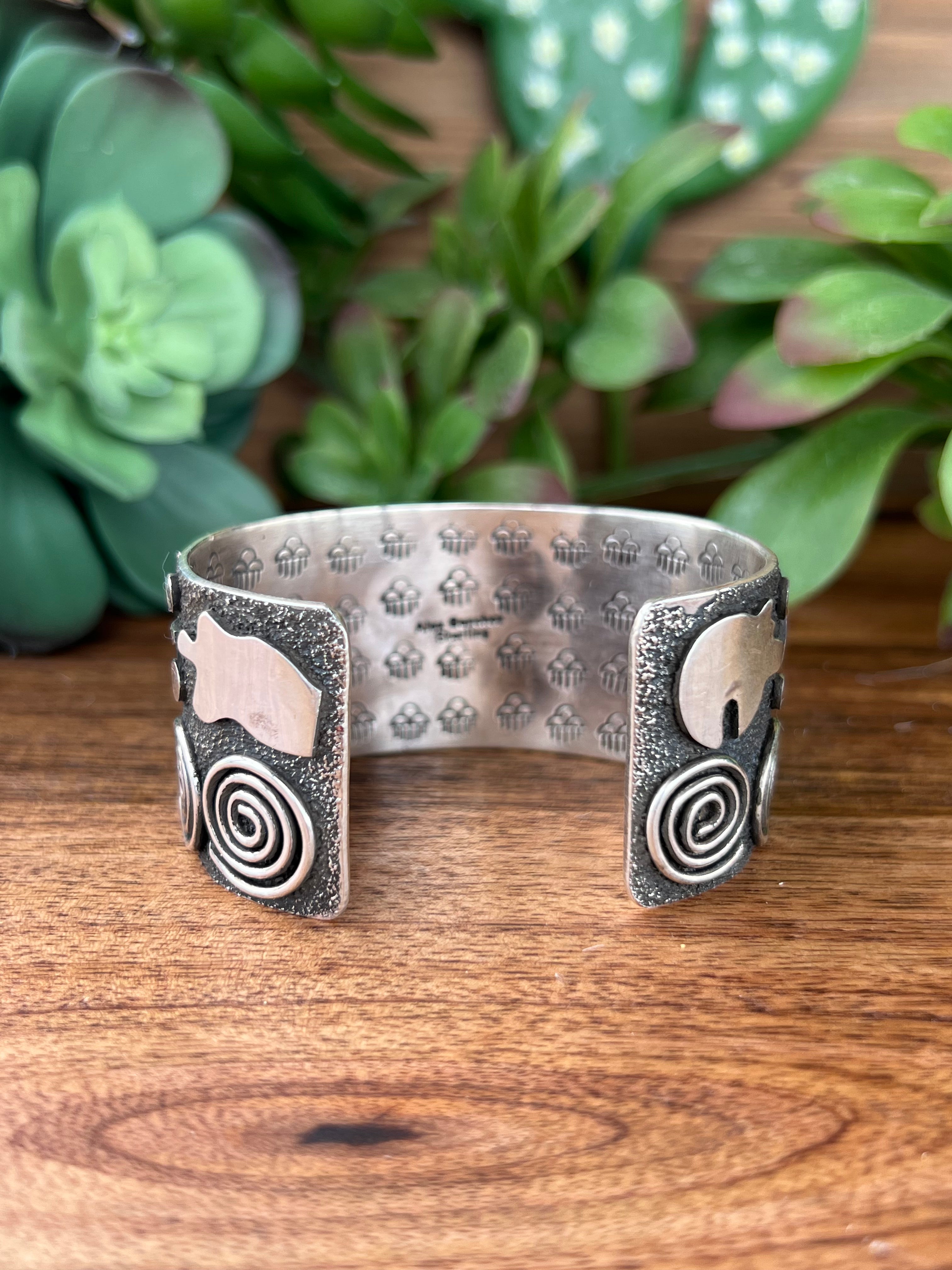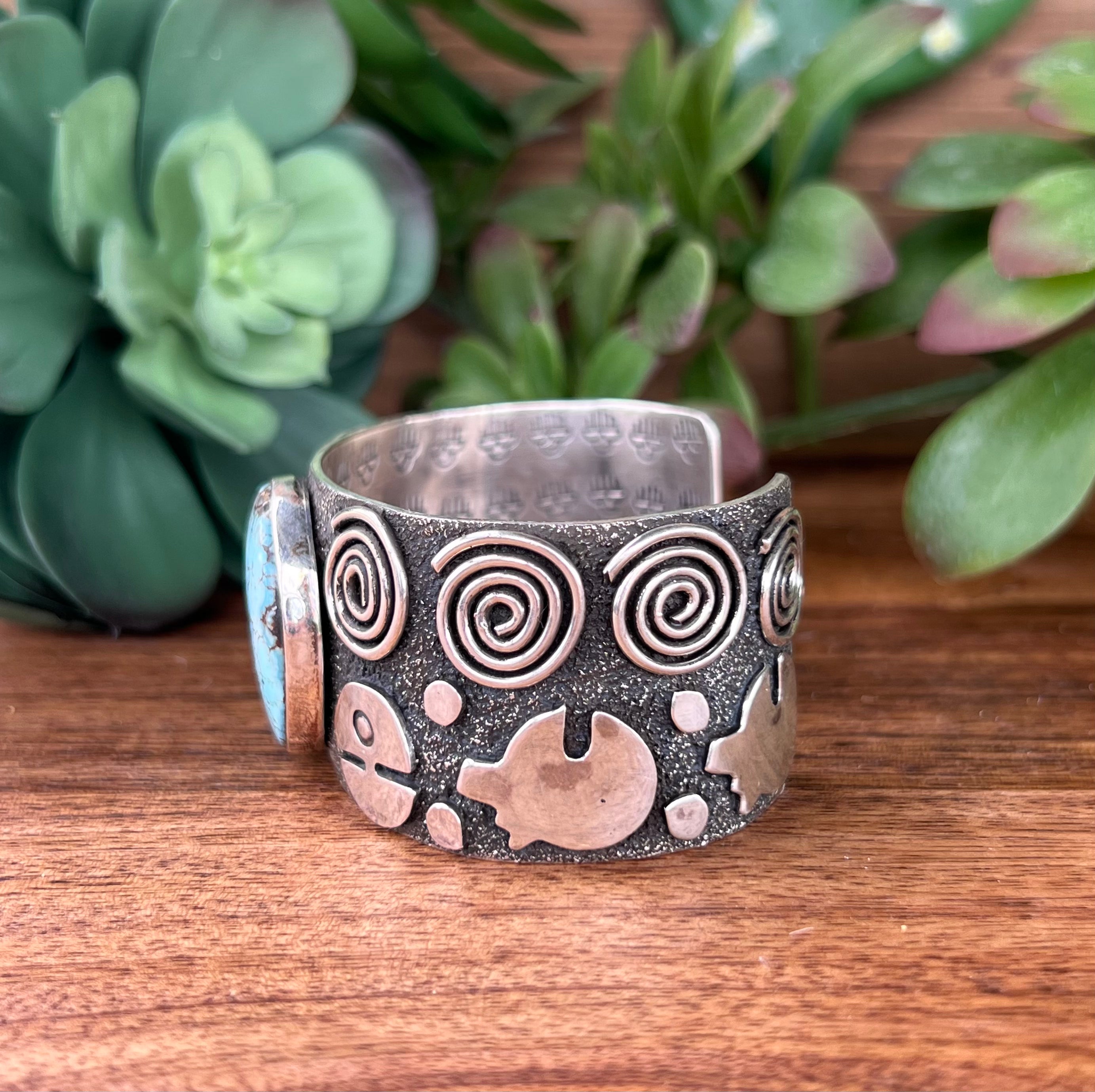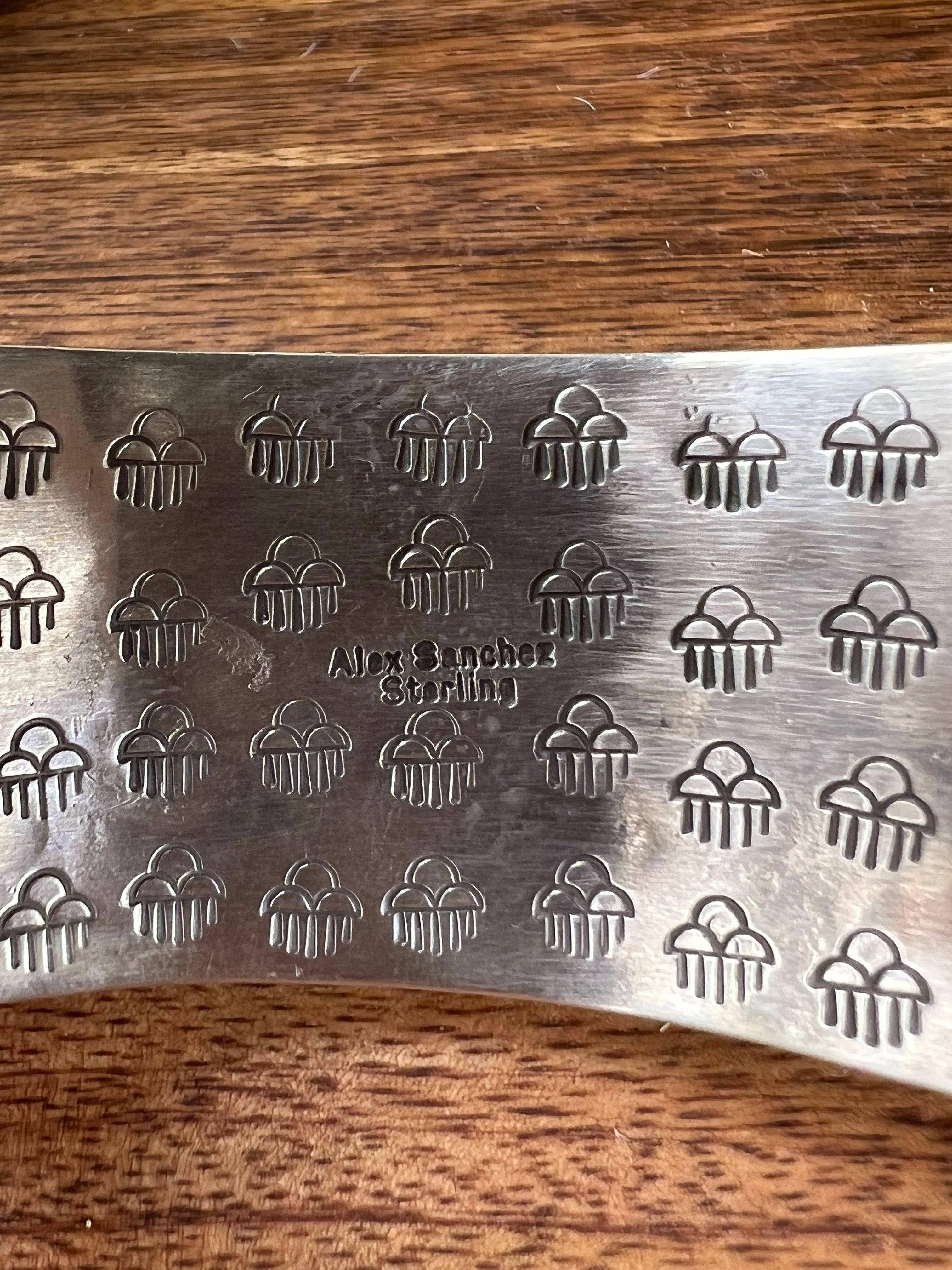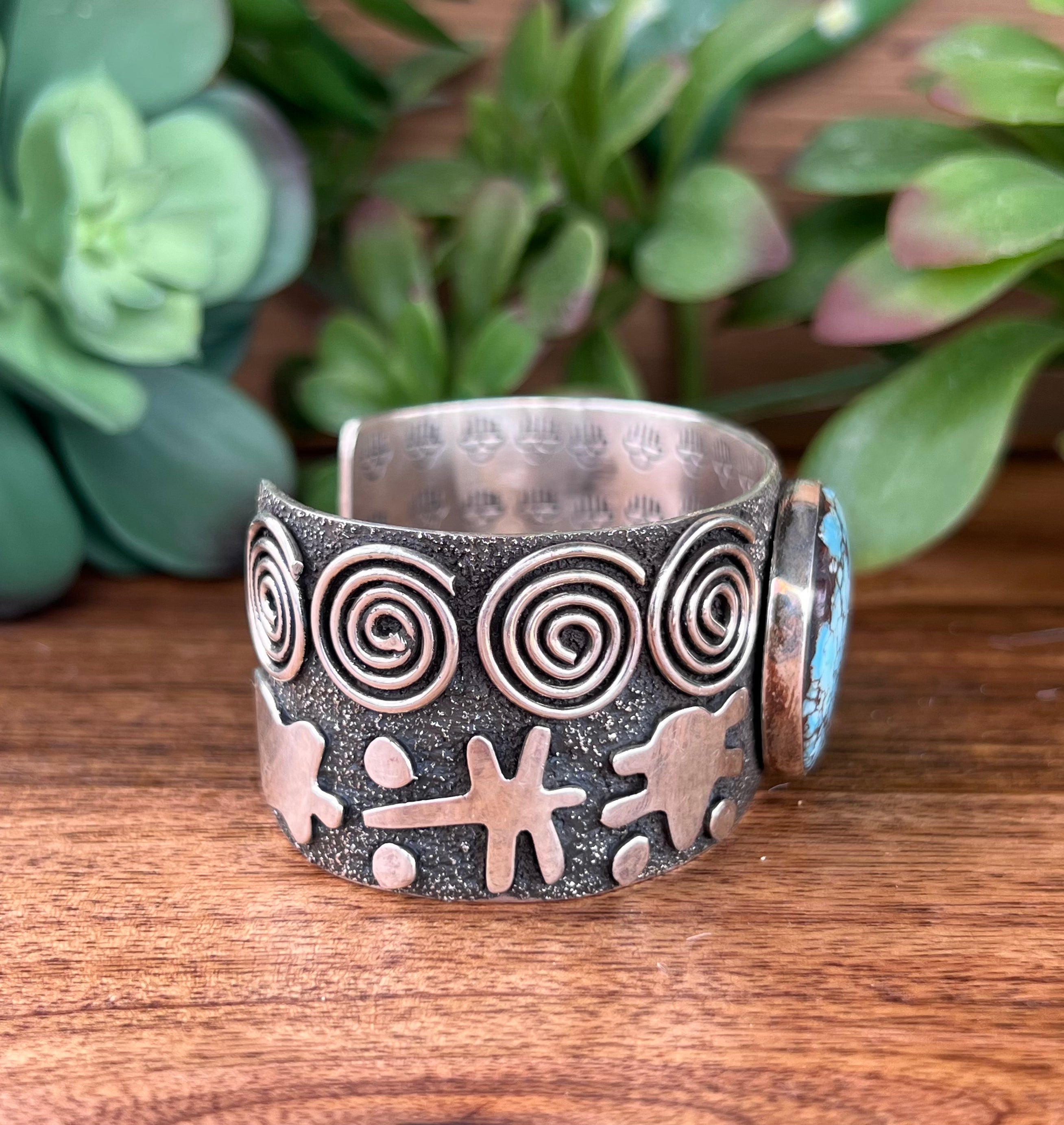 Alex Sanchez Golden Hill’s Turquoise & Sterling Silver Cuff Bracelet. It measures 1 1/4 inches wide with an inside circumference of 5 5/8 inches and a gap of 1 inch. Signed by the artist and stamped sterling silver.
