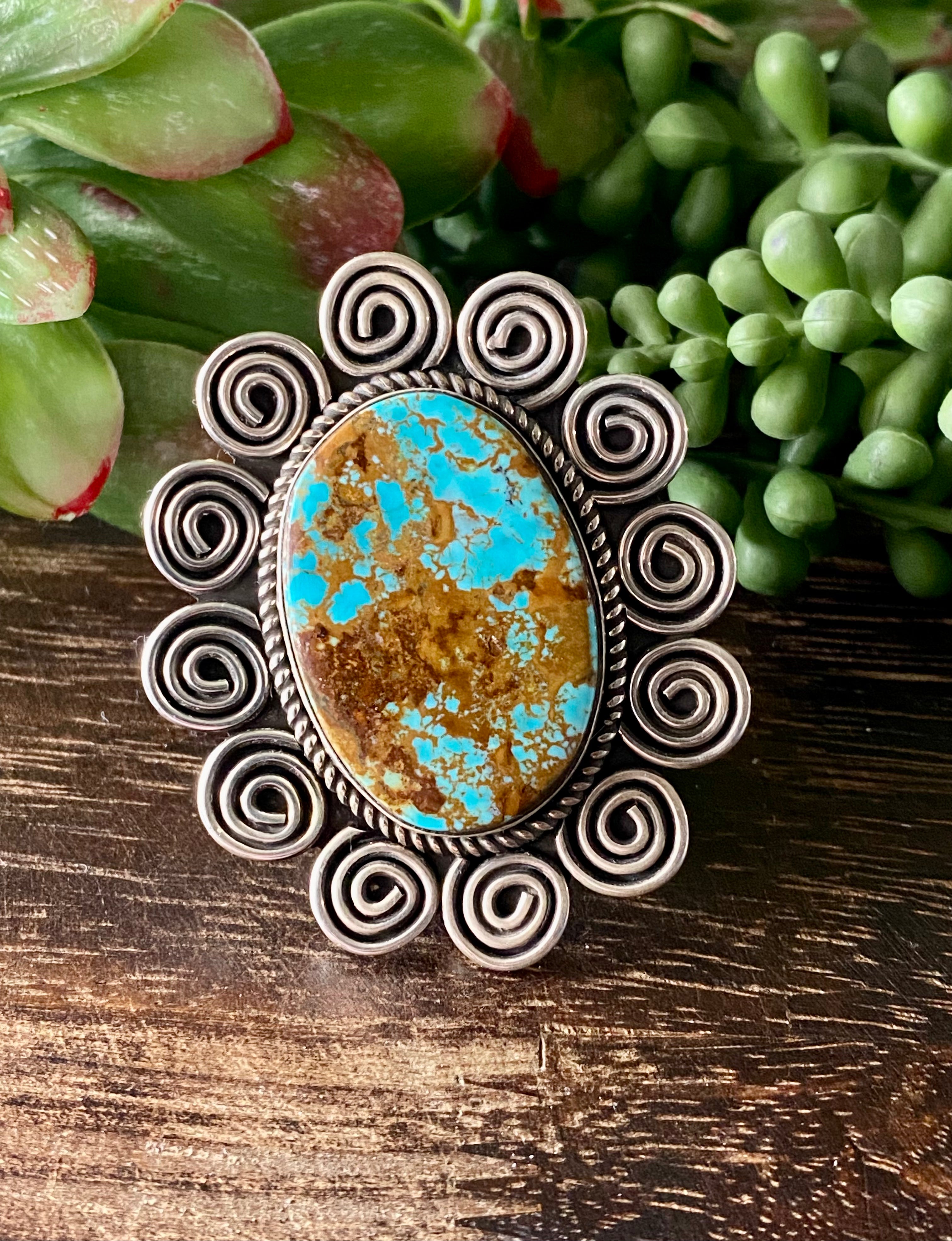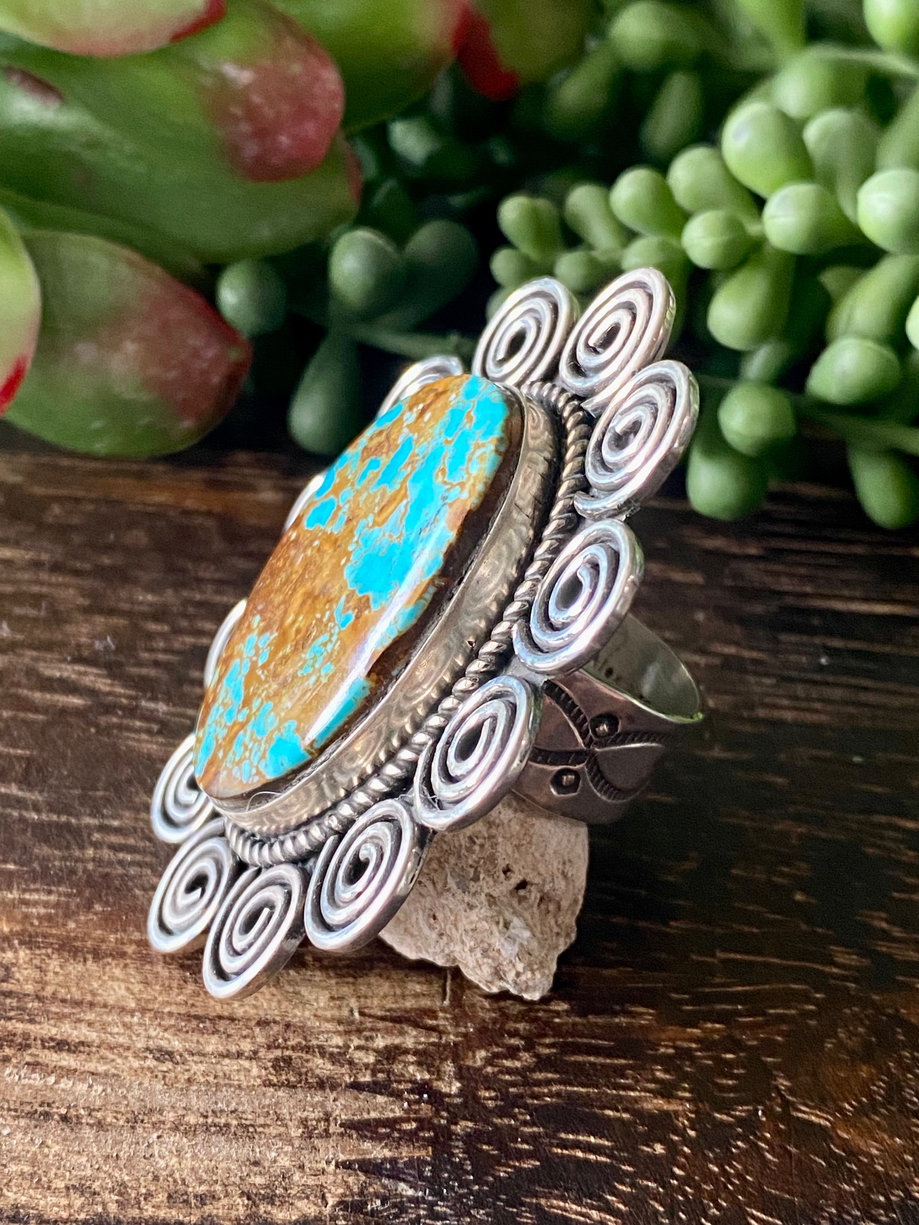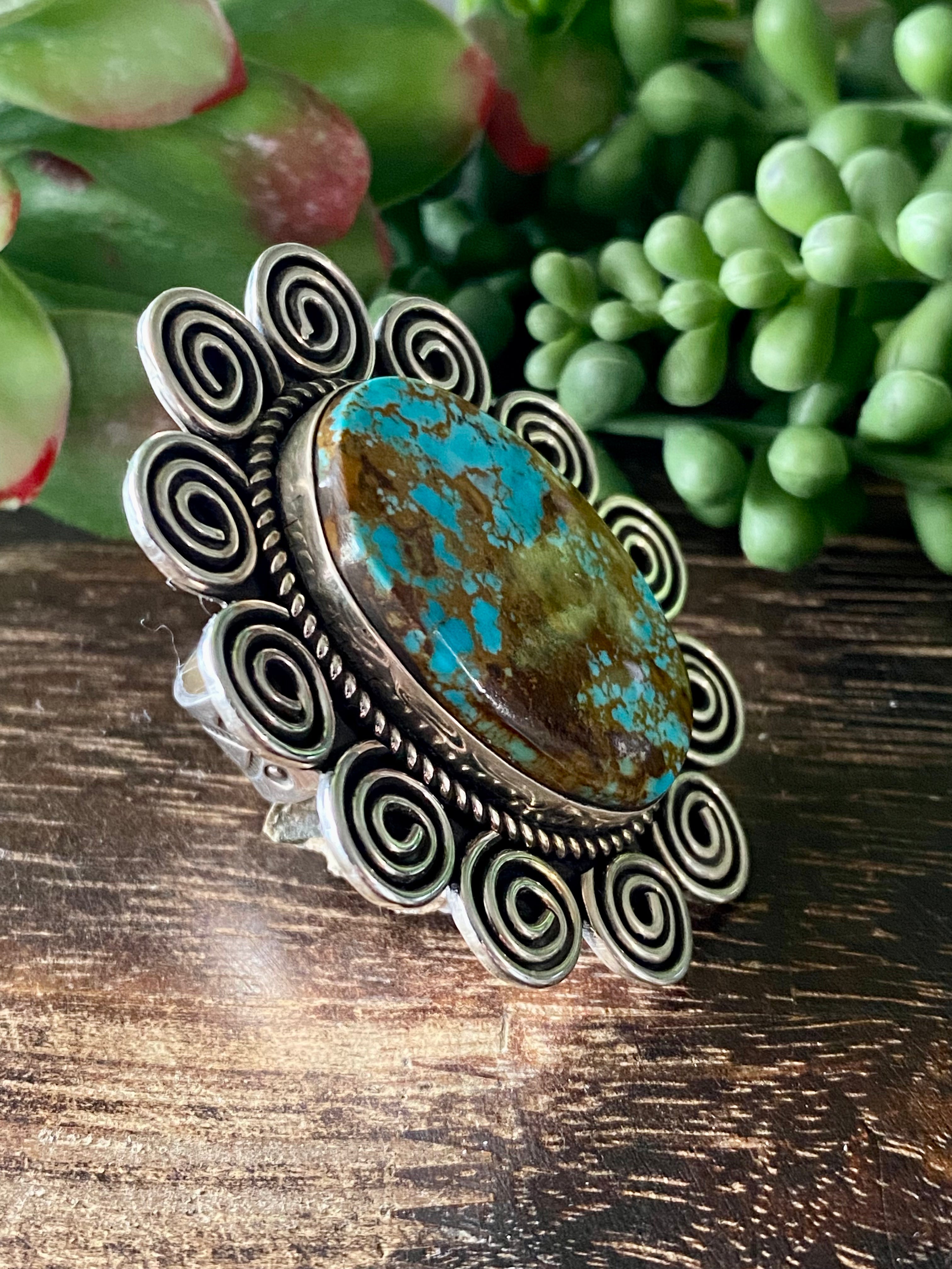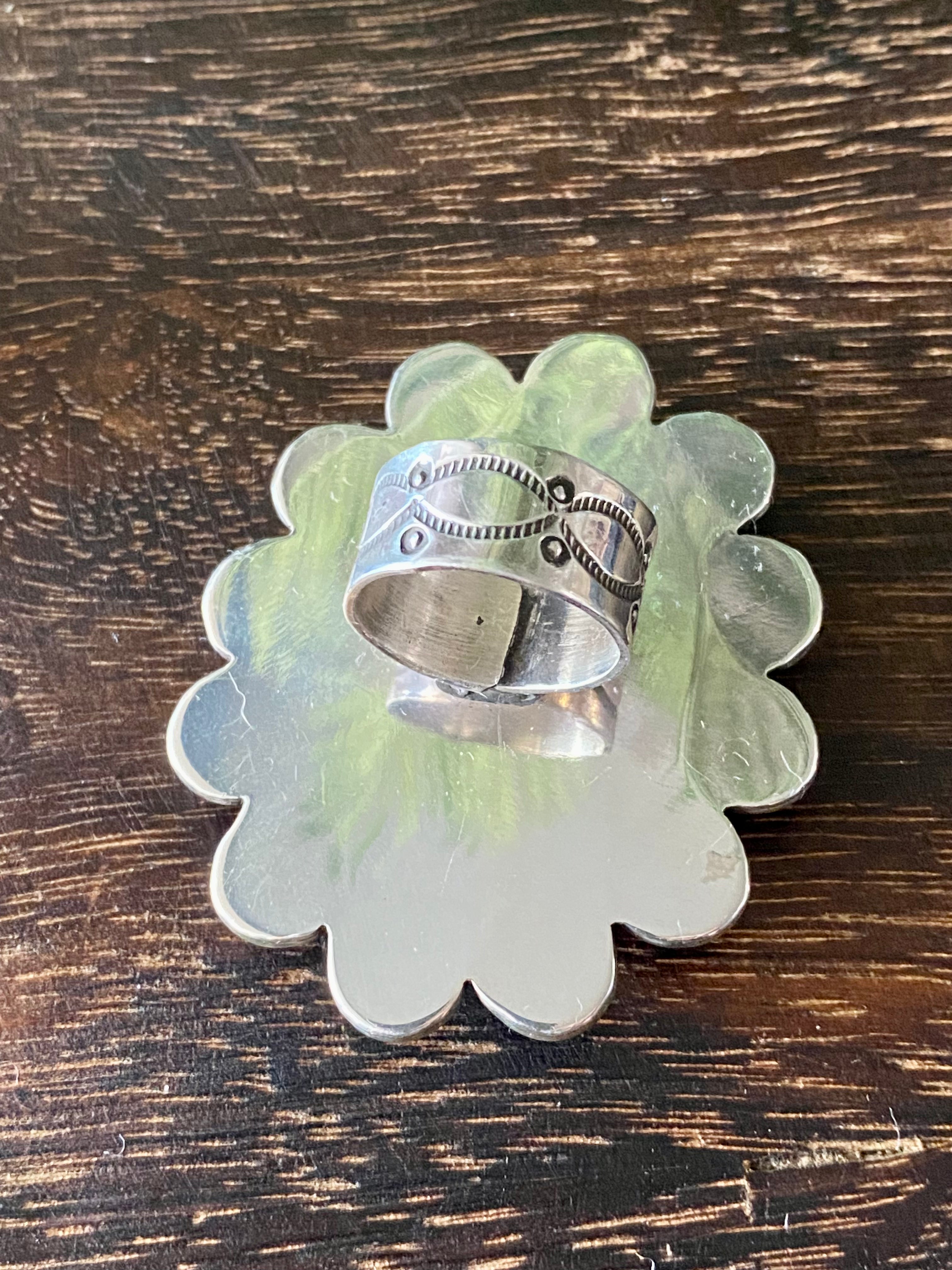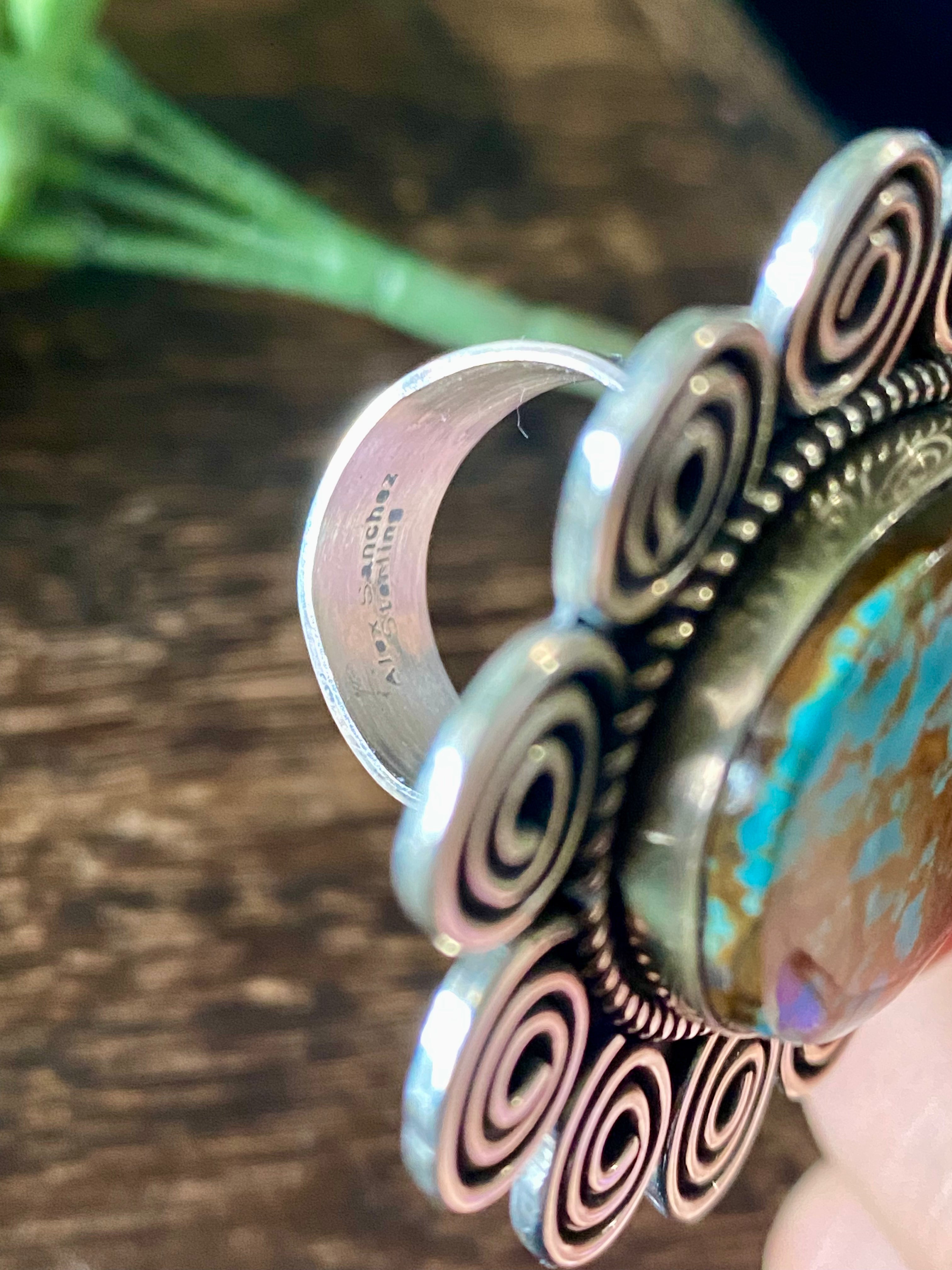 Alex Sanchez Kings Manassa Turquoise & Sterling Silver Adjustable Ring Size 8. It measures just over 2 3/8 inches long and 2 inches wide. Signed by the artist and stamped sterling silver.
