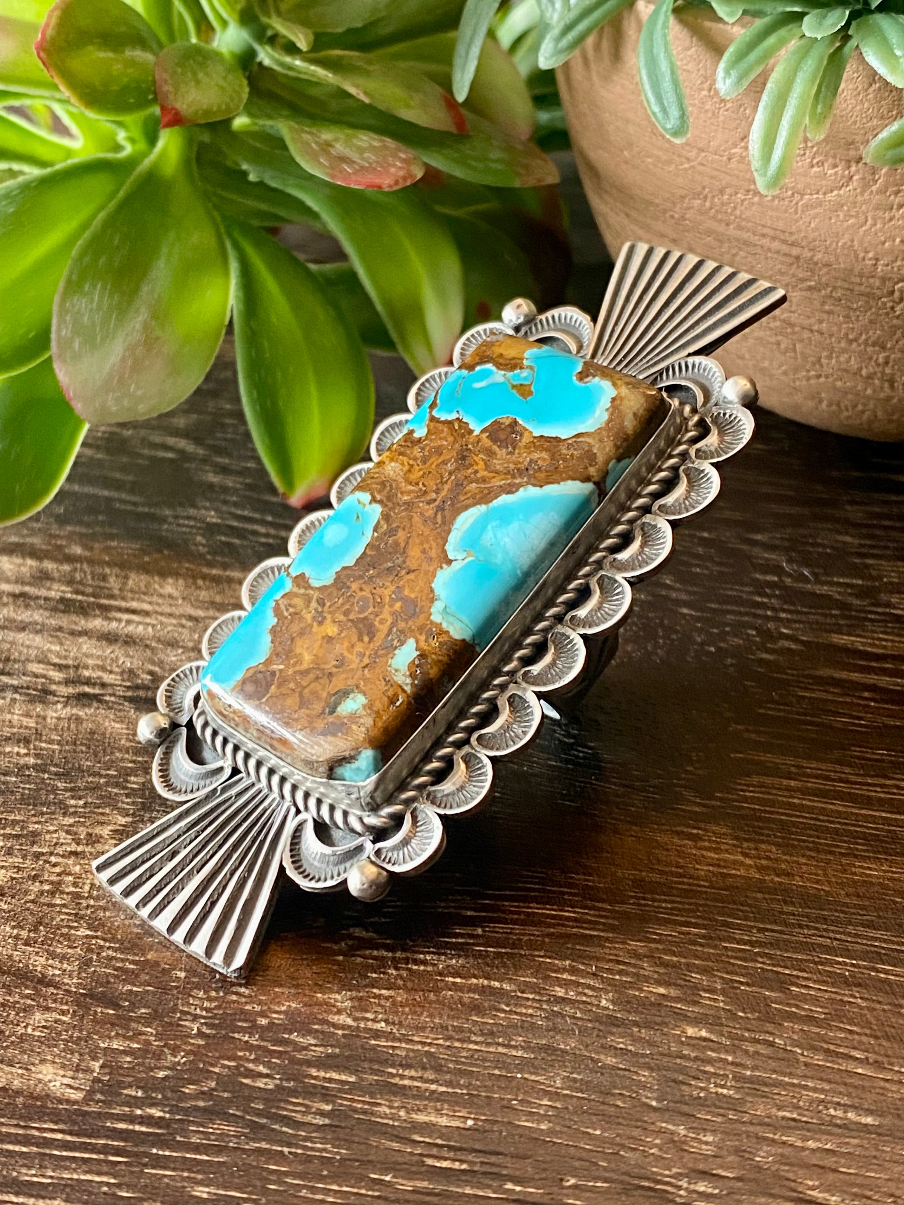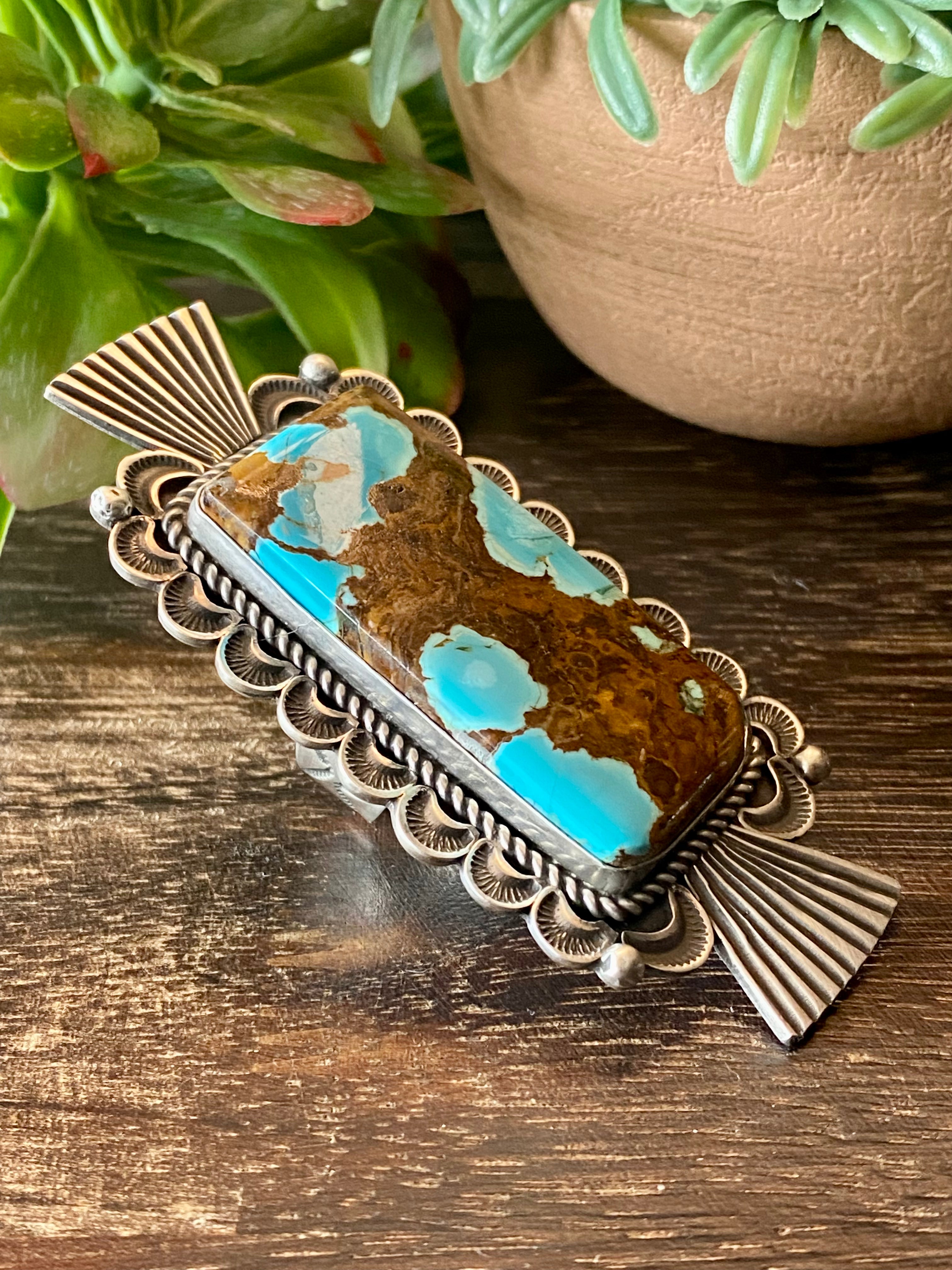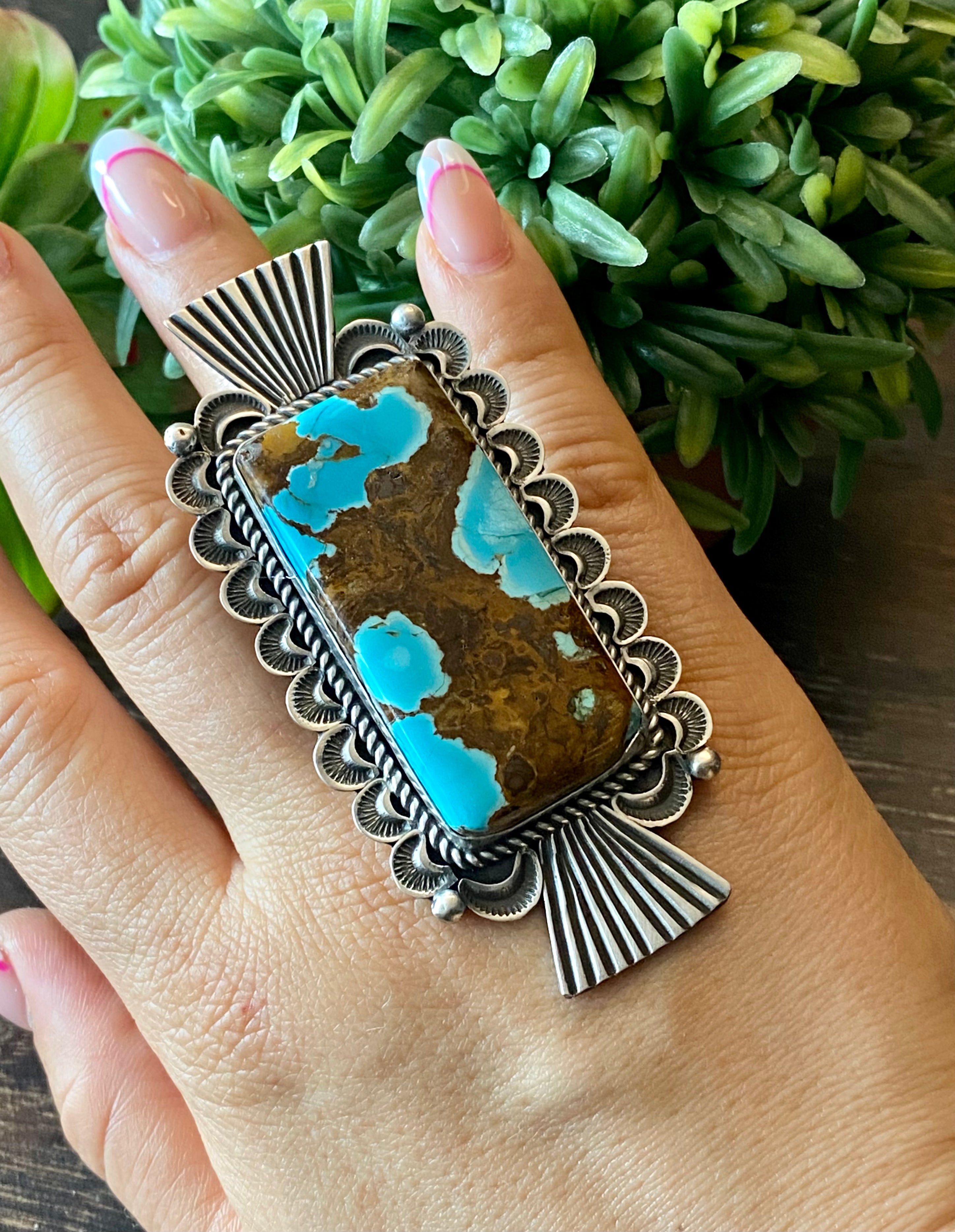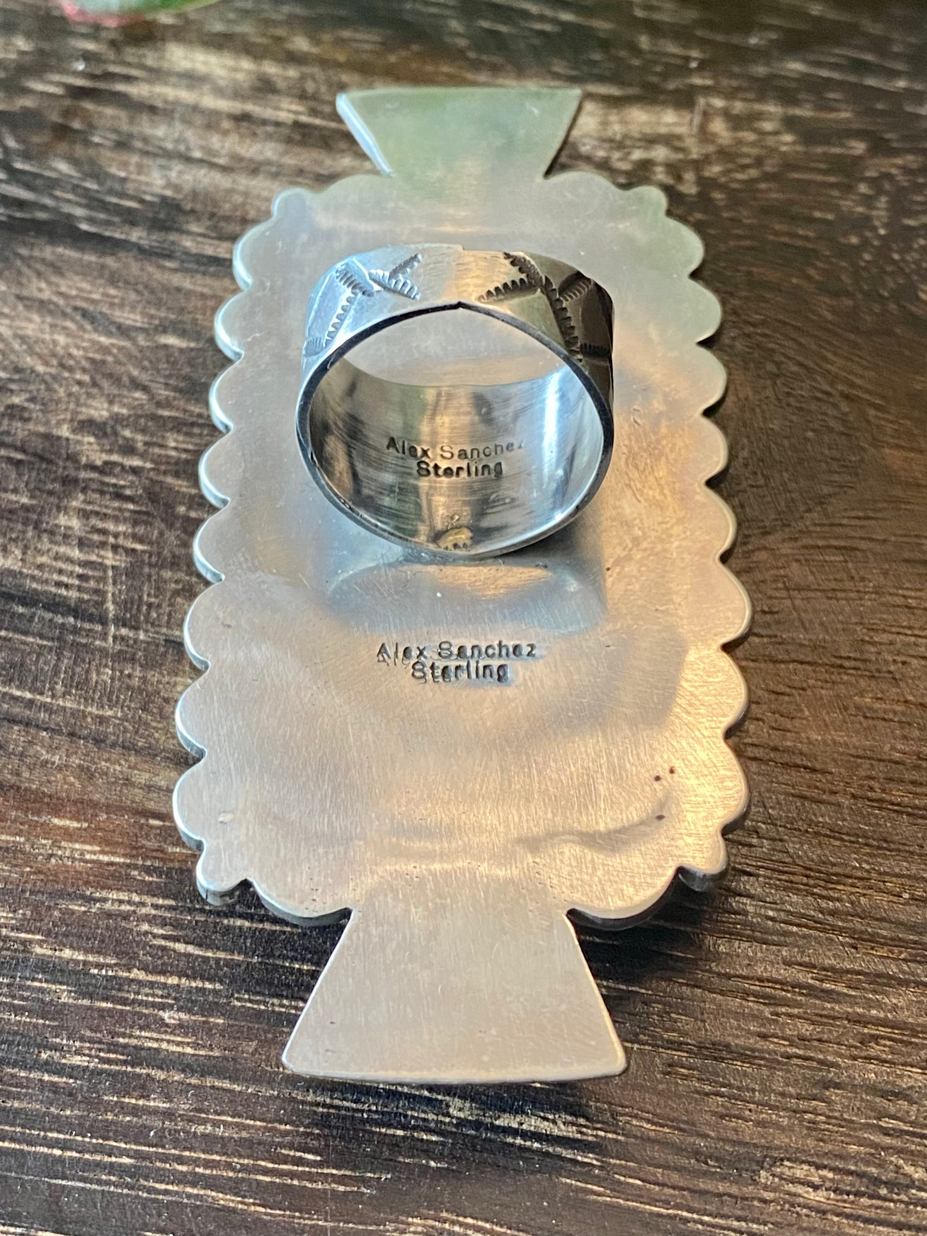 Alex Sanchez Natural #8 Turquoise & Sterling Silver Ring Size 9. It measures 3 3/8 inches long and just over 1 1/2 inches wide. Signed by the artist and stamped sterling silver.