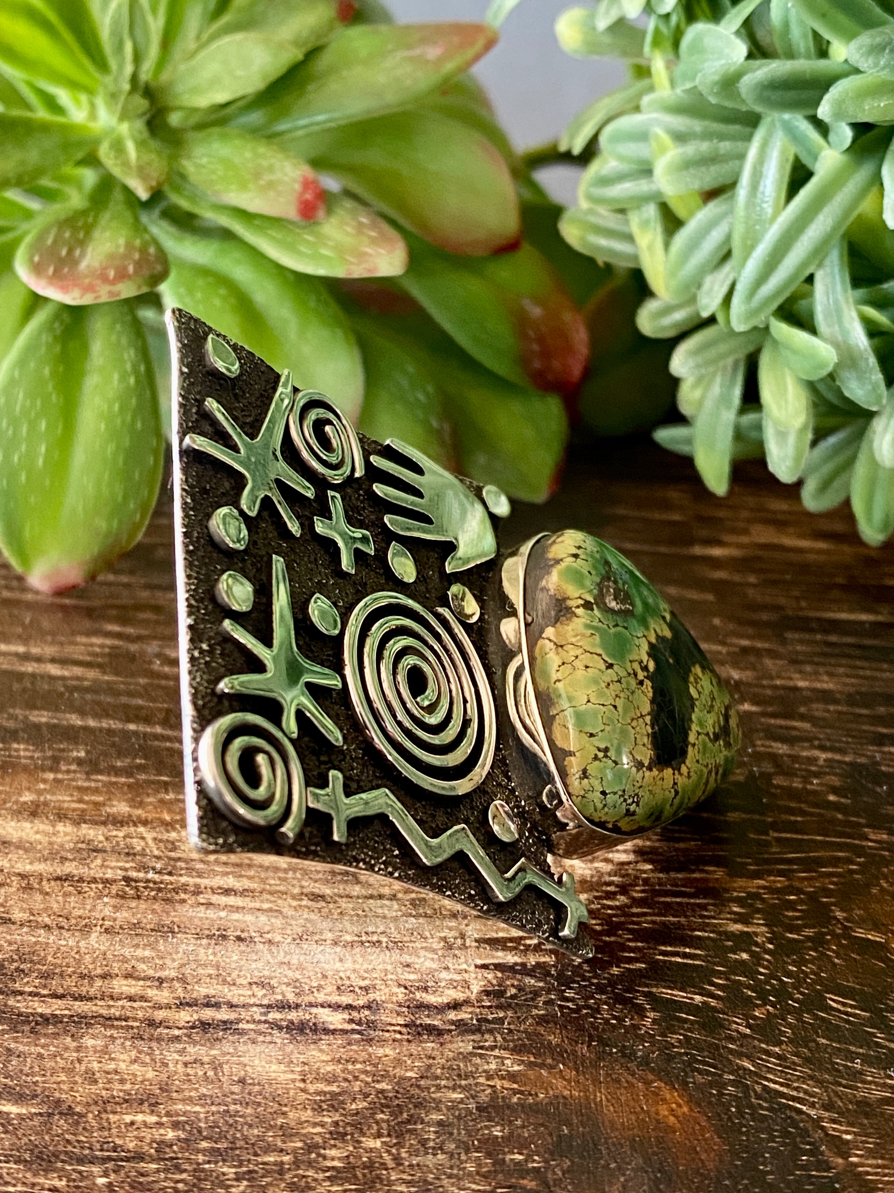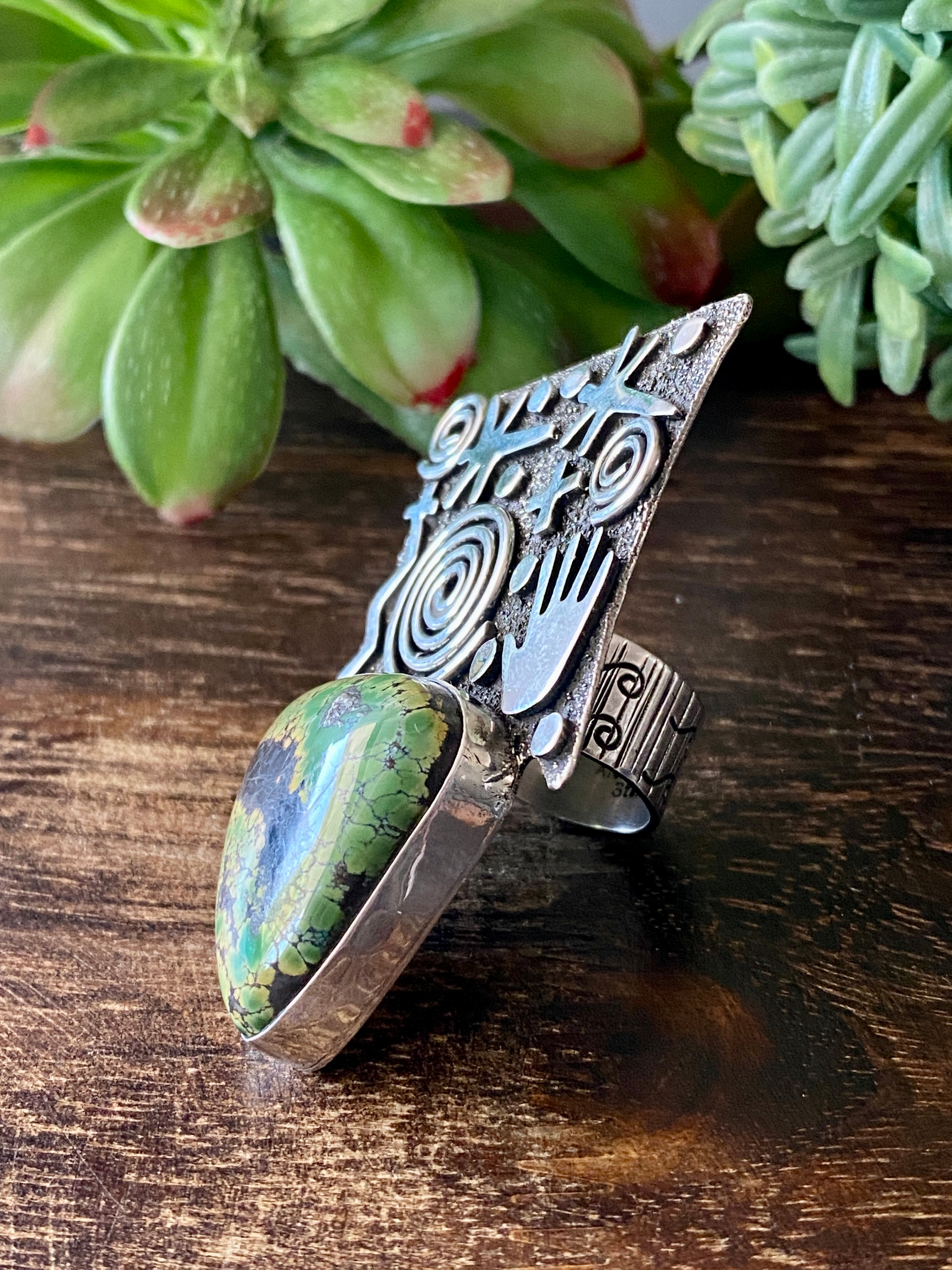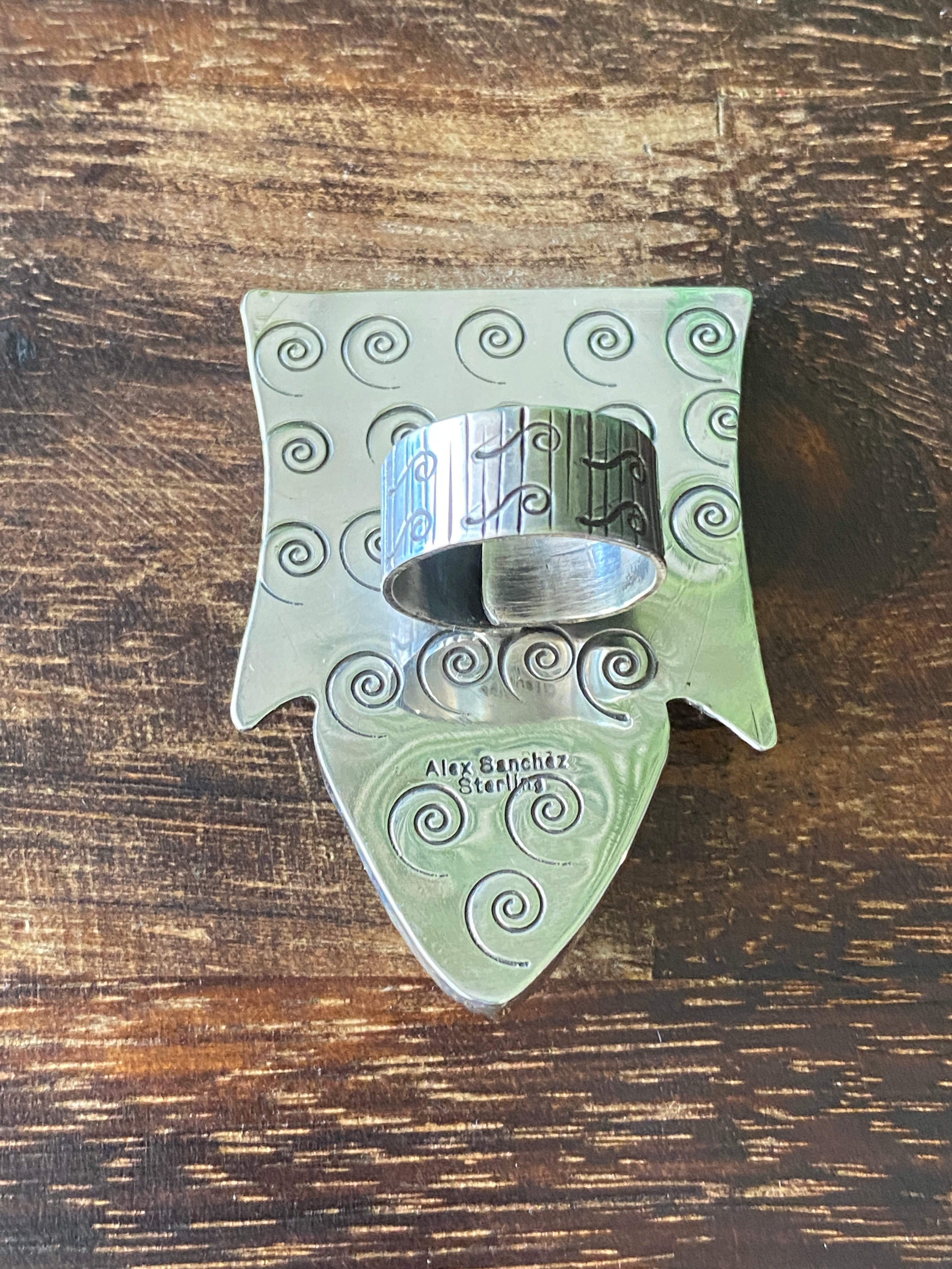 Alex Sanchez Natural Black Jack Turquoise & Sterling Silver Adjustable Ring Size 8. It measures 2 1/2 inches long and 1 5/8 inches wide. Signed by the artist and stamped sterling silver.