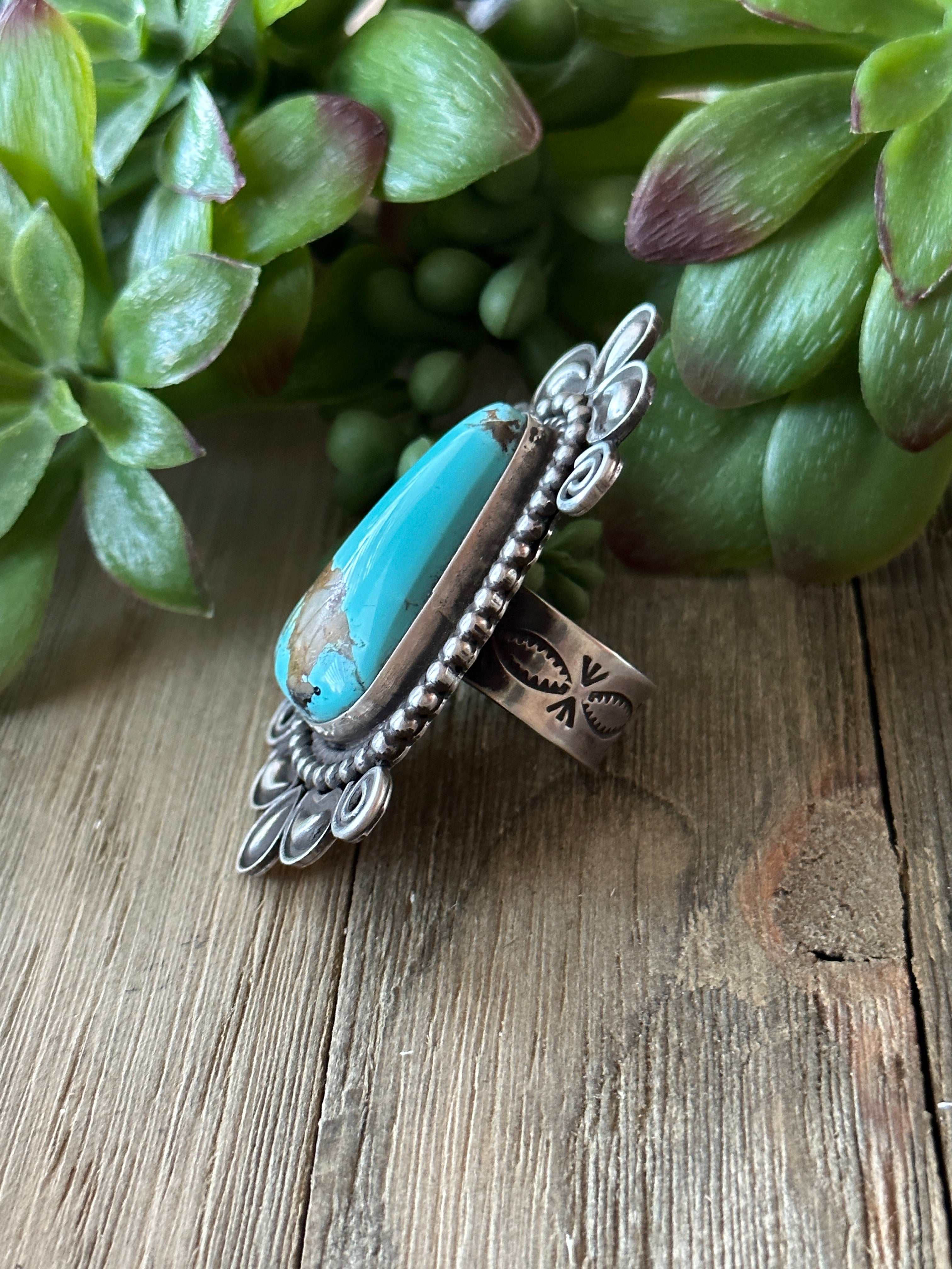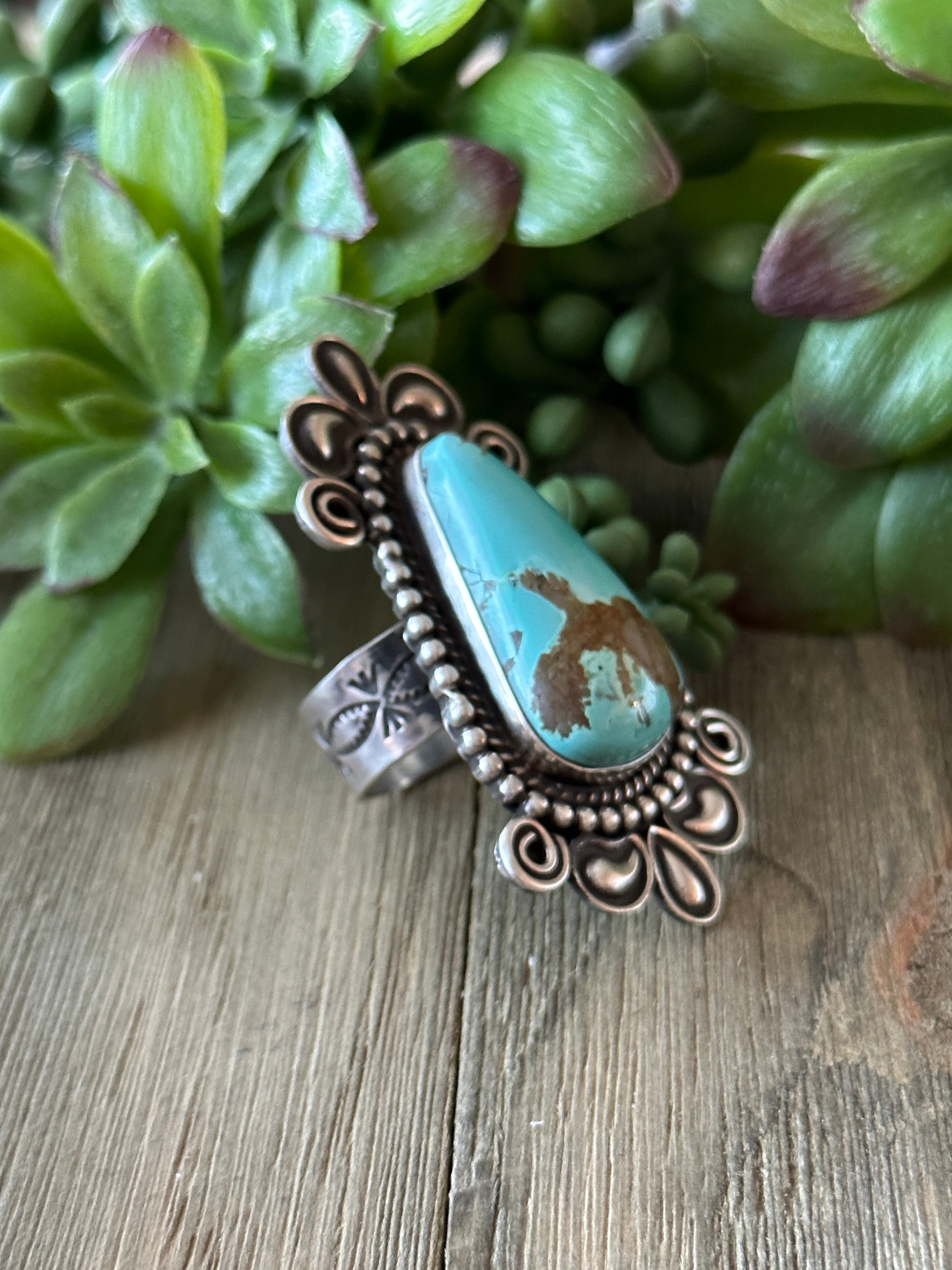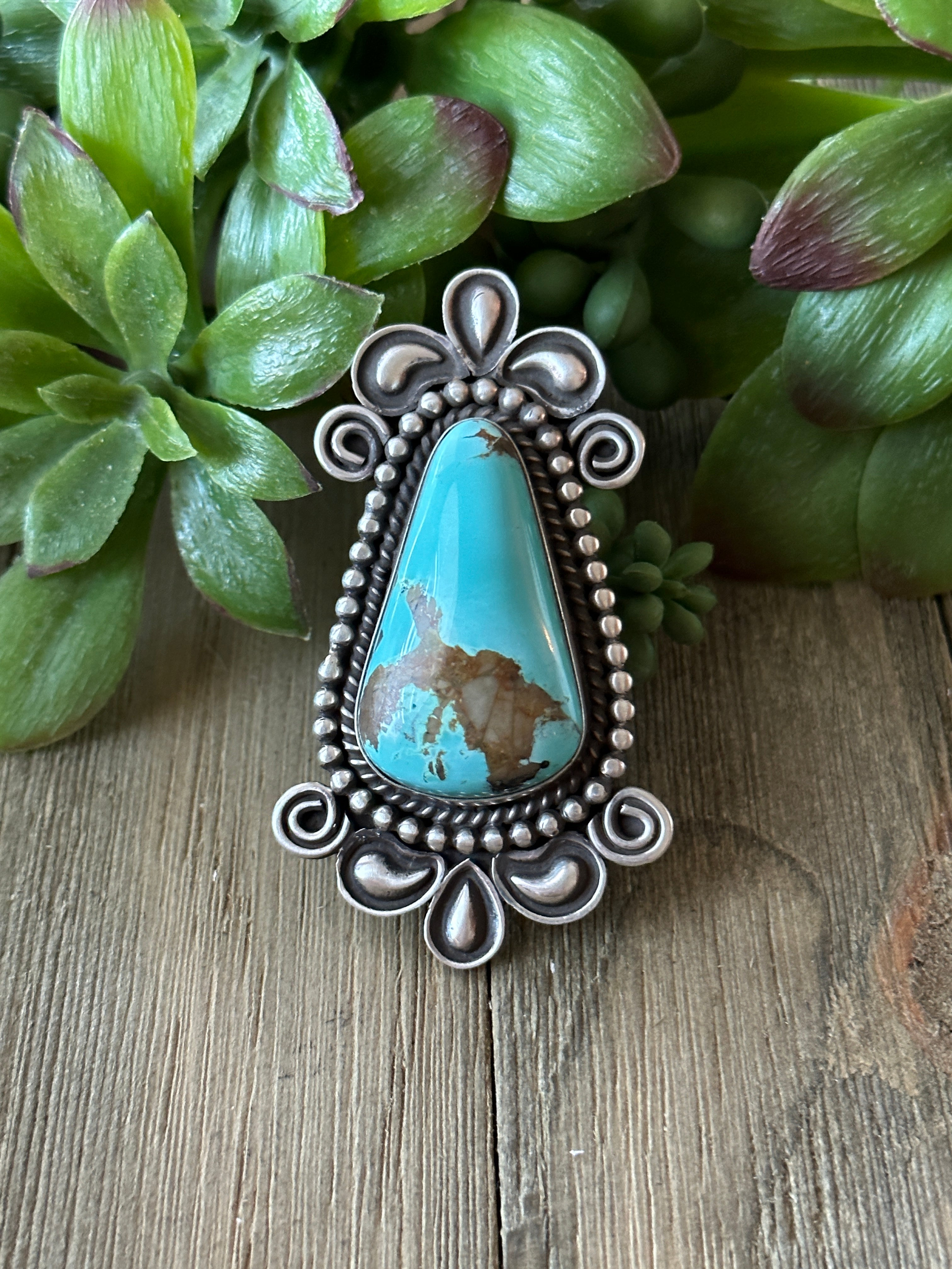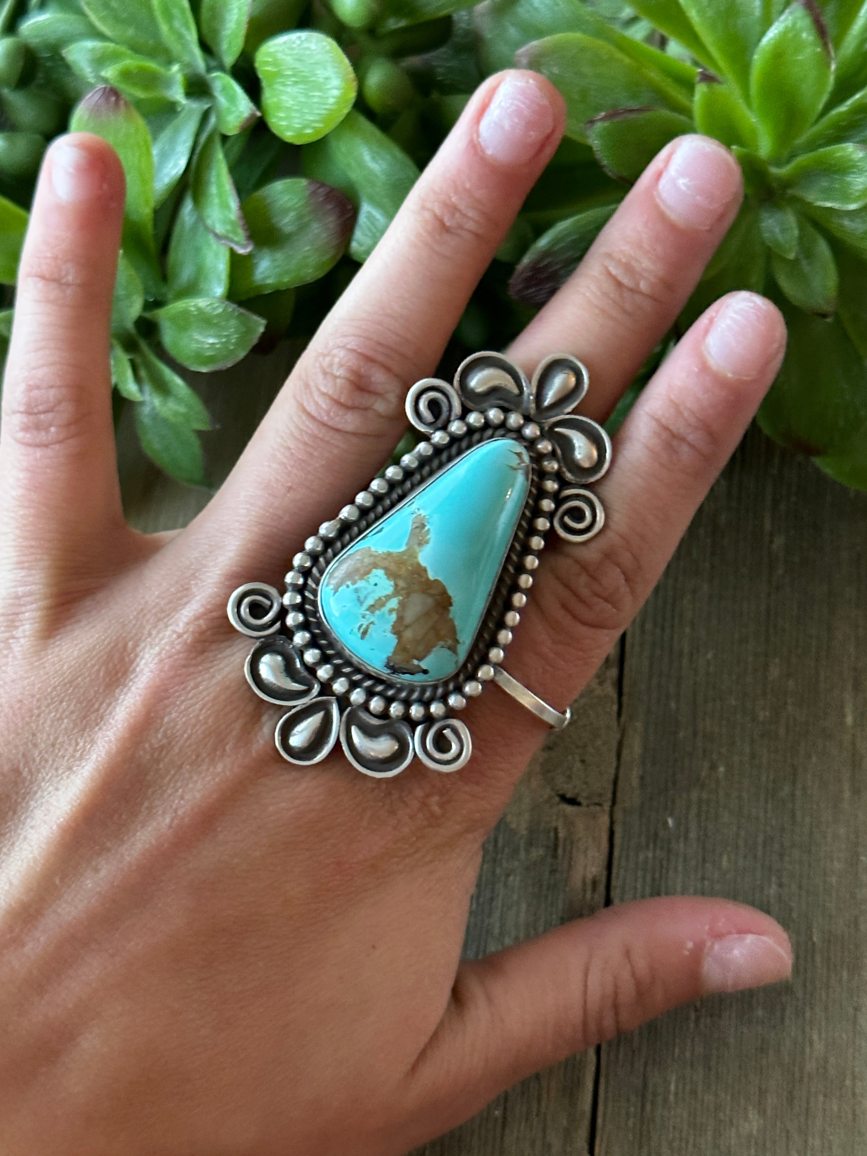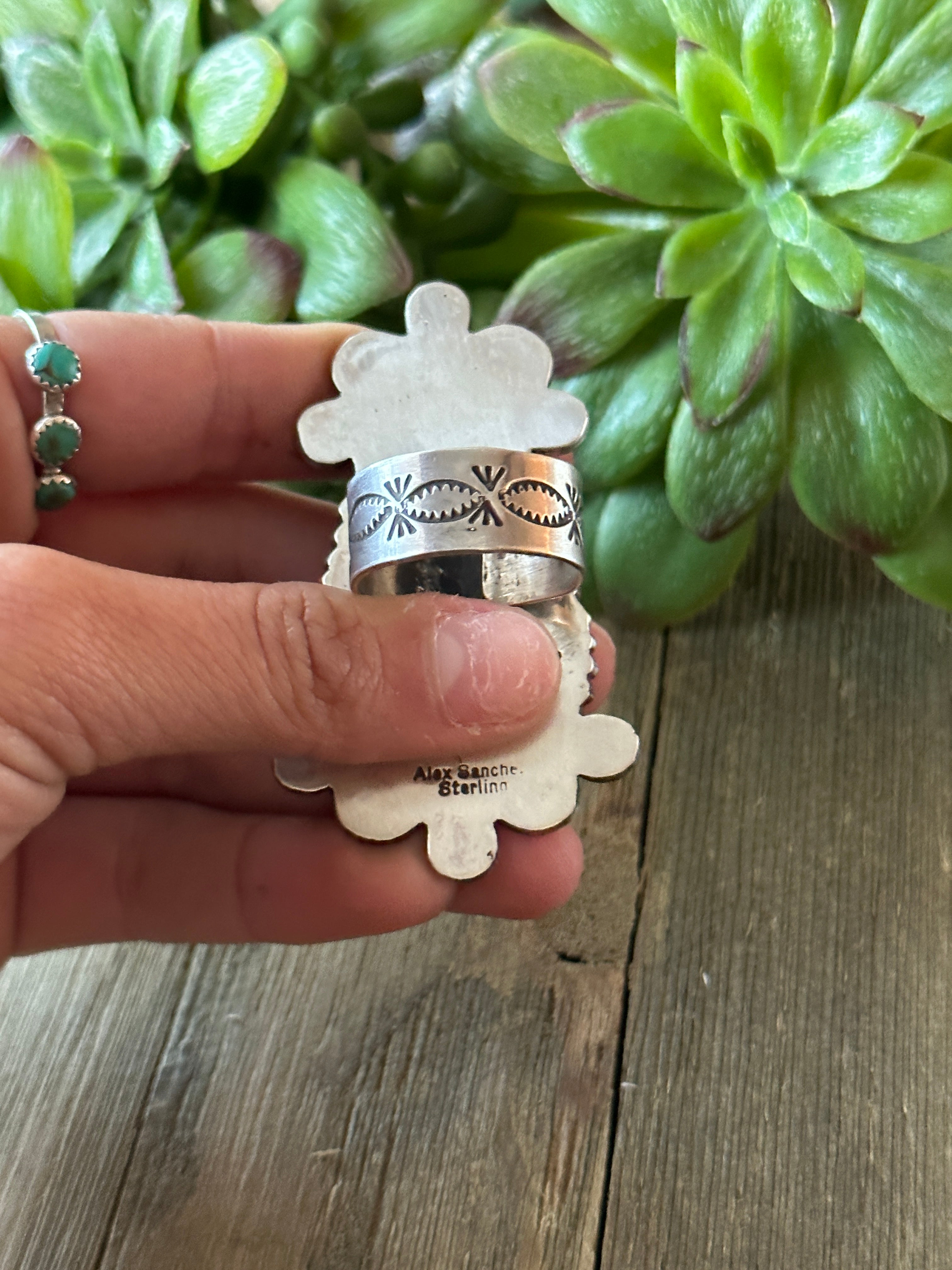 Alex Sanchez Natural Royston Turquoise & Sterling Silver Adjustable Ring. It measures 2 1/2 inches long and 1 1/2 inches wide. Signed by the artist and stamped sterling silver.