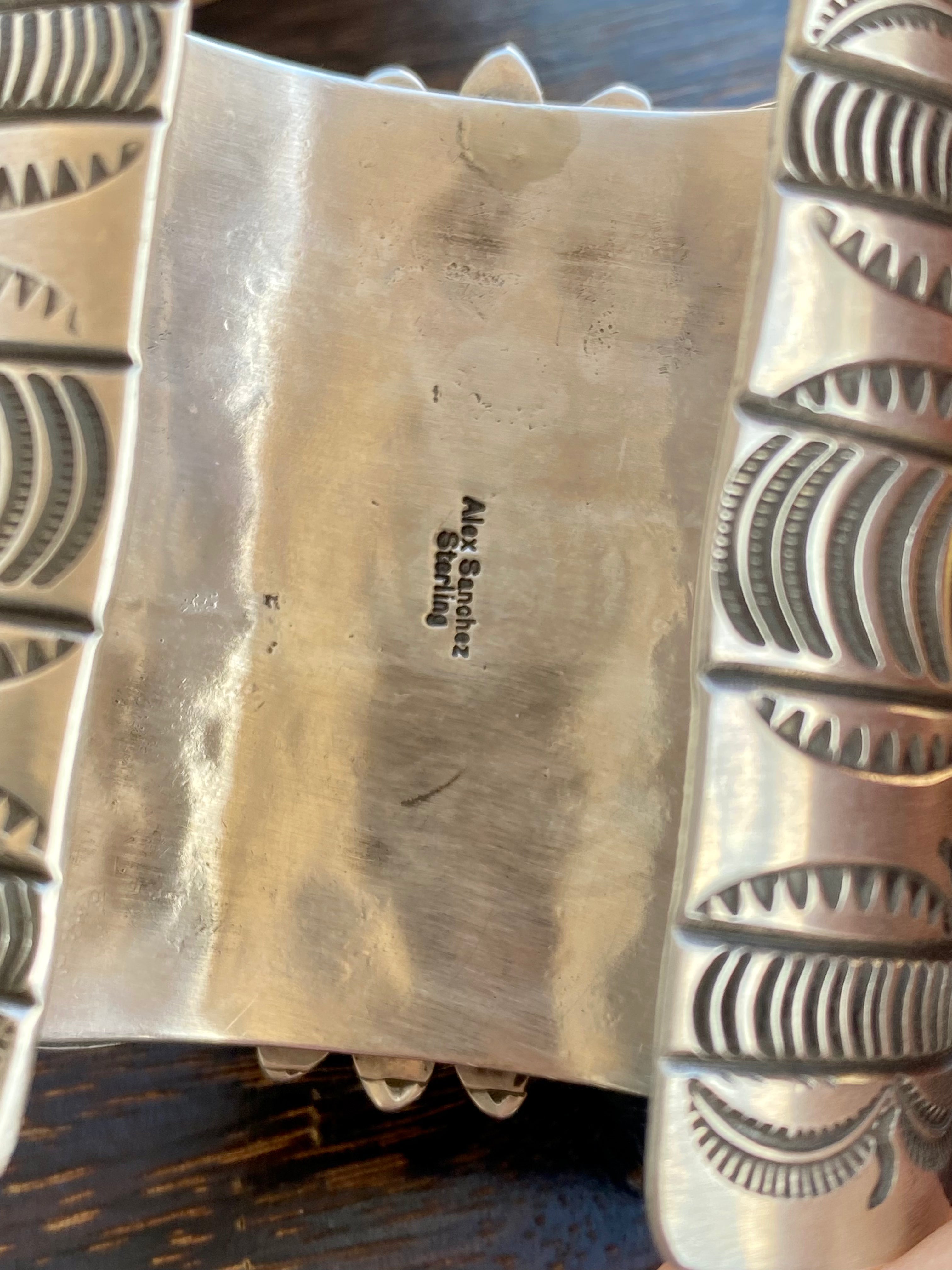 Alex Sanchez Natural Royston Turquoise & Sterling Silver Cuff Bracelet. It measures 3 inches wide with an inside circumference of 5 5/8 inches and a gap of 1 inch. Signed by the artist and stamped sterling.