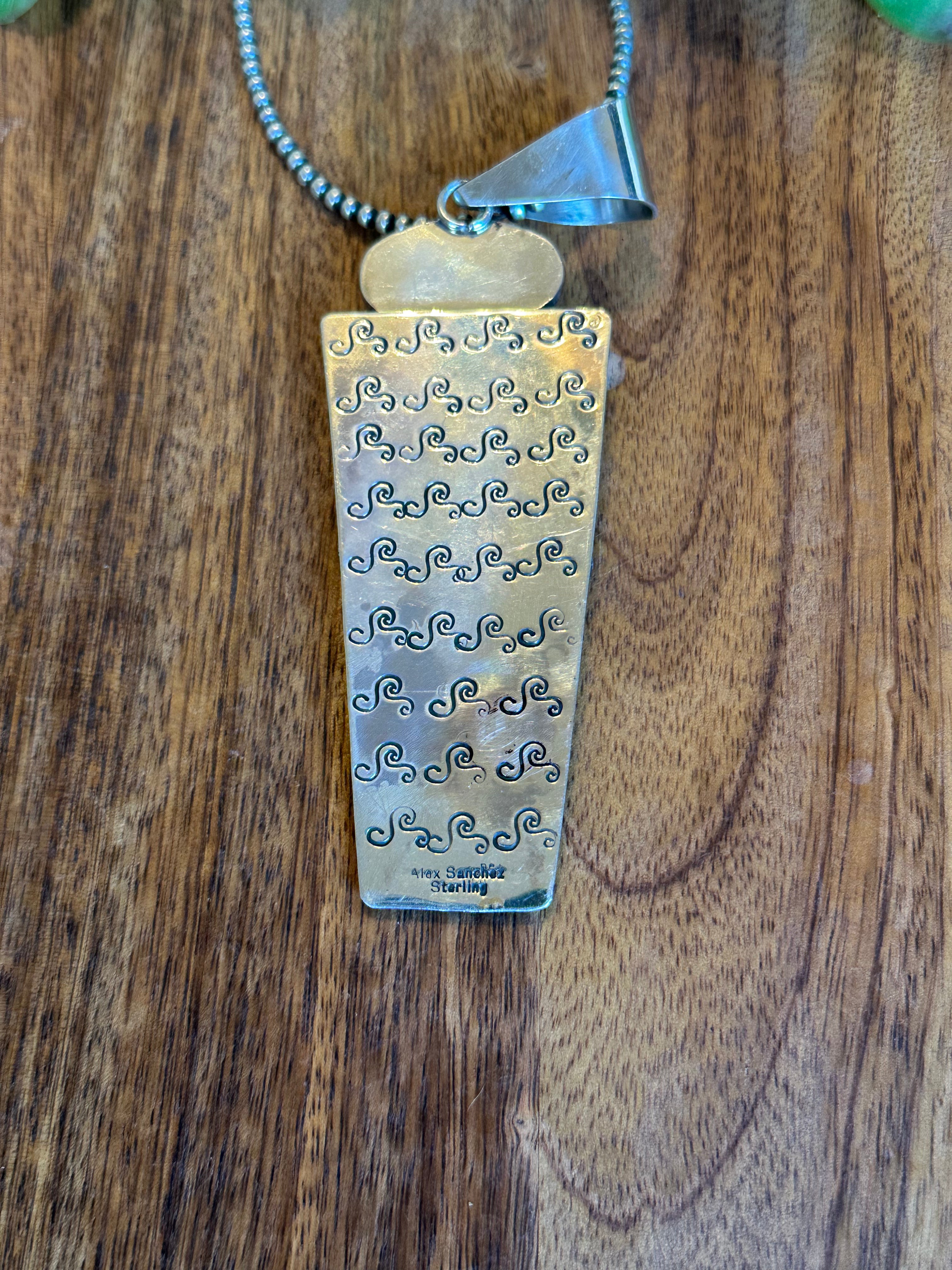 Gorgeous tiny pendants. Alex Sanchez Natural Royston Turquoise & Sterling Silver Pendant. It measures 4 5/8 inches long and 1 1/2 inches wide. Pendant Only. Signed by the artist and stamped sterling silver.