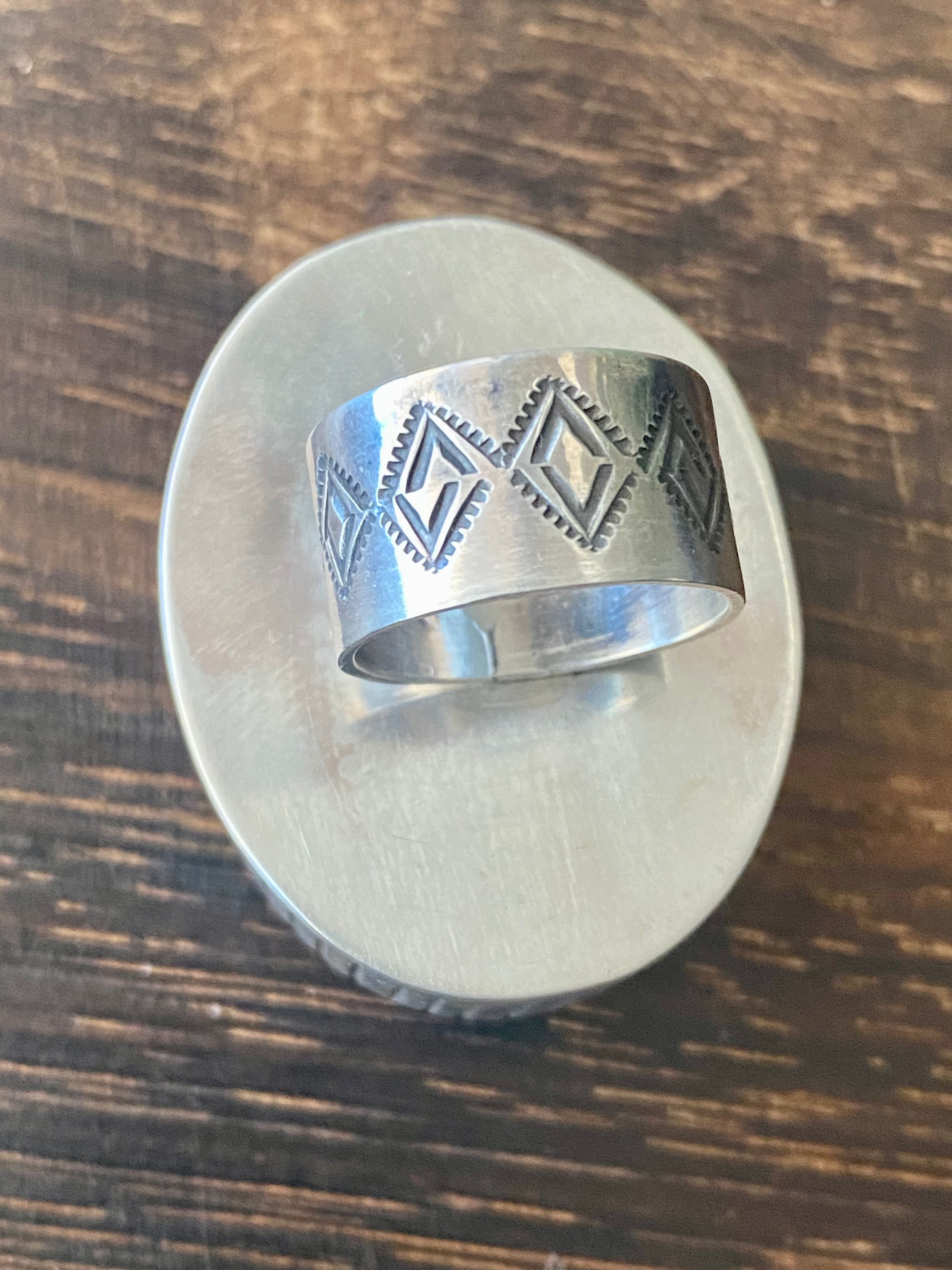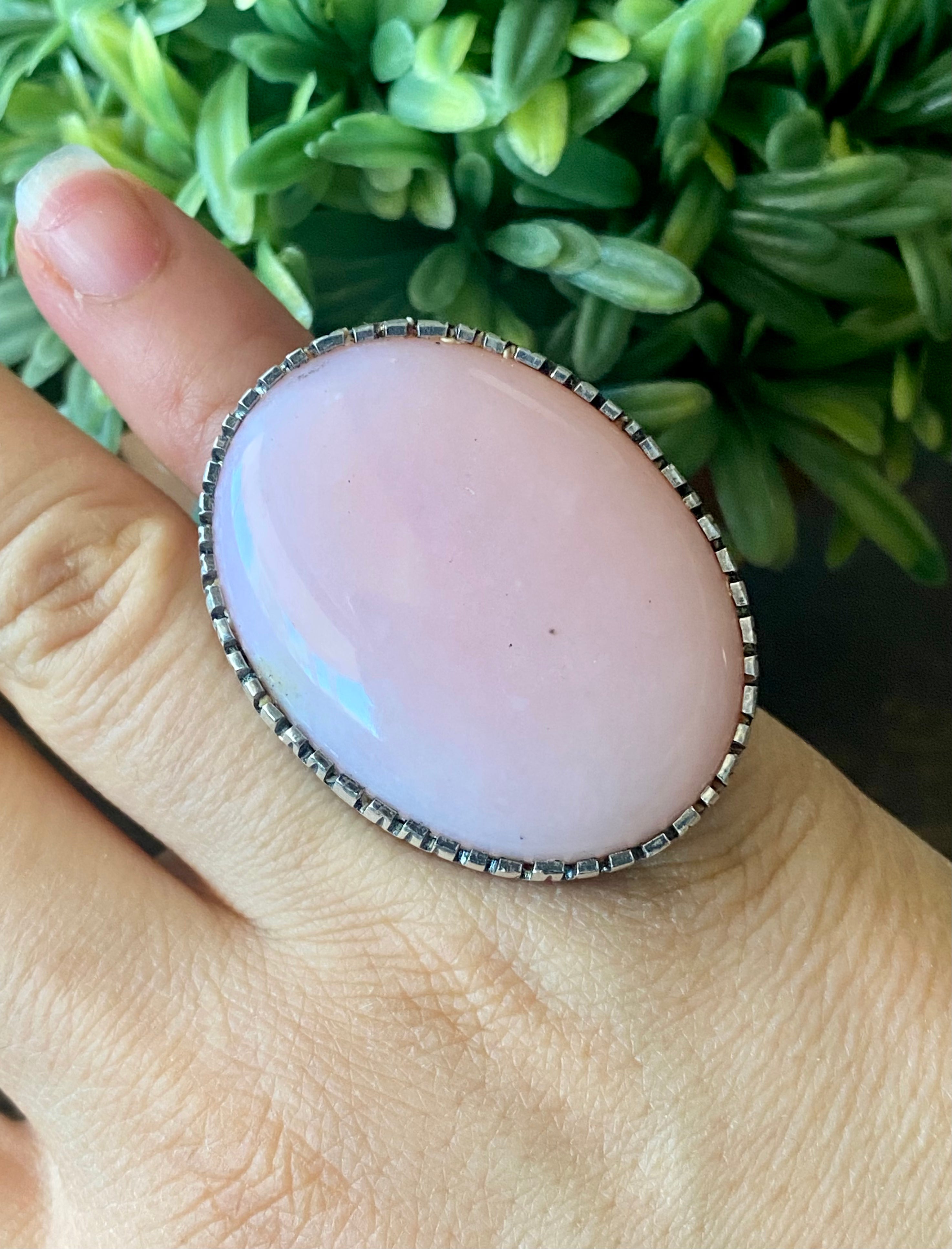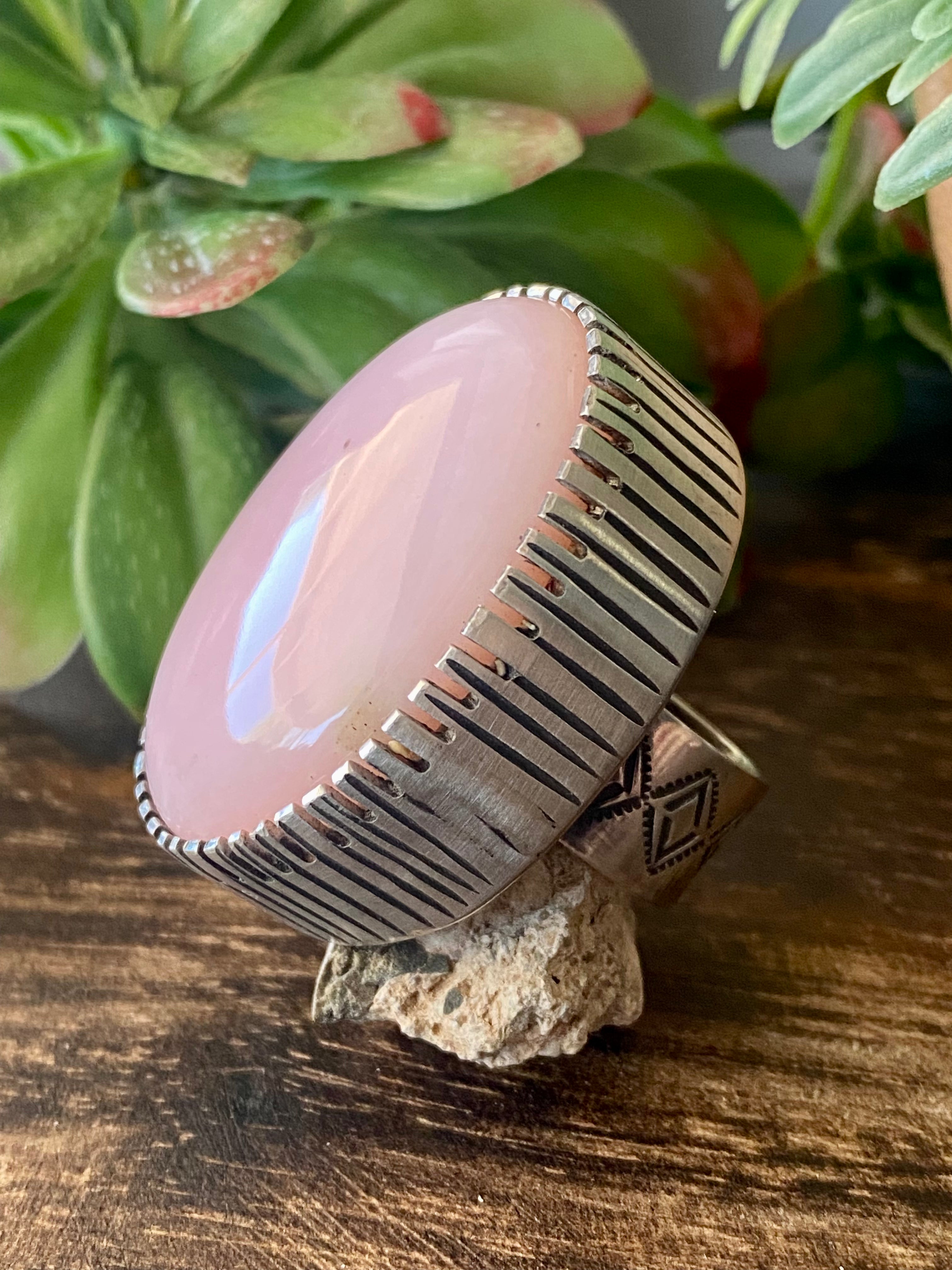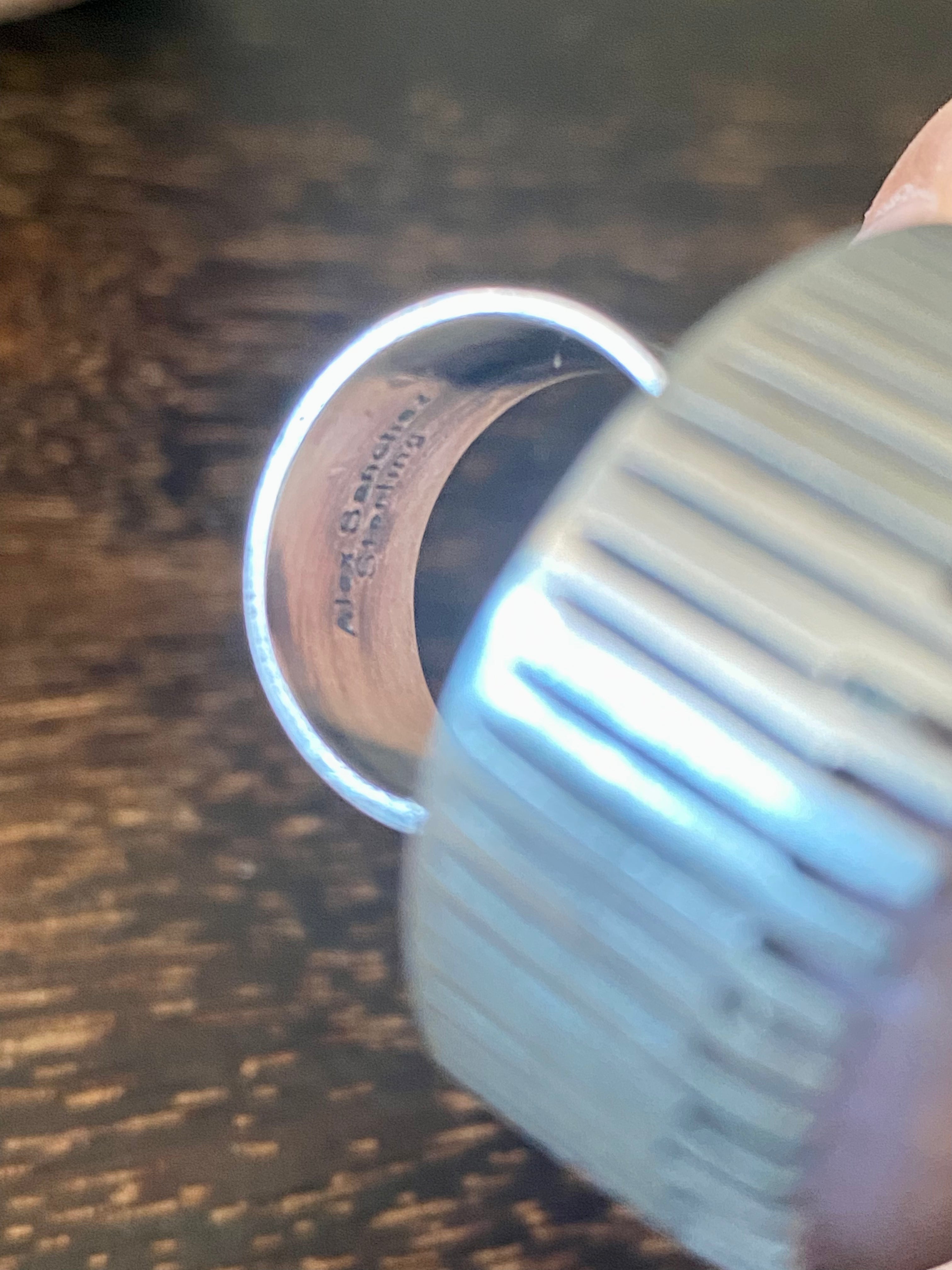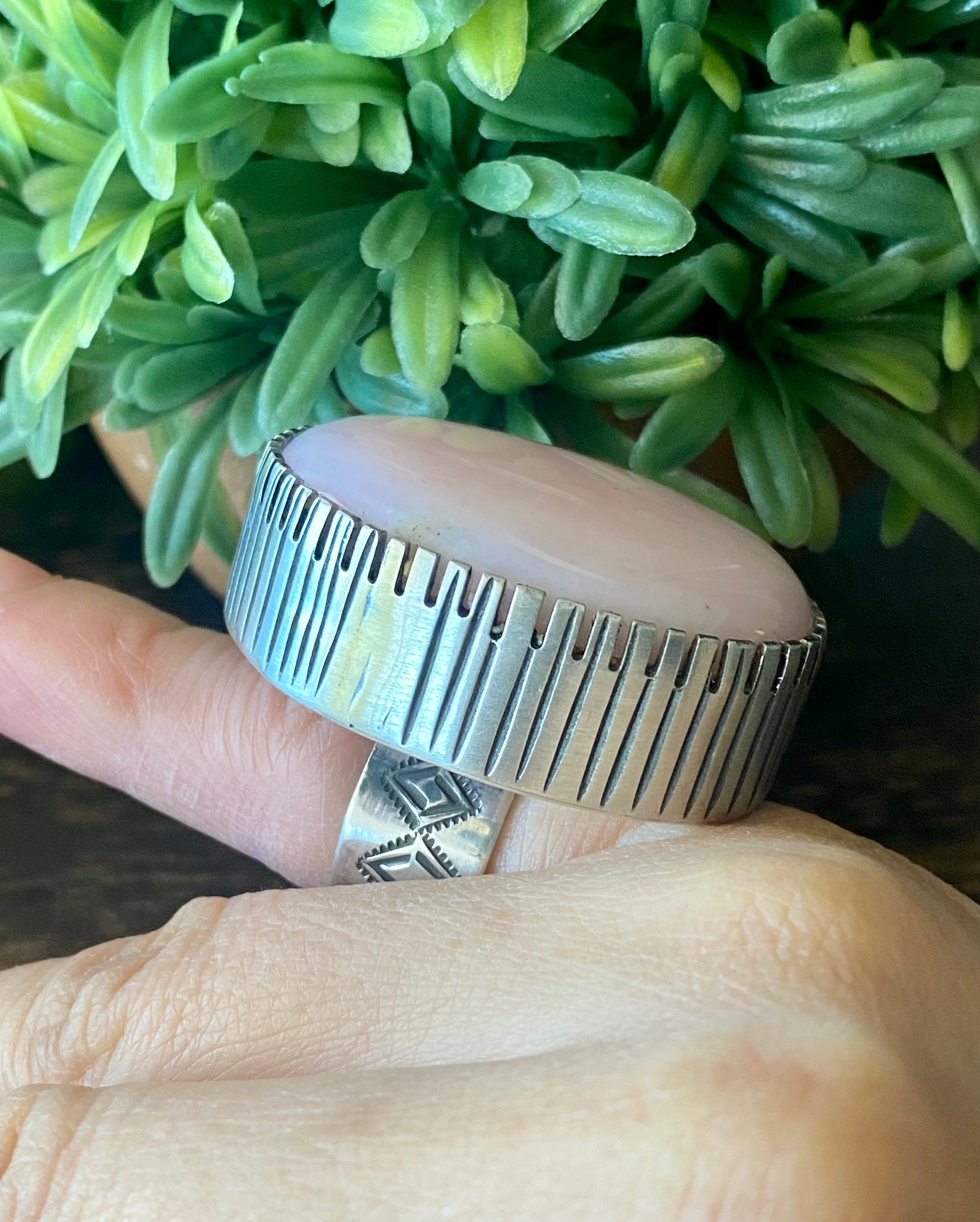 Alex Sanchez Pink Coral & Sterling Silver Ring Size 6.5. It measures 1 5/8 inches long and 1 1/4 inches wide. Signed by the artist and stamped sterling silver.