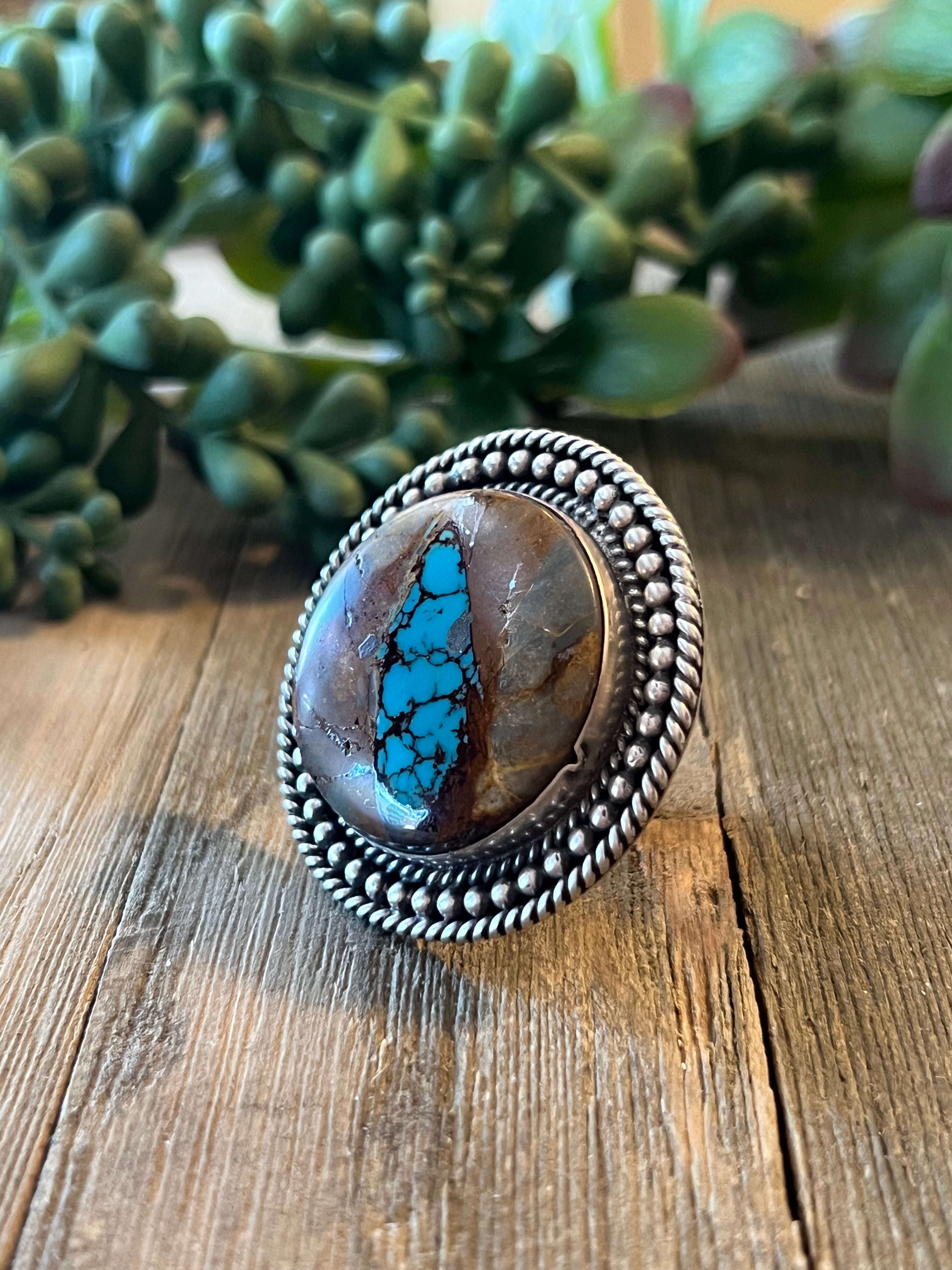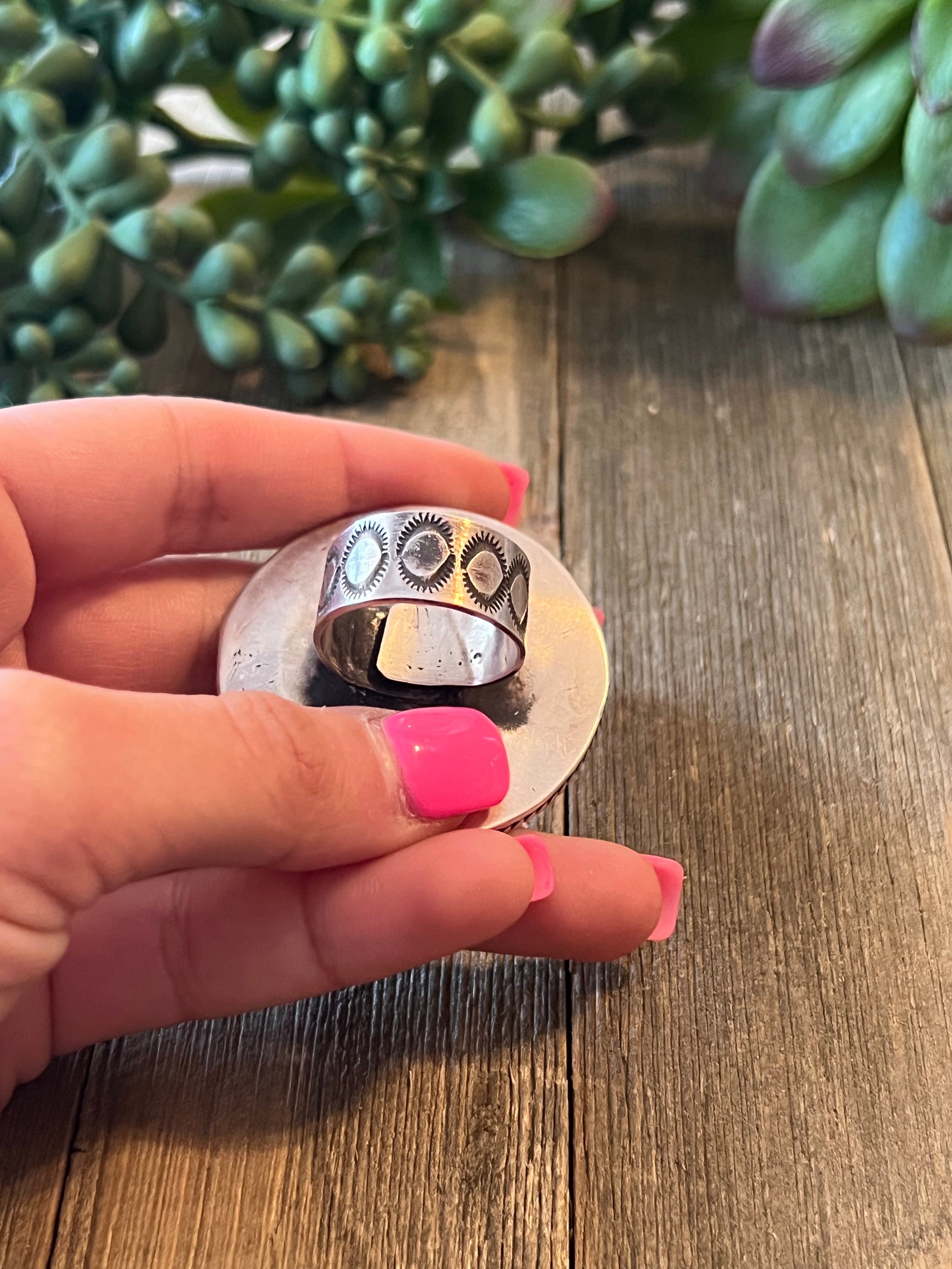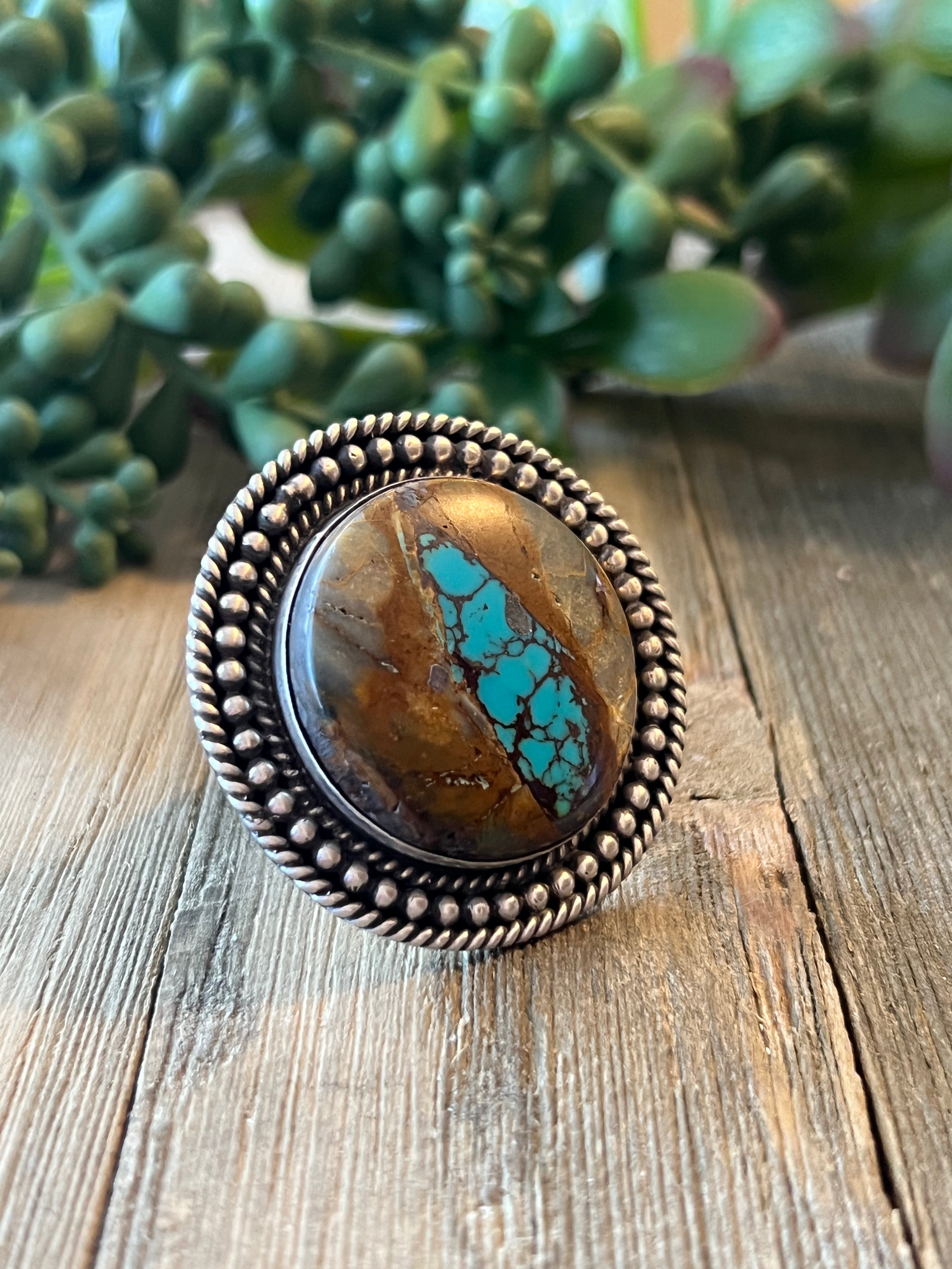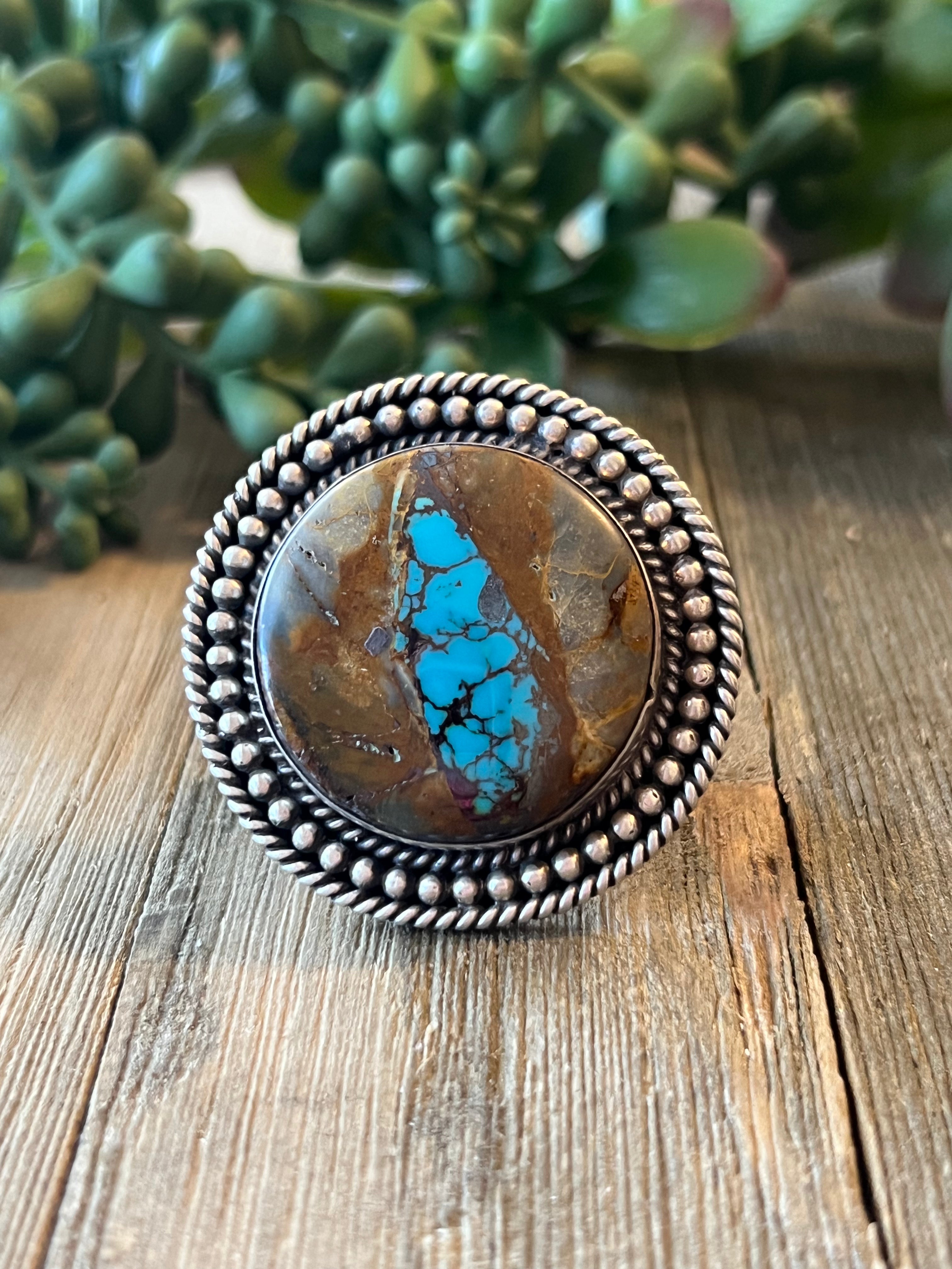 Alex Sanchez Ribbon Royston & Sterling Silver Adjustable Ring. It measures 1 5/8 inches round. Signed by artist and stamped sterling silver.