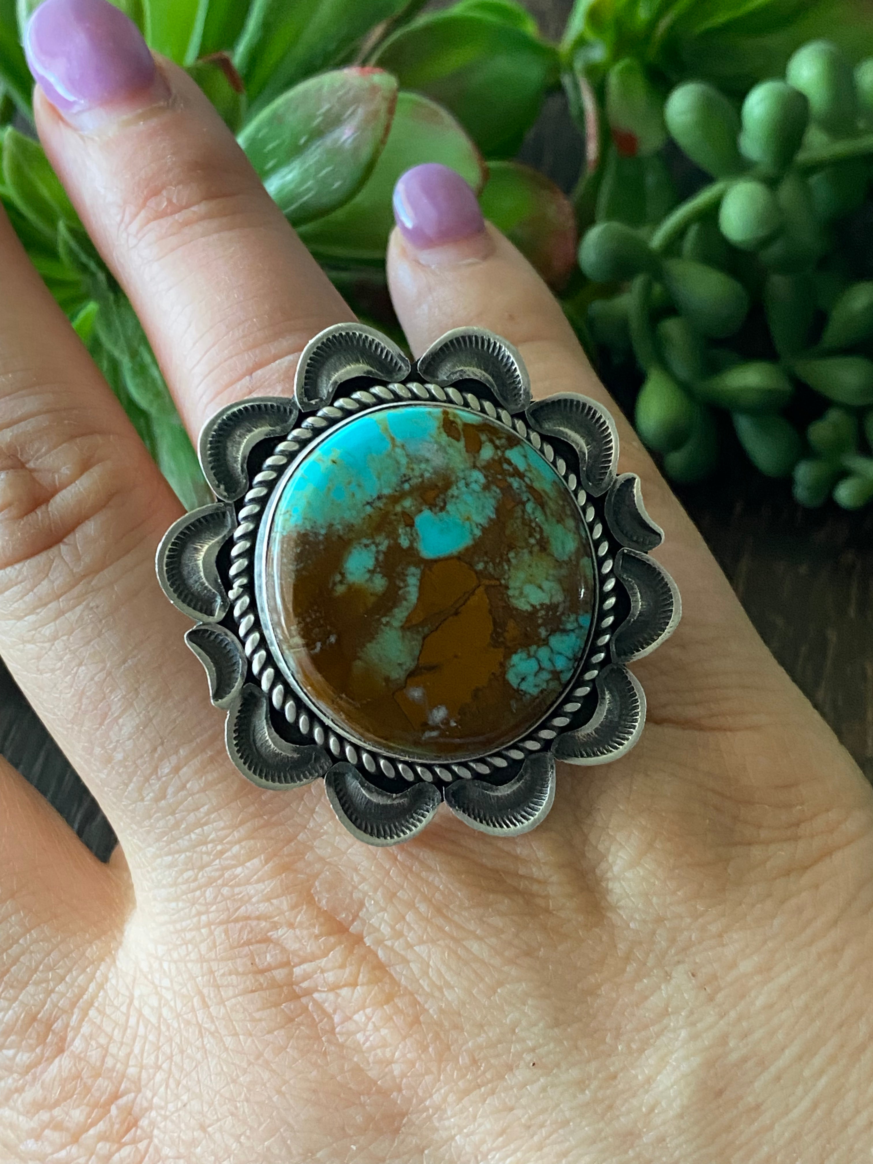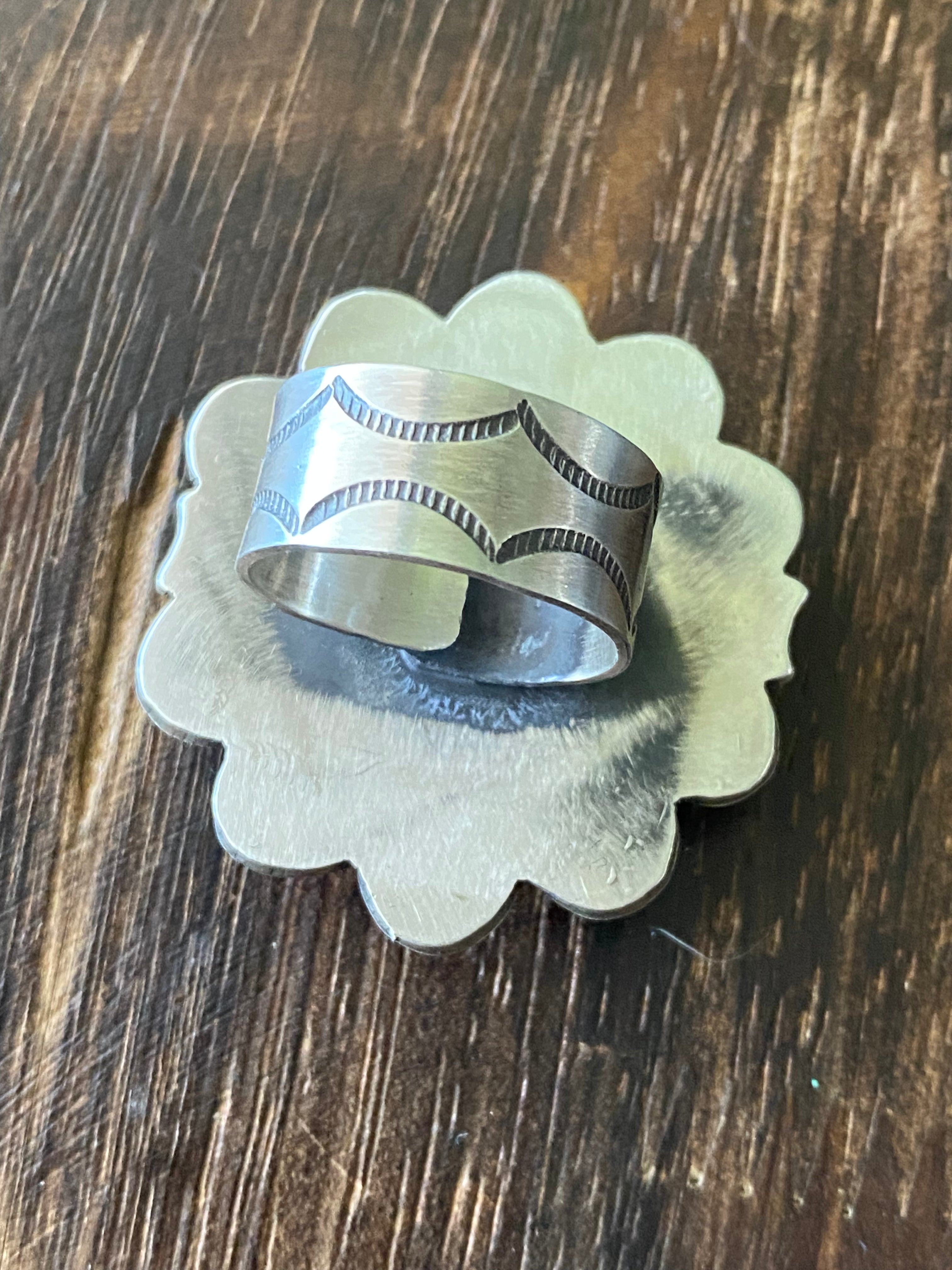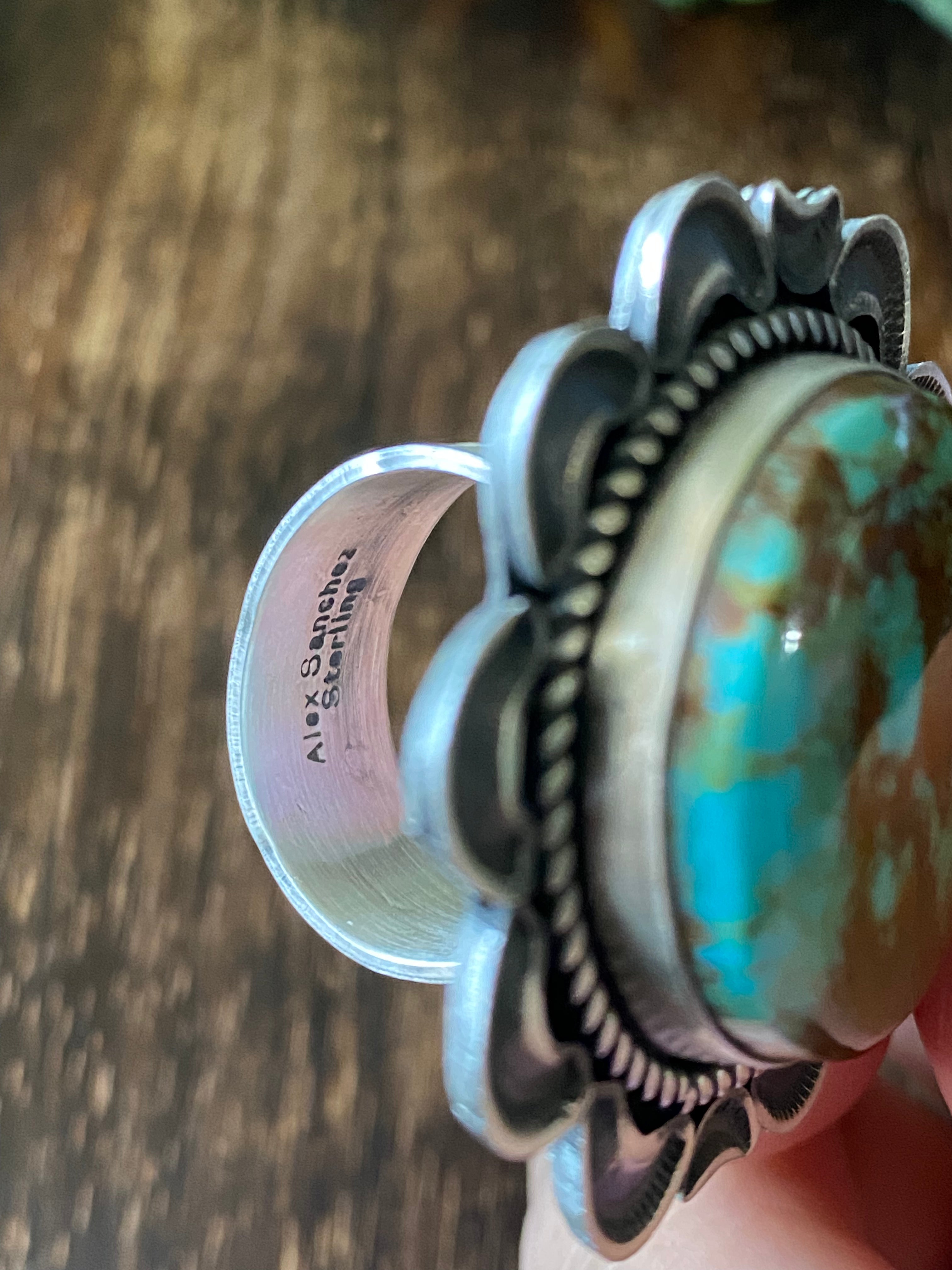 Alex Sanchez Royston Turquoise & Sterling Silver Adjustable Ring Size 7. It measures 1 3/4 inches long and 1 5/8 inches wide. Signed by the artist and stamped sterling silver.