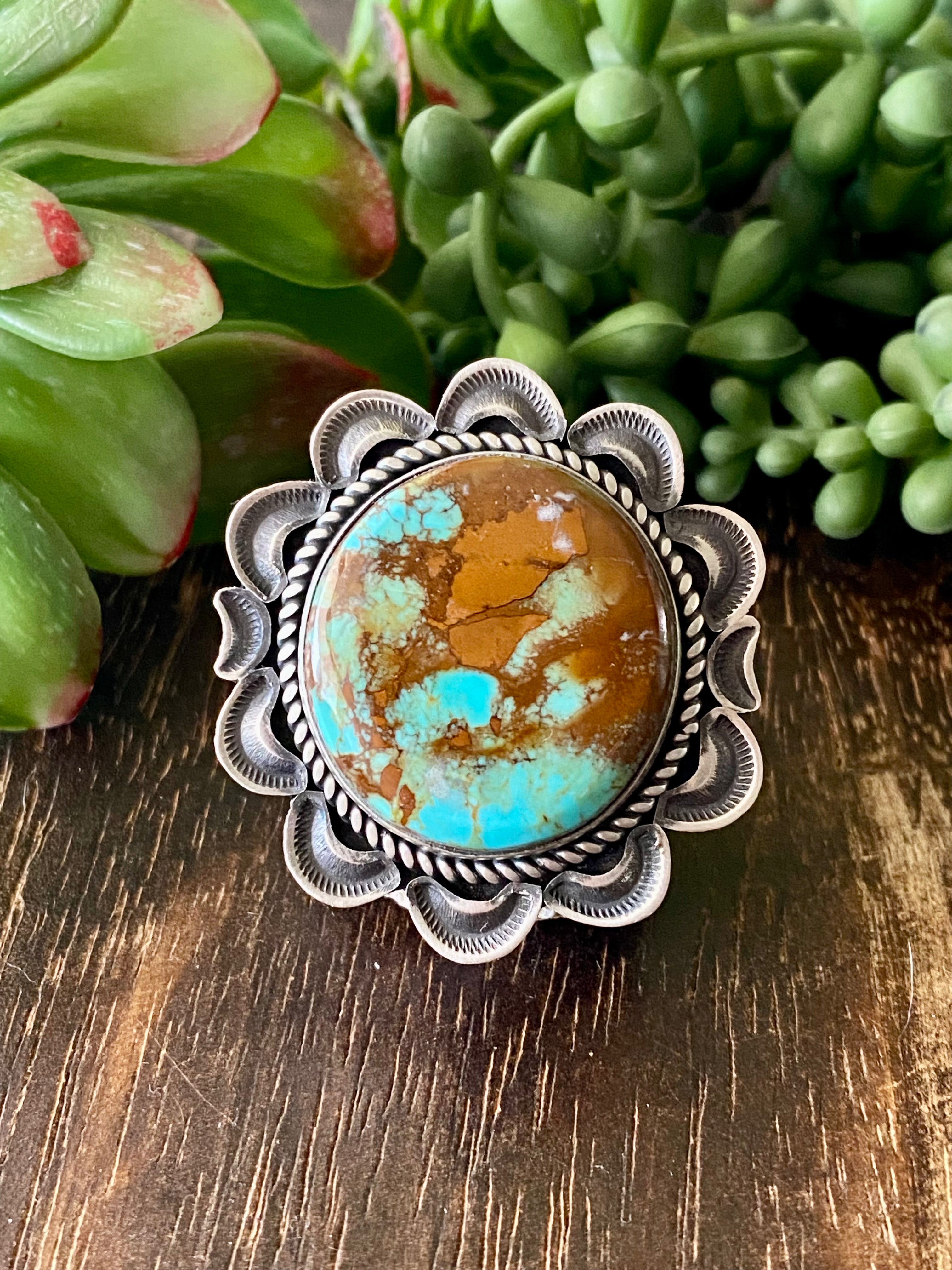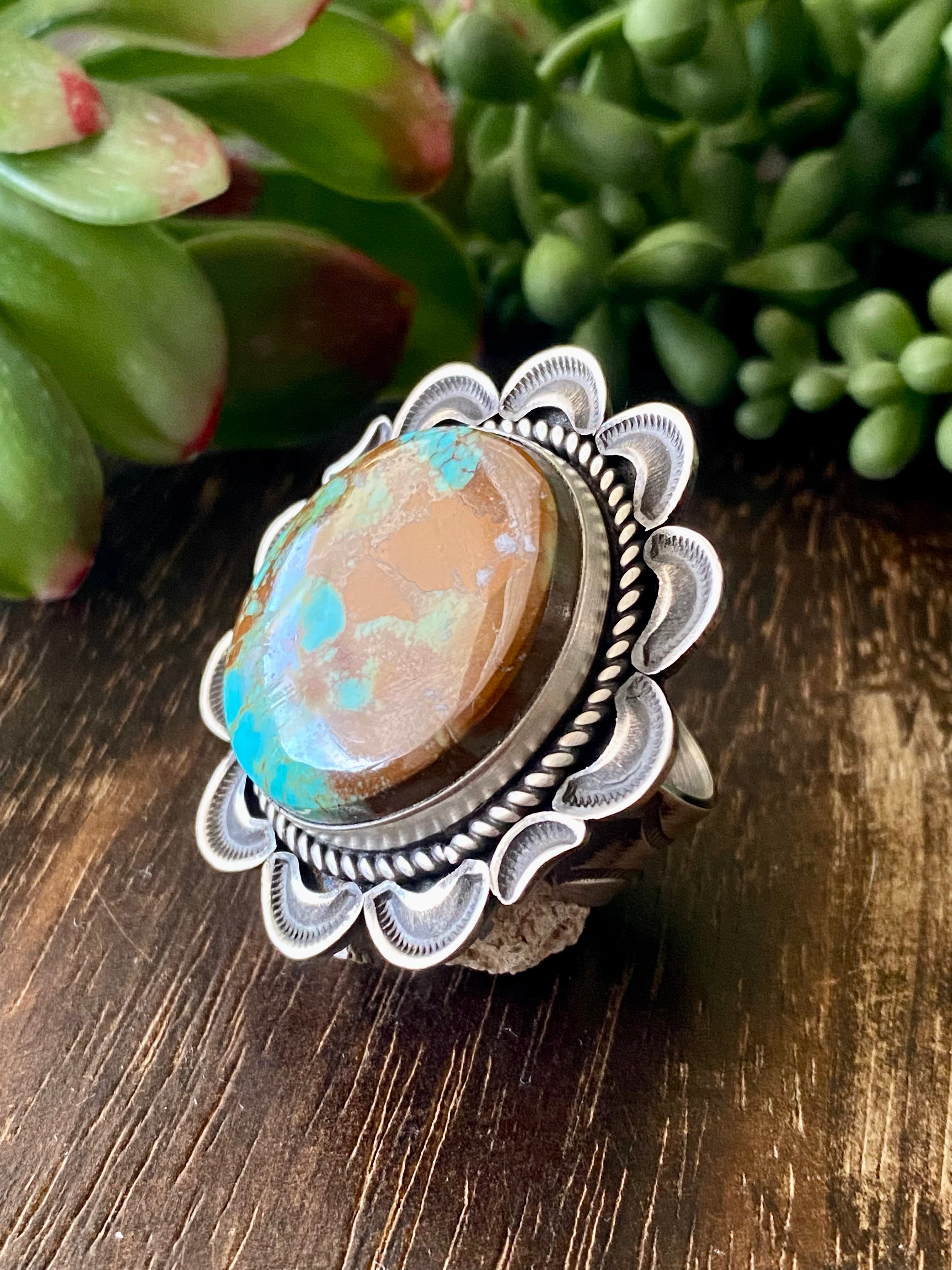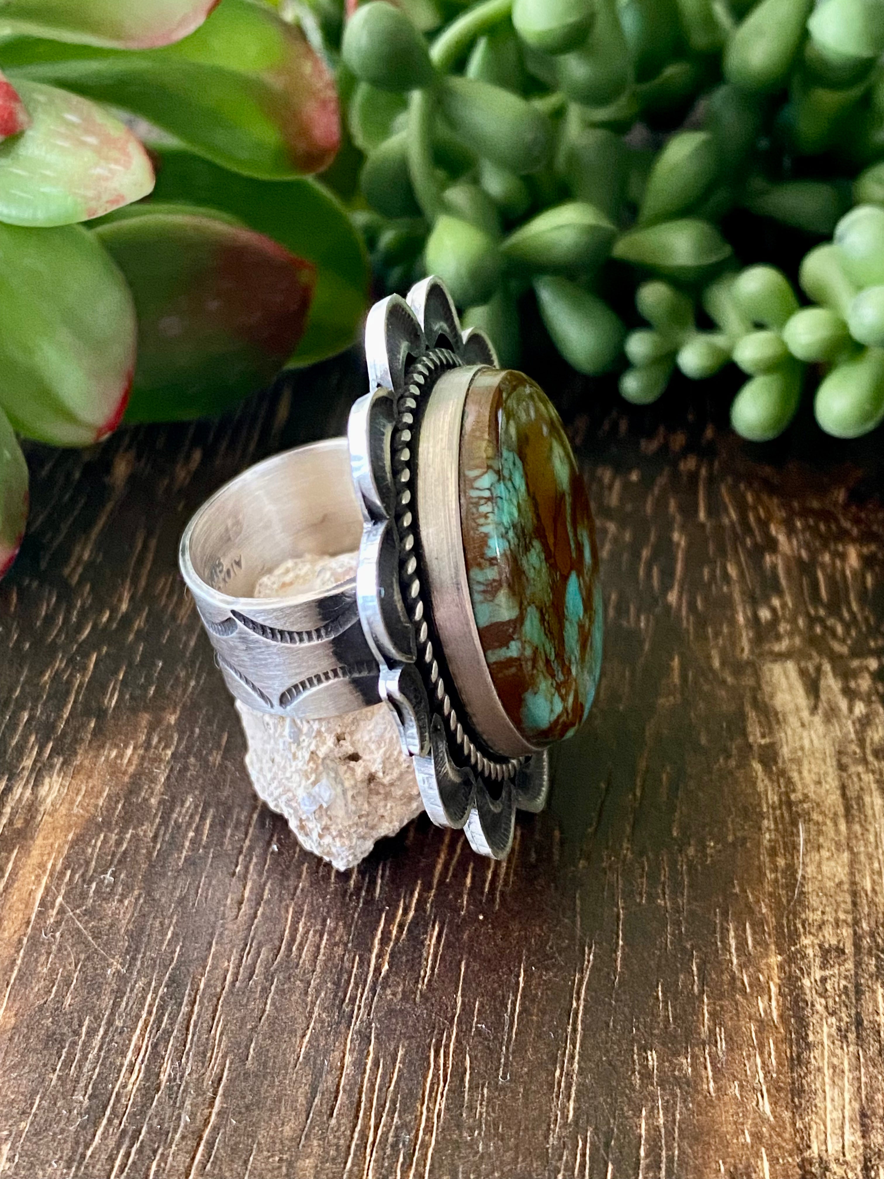 Alex Sanchez Royston Turquoise & Sterling Silver Adjustable Ring Size 7. It measures 1 3/4 inches long and 1 5/8 inches wide. Signed by the artist and stamped sterling silver.