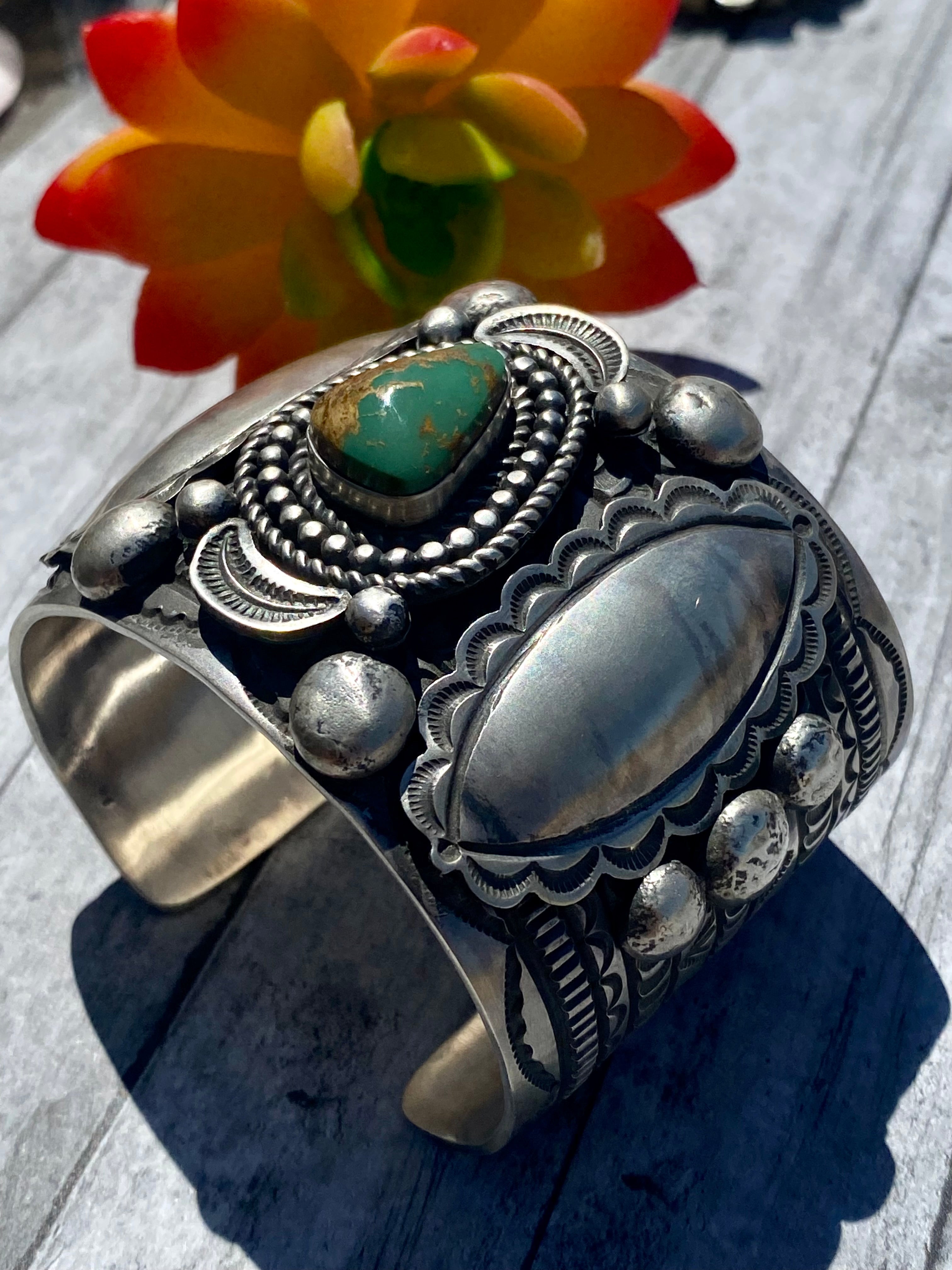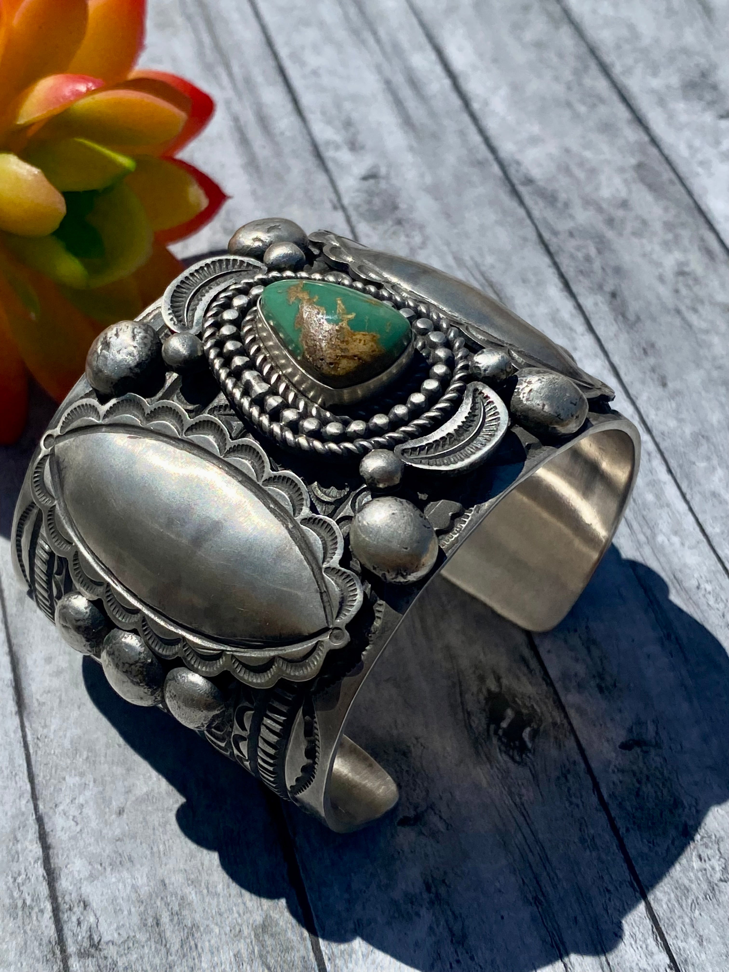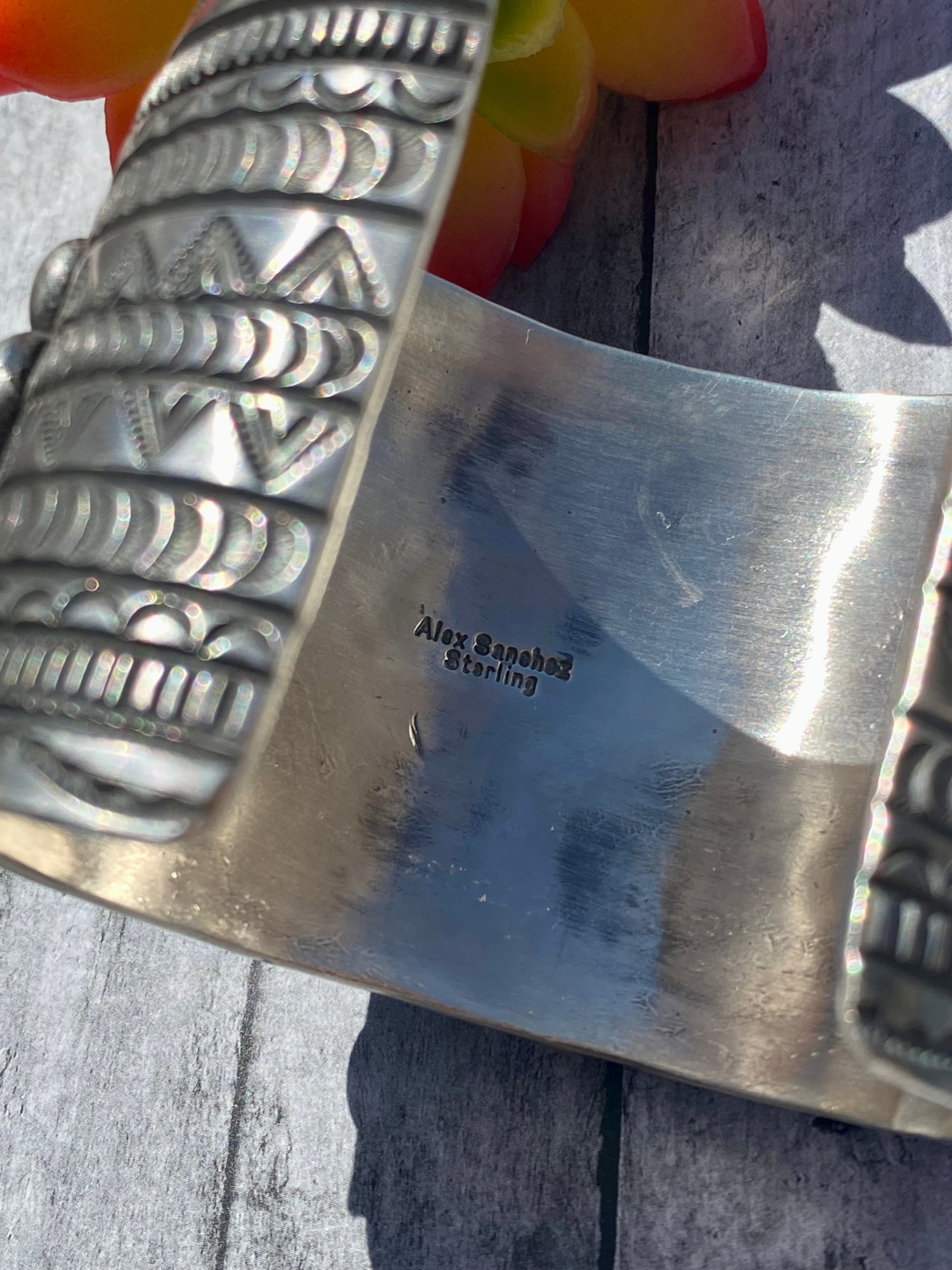 Alex Sanchez Royston Turquoise & Sterling Silver Cuff Bracelet. It measures 2 inches wide with an inside circumference of 5 3/4 inches and a gap of 1 1/8 inches. It weighs 163 grams. Signed by the artist and stamped sterling silver.
