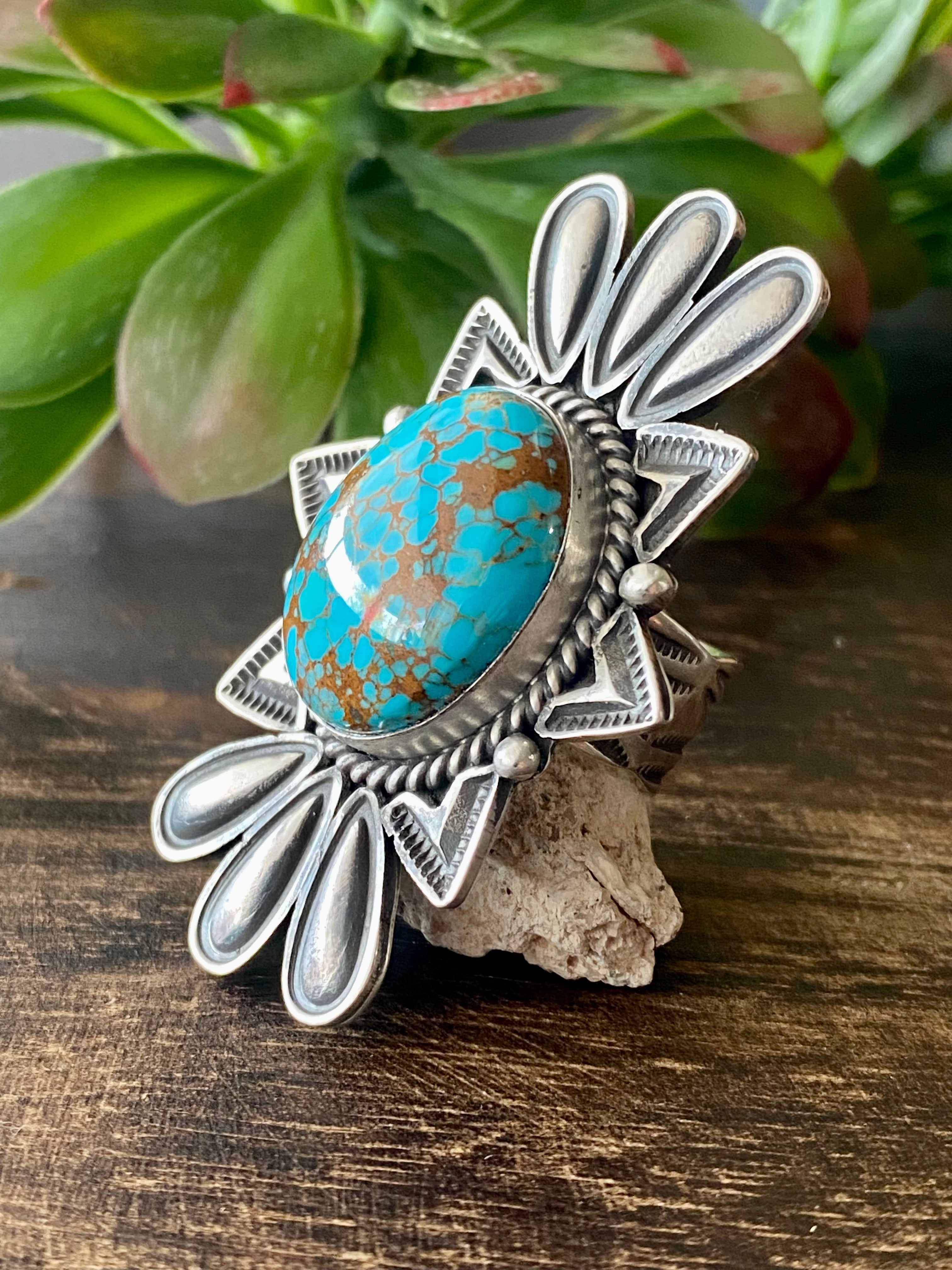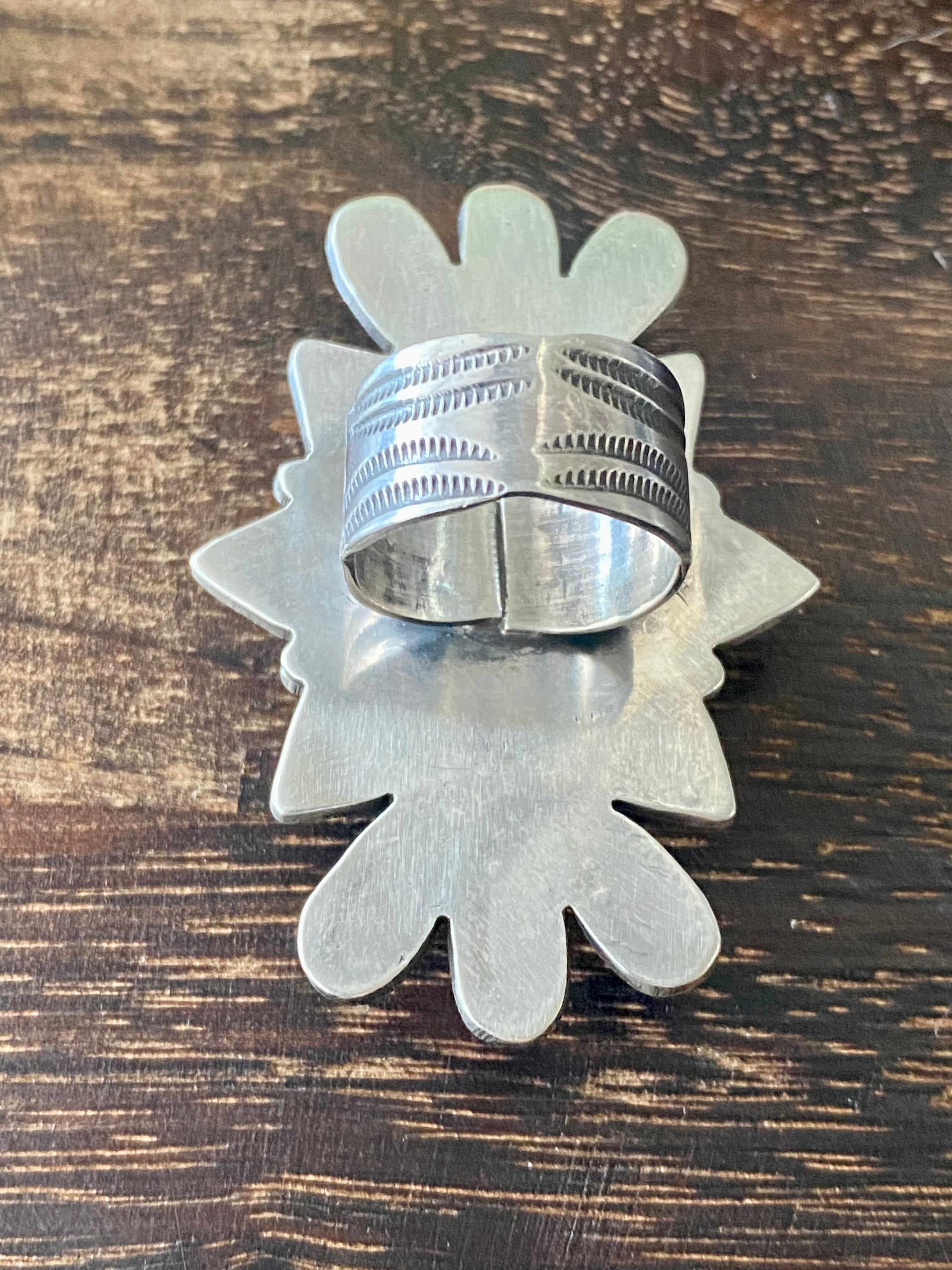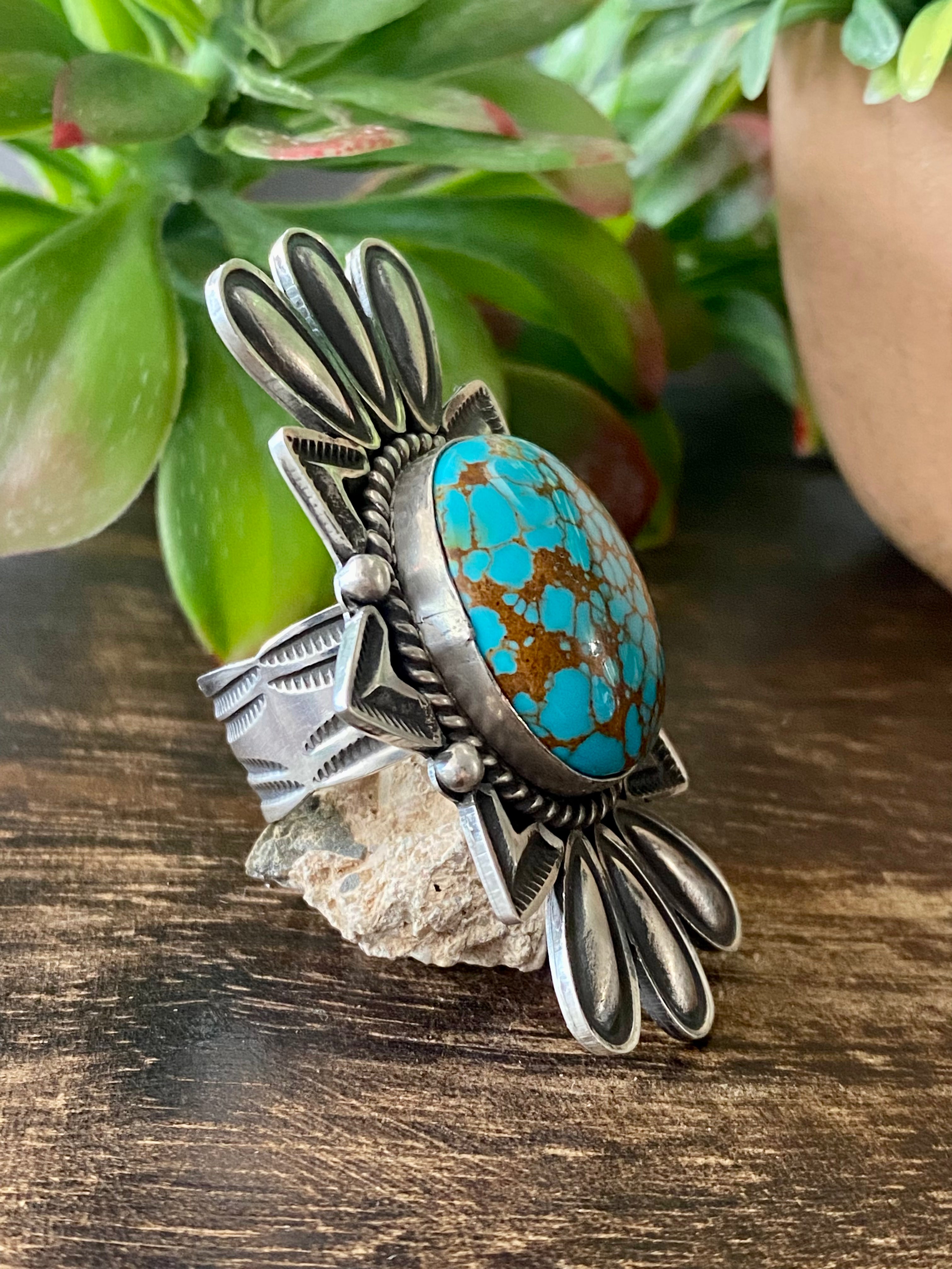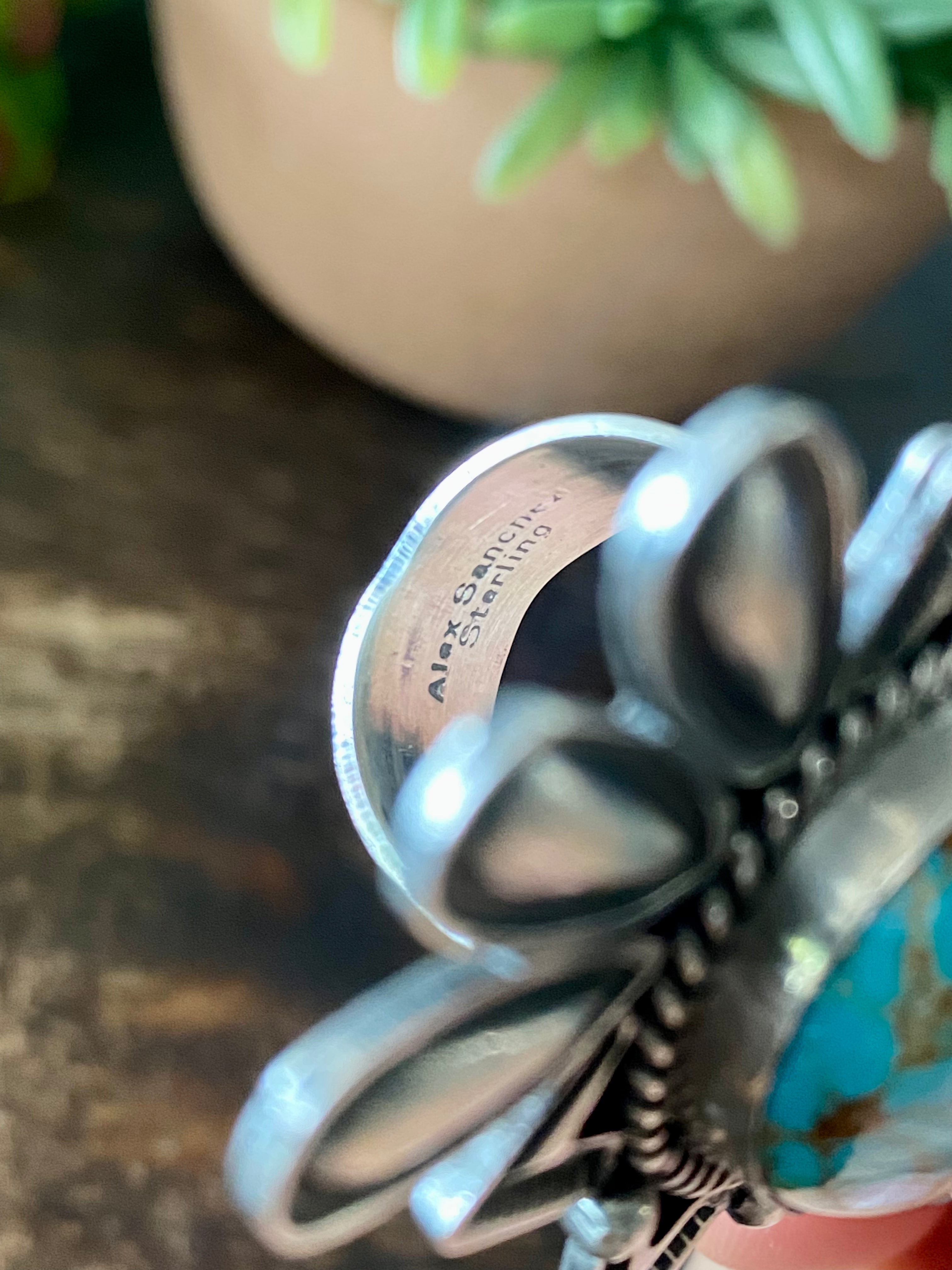 Alex Sanchez Royston Turquoise & Sterling Silver Ring Size 8.5. It measures 2 3/8 inches long and 1 5/8 inches wide. Signed by the artist and stamped sterling silver.