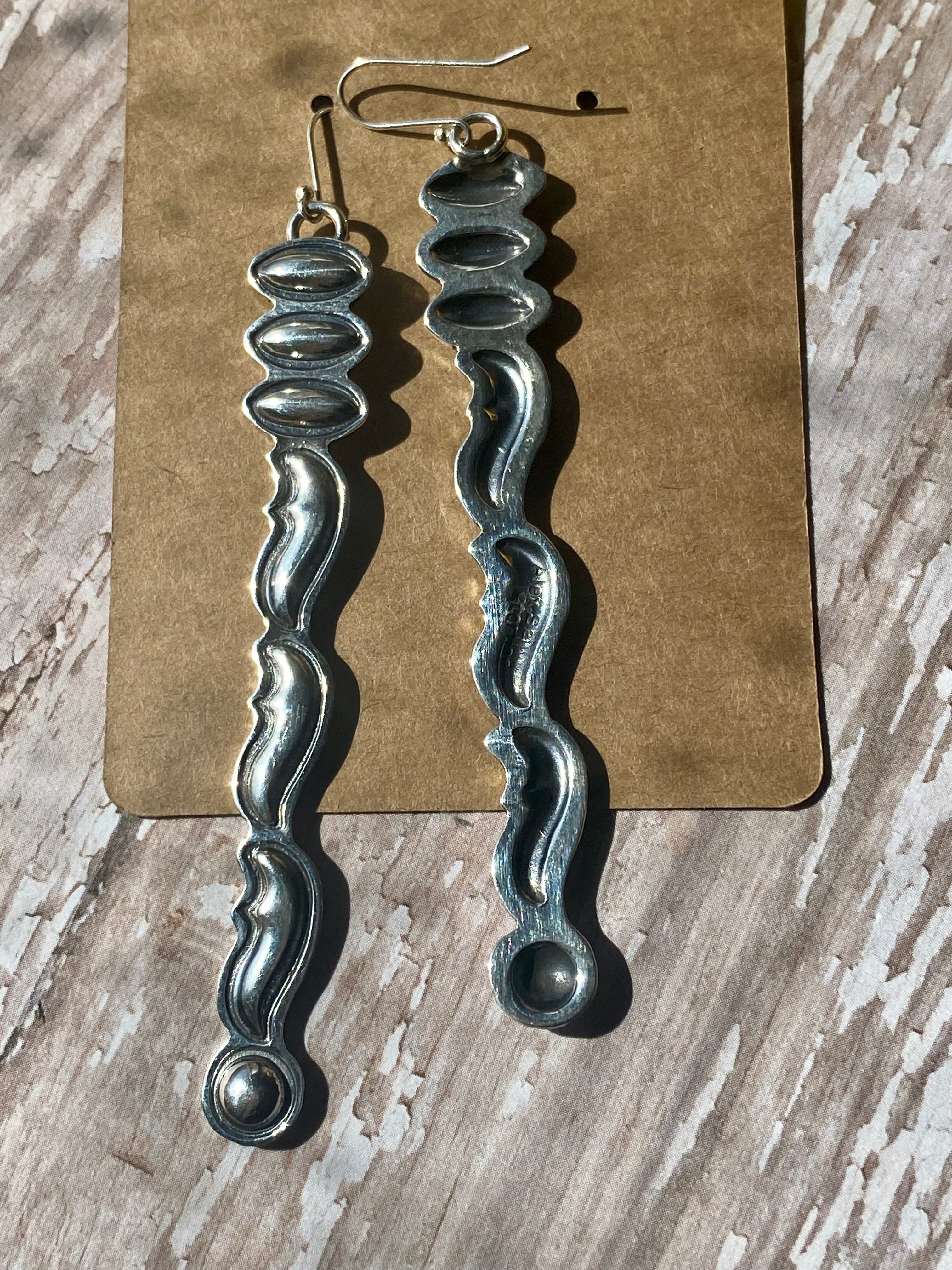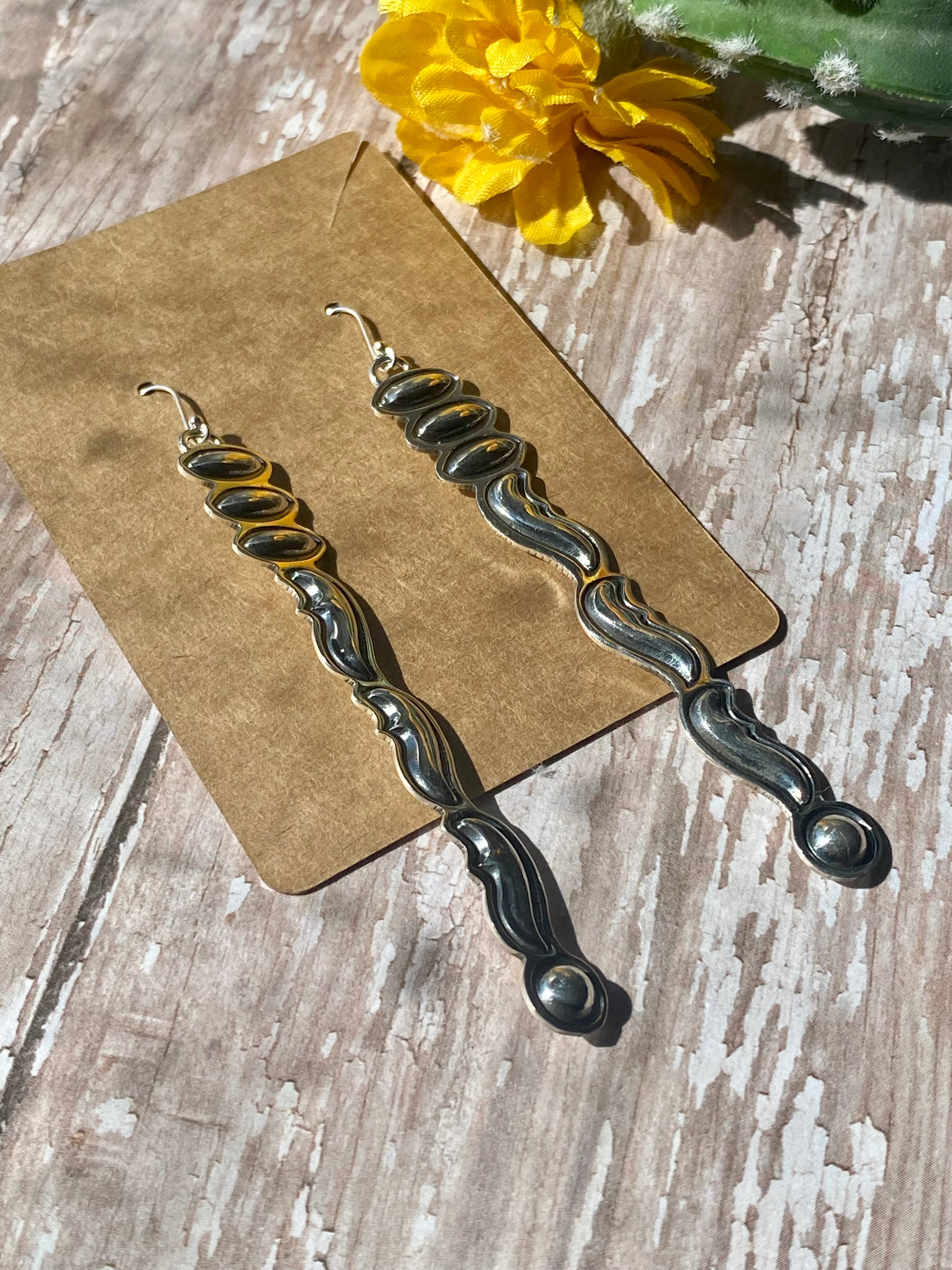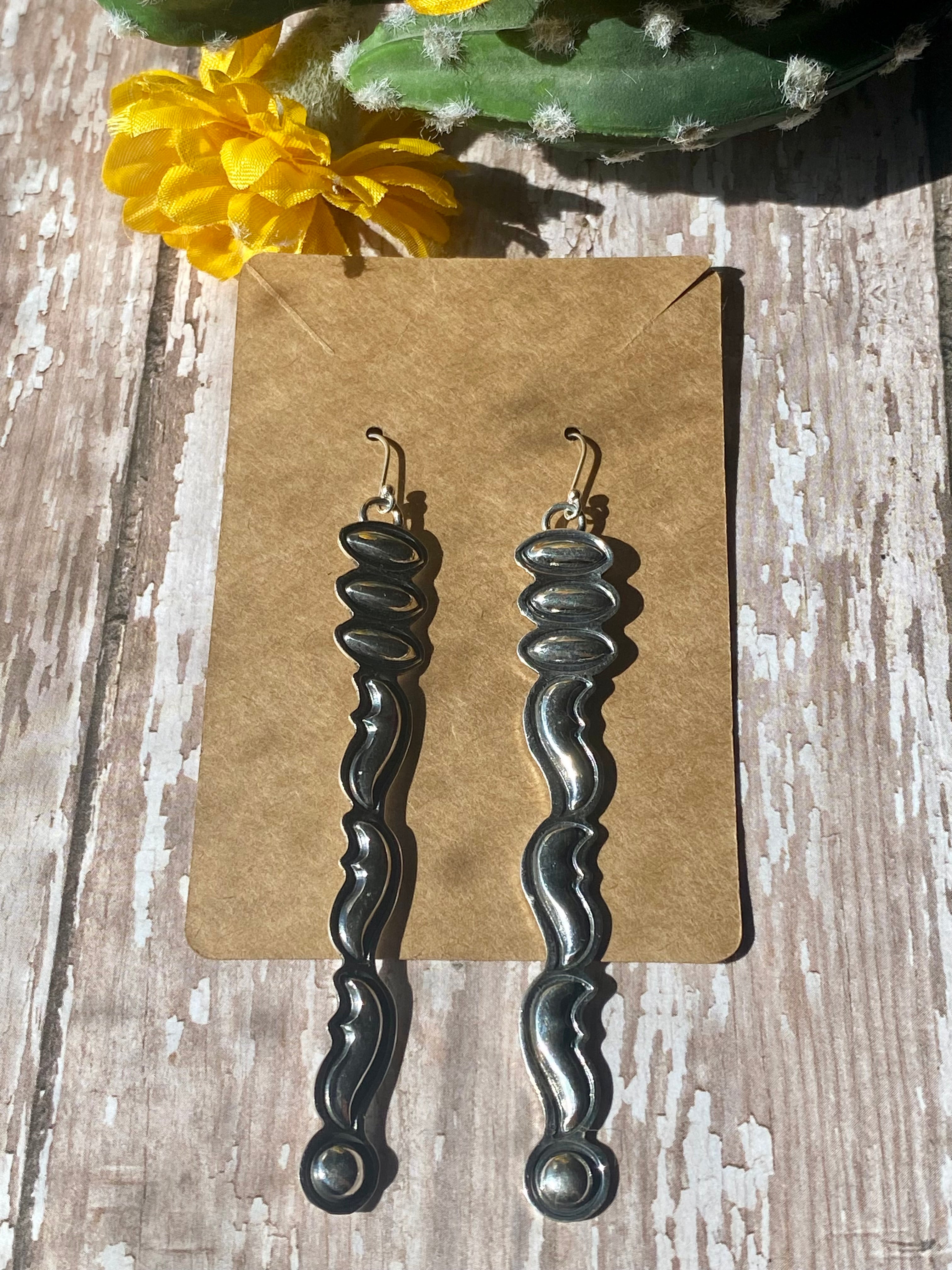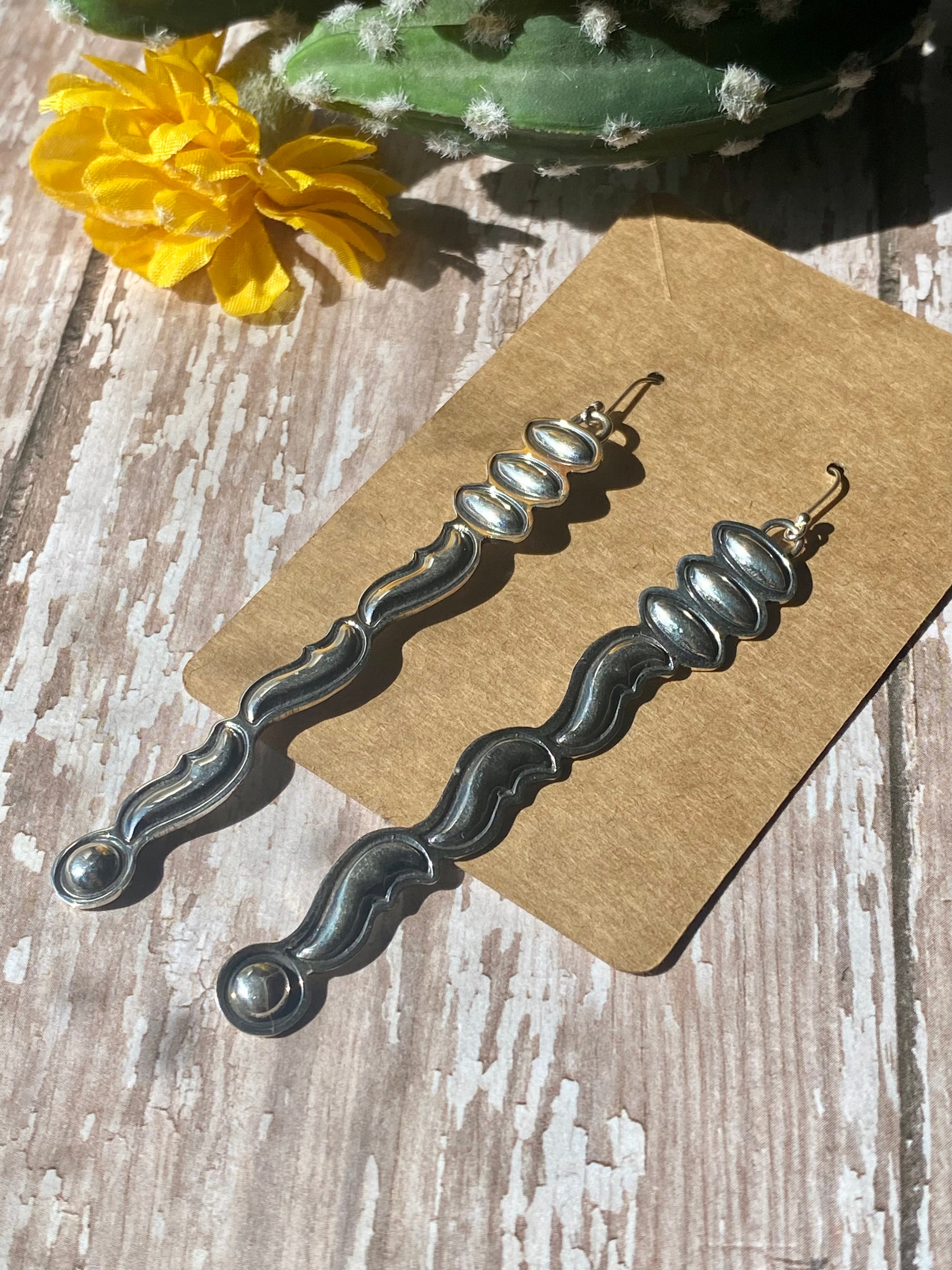 Alex Sanchez Sterling Silver Dangle Earrings. They measures 3 5/8 inches long and 1/2 of an inch wide. Signed by the artist and stamped sterling silver.