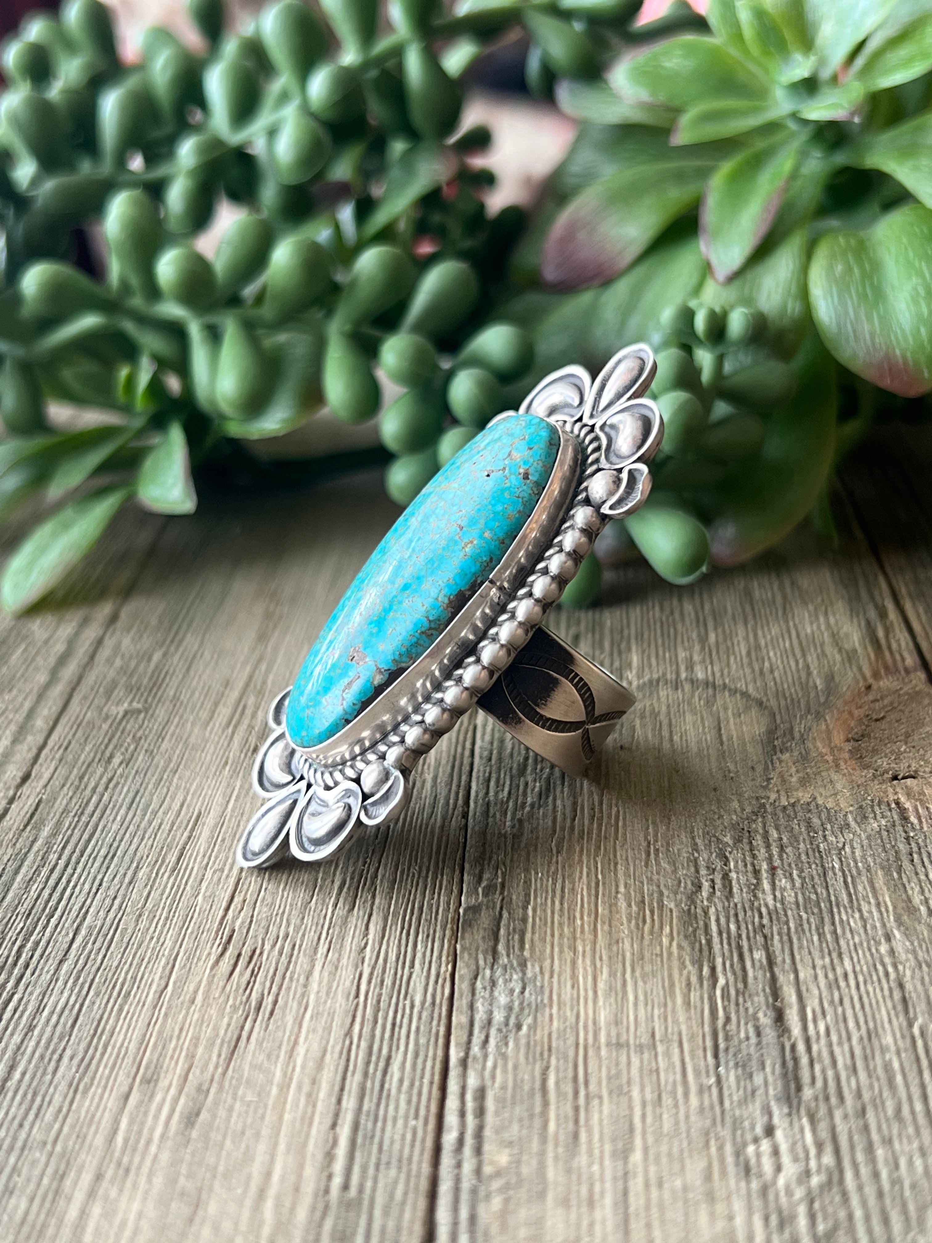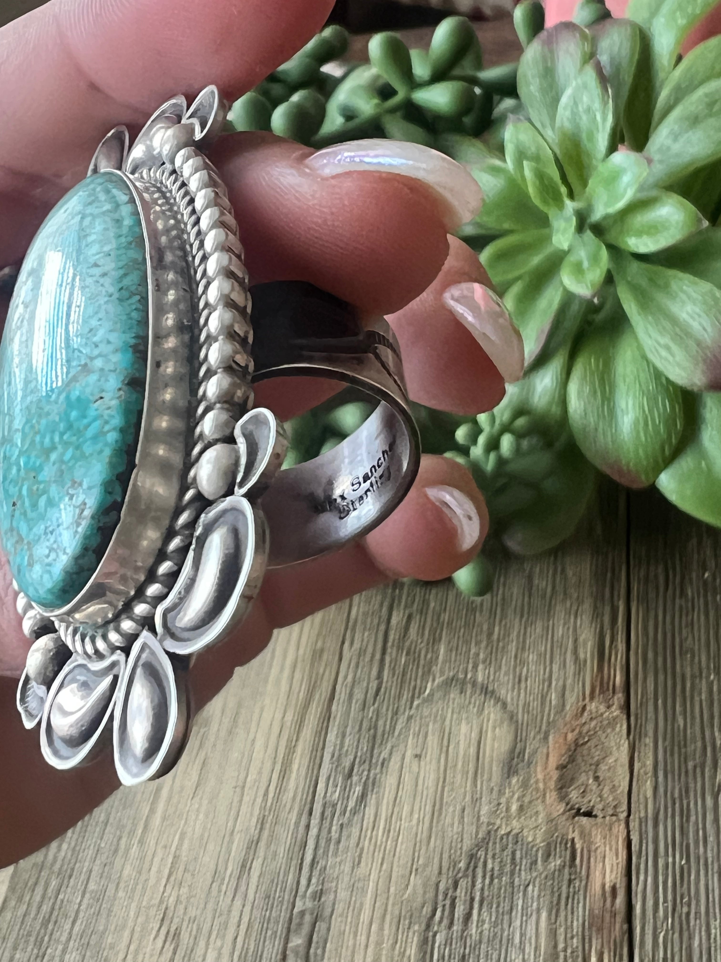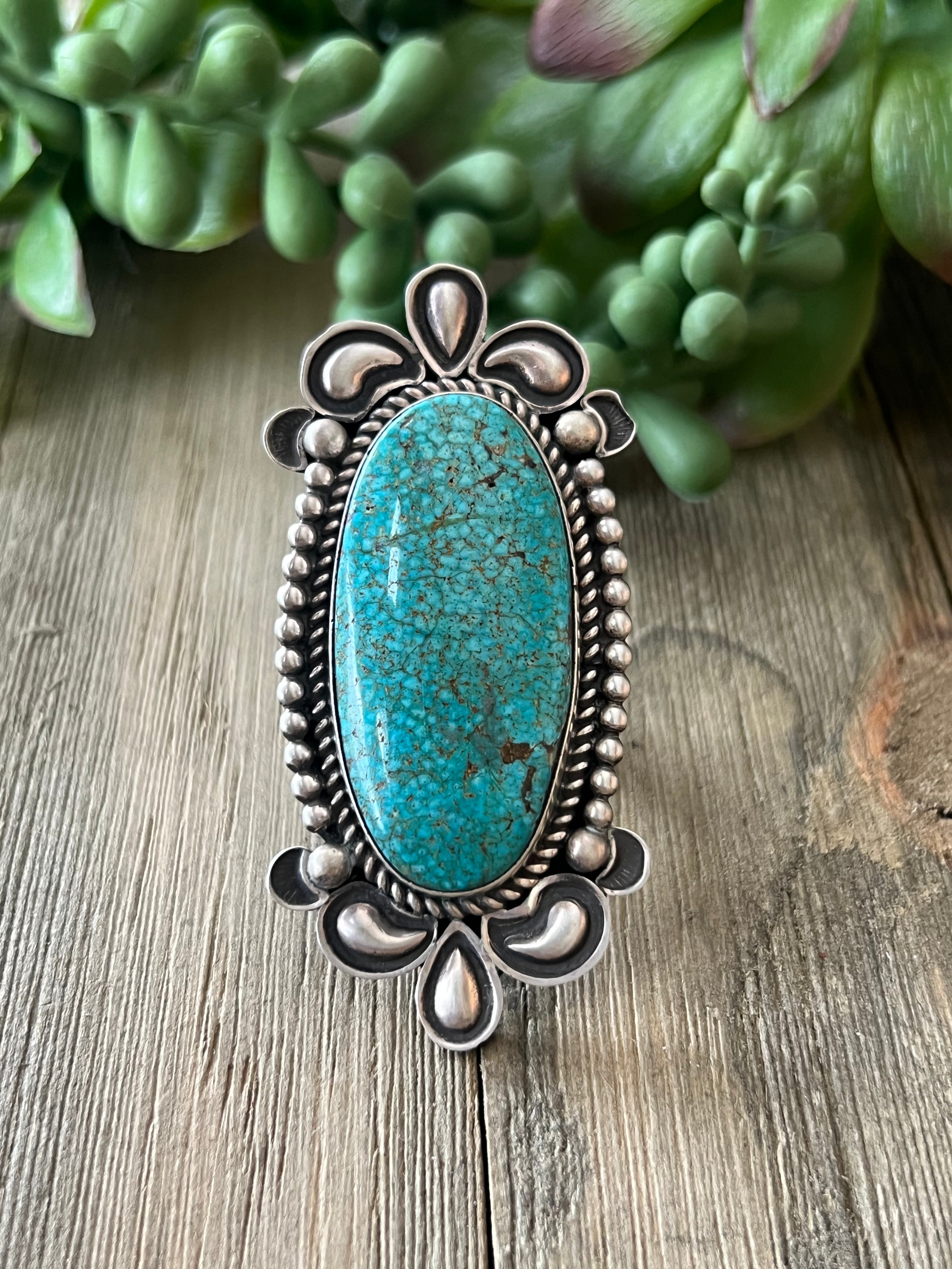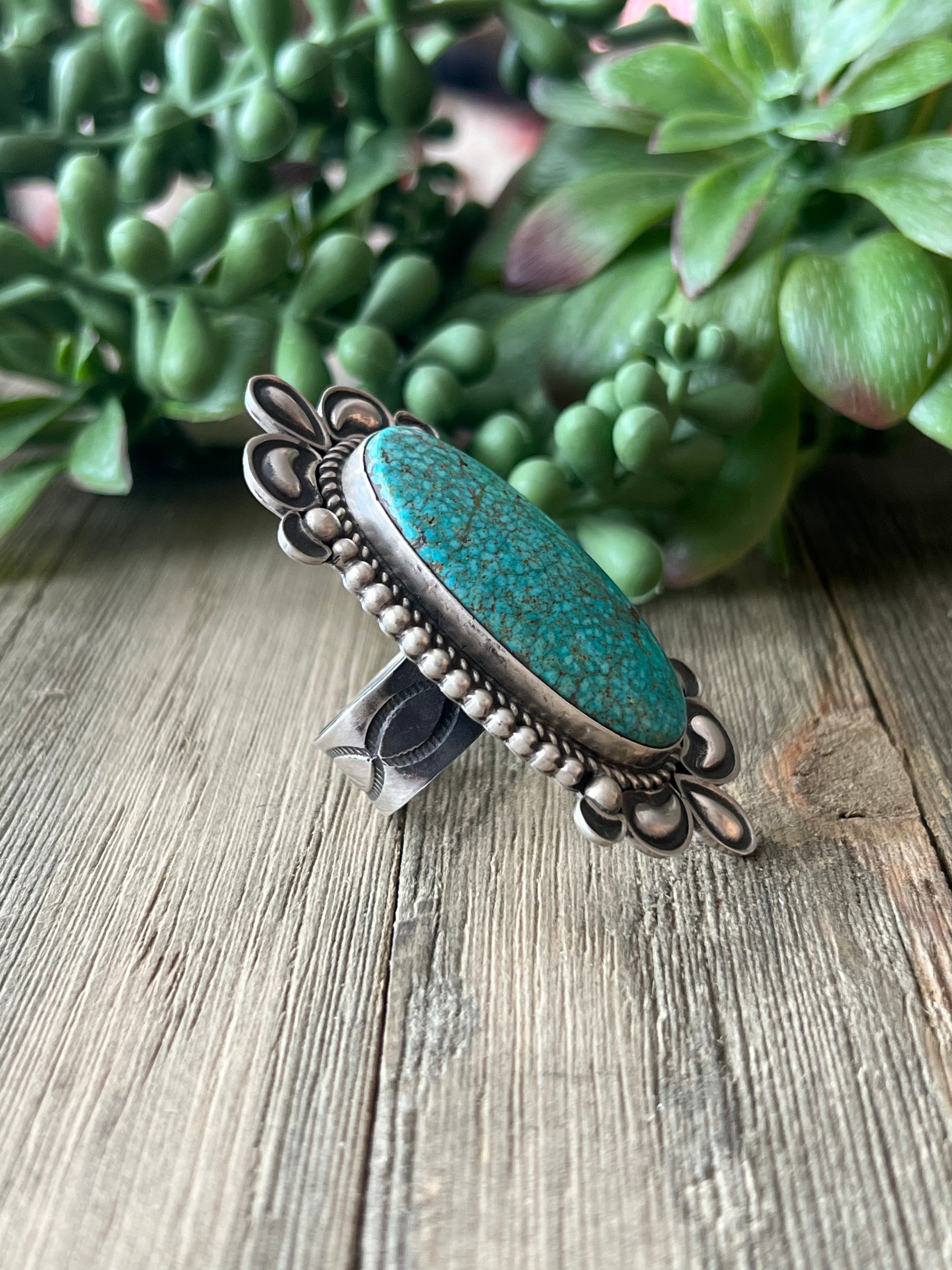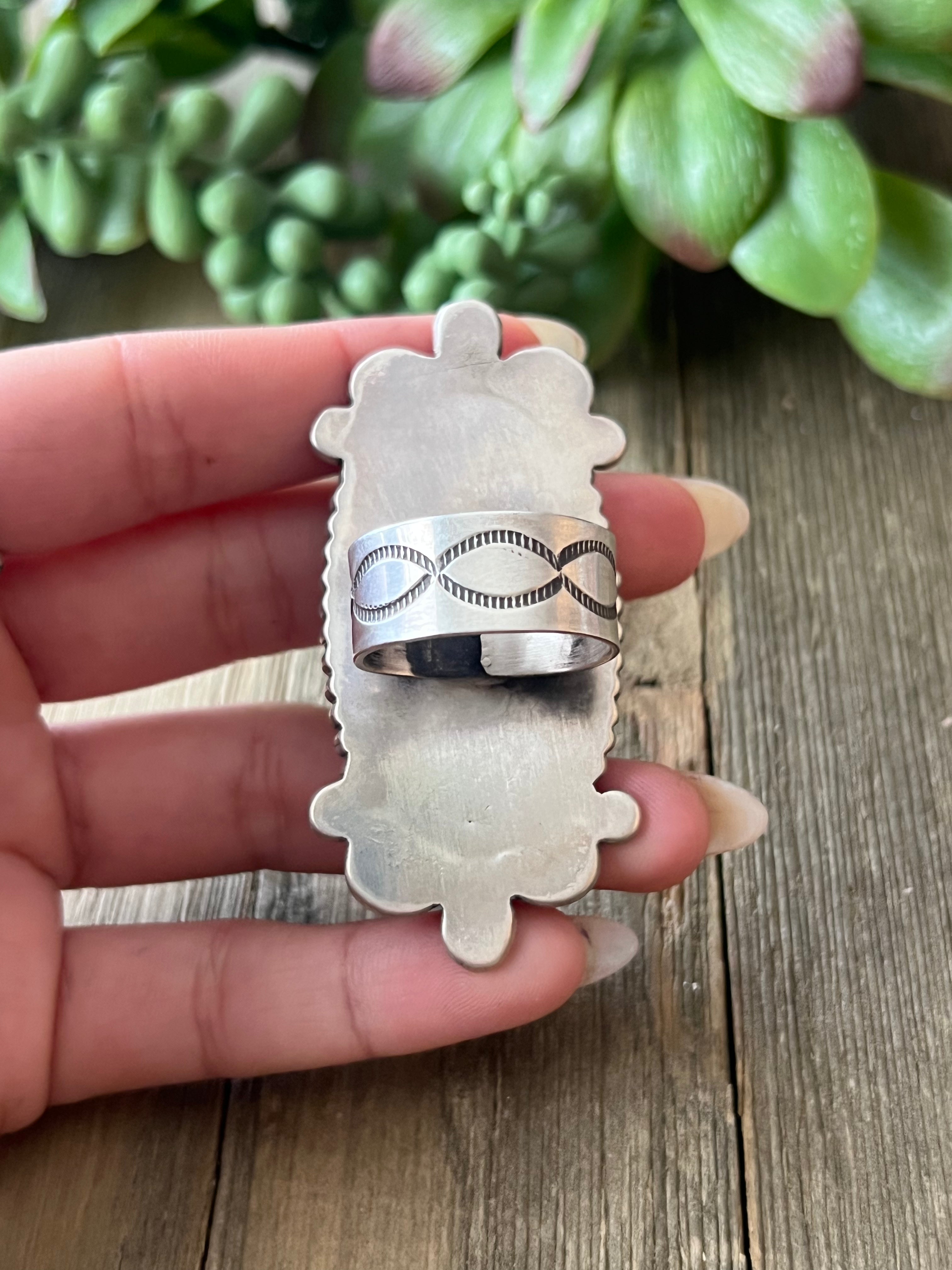 Alex Sanchez Turquoise Mountain & Sterling Silver Adjustable Ring. It measures 2 1/2 inches long and just under 1 1/4 inches wide. Signed by the artist and stamped sterling silver.