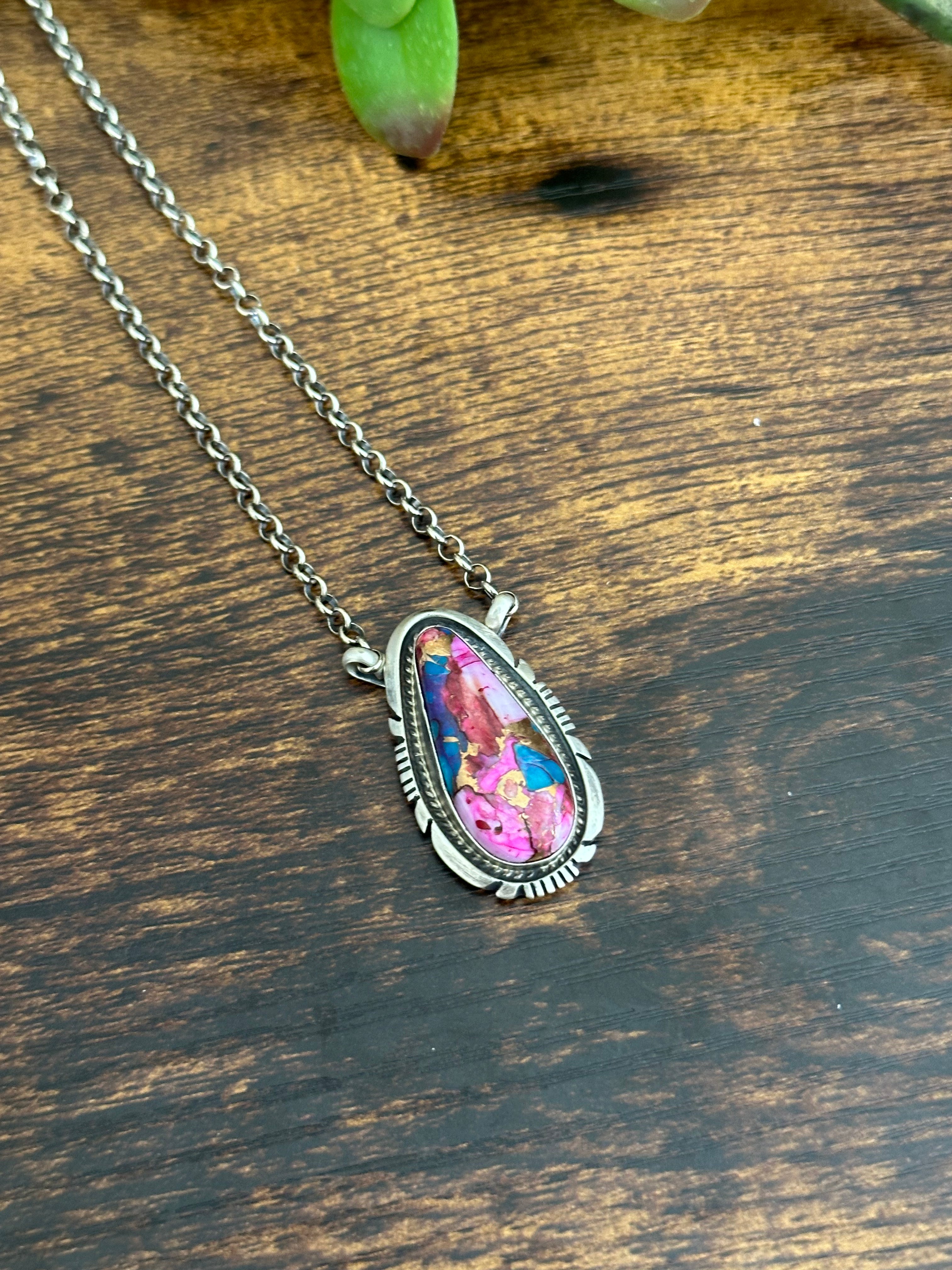 Beautiful Necklace. Alfred Martinez Pink Mohave Turquoise & Sterling Silver Necklace. It measures 19 inches long with hang while the chain measures 16 inches long. Signed by the artist and stamped sterling silver.