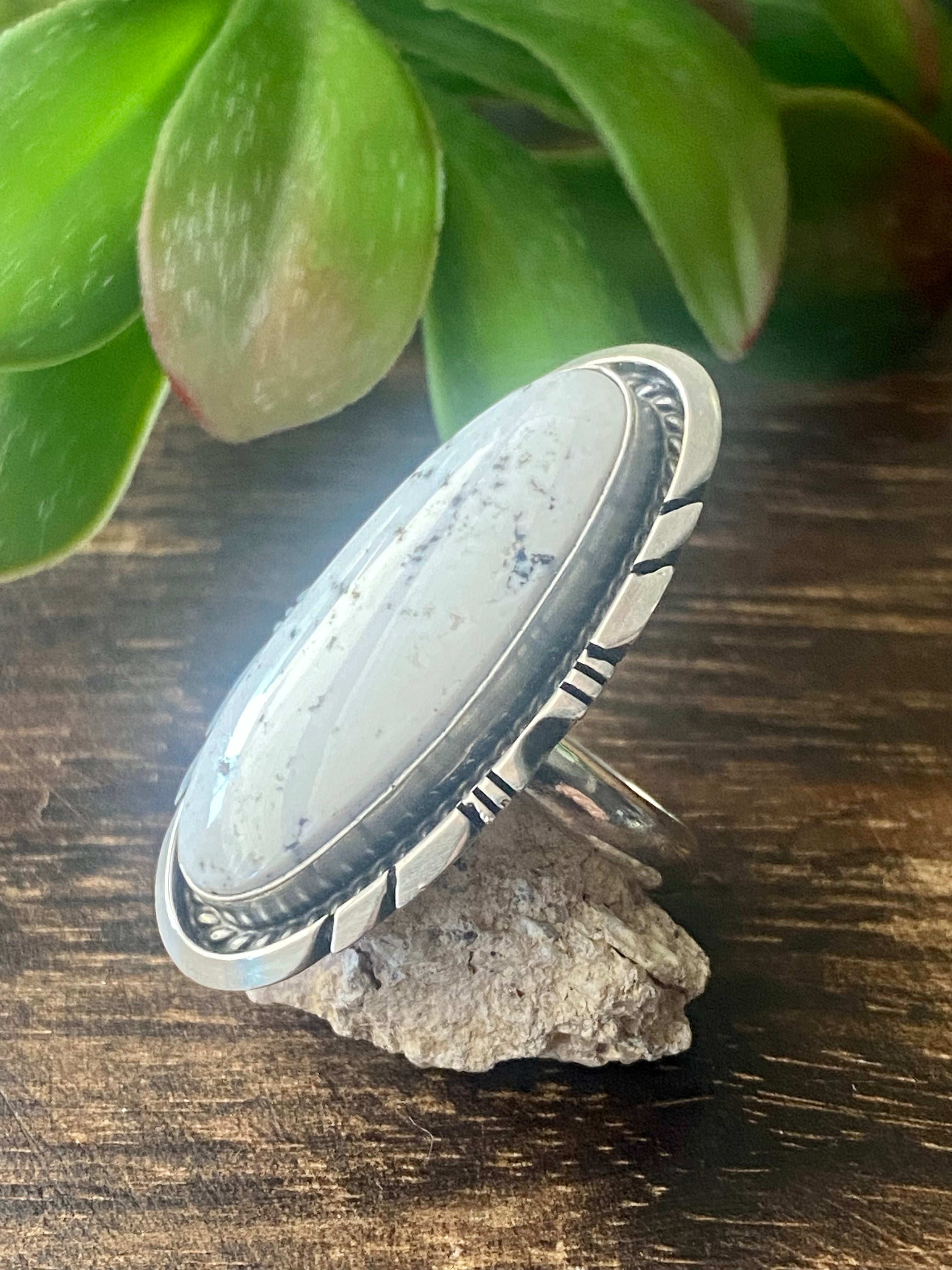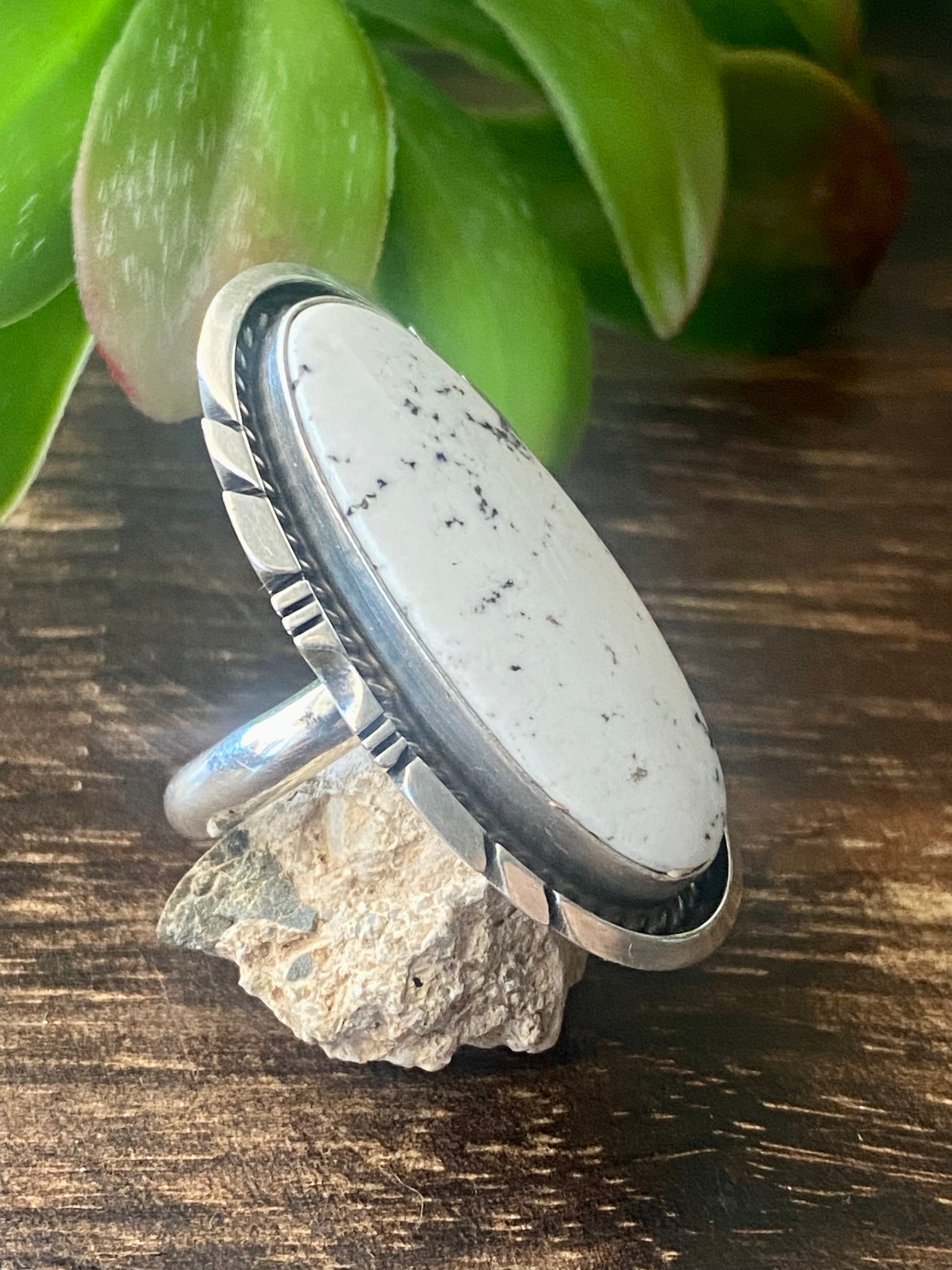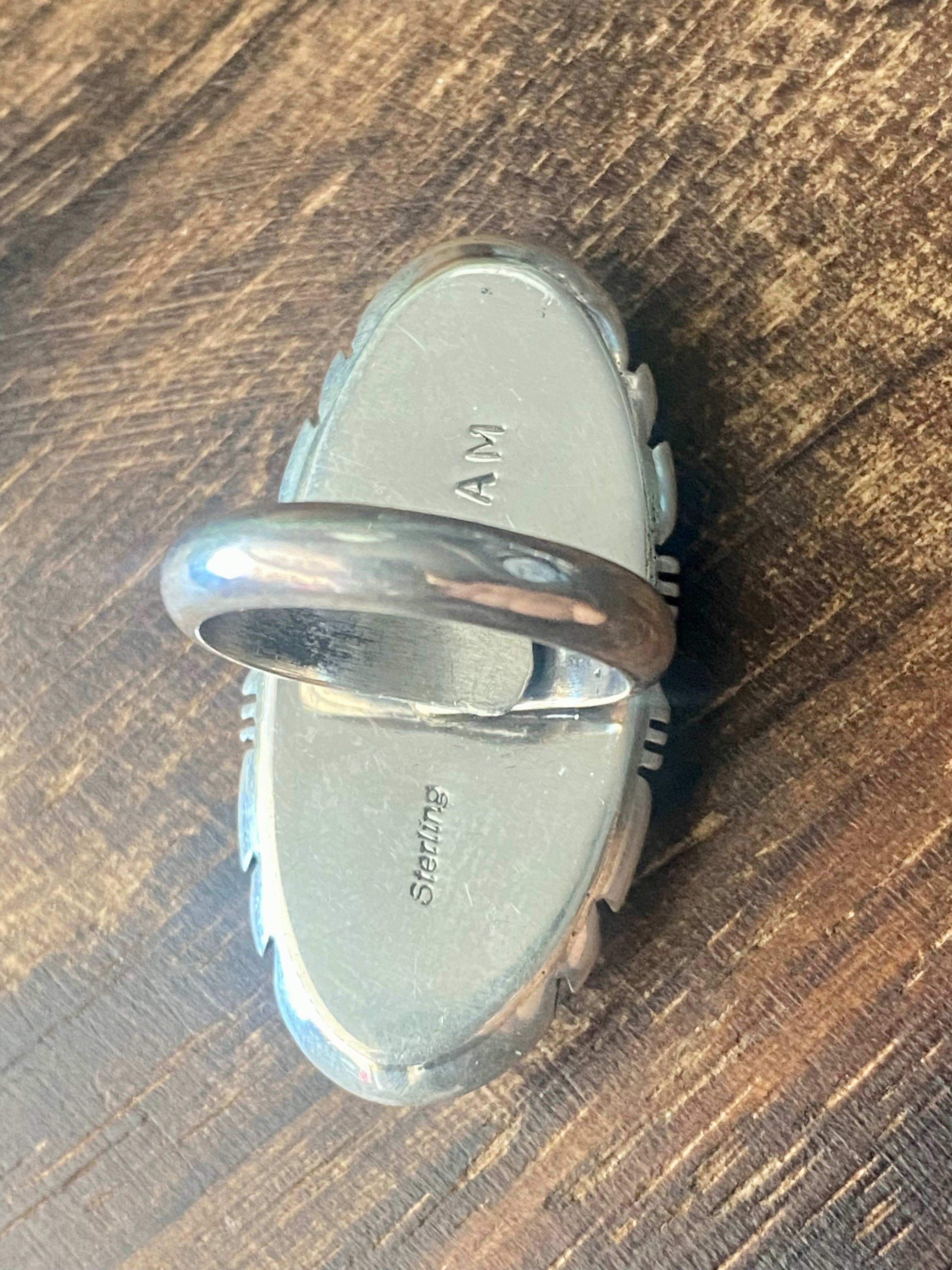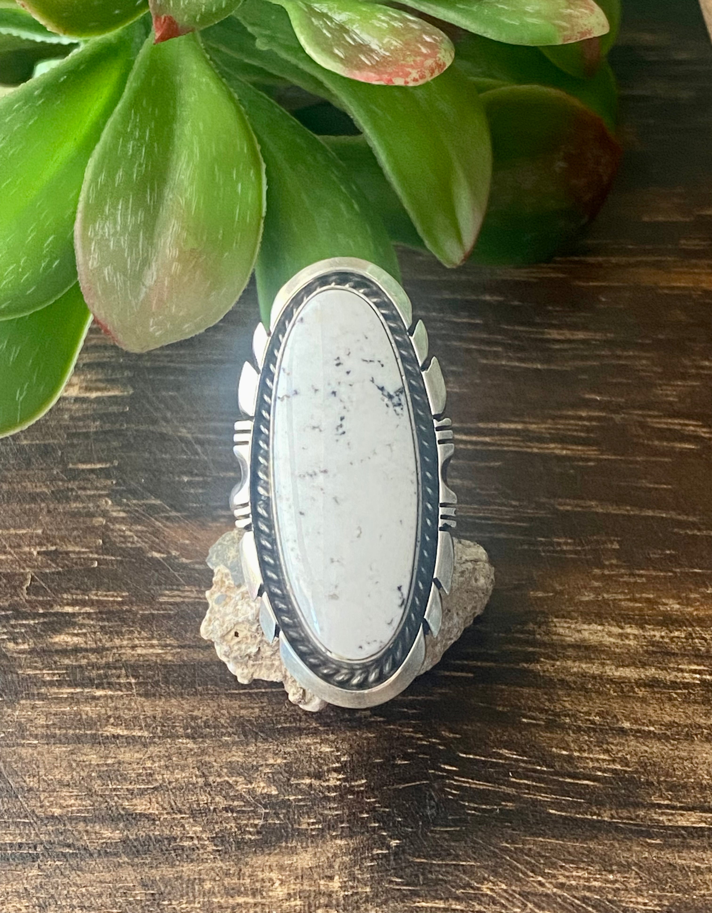 Alfred Martinez White Buffalo & Sterling Silver Adjustable Ring Size 6.25. It measures 1 3/4 inches long and just over 3/4 of an inch wide. Signed by the artist and stamped sterling silver.