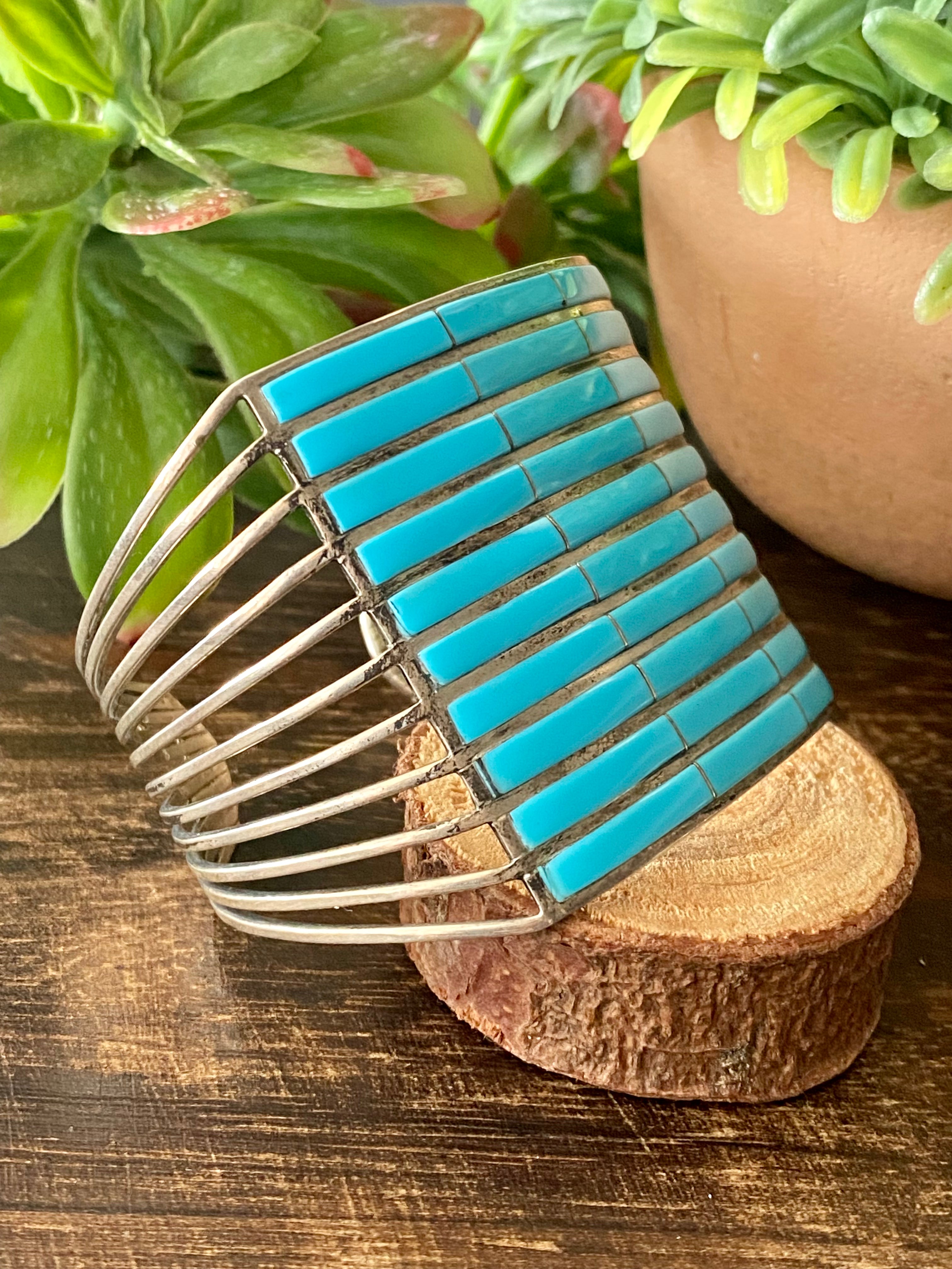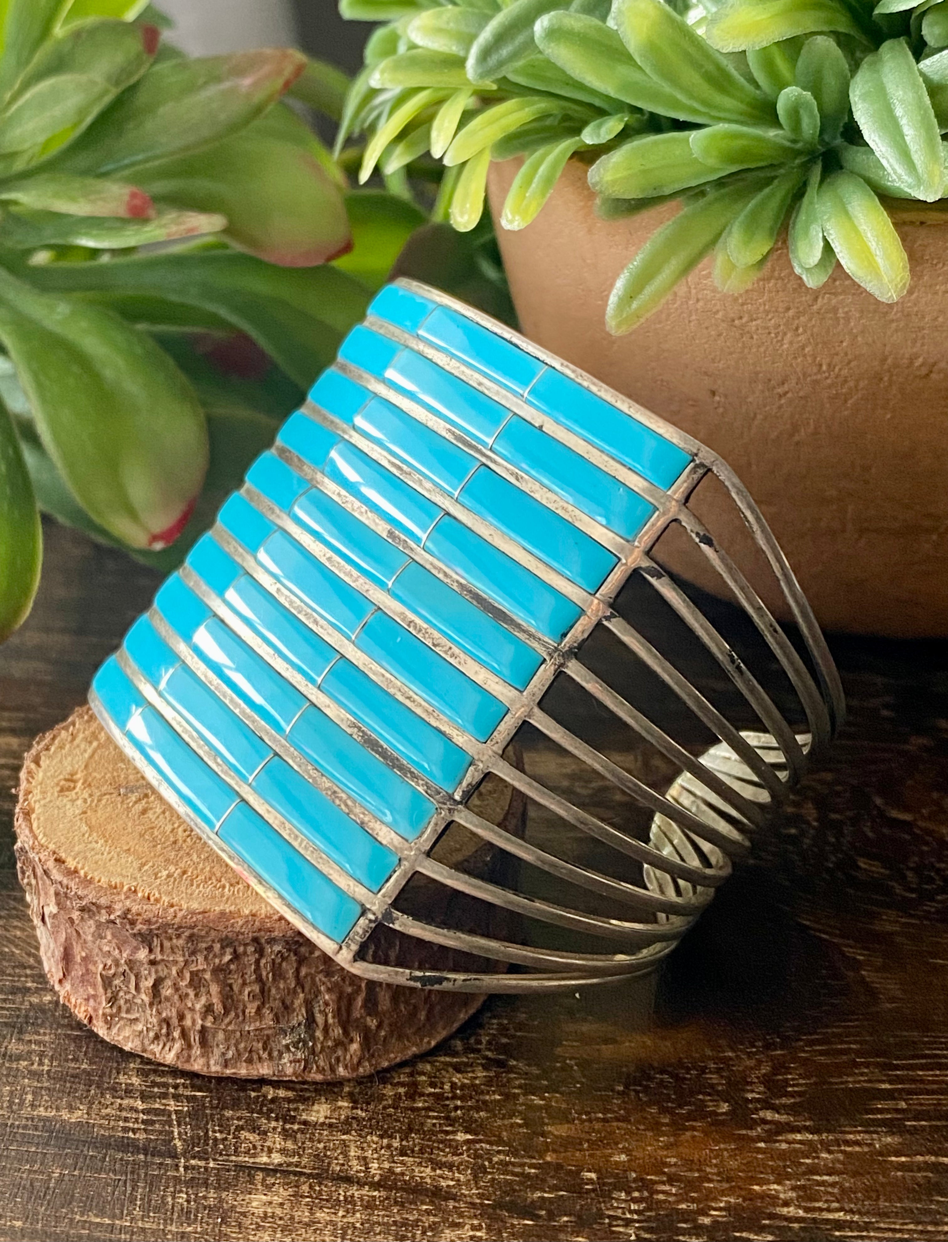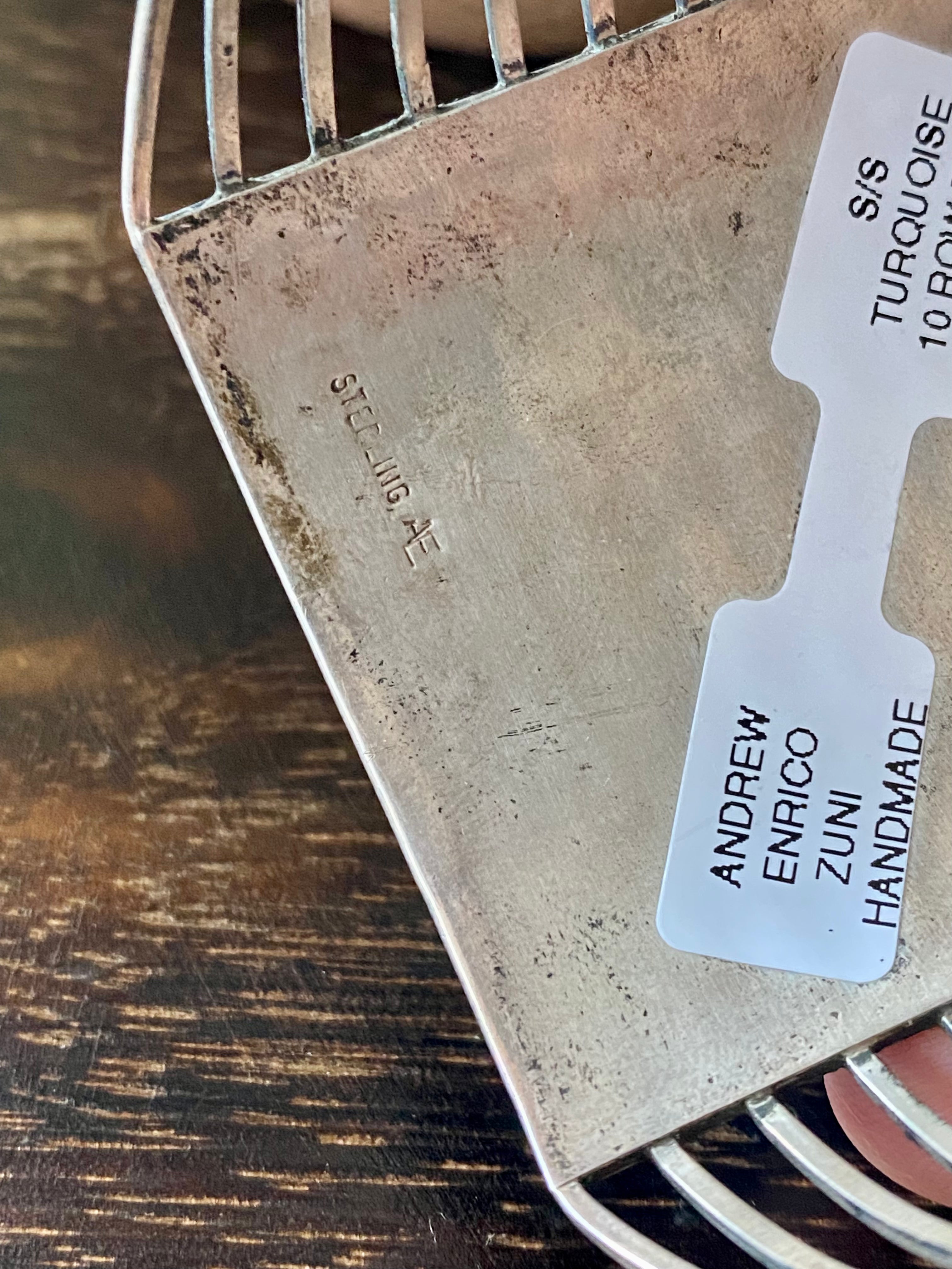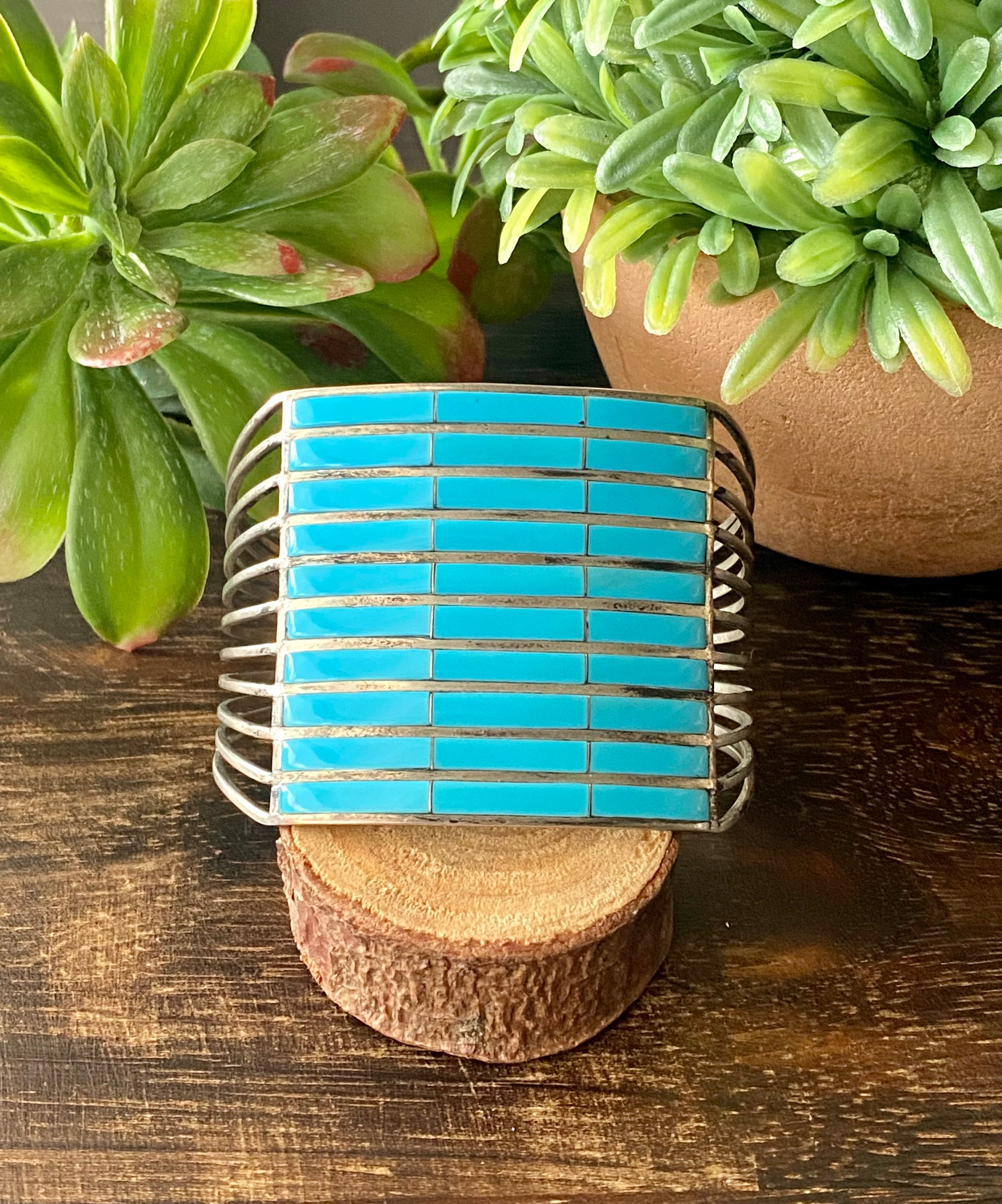 Andrew Enrico Turquoise & Sterling Silver Inlay Cuff Bracelet. It measures just under 2 inches wide with an inside circumference of 5 3/4 inches and a gap of 1 inch. Signed by the artist and stamped sterling silver.