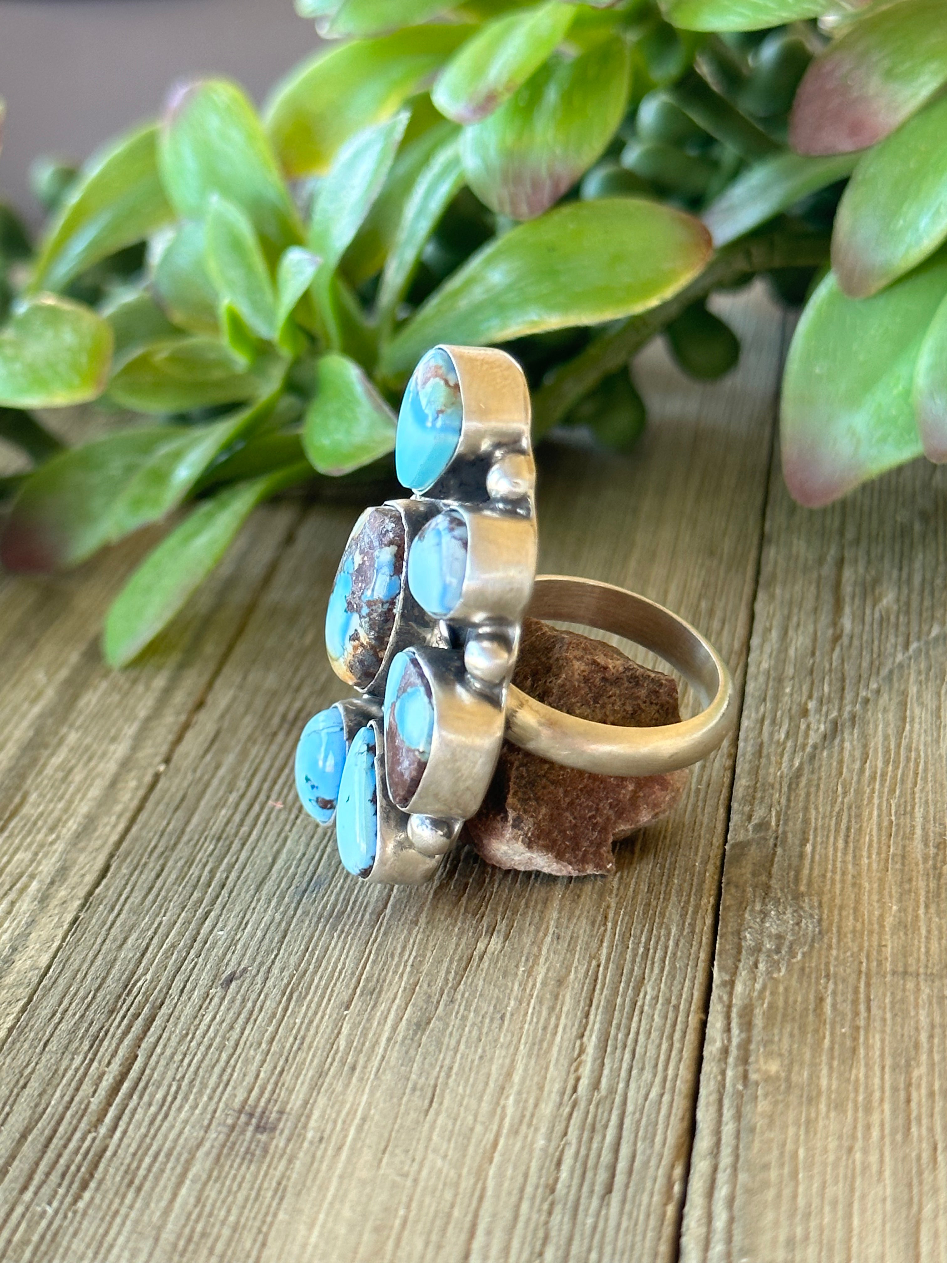 Beautiful ring, Augustine Largo Golden Hills Turquoise & Sterling Silver Half Cluster Adjustable Ring. It measures 1 7/8 inches long and 1 1/8 inches wide. Signed by the artist and stamped sterling silver.