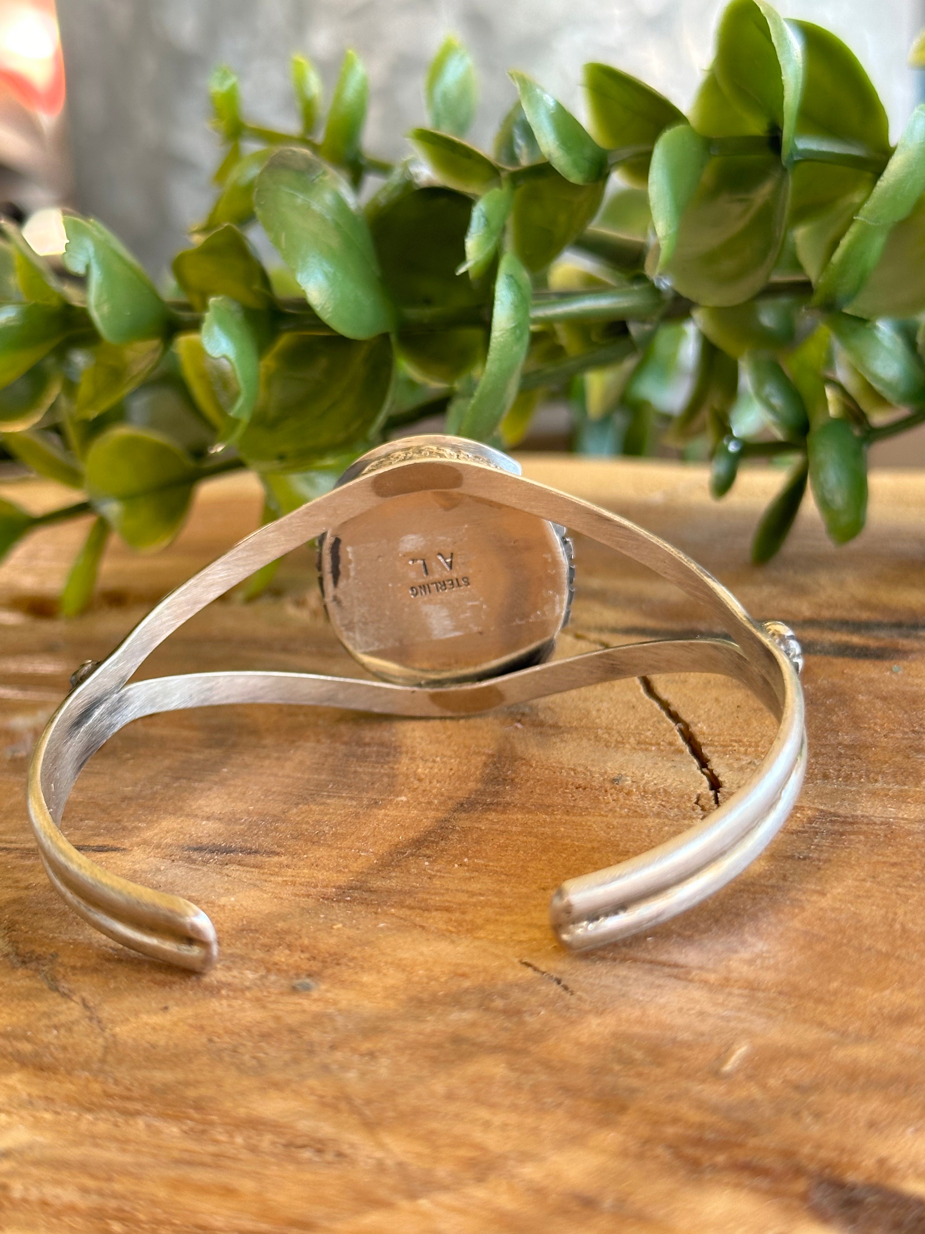 Augustine Largo Pink Mohave Turquoise & Sterling Silver Cuff Bracelet. It measures 1 1/8 inches wide with an inside circumference of 5 5/8 inches and a gap of 1 inch. Signed by artist and stamped sterling silver.