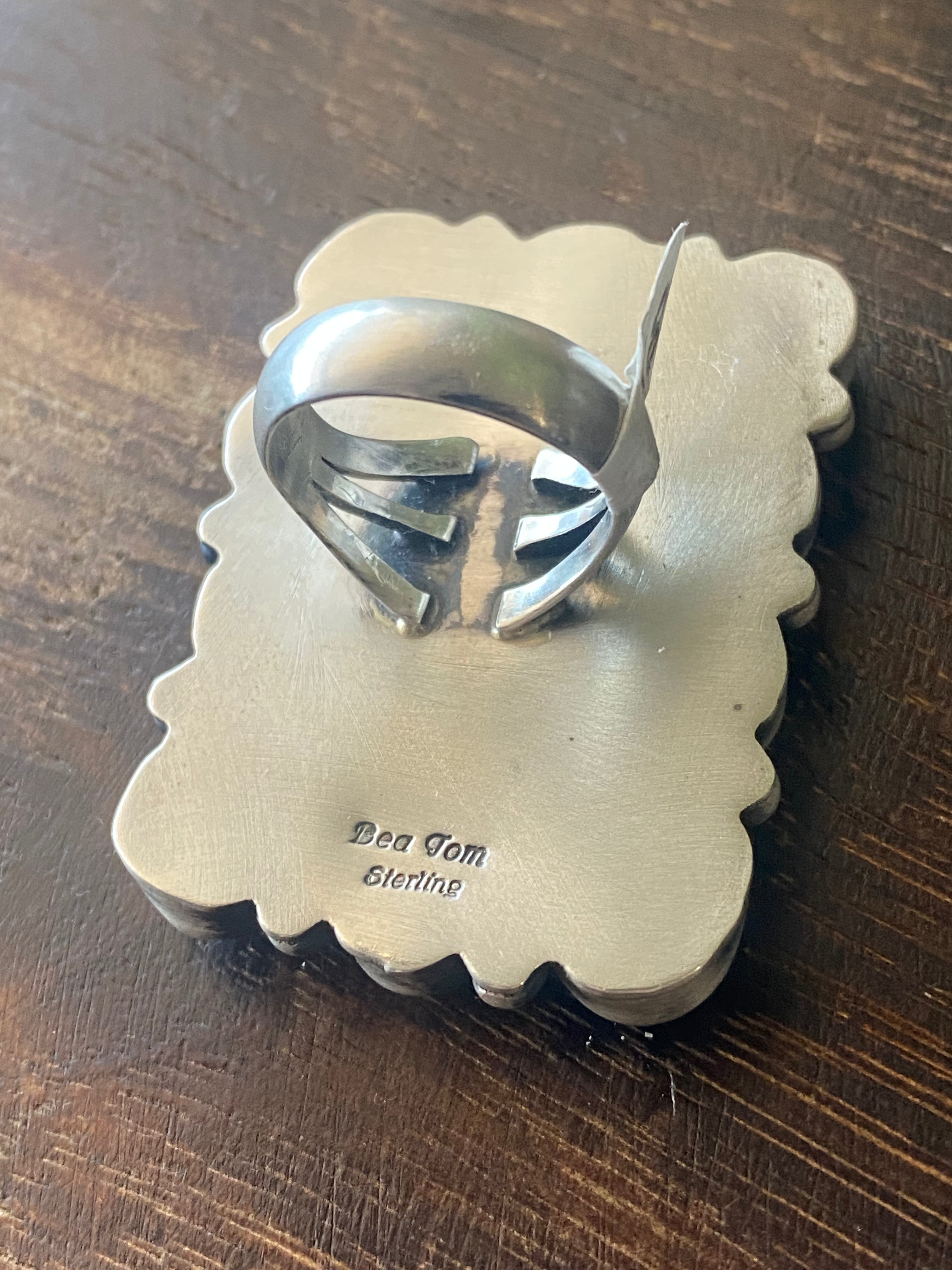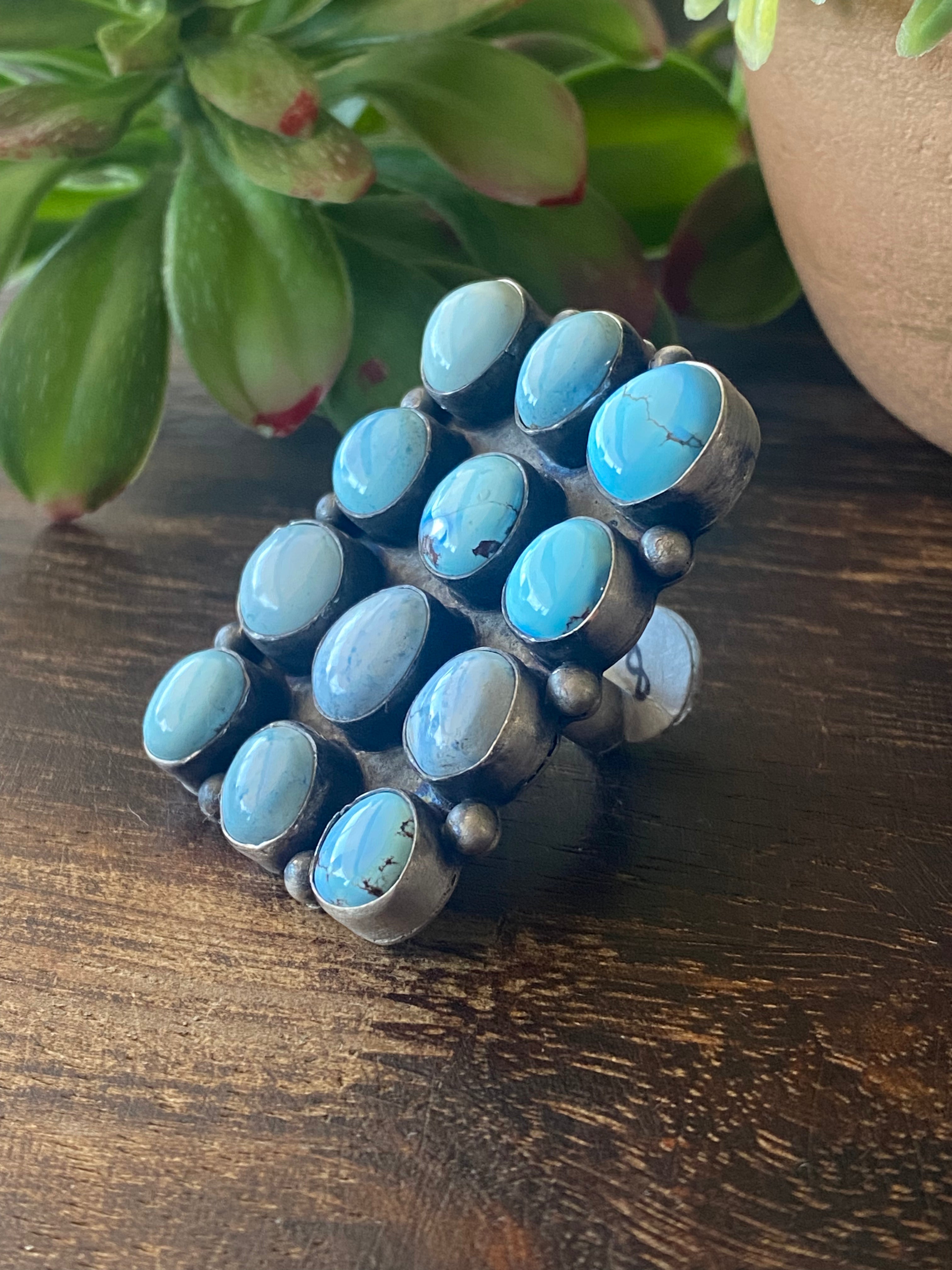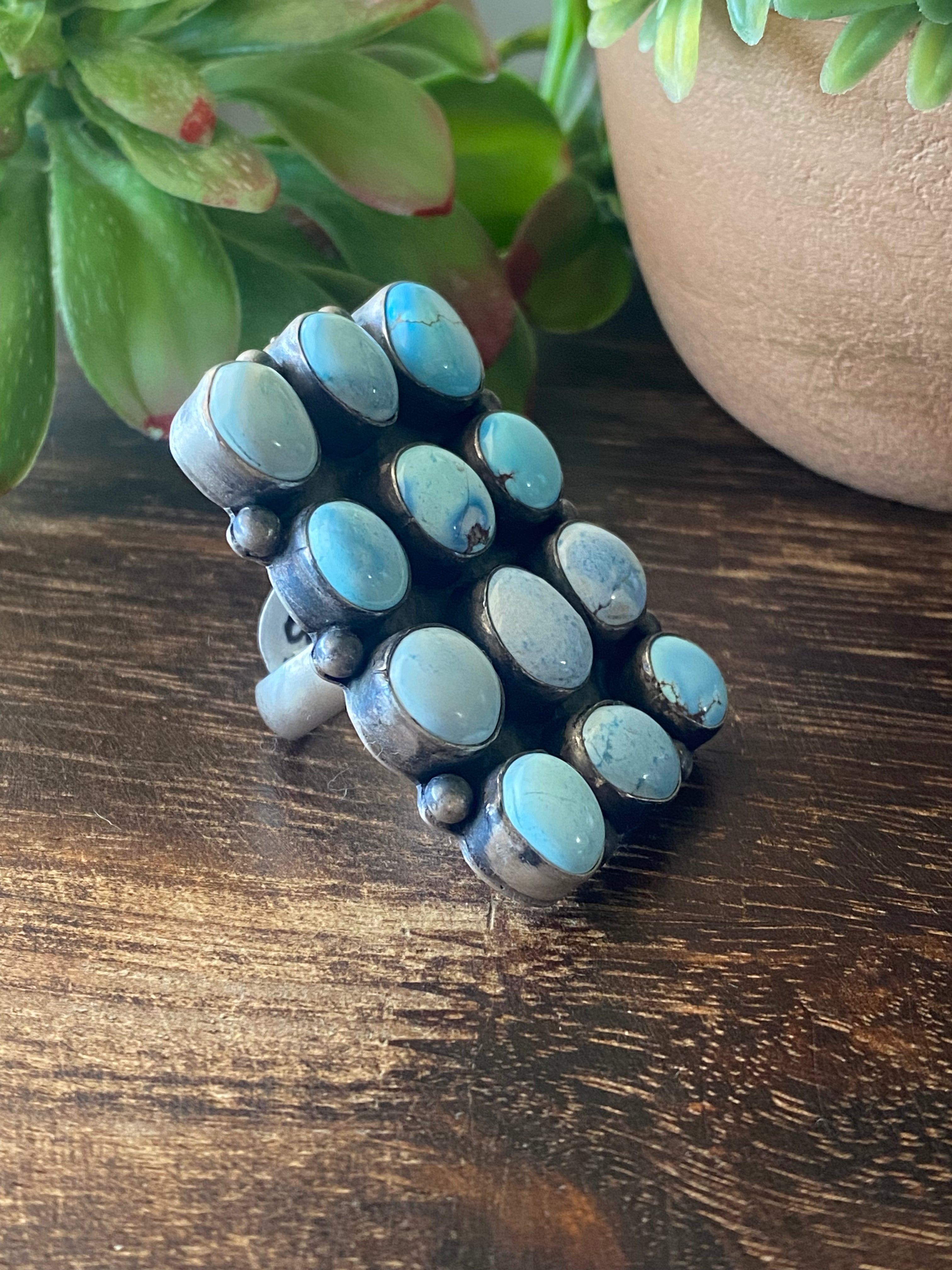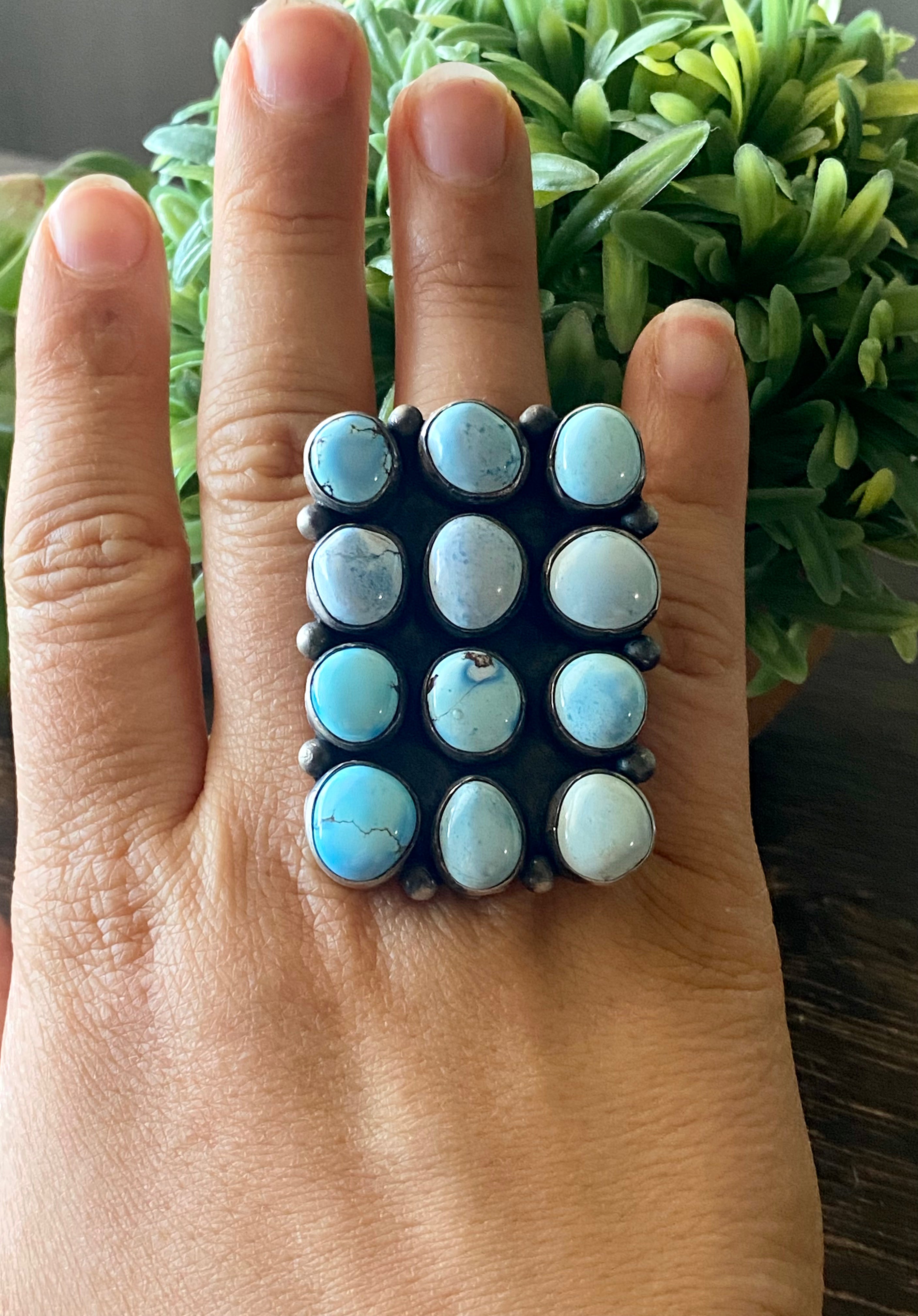 Bea Tom Golden Hills Turquoise & Sterling Silver Cluster Ring Size 8. It measures 2 inches long and just over 1 3/8 inches wide. Signed by the artist and stamped sterling silver.