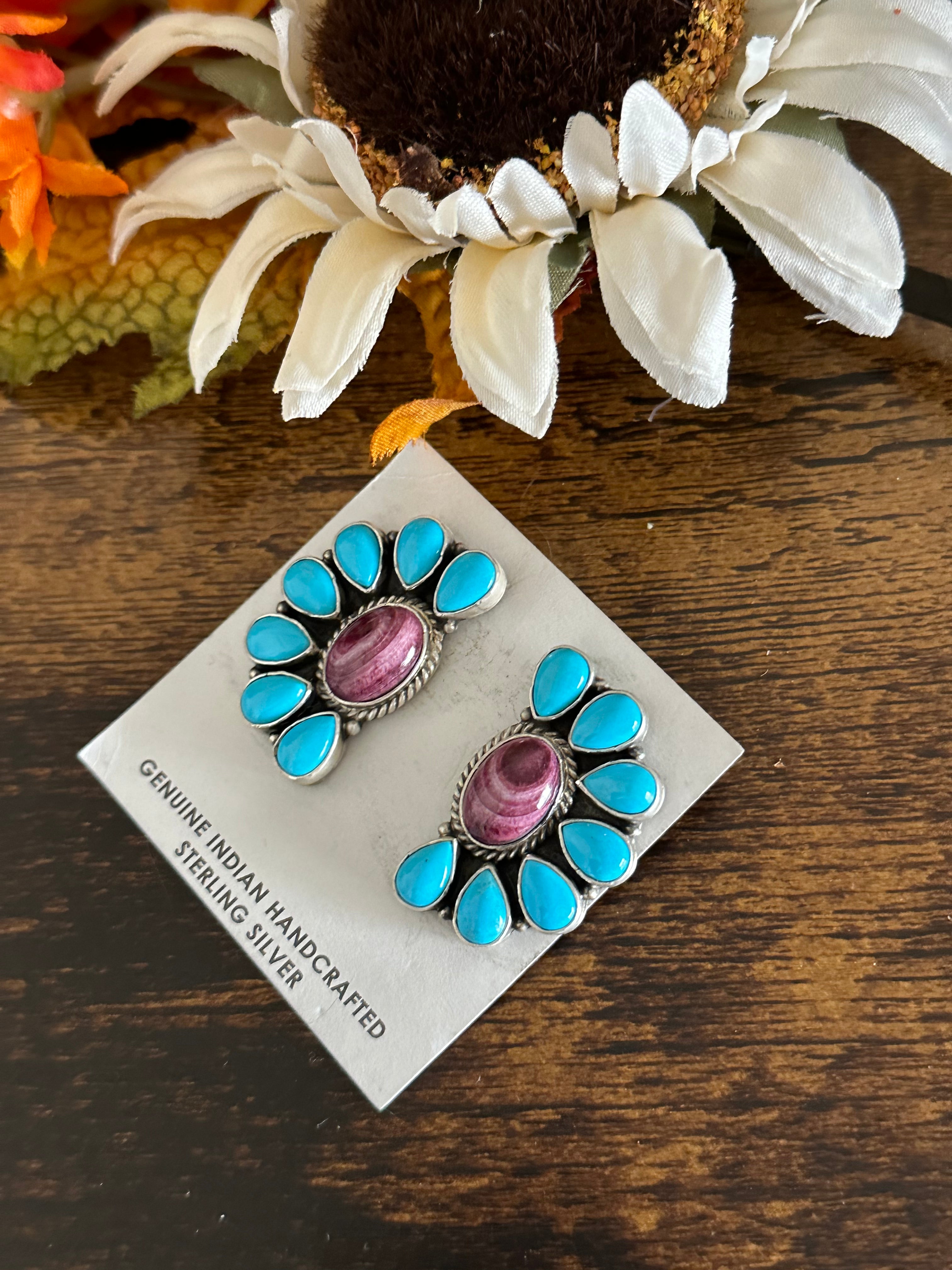Beautiful Cluster Earrings. Belinda Begay Multi Stone & Sterling Silver Post Dangle Cluster Earrings. It measures 1 1/2 inches long and 7/8 of an inch wide. Stamped sterling silver and signed.