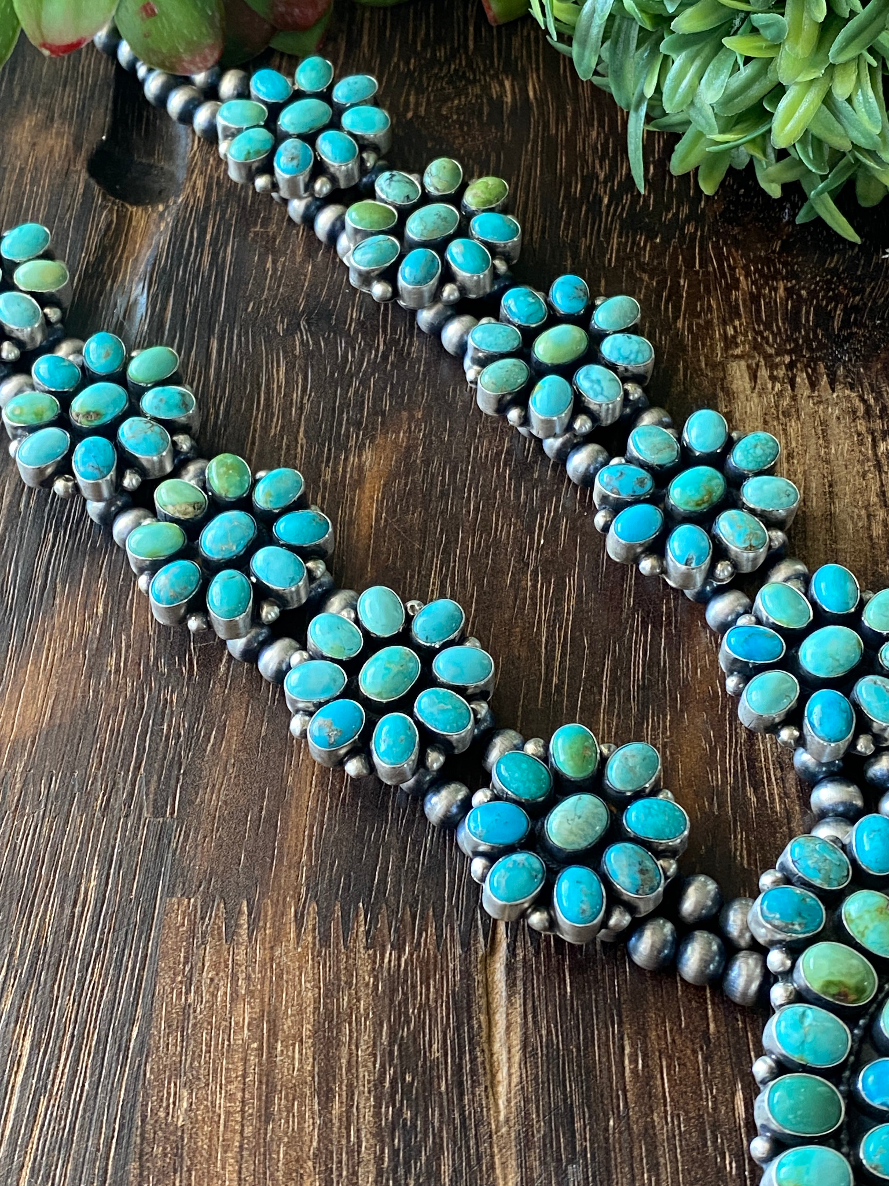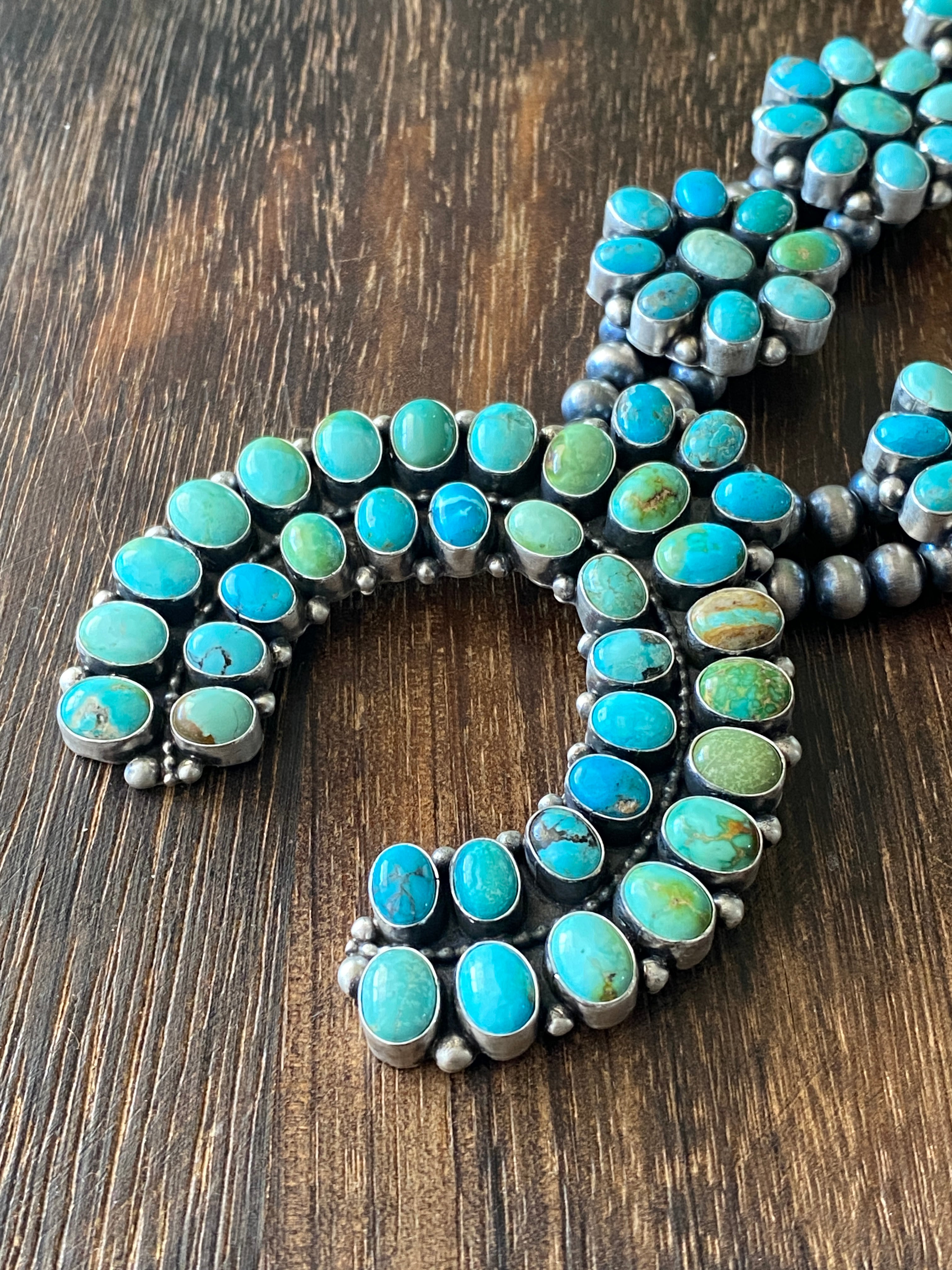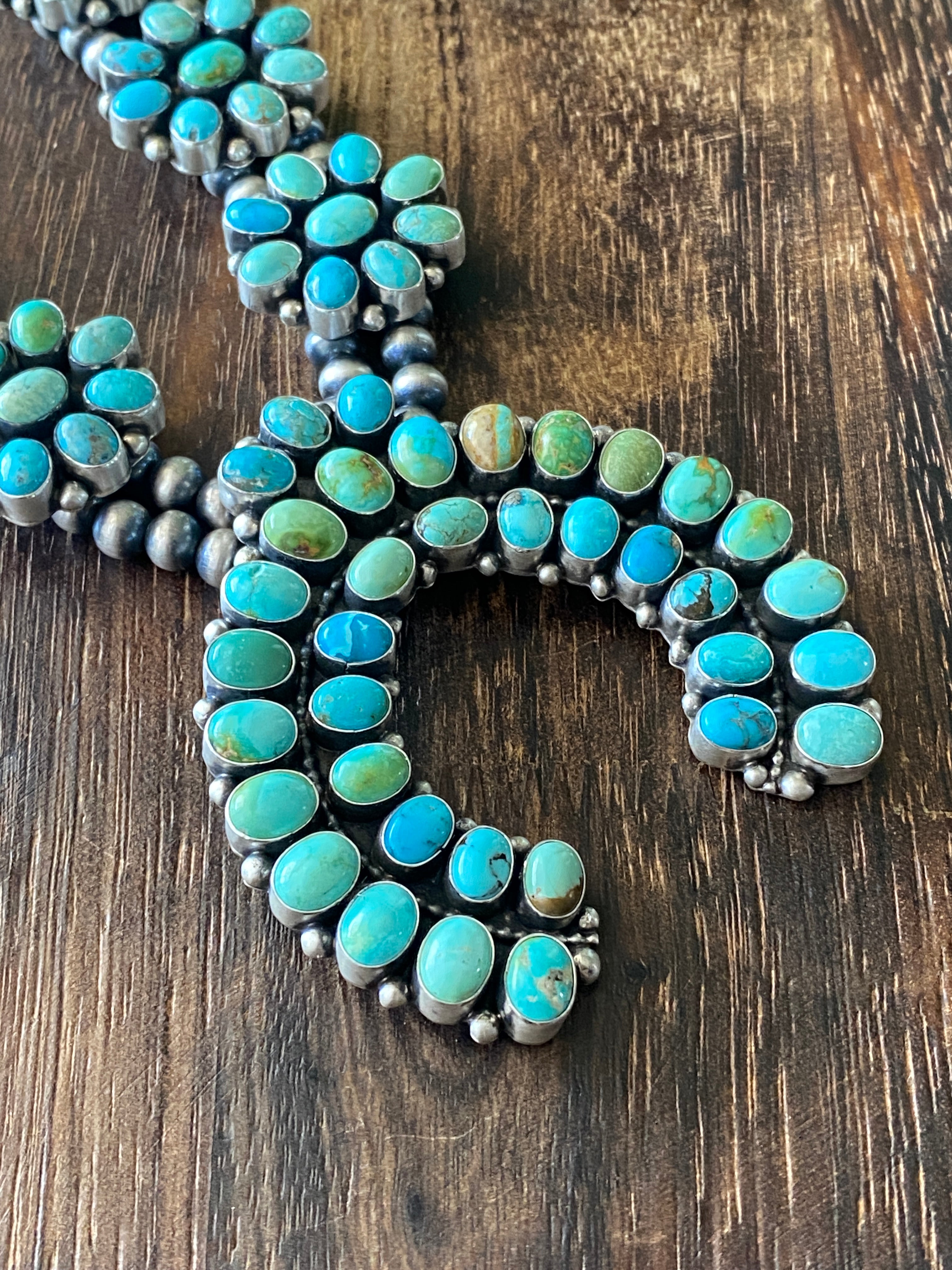 B Yellowhorse Mix Natural Turquoise & Sterling Silver Cluster Squash Necklace. (Carico Lake Turquoise, Royston Turquoise, Kingman Turquoise) It measures 32 inches long with hang without hang it measures 27 inches long. Signed by the artist and stamped sterling silver.