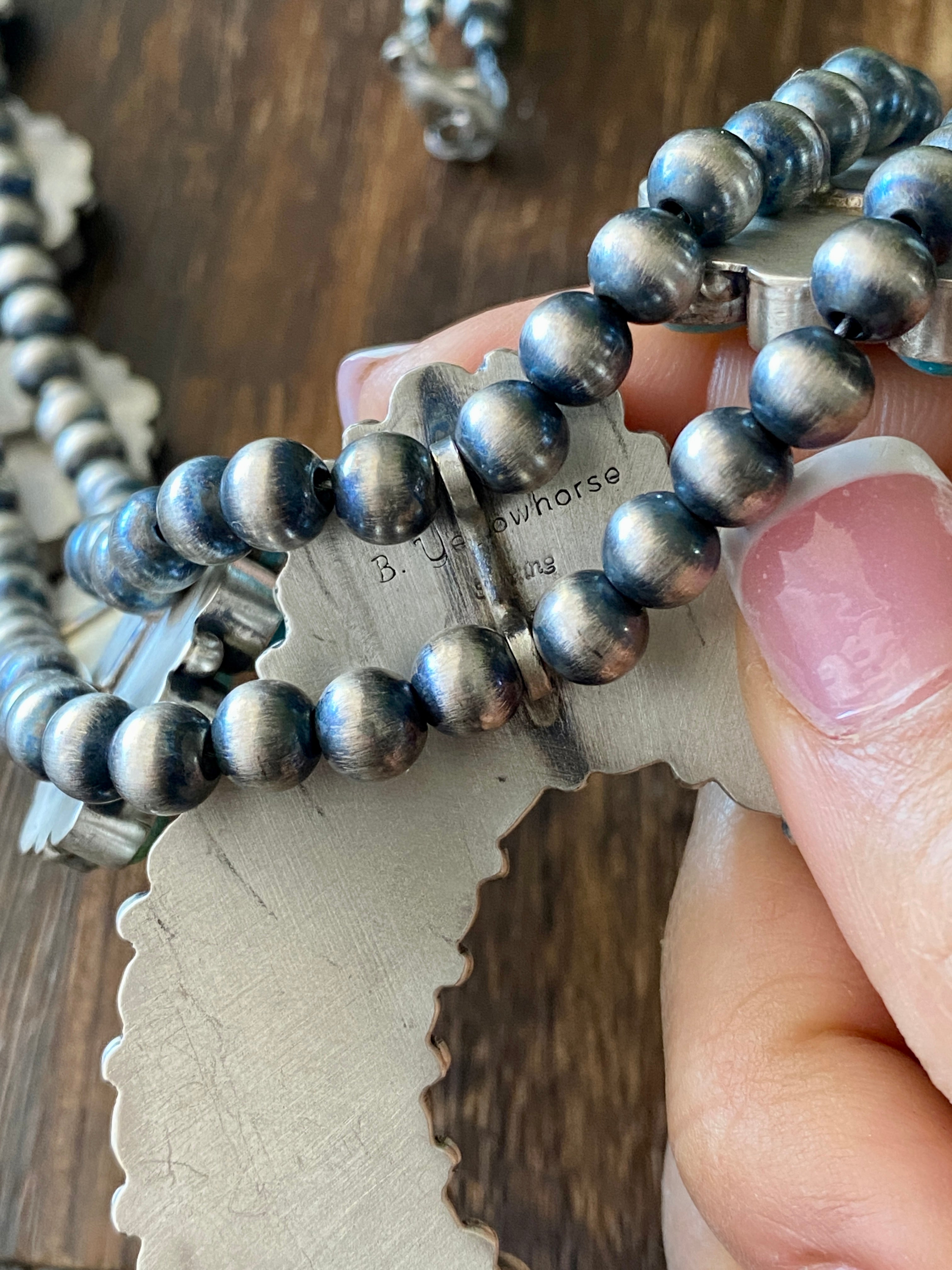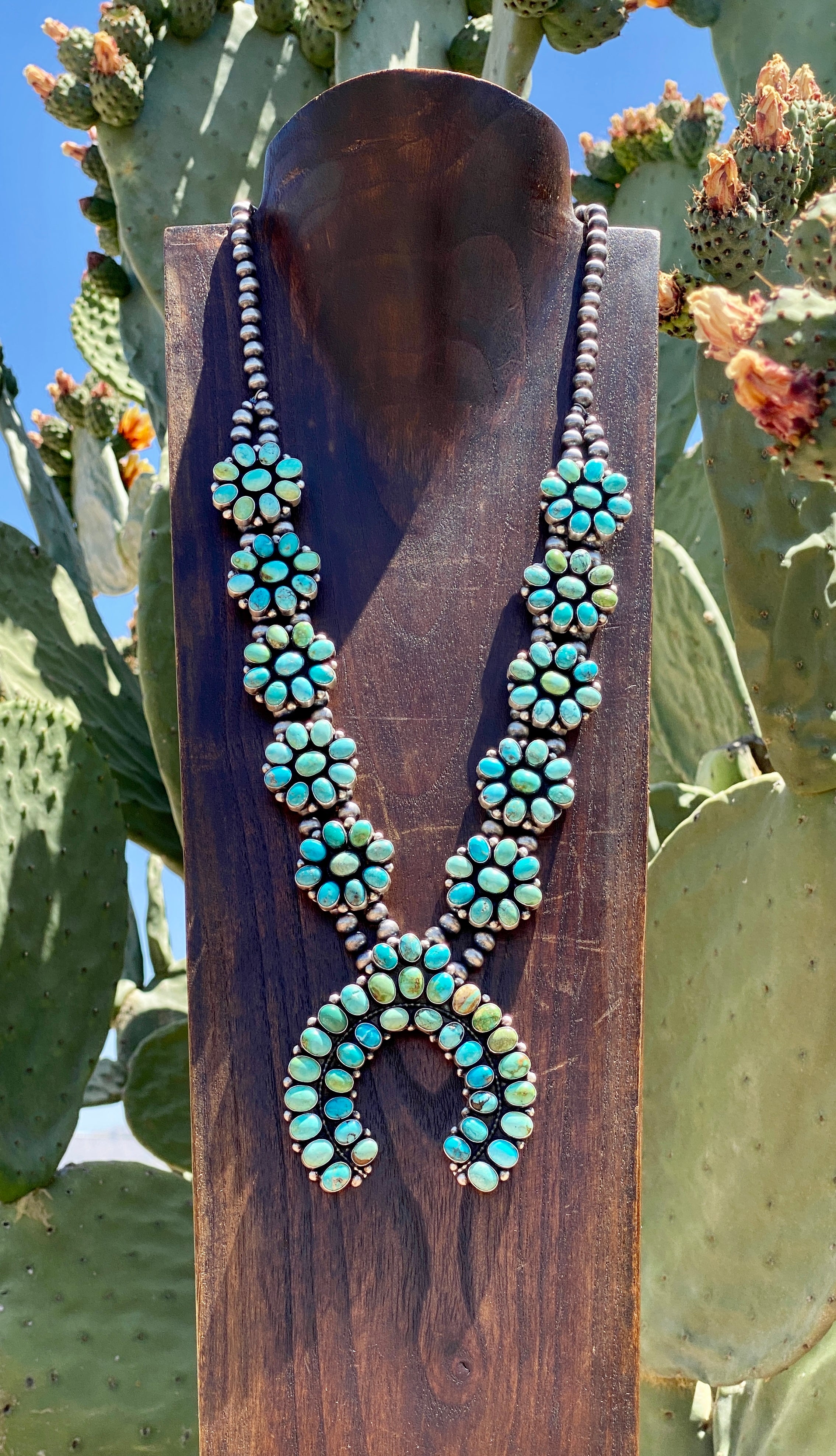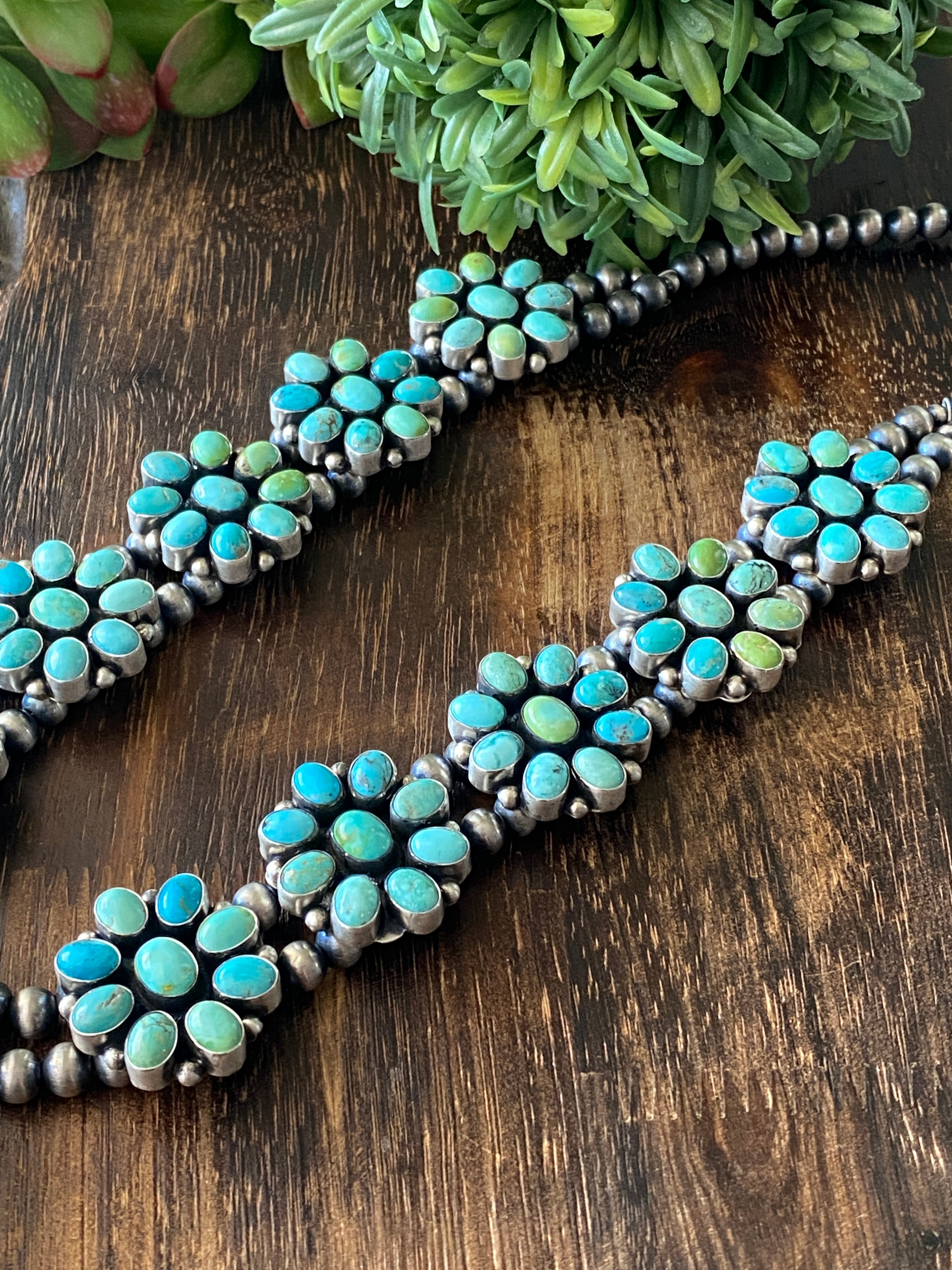 B Yellowhorse Mix Natural Turquoise & Sterling Silver Cluster Squash Necklace. (Carico Lake Turquoise, Royston Turquoise, Kingman Turquoise) It measures 32 inches long with hang without hang it measures 27 inches long. Signed by the artist and stamped sterling silver.