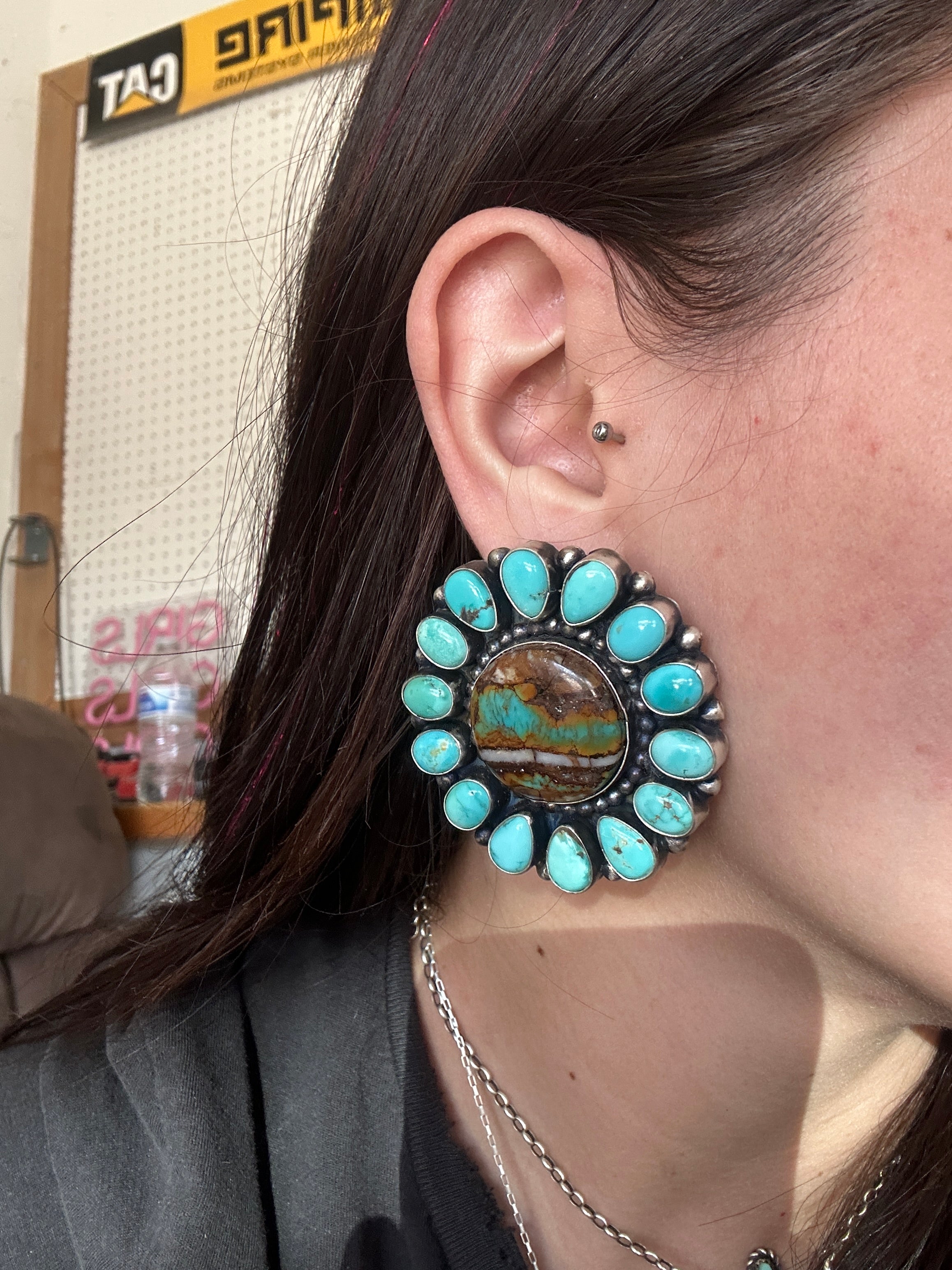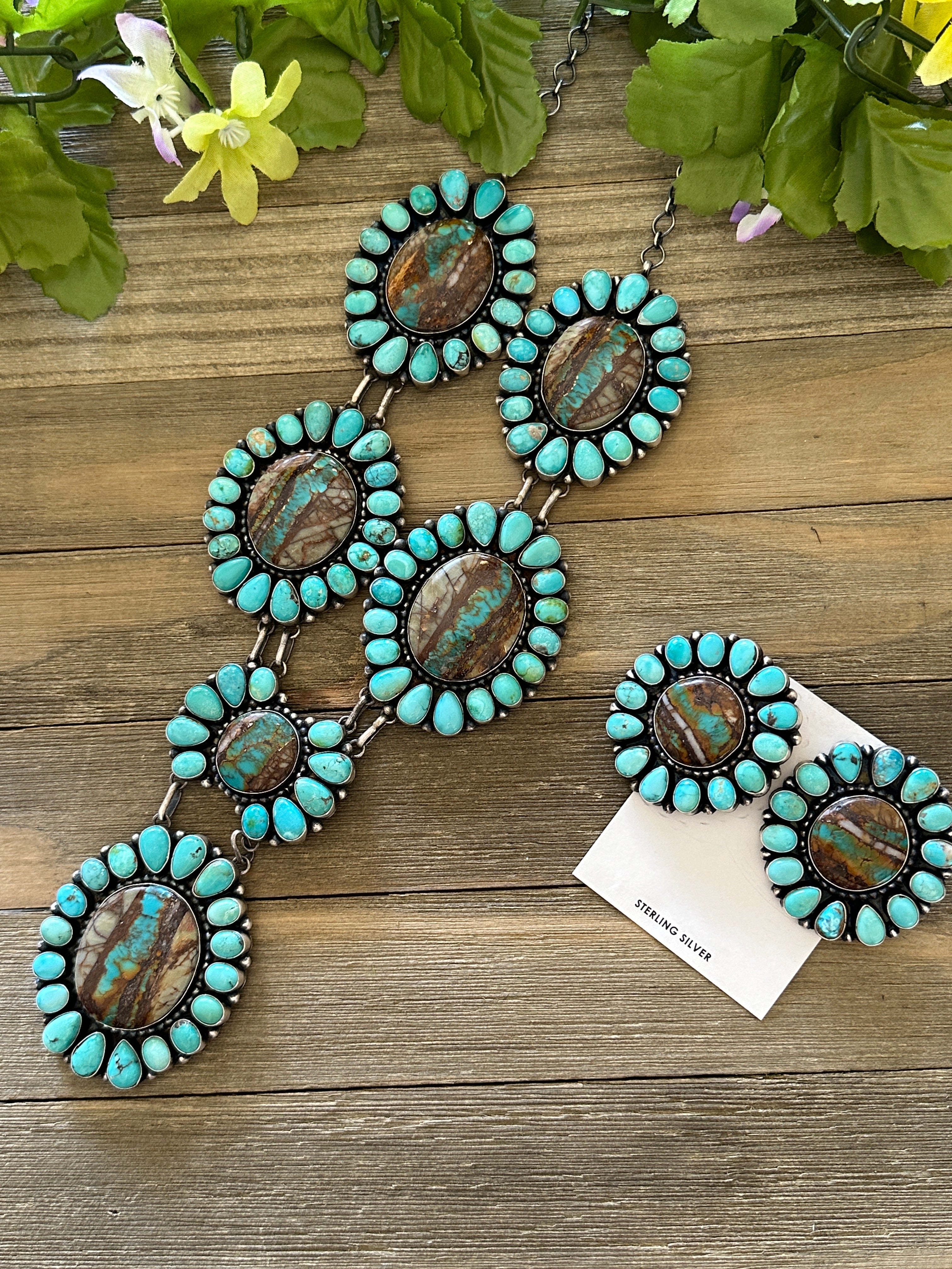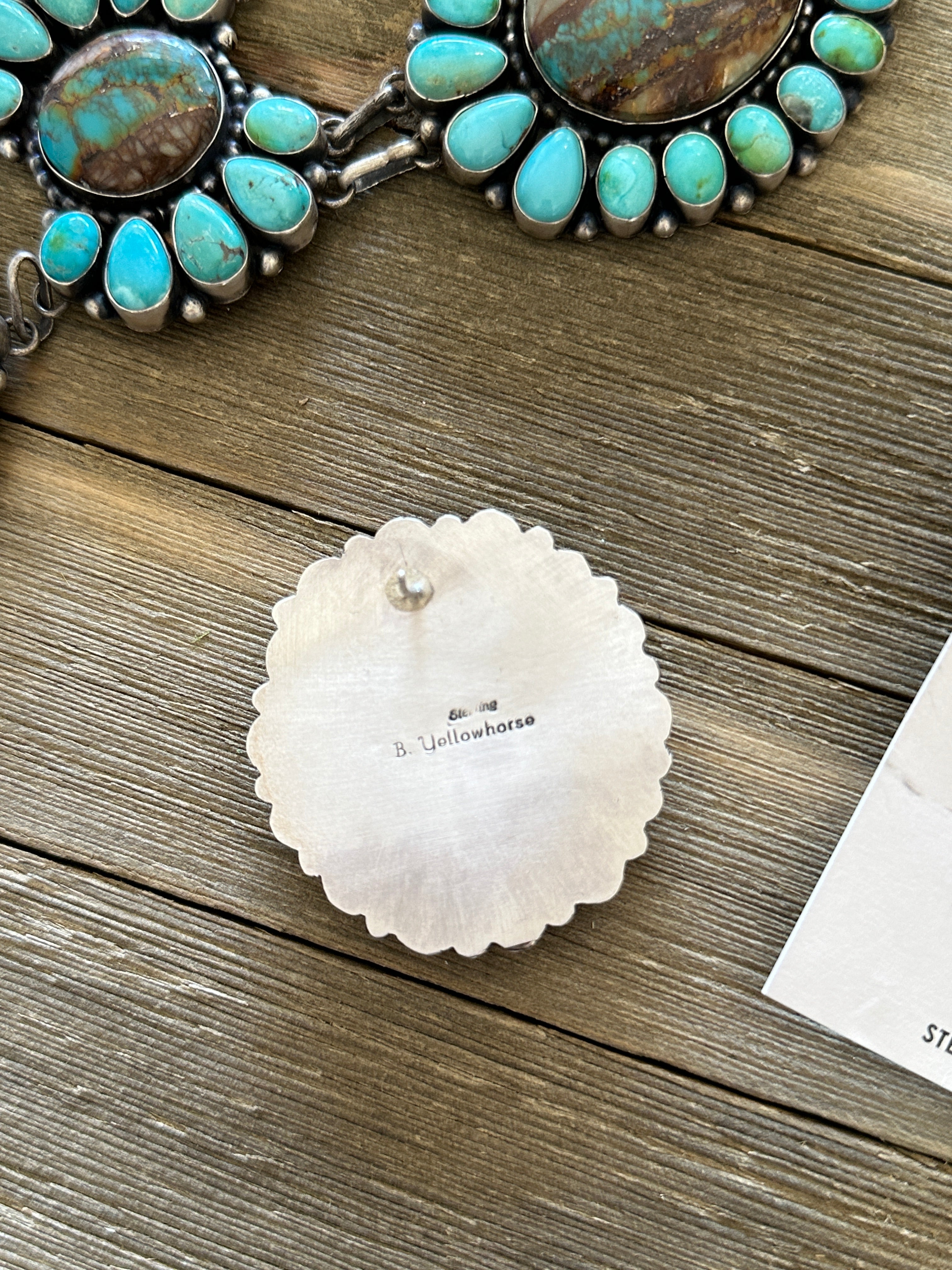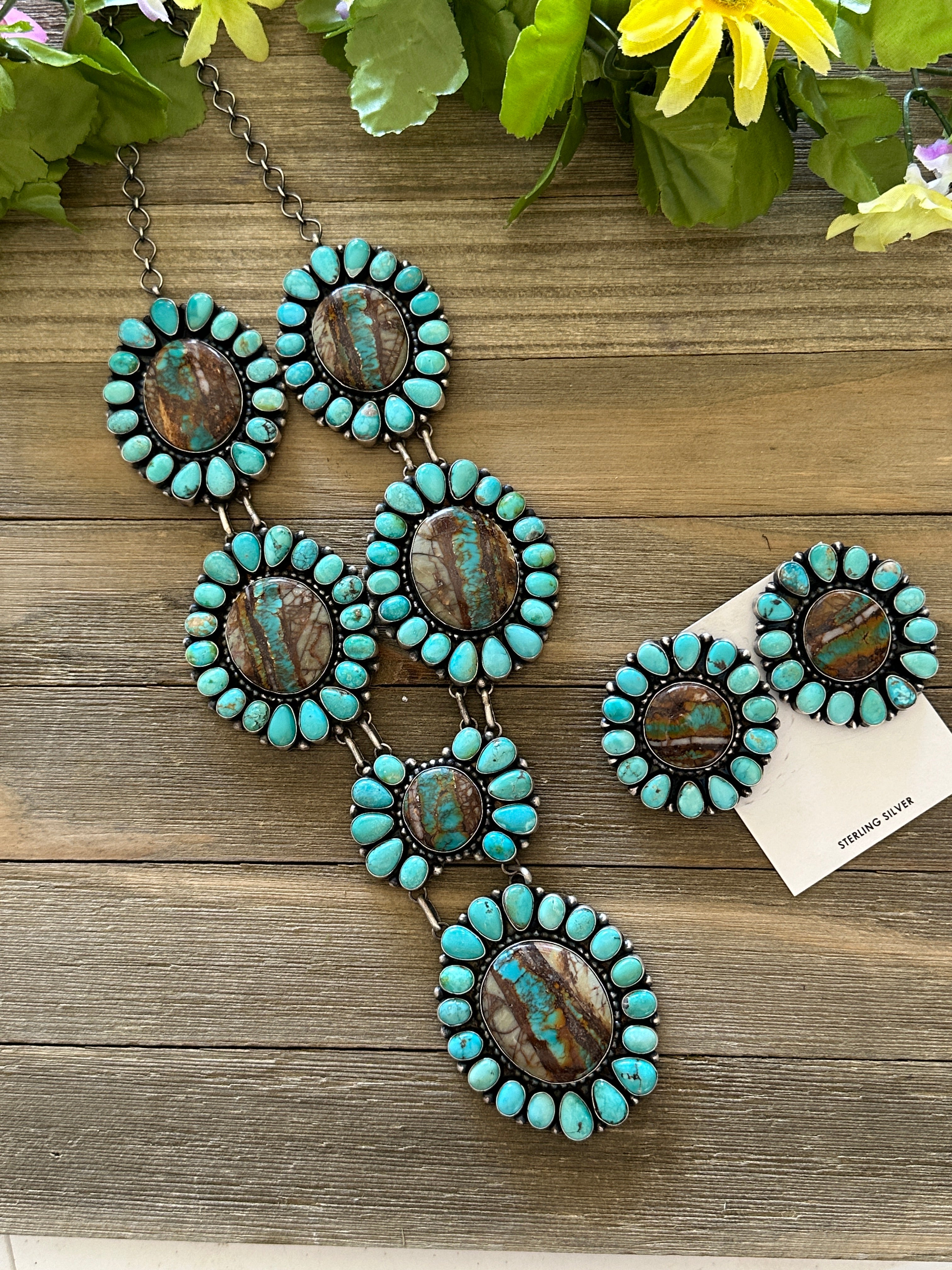 B Yellowhorse Ribbon Royston Turquoise & Sonoran Mountain Turquoise & Sterling Silver Necklace Set. It measures just under 34 1/2 inches long with hang while the chain by itself measures 26 inches long and the earrings measure 2 inches round. Signed by the artist and stamped sterling silver.