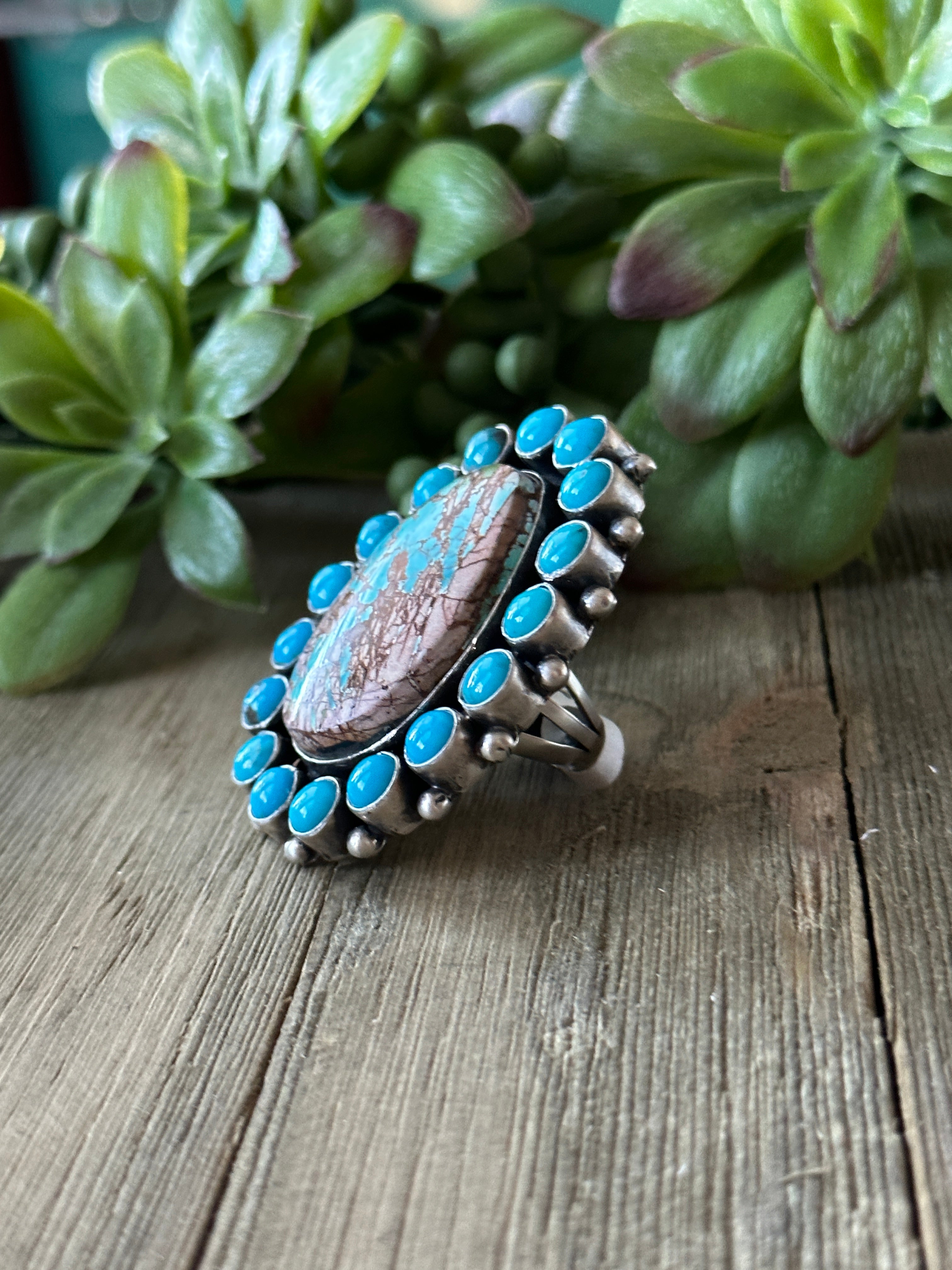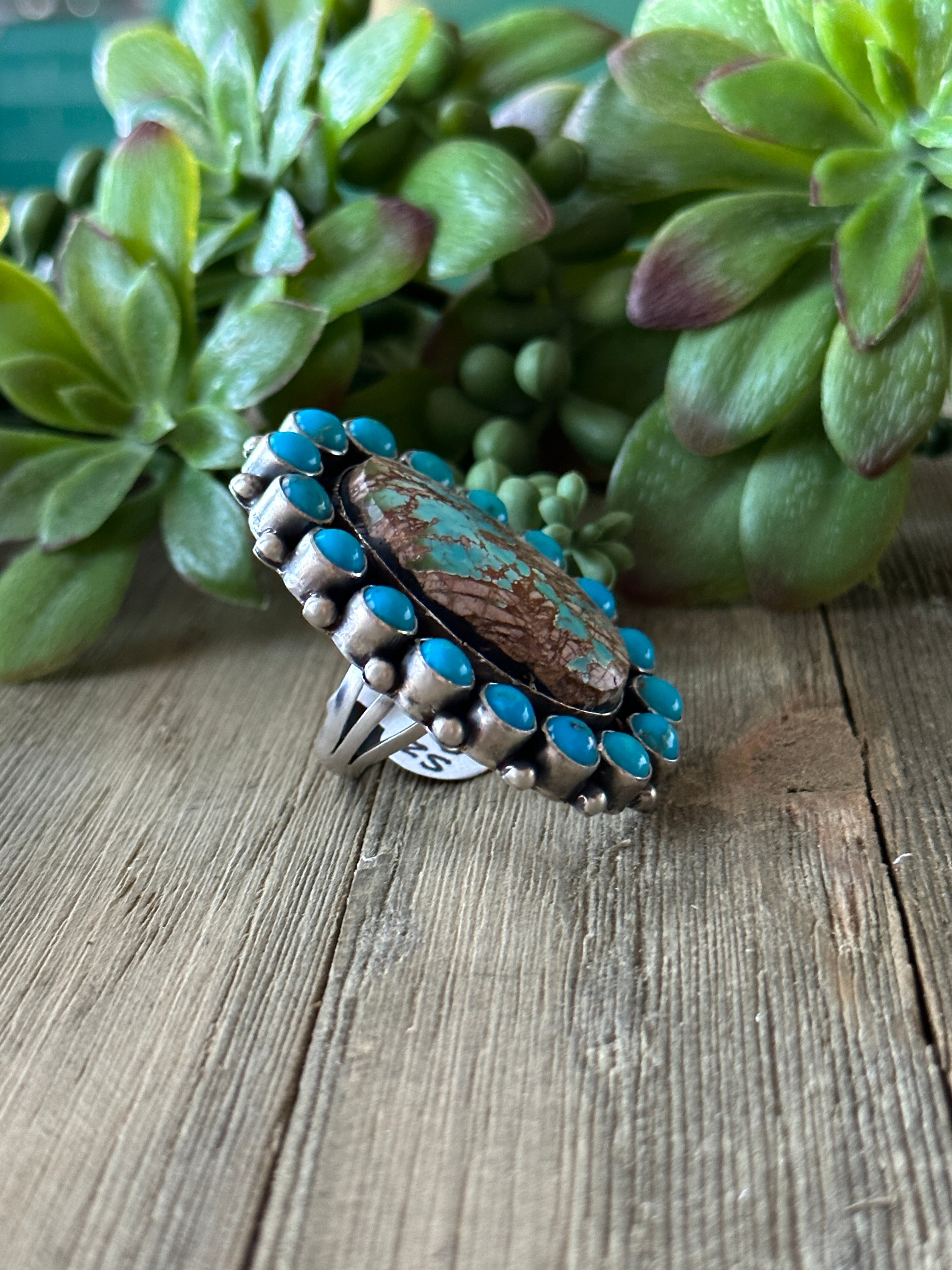 B Yellowhorse Royston Turquoise & Kingman Turquoise & Sterling Silver Ring Size 8.75