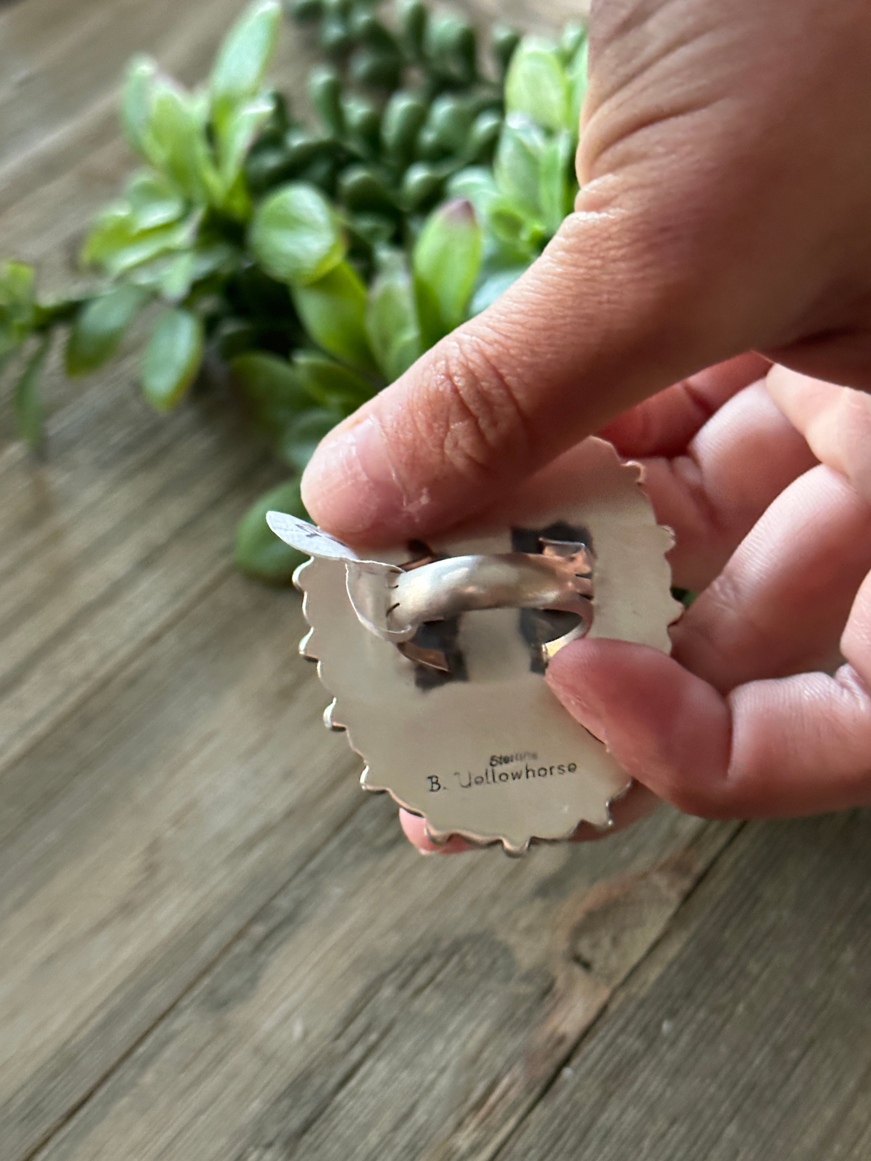 B Yellowhorse Royston Turquoise & Kingman Turquoise & Sterling Silver Ring Size 8.75. It measures 2 1/8 inches long and 1 3/4 inches wide. Signed by the artist and stamped sterling silver.