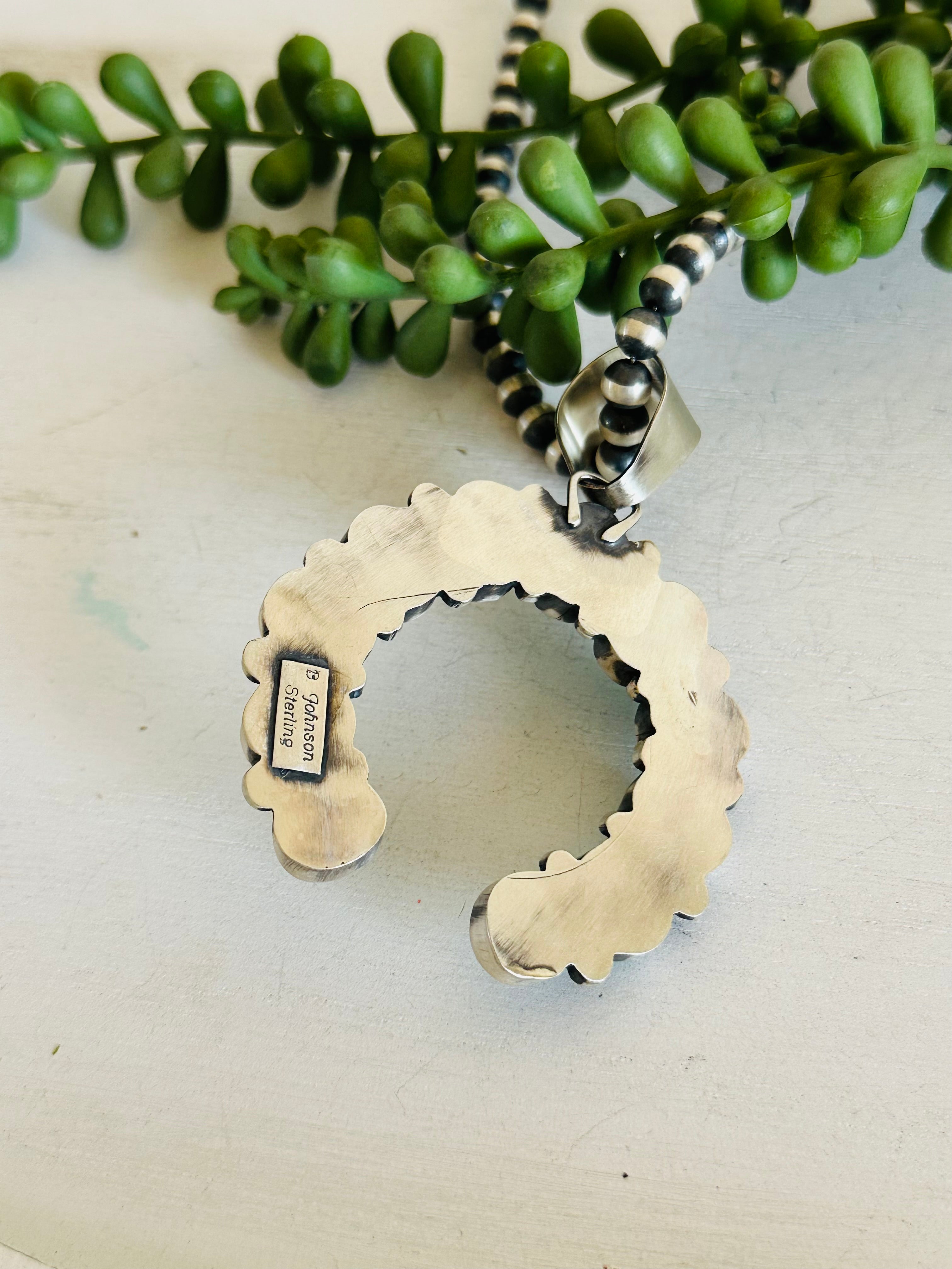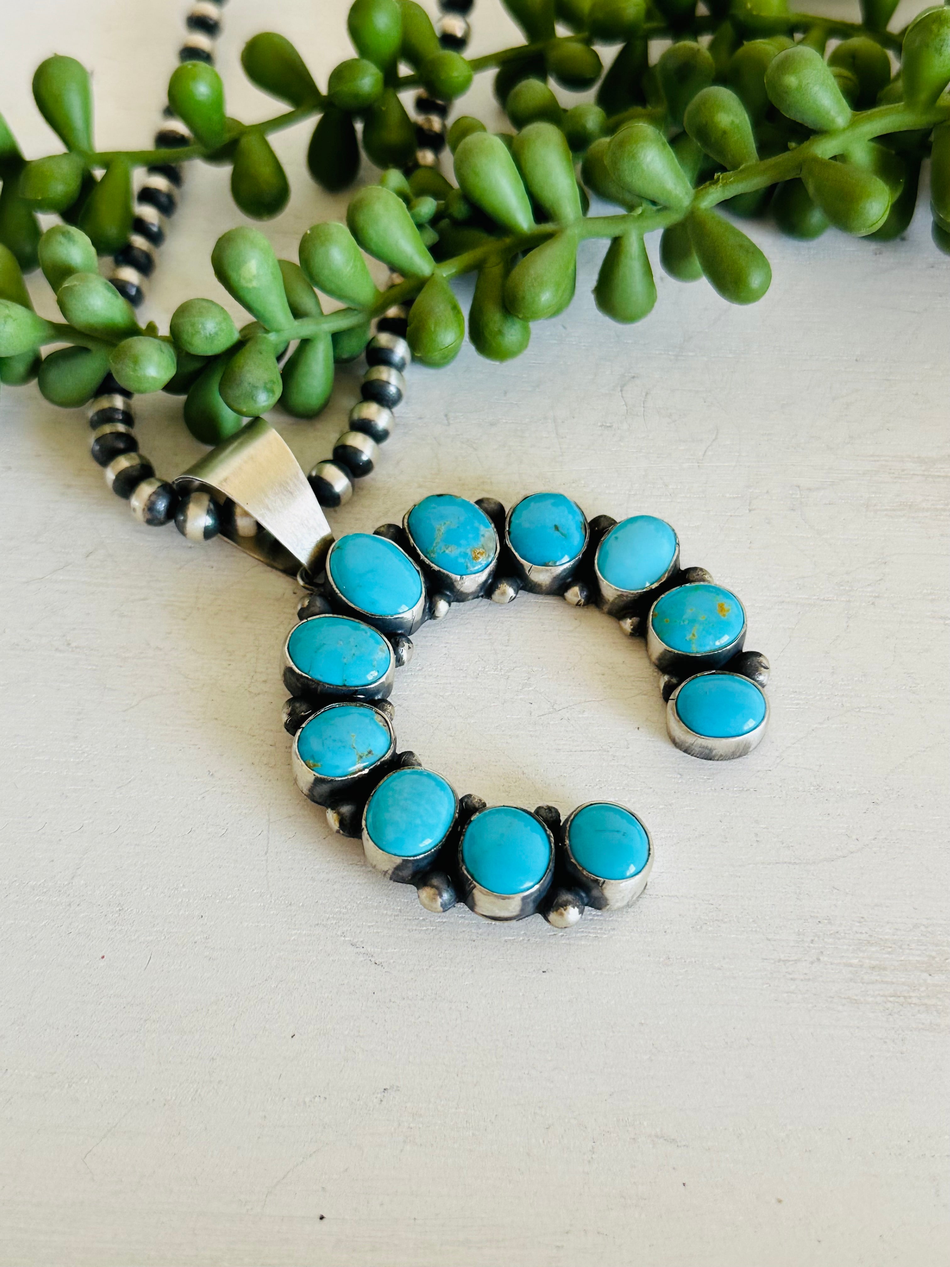 pendant, very well made. Bessie Johnson Blue Ridge Turquoise & Sterling Silver Naja Pendant. It measures 3 1/8 inches long and 2 1/4 inches wide. Pendant Only. Stamped and signed. Stones will differ due to natural stones.