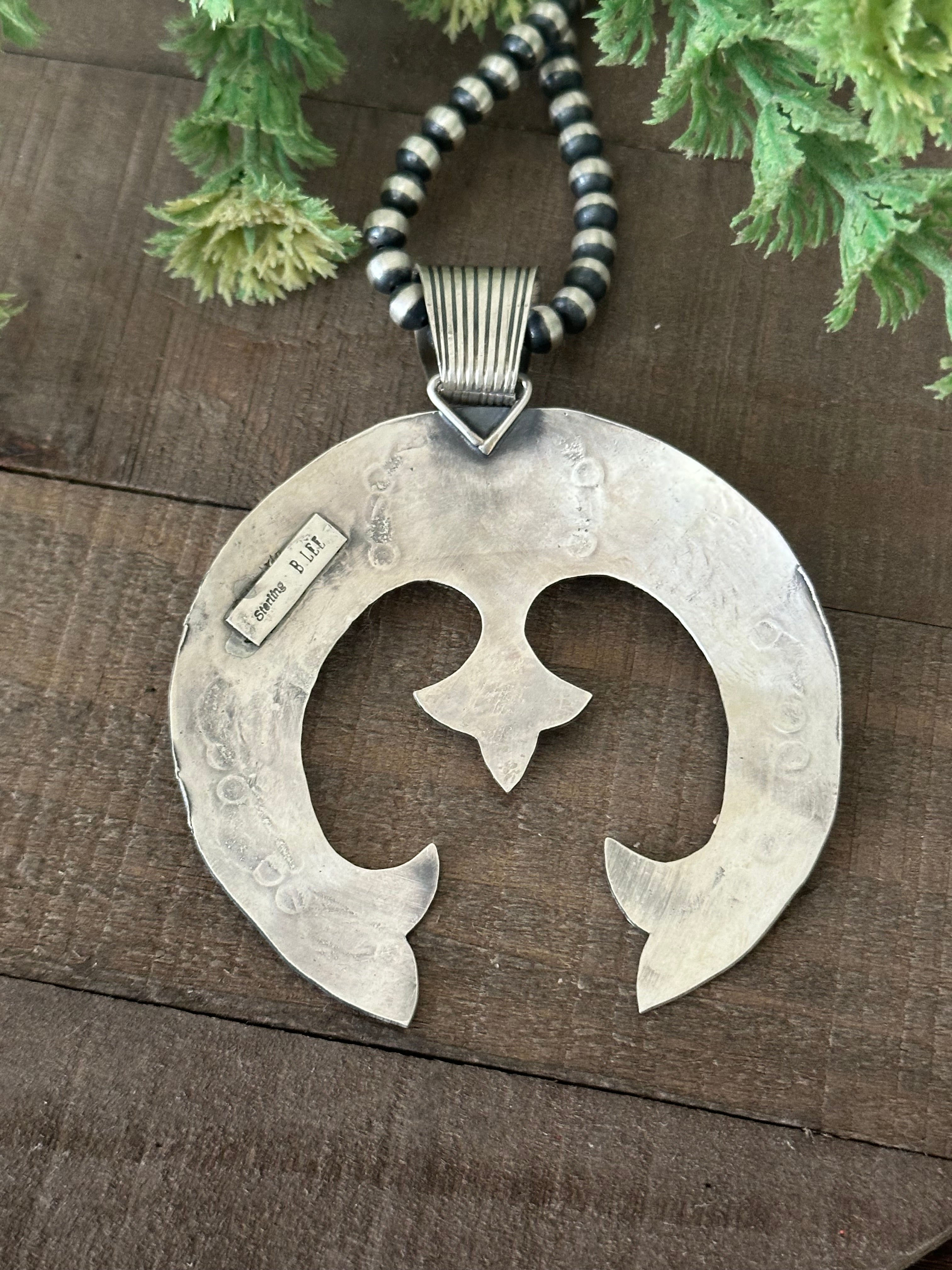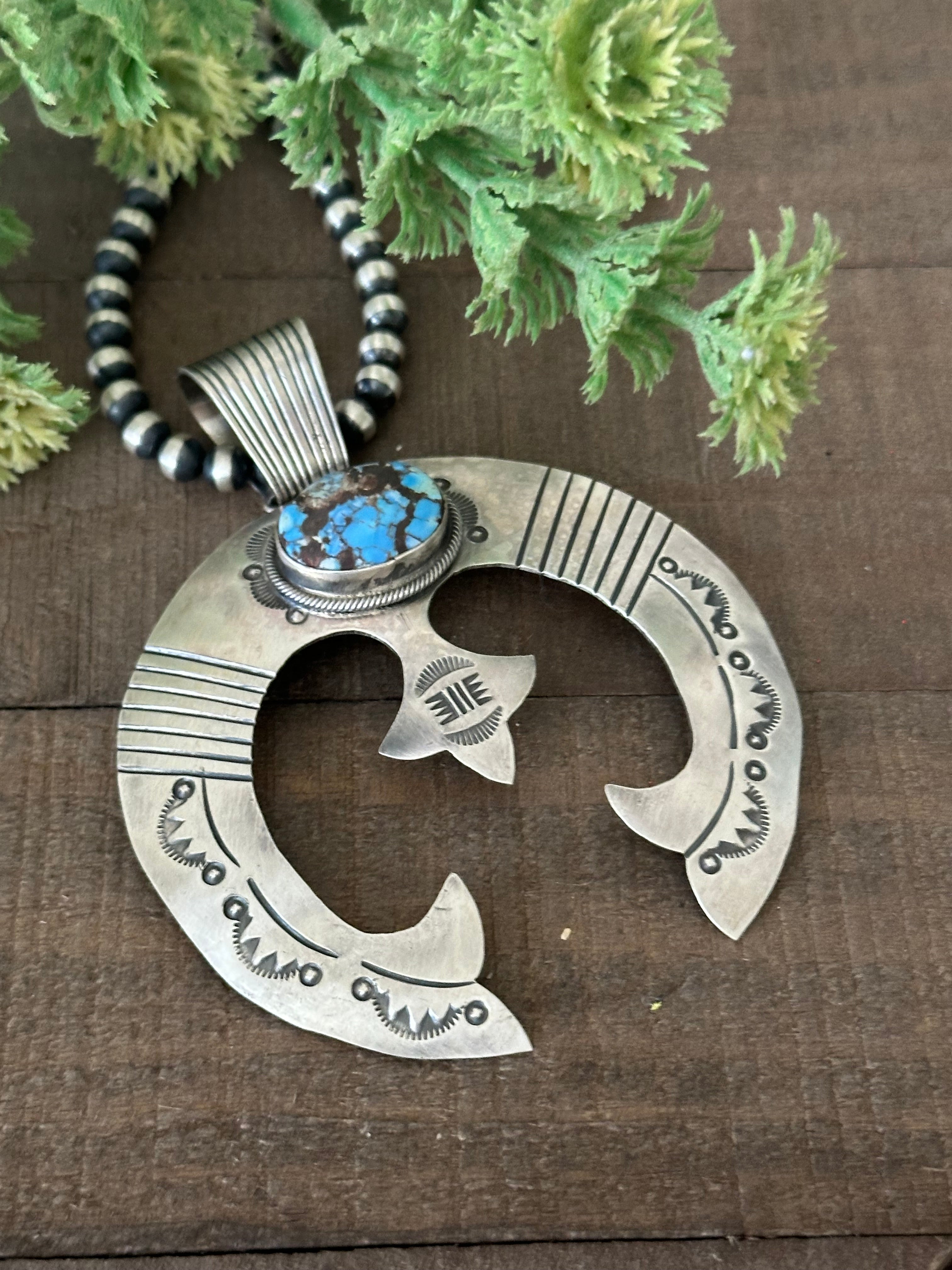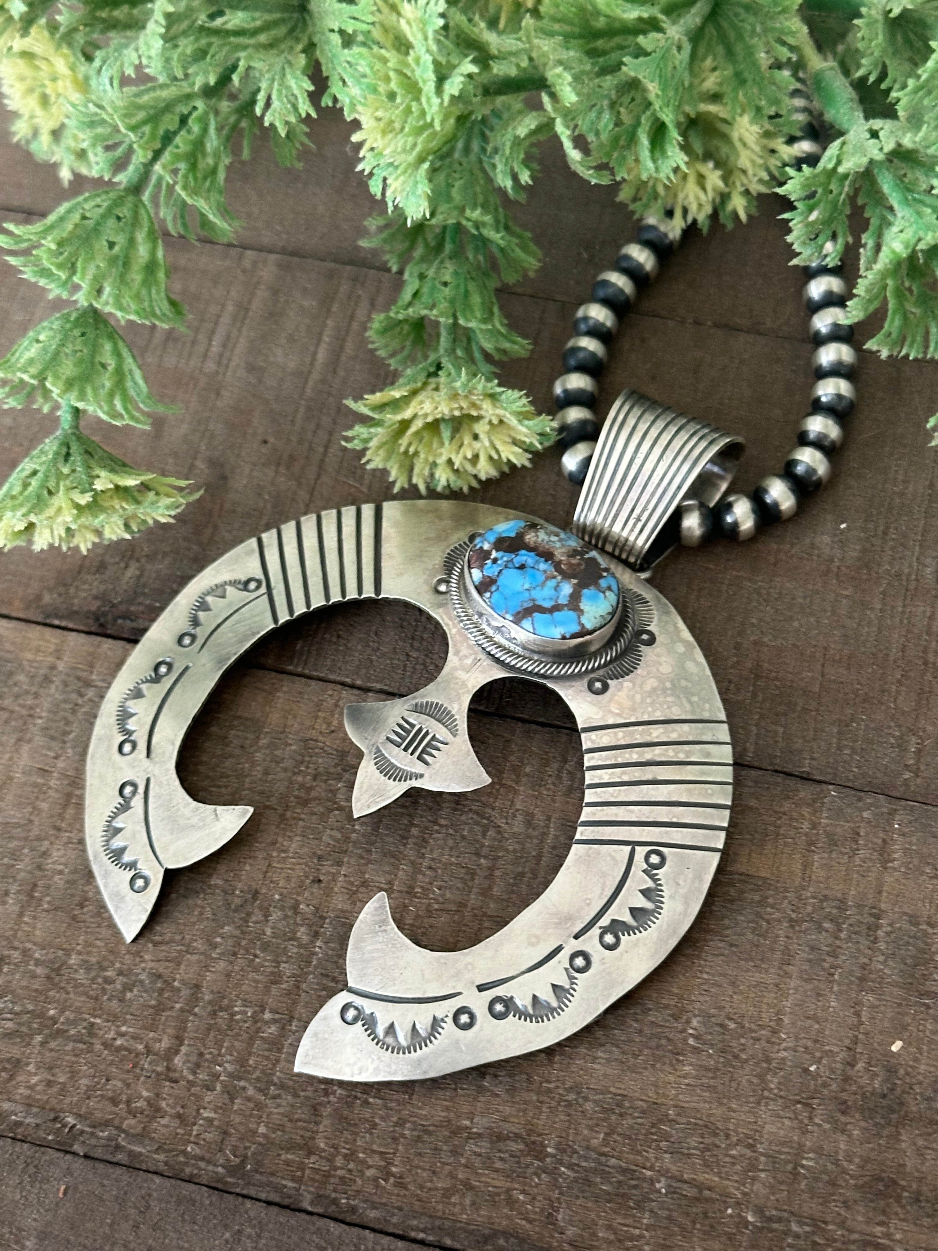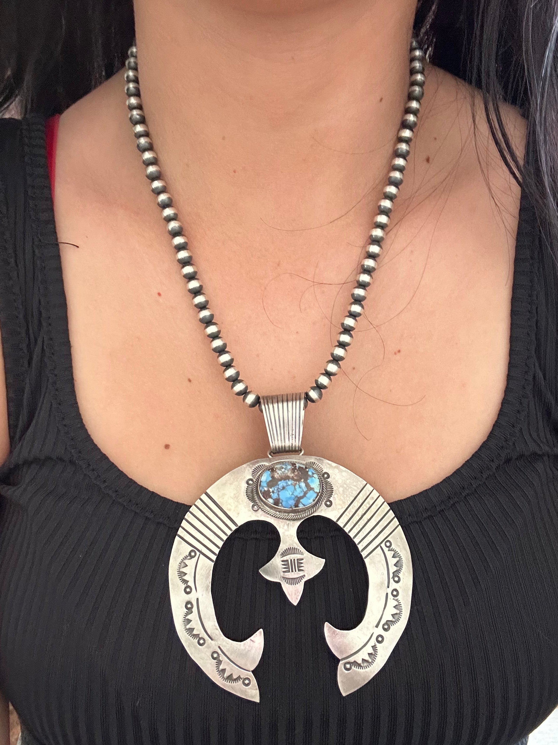 Betta Lee Golden Hills Turquoise & Sterling Silver Naja Pendant. It measures 3 3/4 inches long and 3 inches wide. Pendant Only!! Signed by the artist and stamped sterling silver.