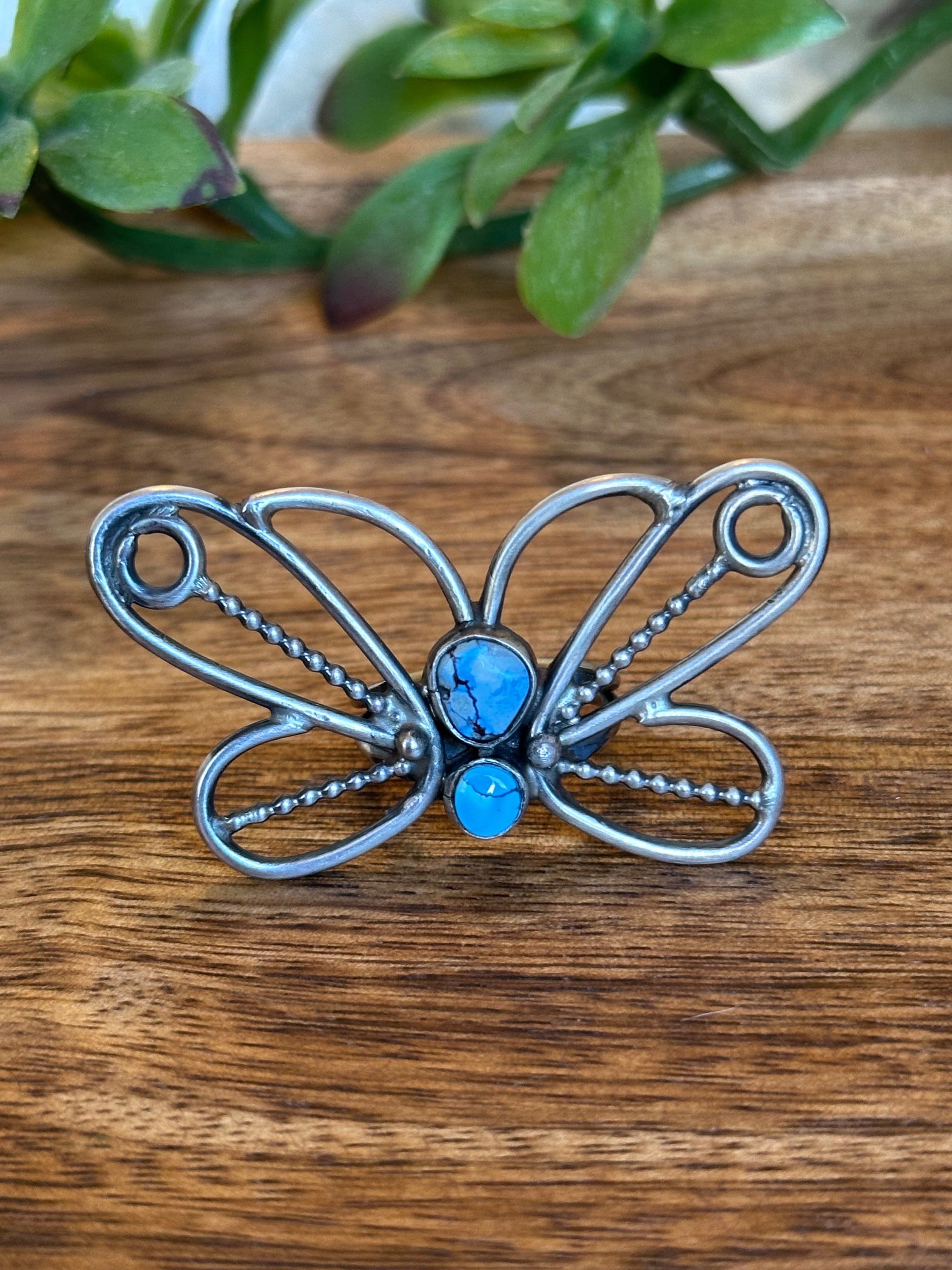 Betta Lee Turquoise & Sterling Silver Butterfly Ring. It measures 1 1/4 inches long and 2 1/8 inches wide. Stamped sterling silver.