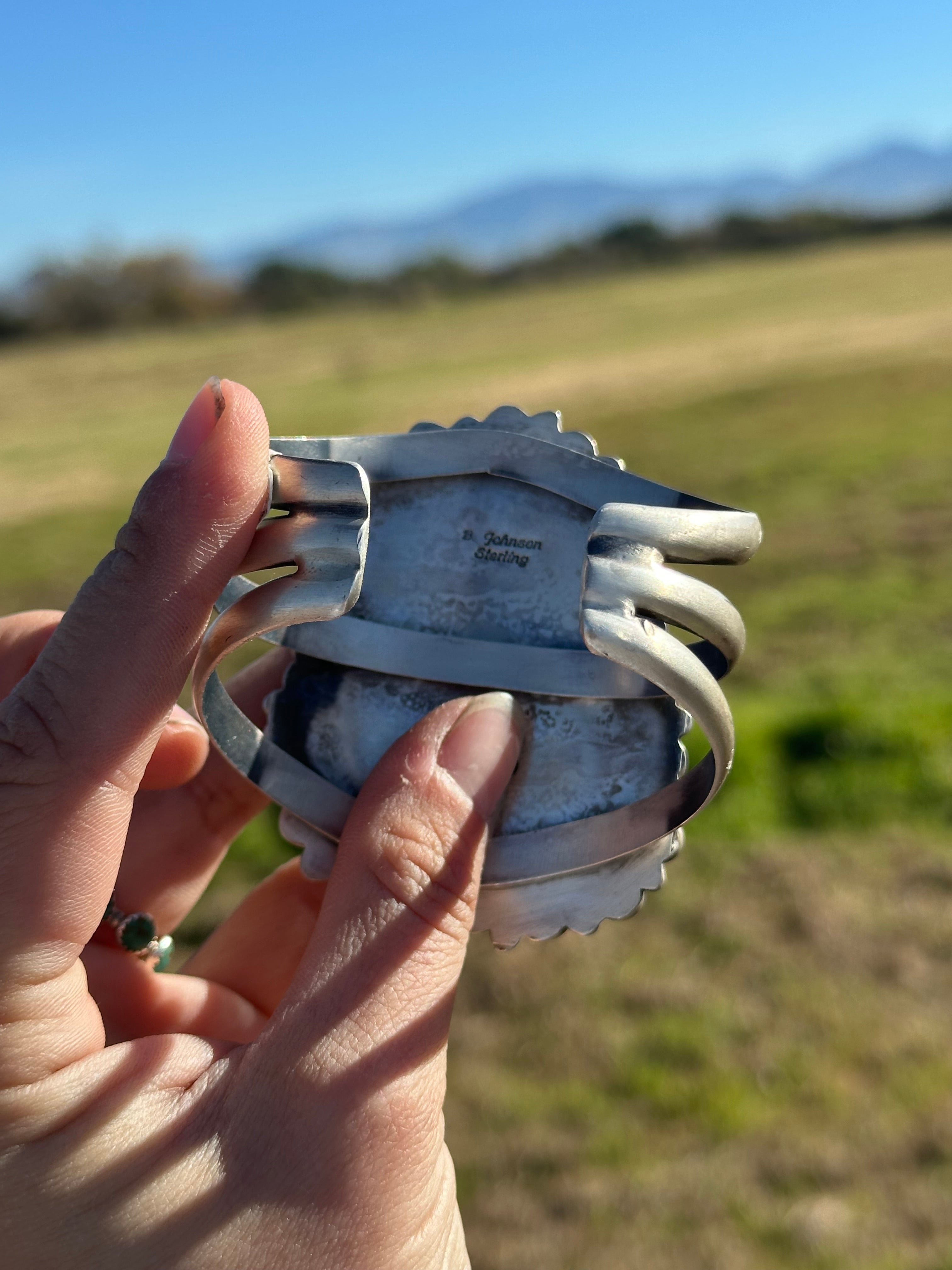 Bobby Johnson Royston Turquoise & Sterling Silver Cuff Bracelet. It measures 2 3/4 inches wide with an inside circumference of 5 3/8 inches and a gap of 7/8 of an inch. Signed by the artist and stamped sterling silver.
