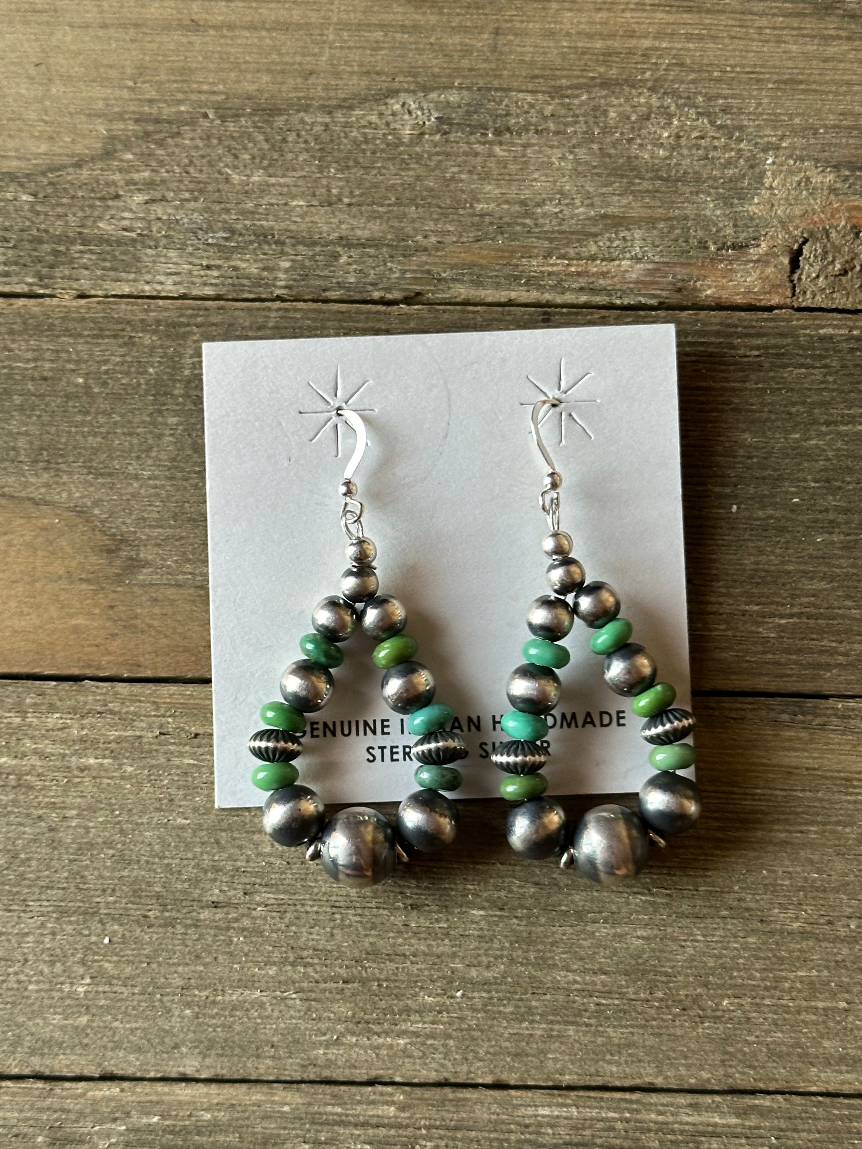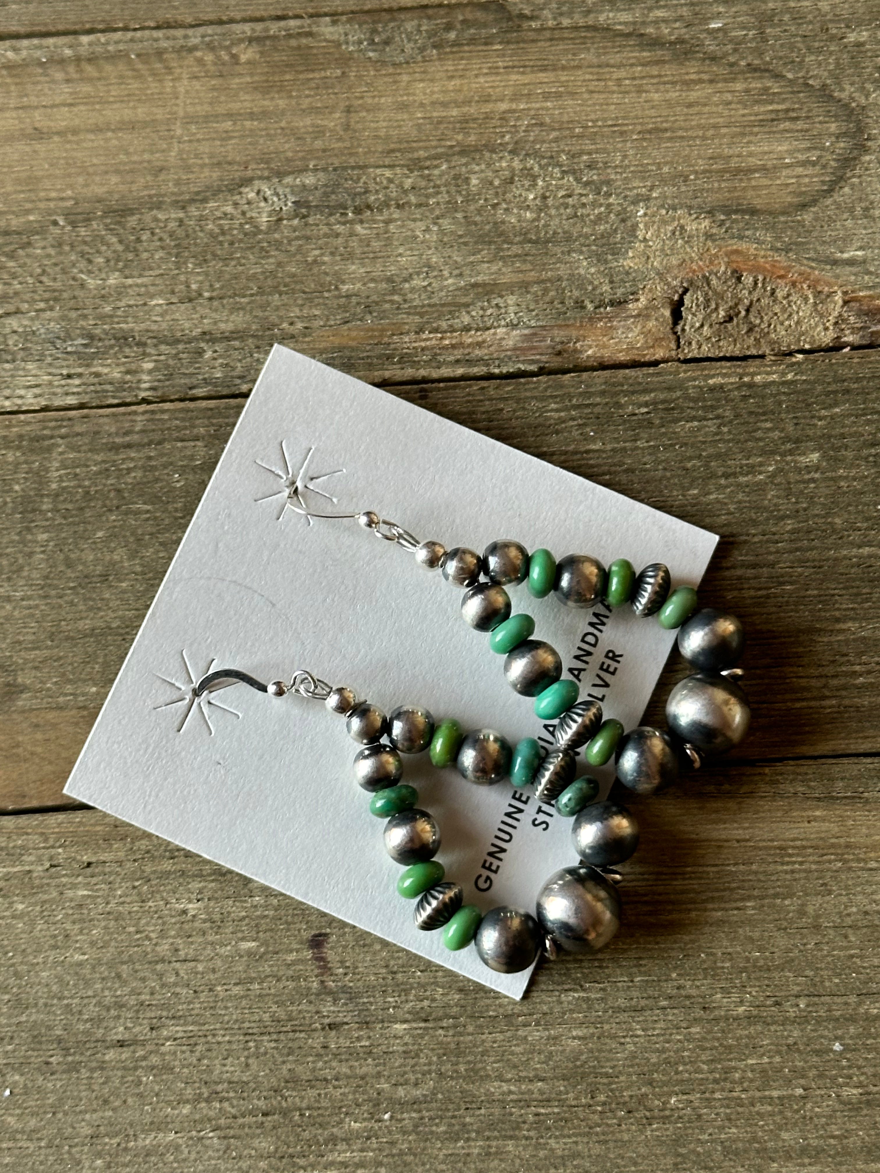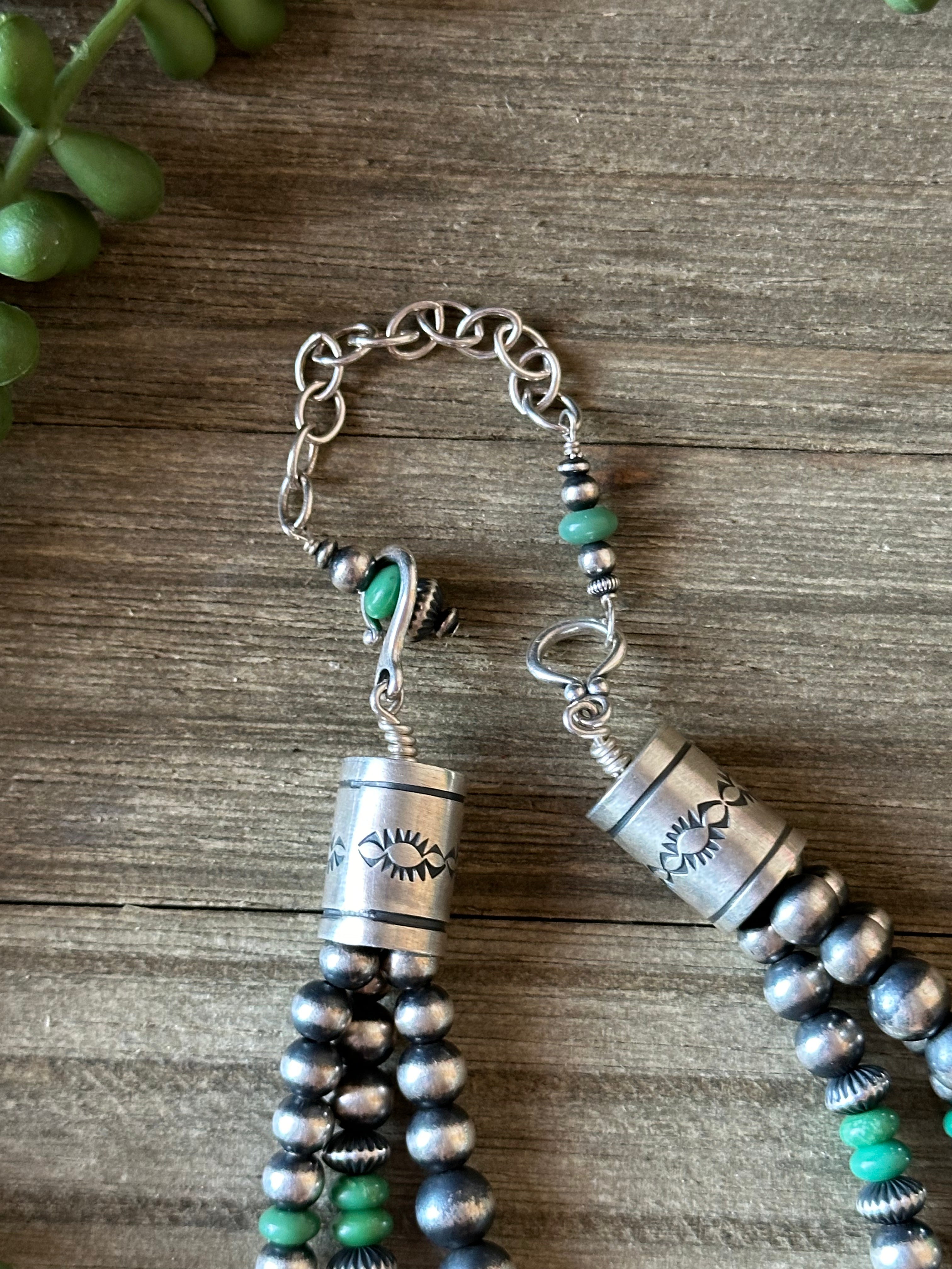 Bobby Johnson Sonoran Gold Turquoise & Sterling Silver Cluster Necklace Set. It measures 29 inches long with hang while the chain by itself measures 22 inches long. Signed by the artist and stamped sterling silver.