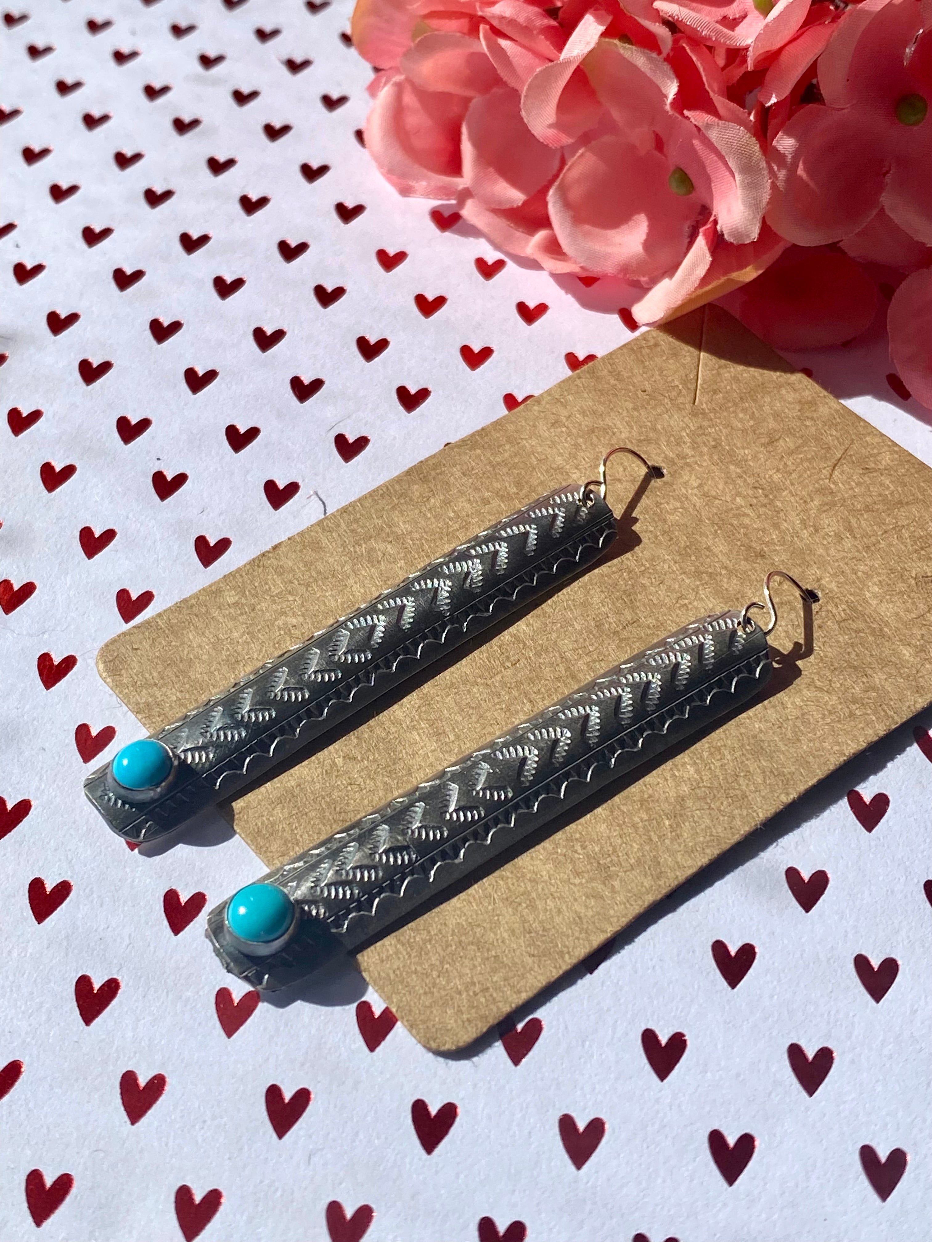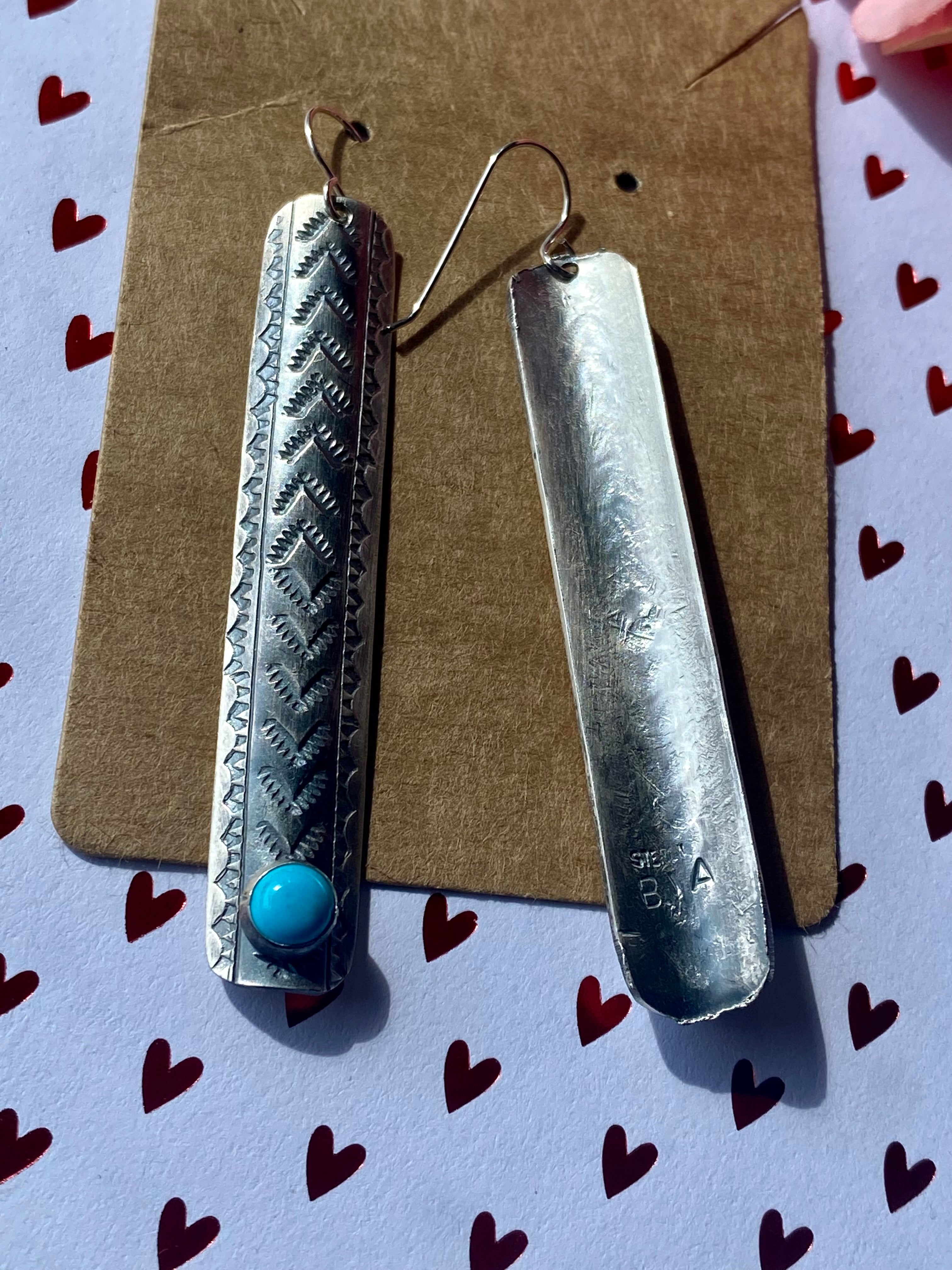 Boyd Ashley Kingman Turquoise & Sterling Silver Dangle Earrings. They measure 3 inches long and 1/2 of an inch wide. Stones may differ due to natural stones. Signed by the artist and stamped sterling silver.