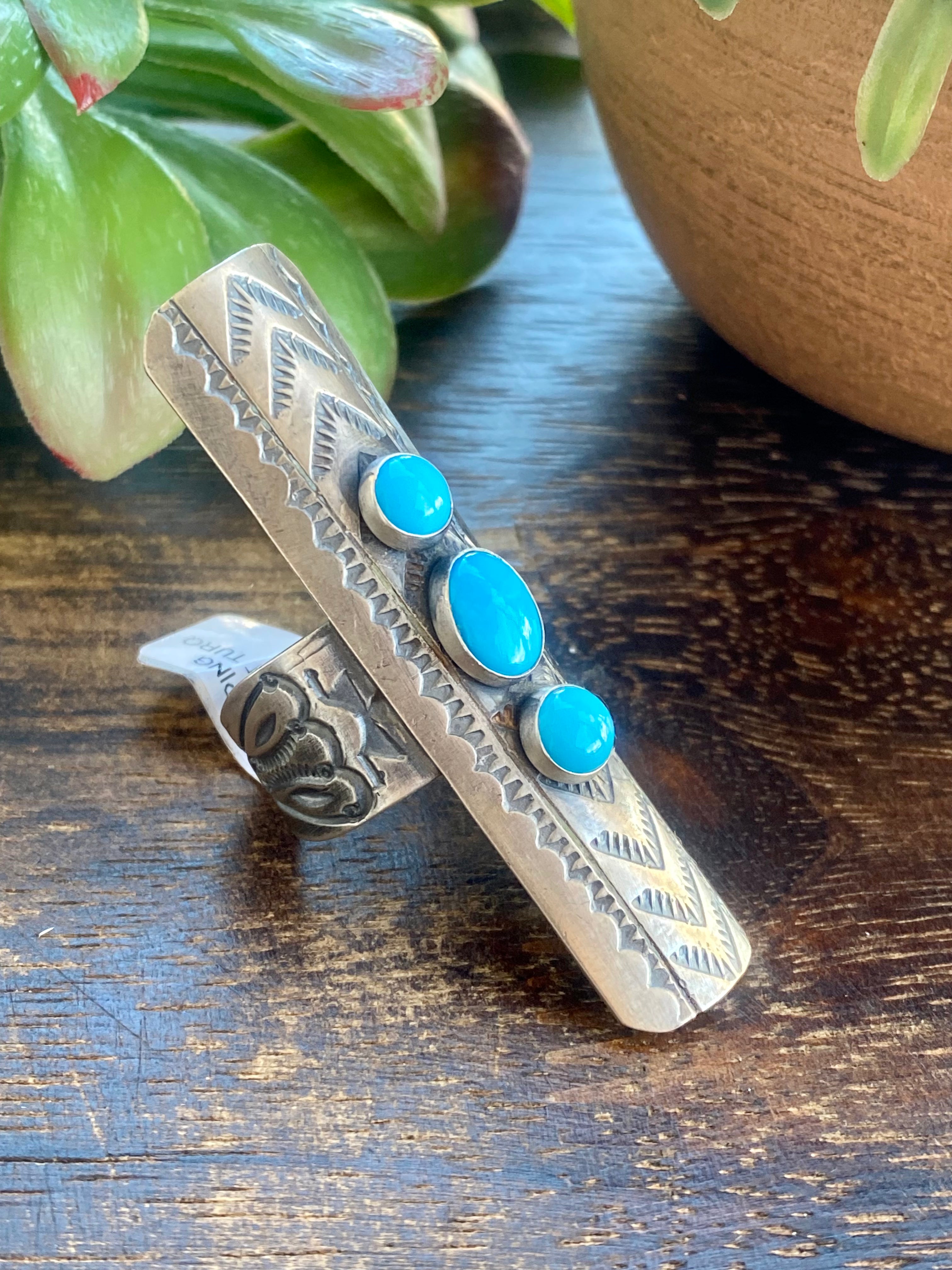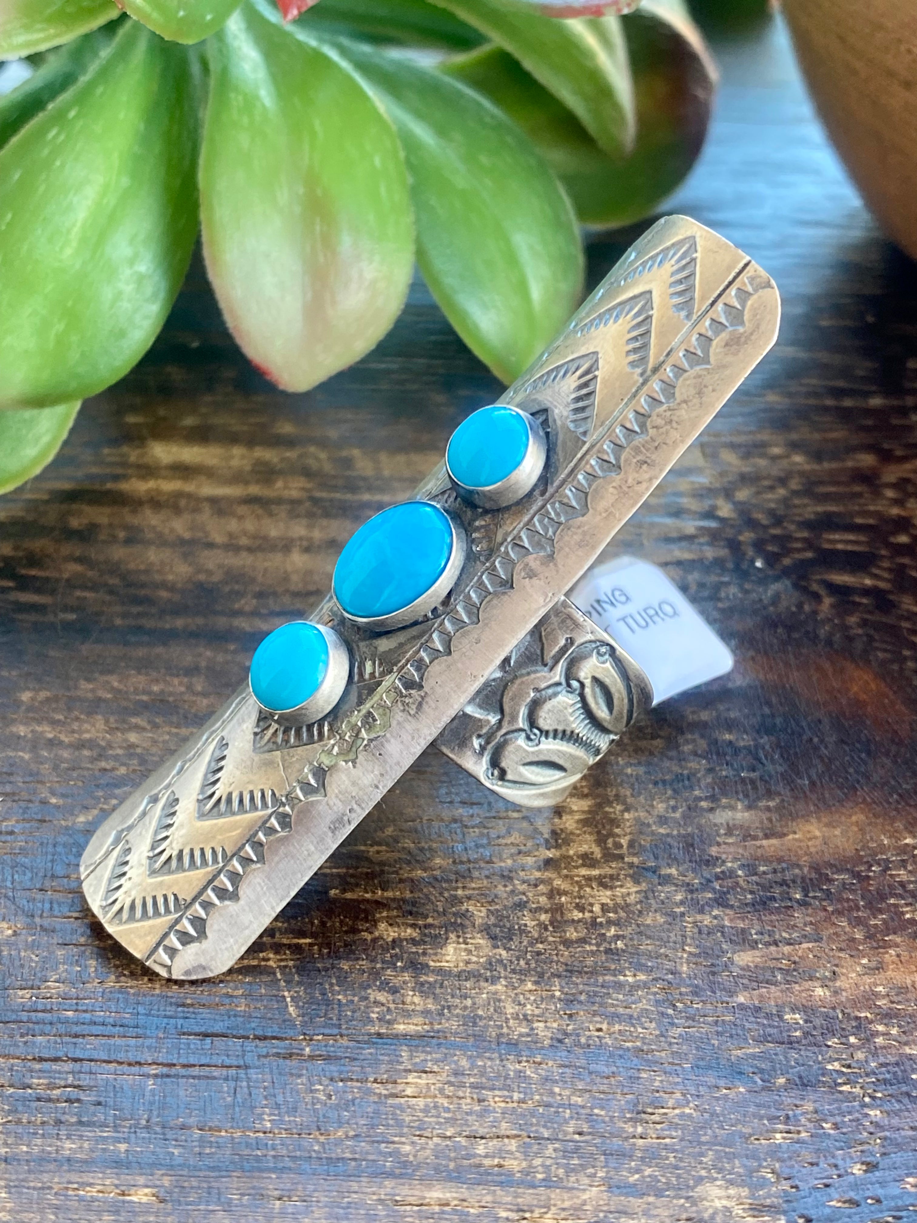 Boyd Ashley Sleeping Beauty Turquoise & Sterling Silver Ring Size 9.25. It measures 2 3/8 inches long and just over 1/2 of an inch wide. Signed by the artist and stamped sterling silver.