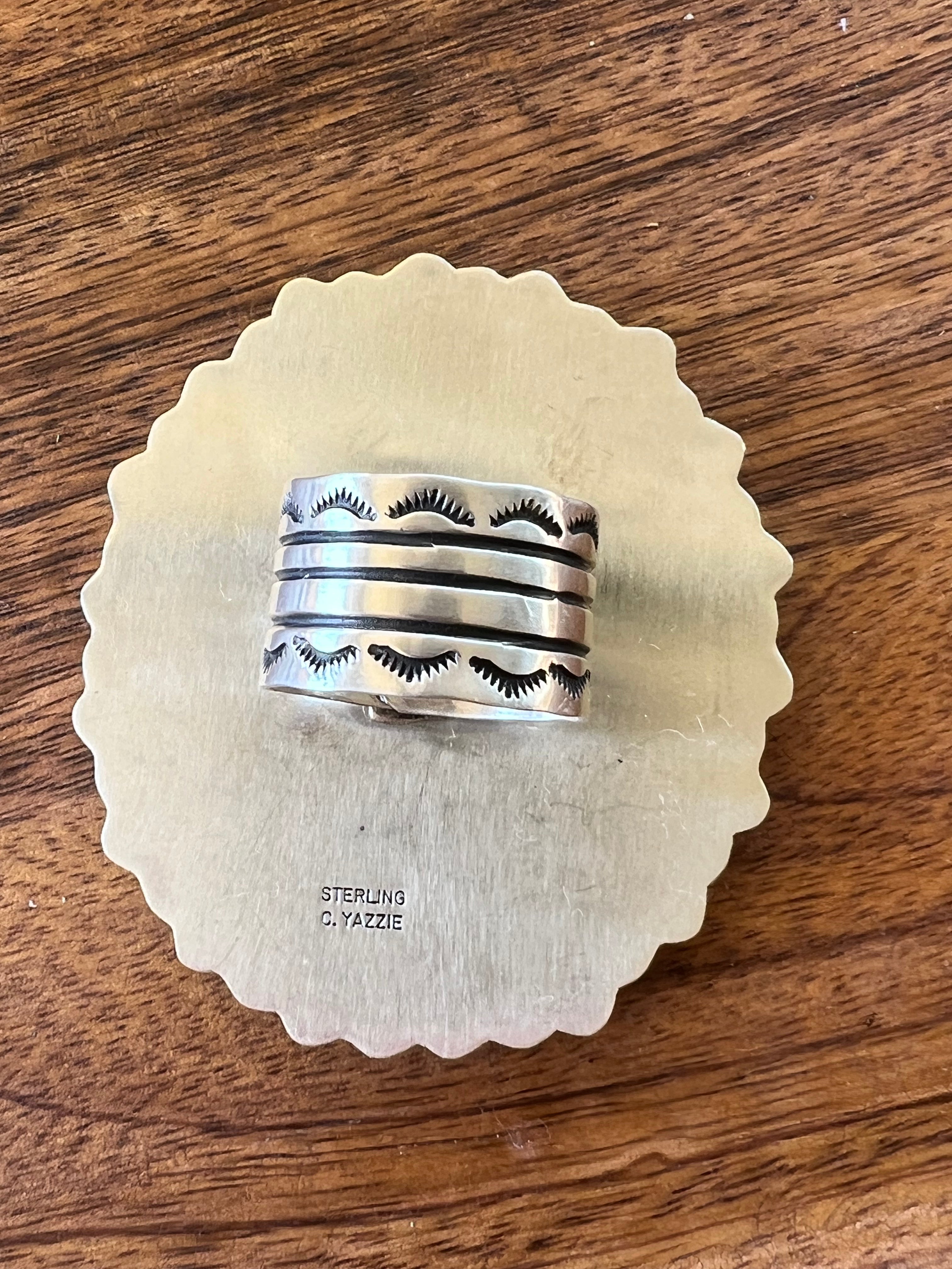 C. Yazzie Kingman Turquoise & Sterling Silver Cluster Ring Size 11. It measures 2 5/8 inches long and 2 1/4 inches wide. Signed by the artist and stamped sterling silver.