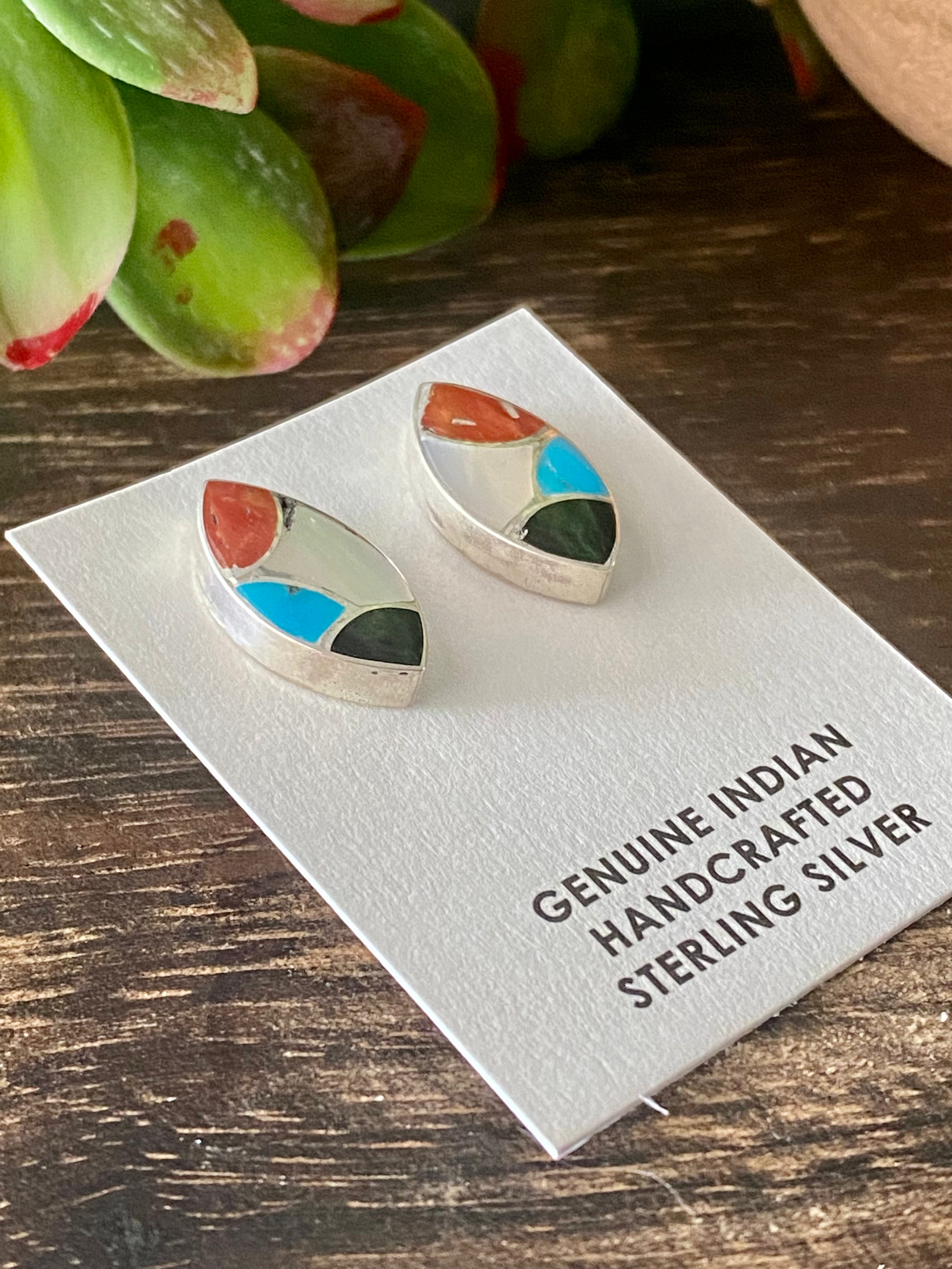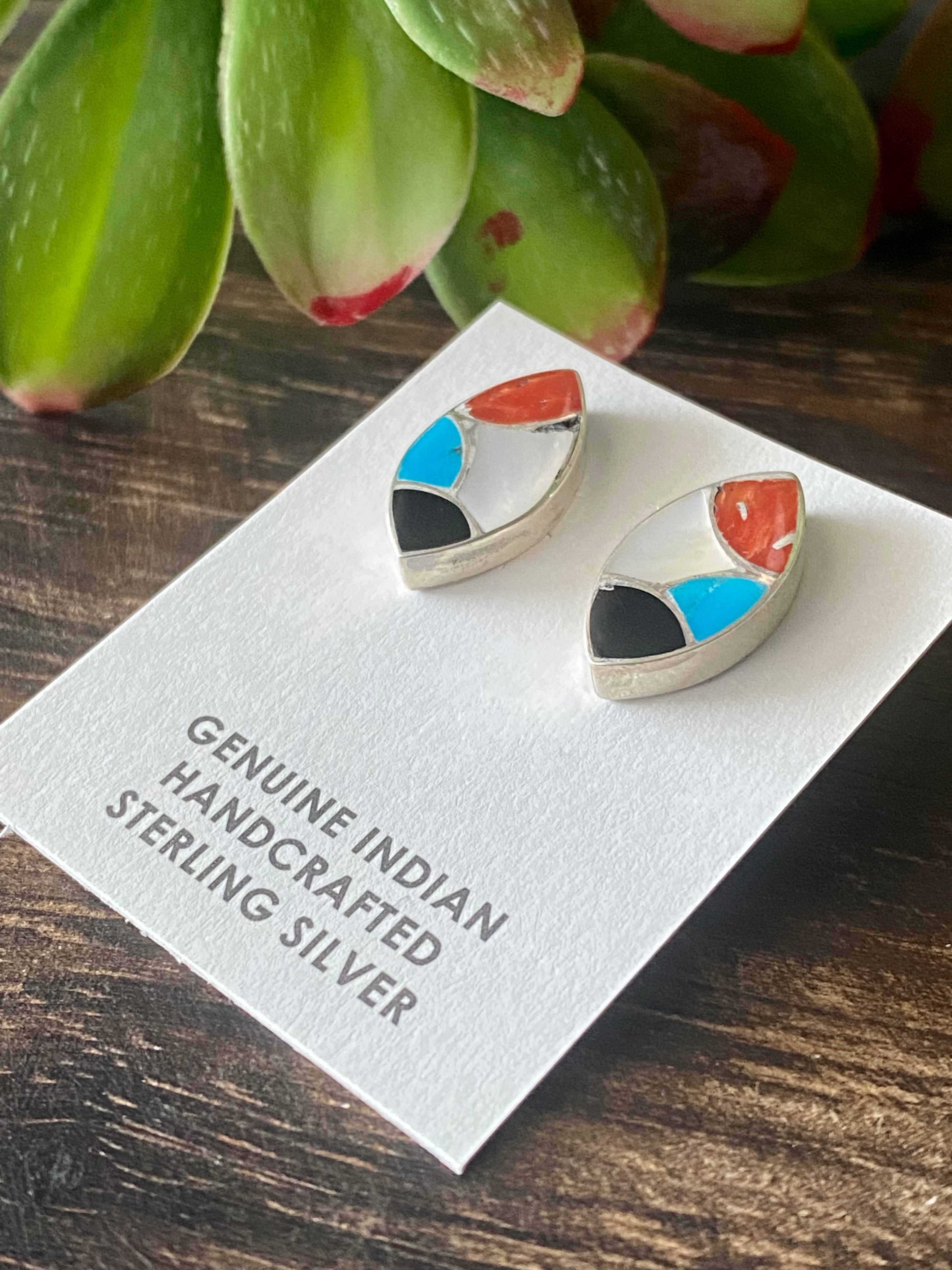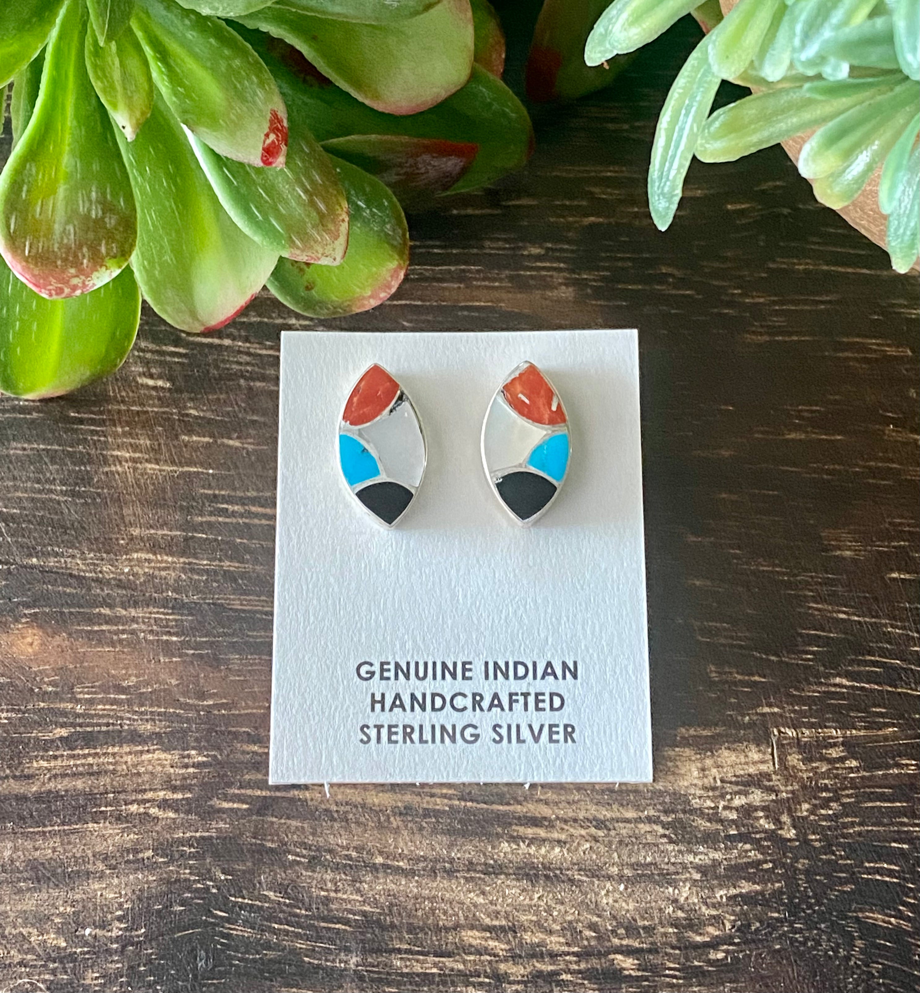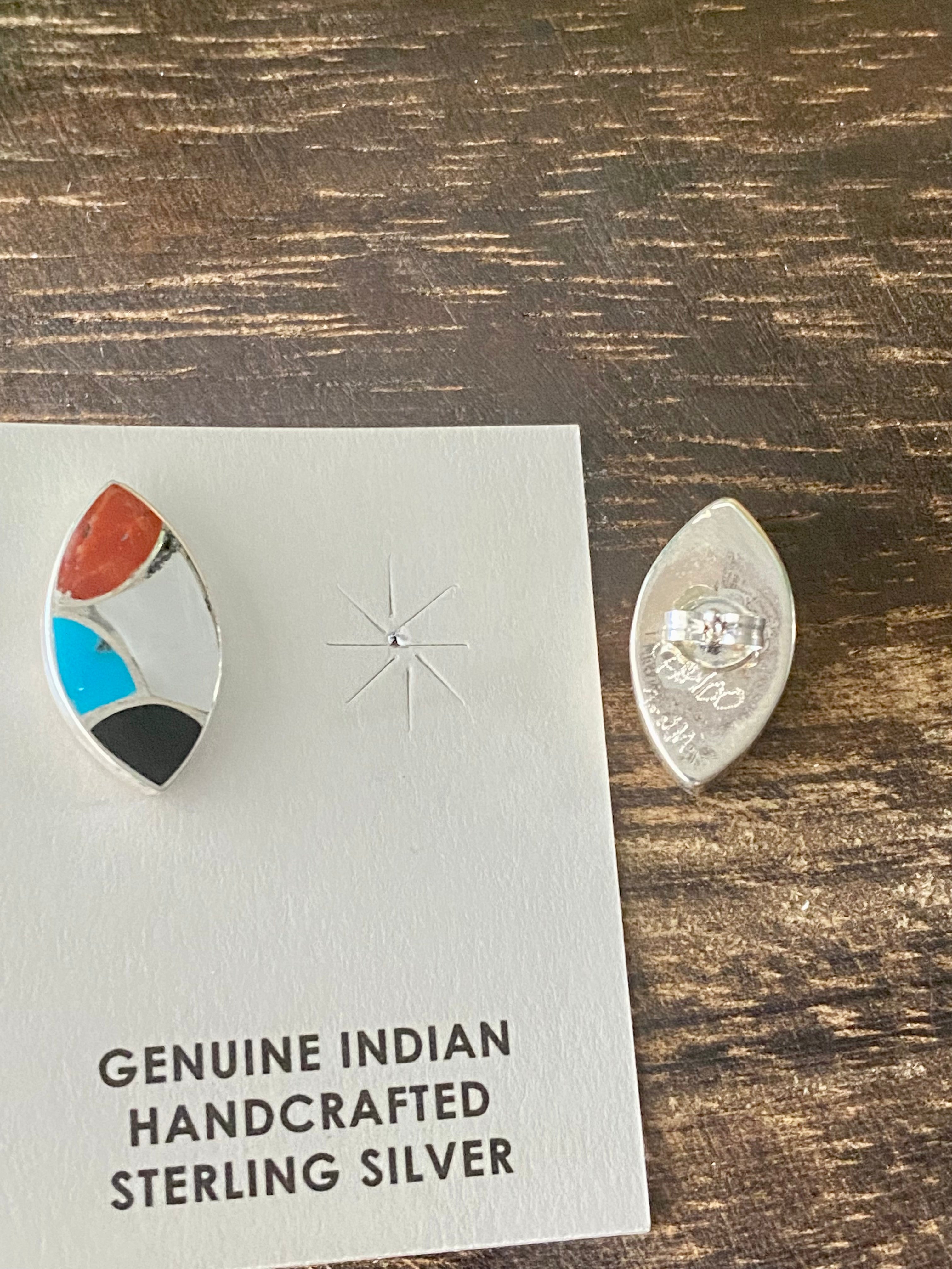 Carmicael Haloo Multi Stone & Sterling Silver Inlay Post Earrings. It measures 3/4 of an inch long and 3/8 of an inch wide. Signed by the artist.