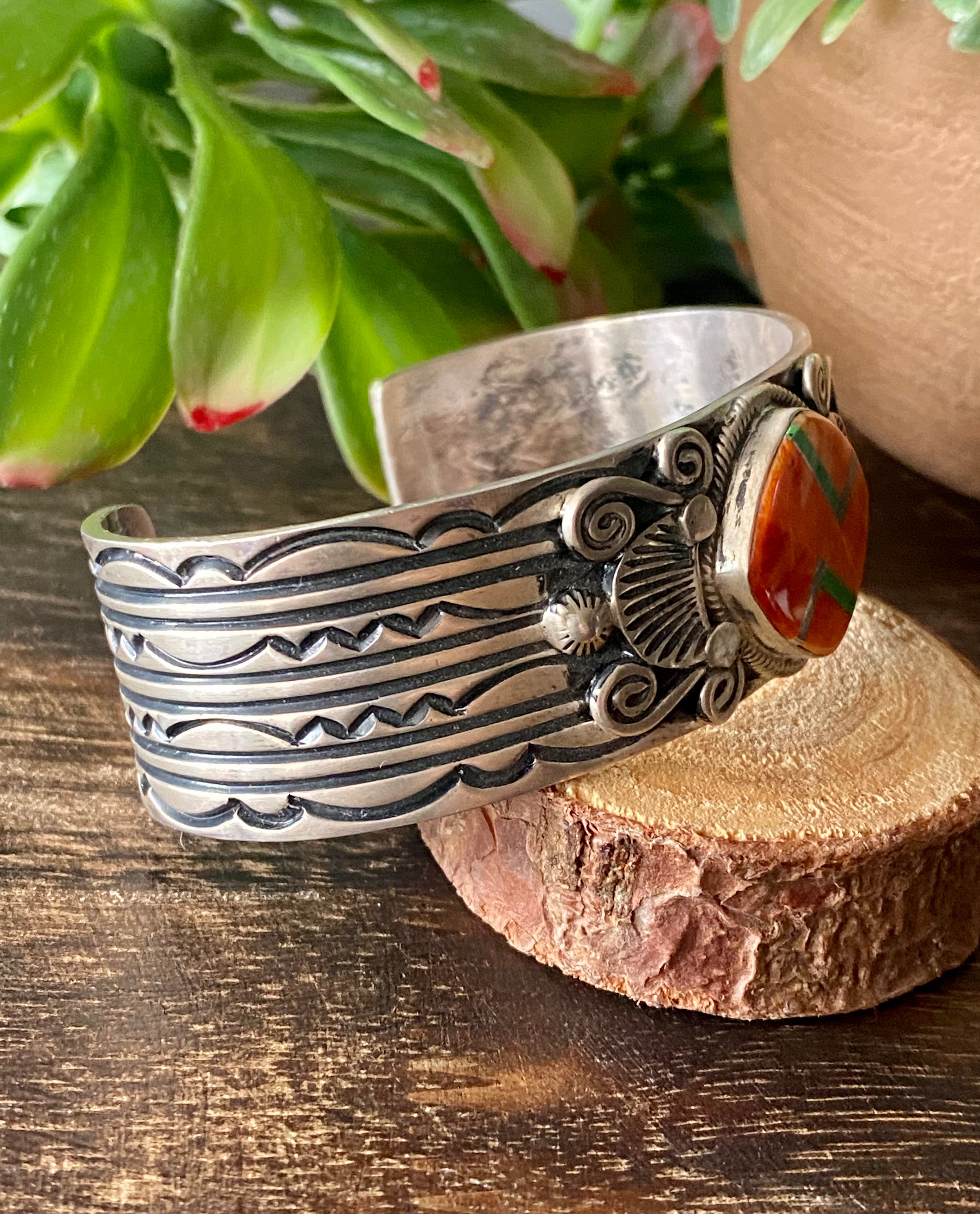 Charles Johnson Multi Stone & Sterling Silver Inlay Cuff Bracelet. It measures 7/8 of an inch wide with an inside circumference of 5 3/4 inches and a gap of 1 1/8 inches. Signed by the artist and stamped sterling silver.
