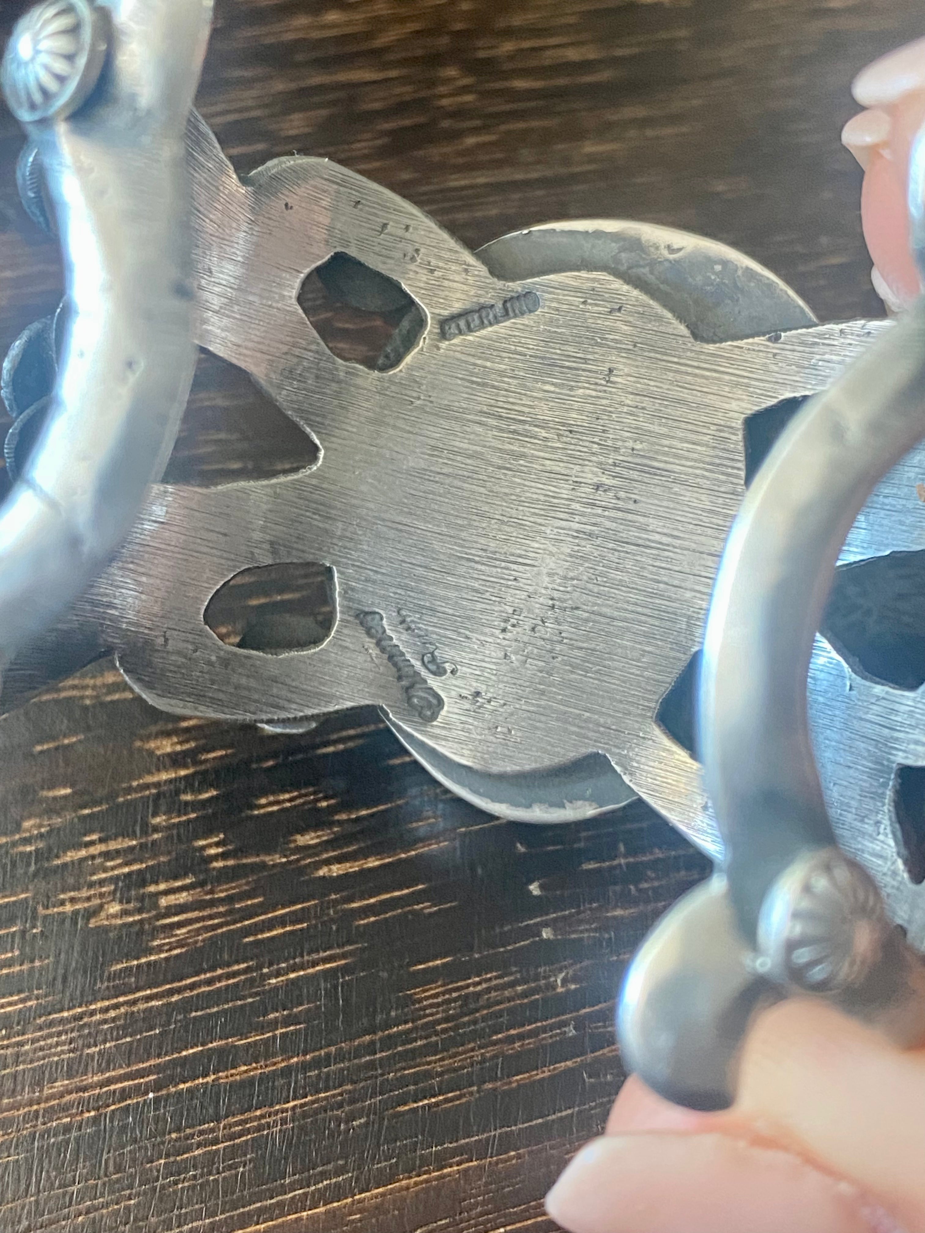Chimney Butte Kingman Turquoise & Spiny Oys Sterling Silver Cuff Bracelet. It measures just under 1 1/2 inches wide with an inside circumference of 4 7/8 inches and a gap of 1 inch. Signed by the artist and stamped sterling silver.