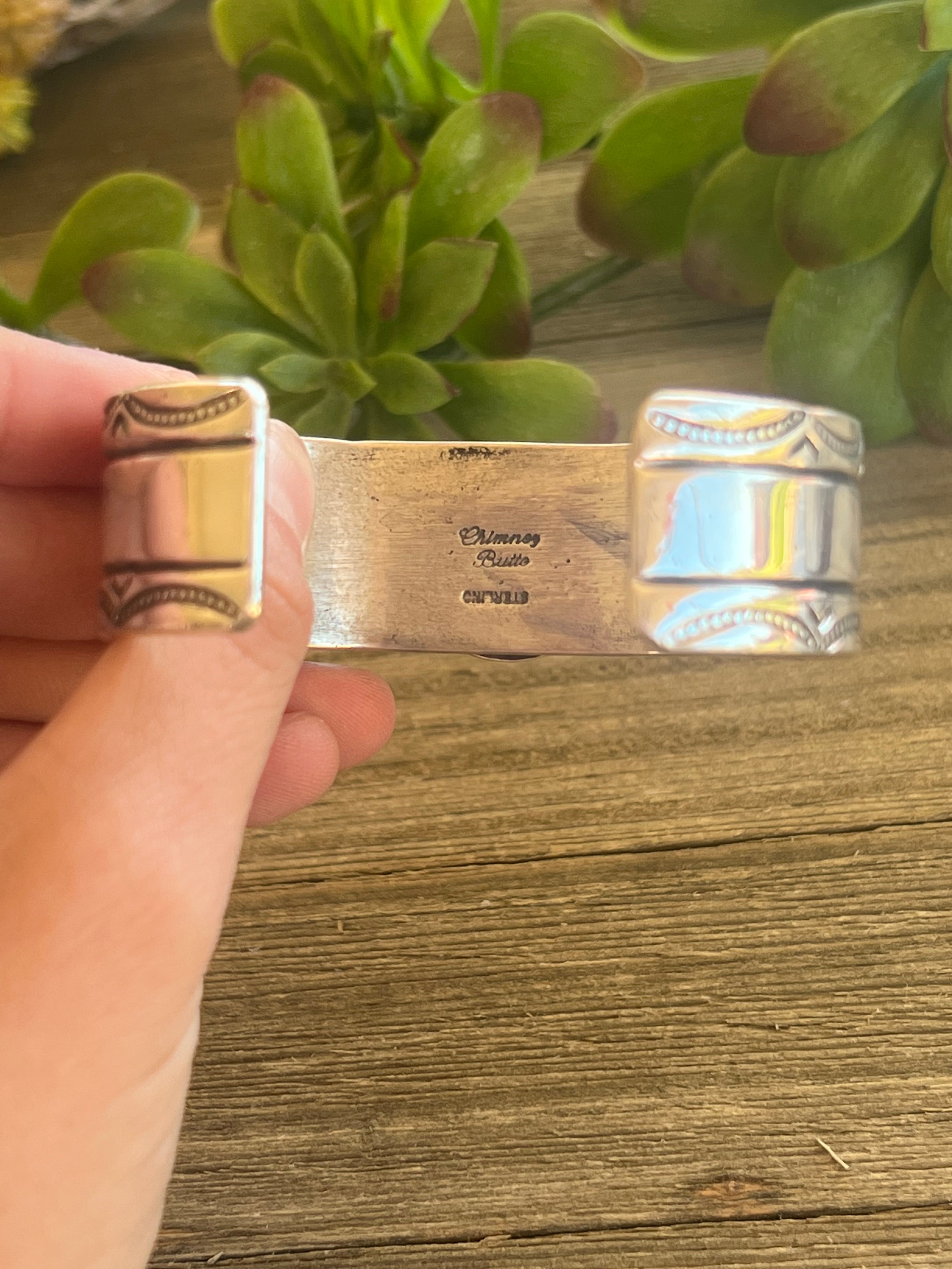 Chimney Butte Pink Conch & Sterling Silver Cuff Bracelet. It measures just over 3/4 of an inch wide with an inside circumference of 5 5/8 inches and a gap of just under 1 1/8 inches. Signed by the artist and stamped sterling silver.