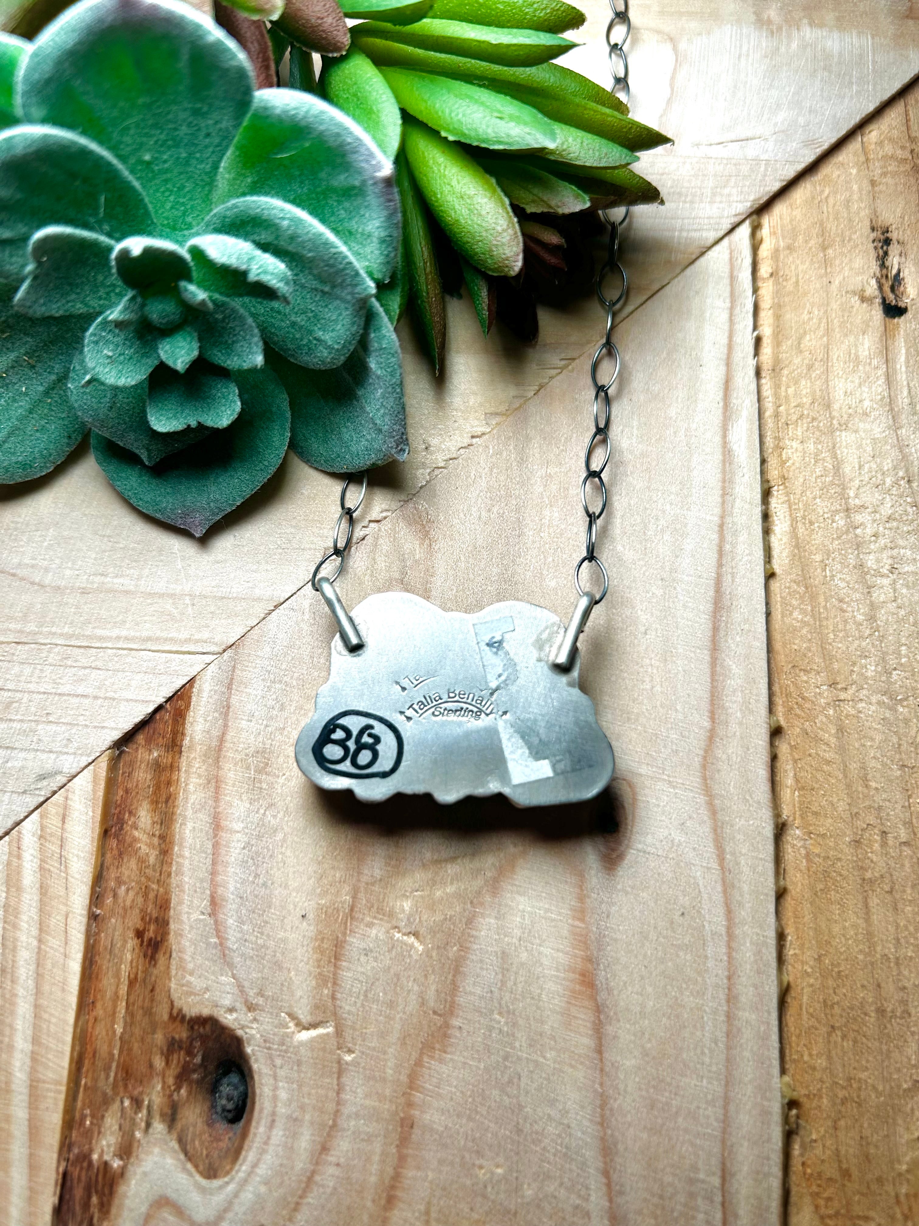 Talia Benally Palomino Variscite & Sterling Silver Necklace. It measures 18 1/2 inches long with hang while the chain by itself measures 17 inches long. Signed by the artist and stamped sterling silver.
